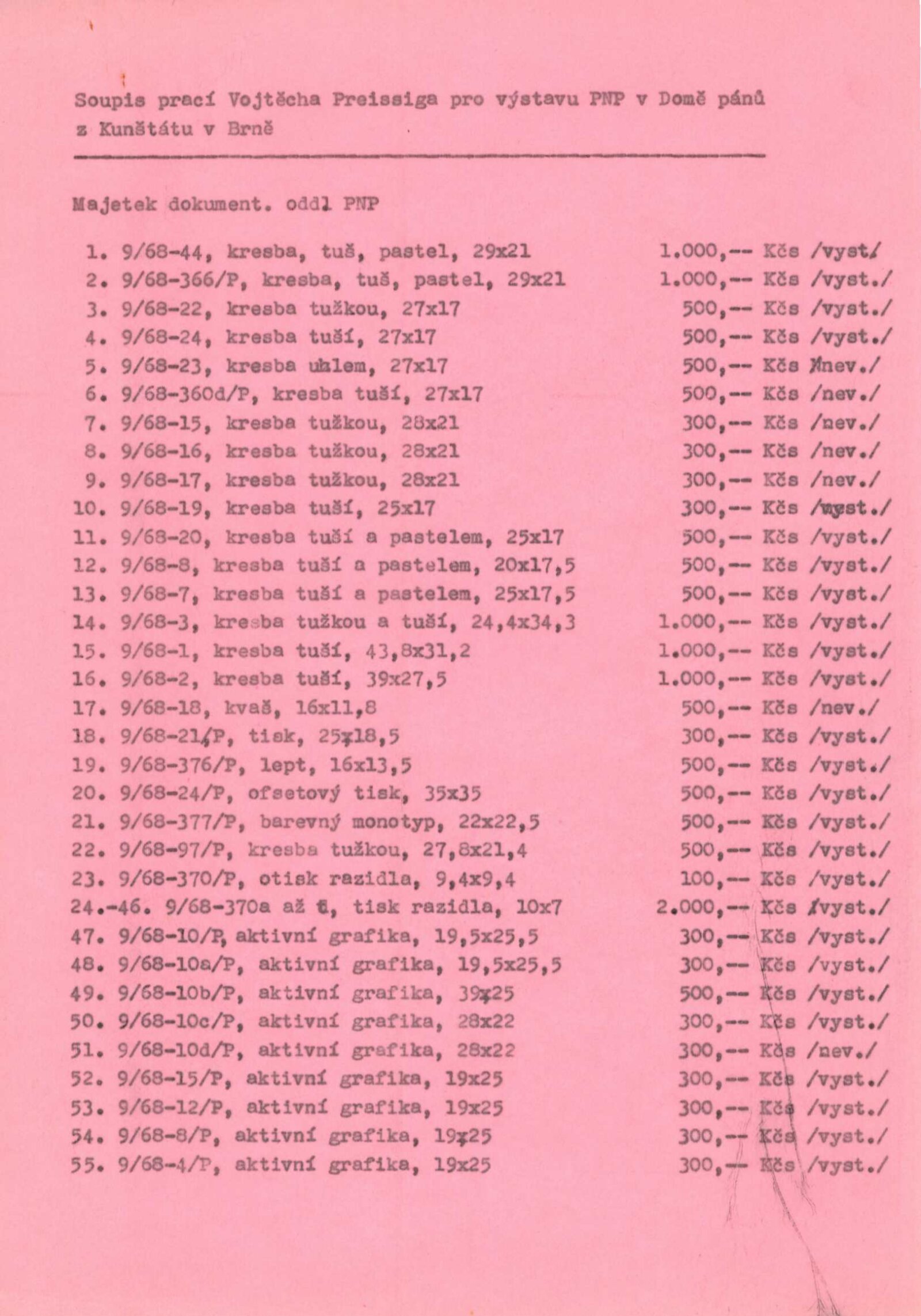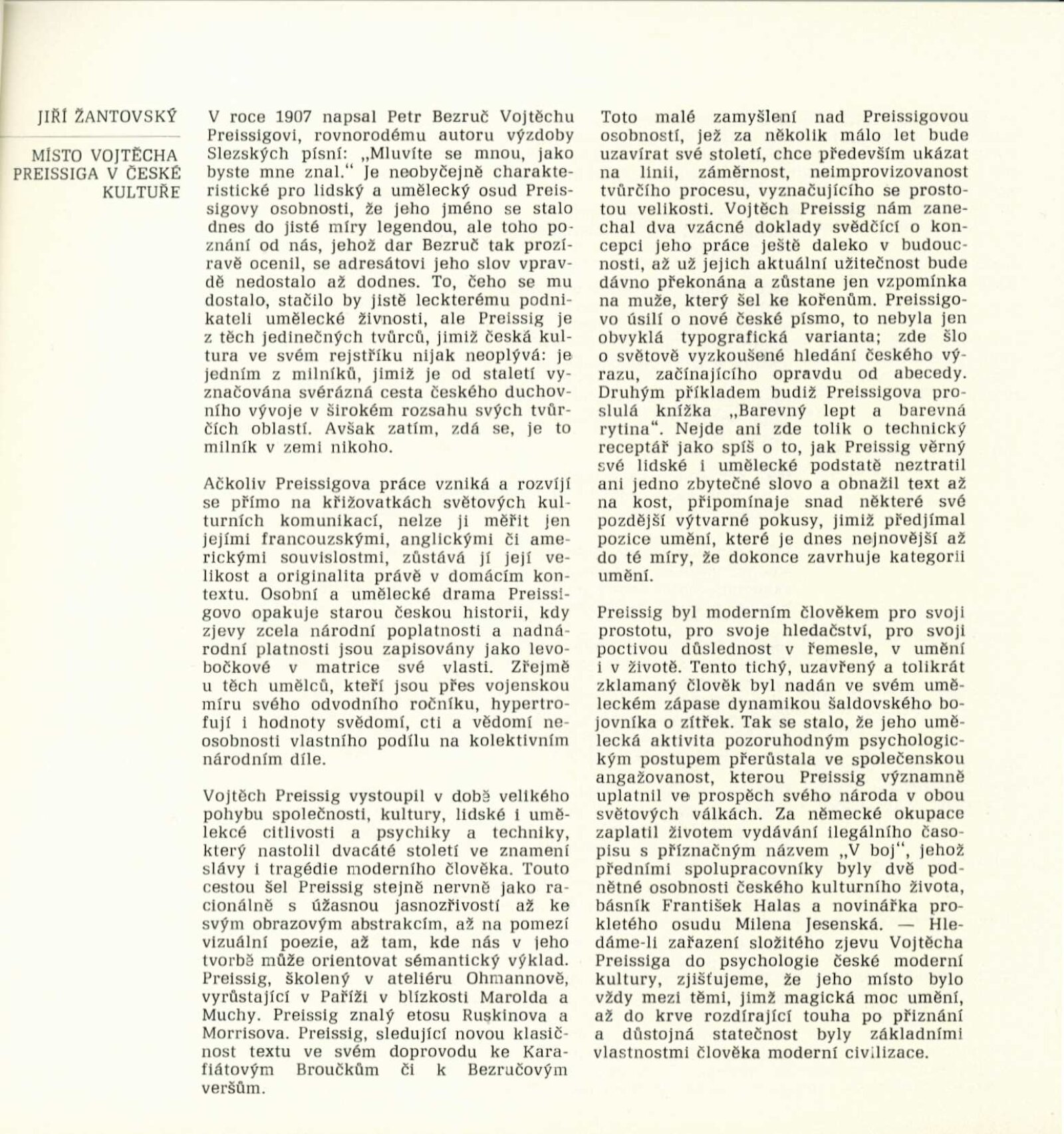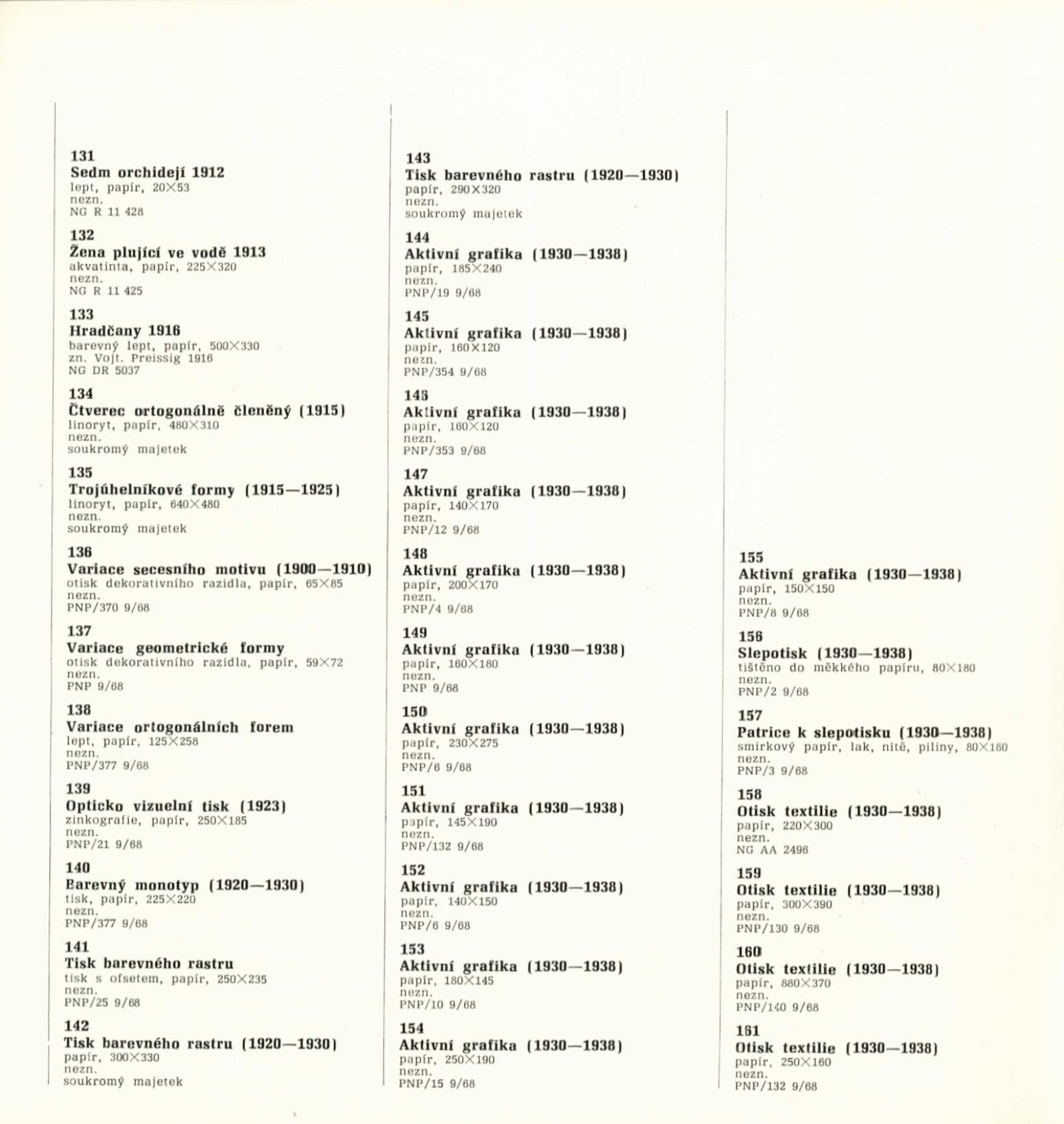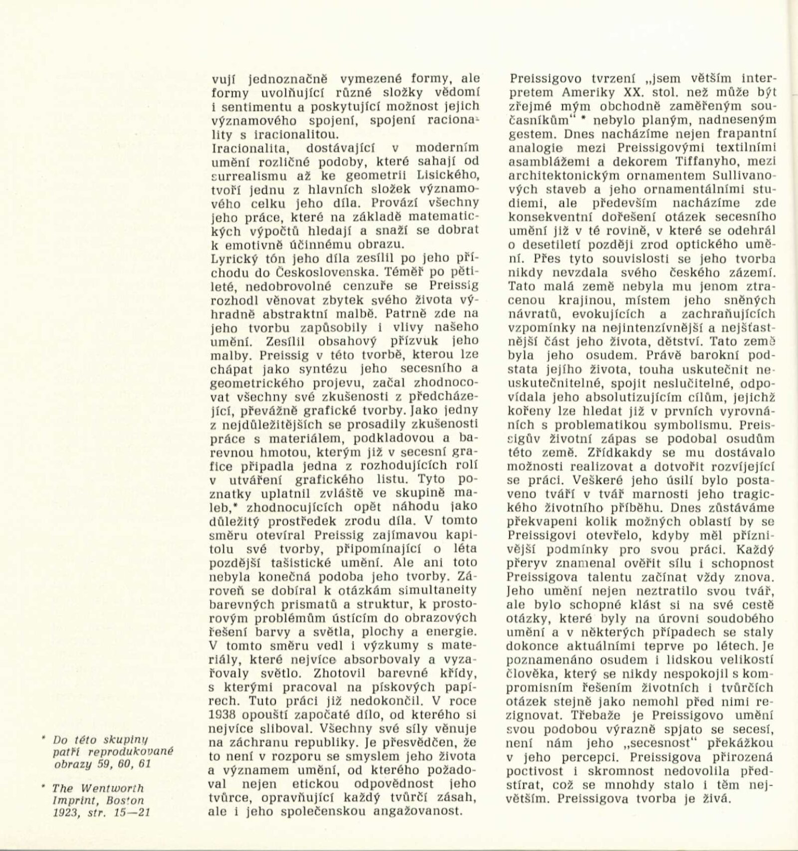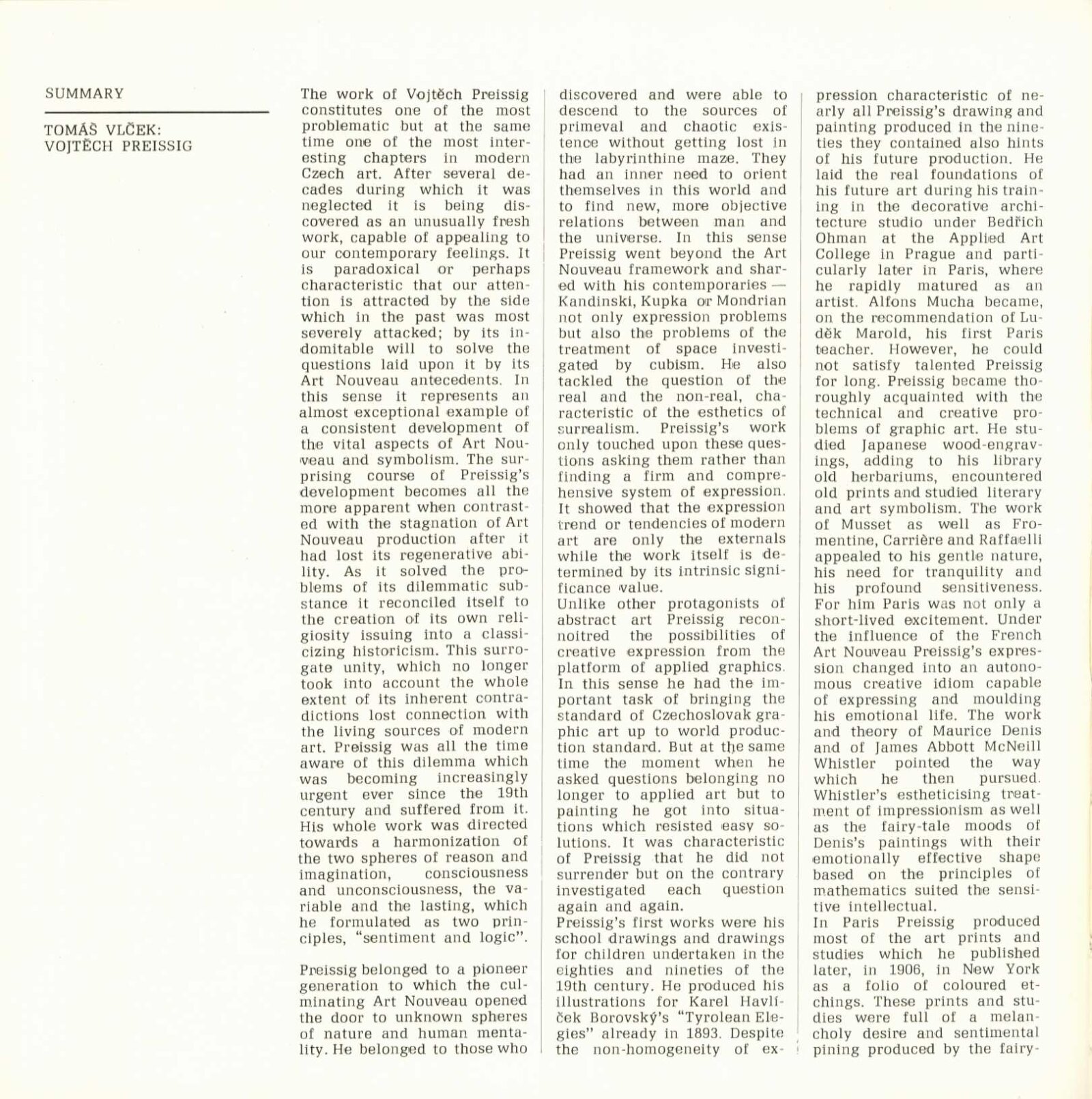 Vojtěch Preissig. Životní dílo: Dům umění města Brna / Dům pánů z Kunštátu, 26. 1. – 2. 3. 1969 / Převzatý katalog. Vojtěch Preissig. 1873–1944: Galerie Václava Špály, Nová síň, Praha, 22. 10. – 24. 11. 1968 / Texty: Tomáš Vlček, Jiří Žantovský. – Praha: Památník národního písemnictví, 1968. – 64 s., obr., portrét, životní data, bibliografie, DPK 404. – MZK; MG