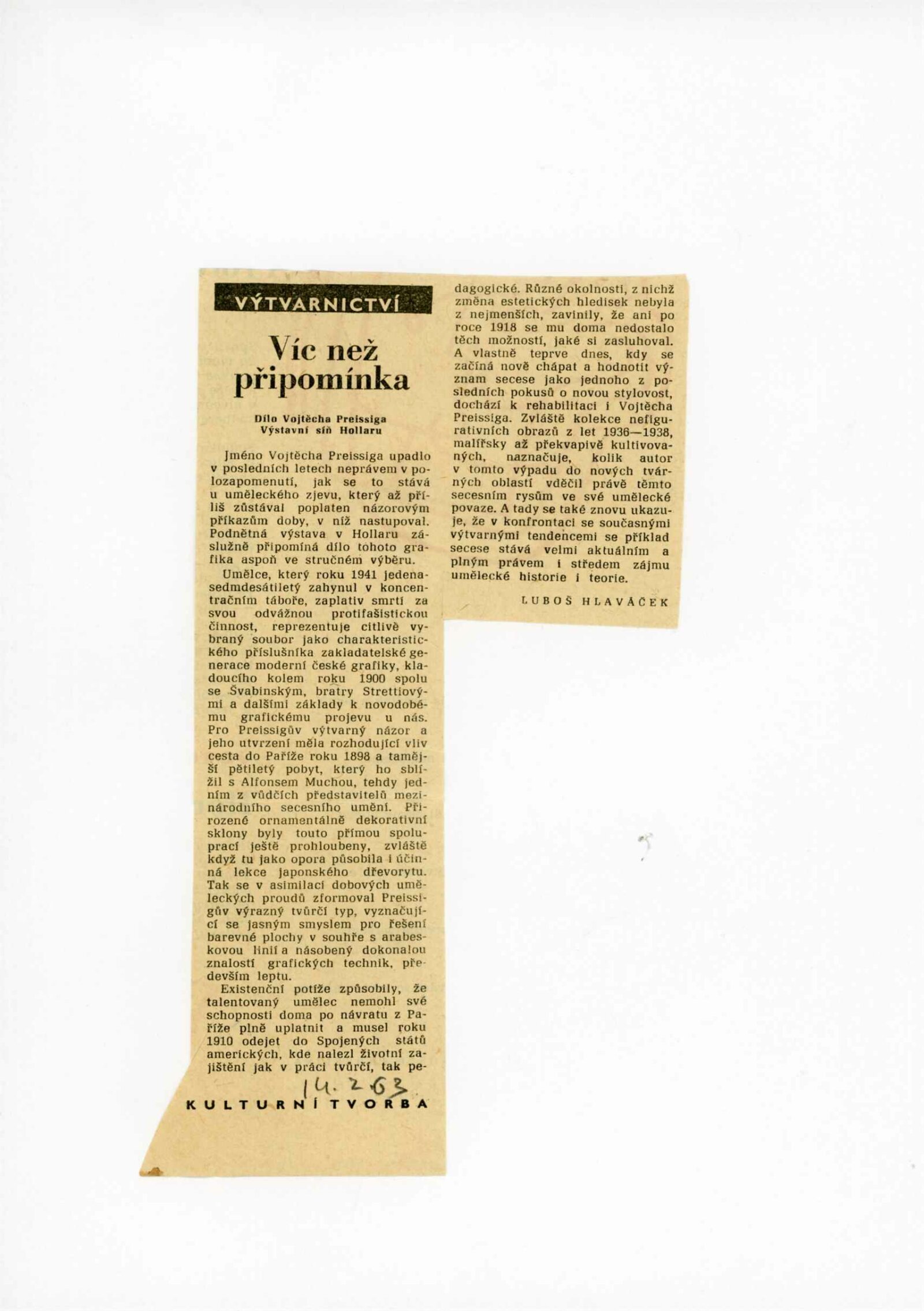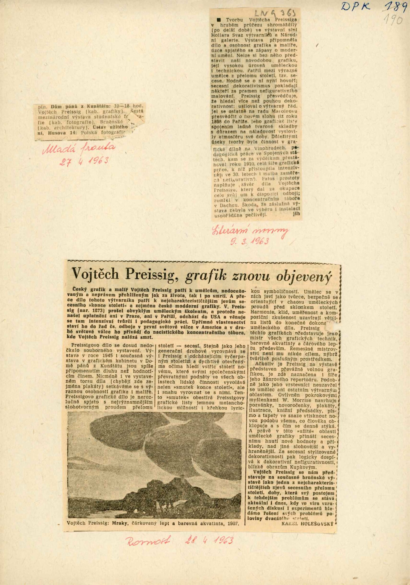 Vojtěch Preissig: Dům umění města Brna / Dům pánů z Kunštátu, 43. výstava Kabinetu grafiky, 12. 4. – 2. 5. 1963 / Převzatý katalog. Vojtěch Preissig. 1873–1944. Výběr z grafické tvroby: Výstavní síň SČUG Hollar, Praha, 1963 / Text: František Dvořák. – Praha: SČSVU, 1963. – 4 s., DPK 190. – MG