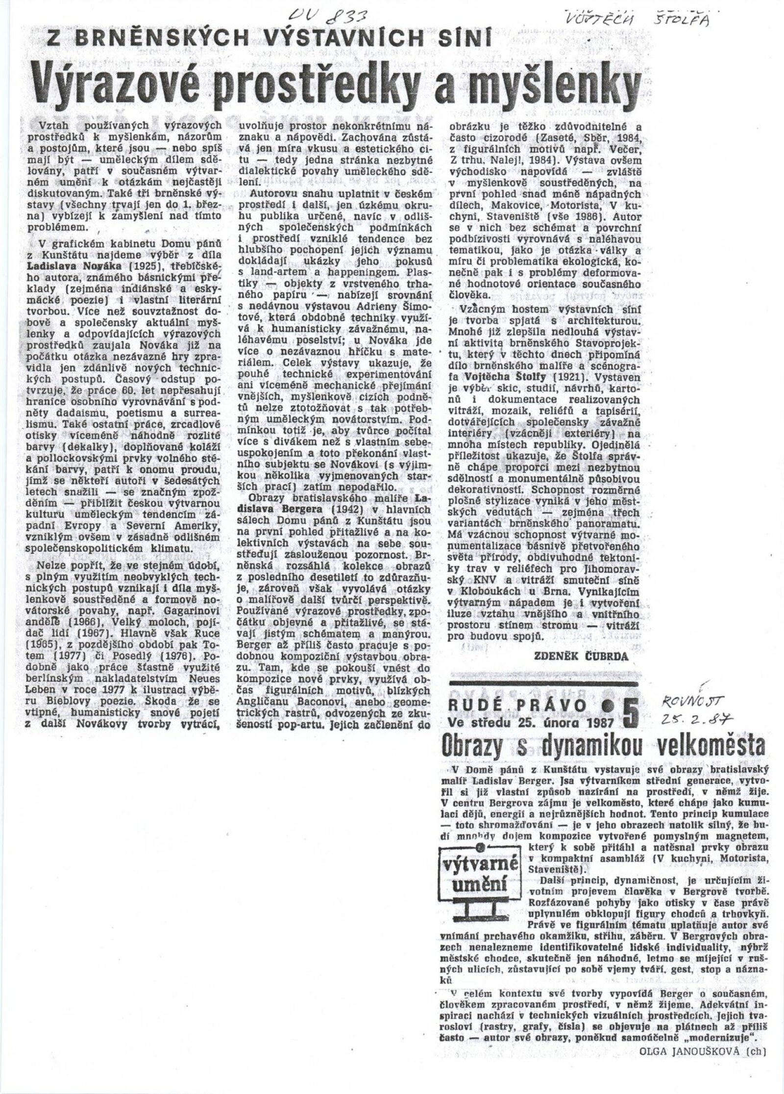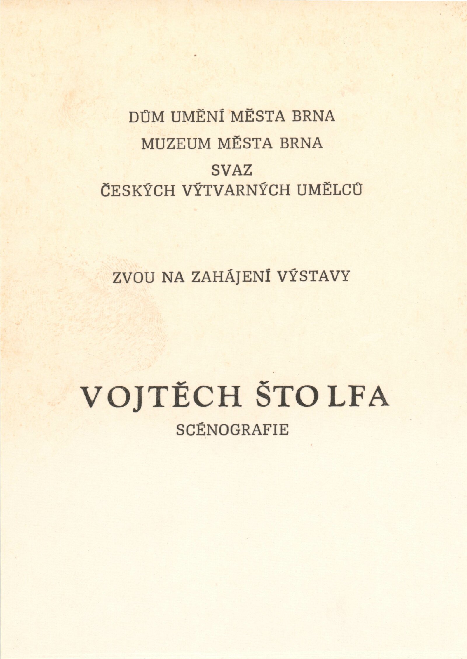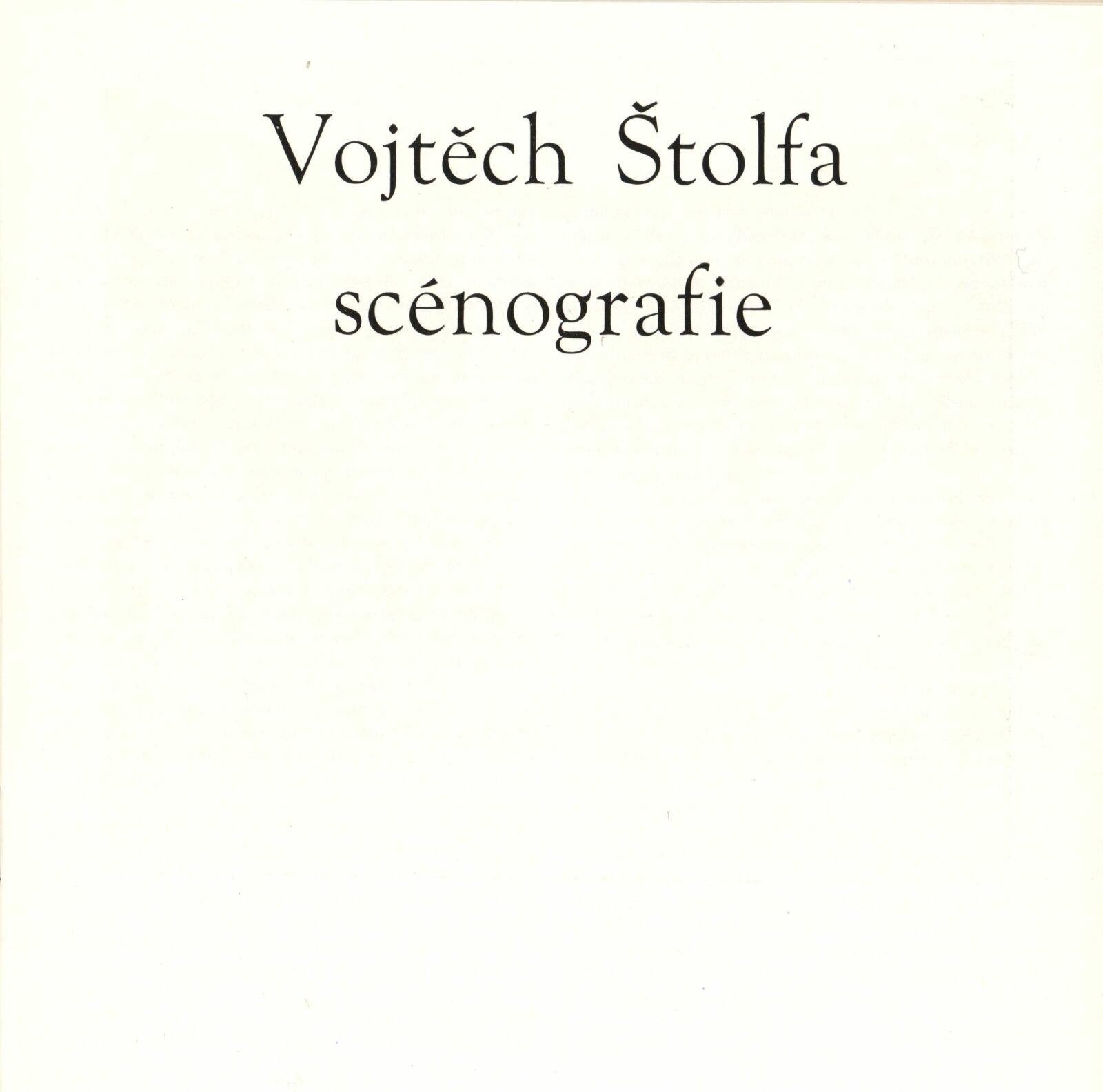 Vojtěch Štolfa. Scénografie: Dům umění města Brna, 3. 3. – 12. 4. 1987 / Text: Zuzana Ledererová. – Brno: DUmB, 1987. – [16] s., obr., životní data, DU 833. – MZK; MG; MMB