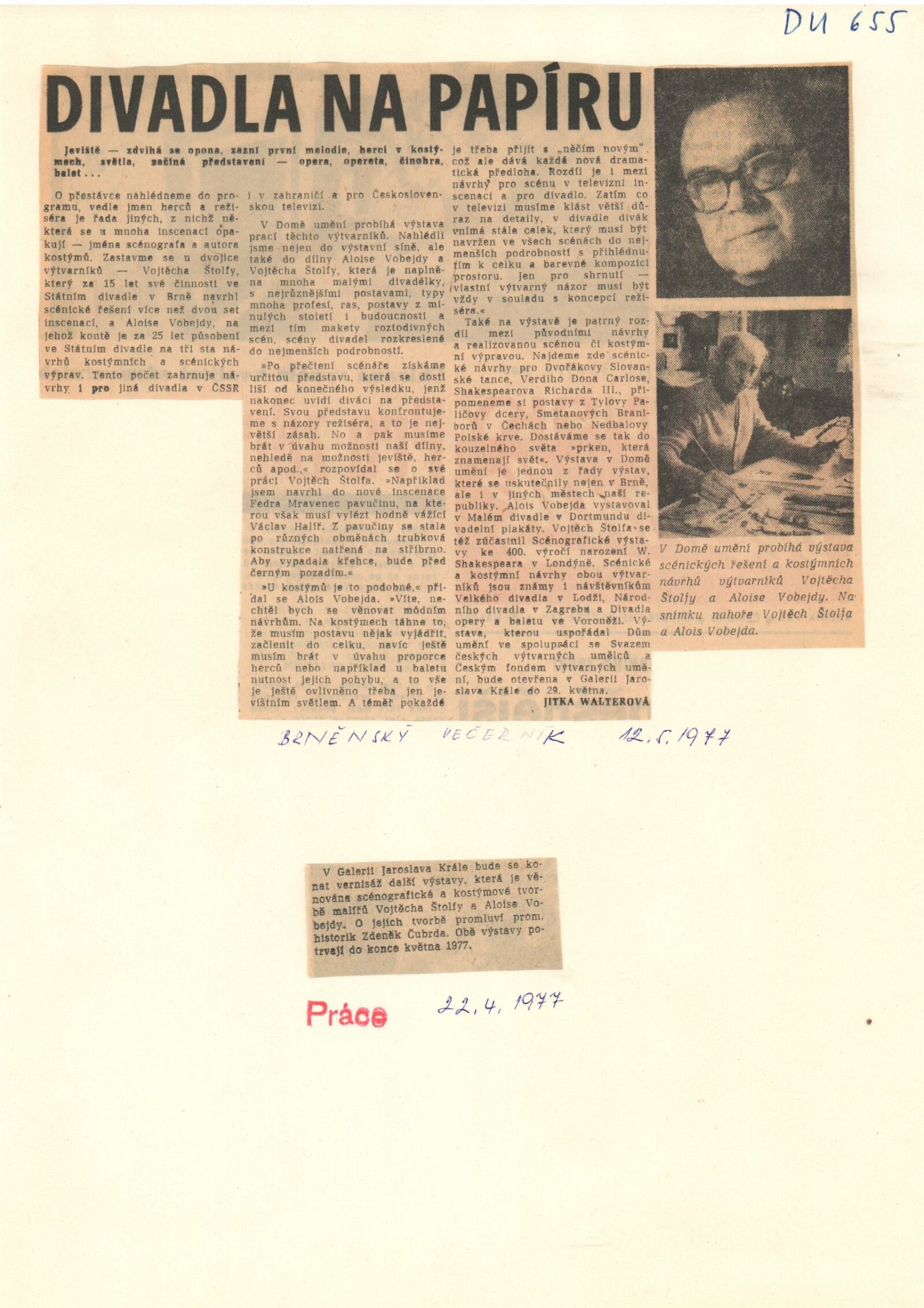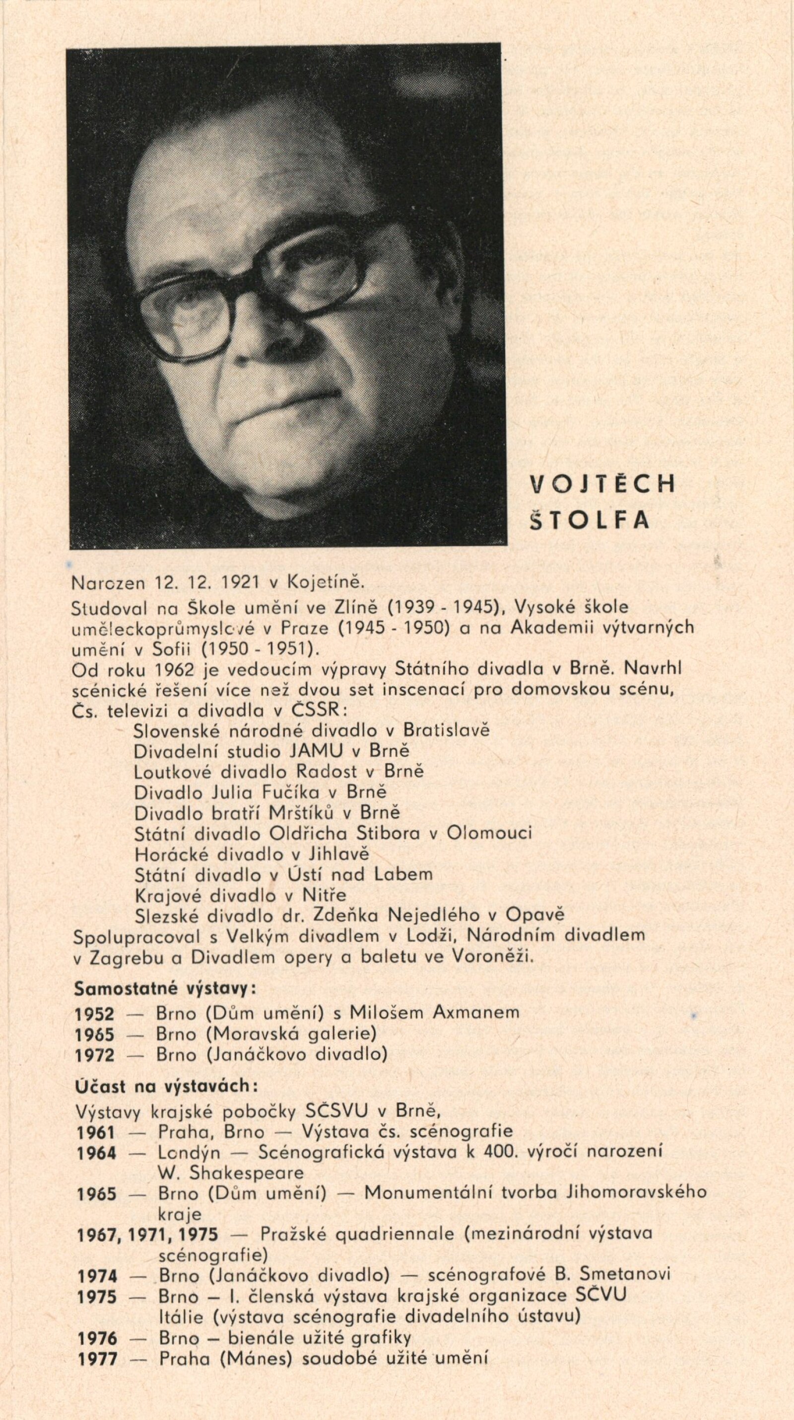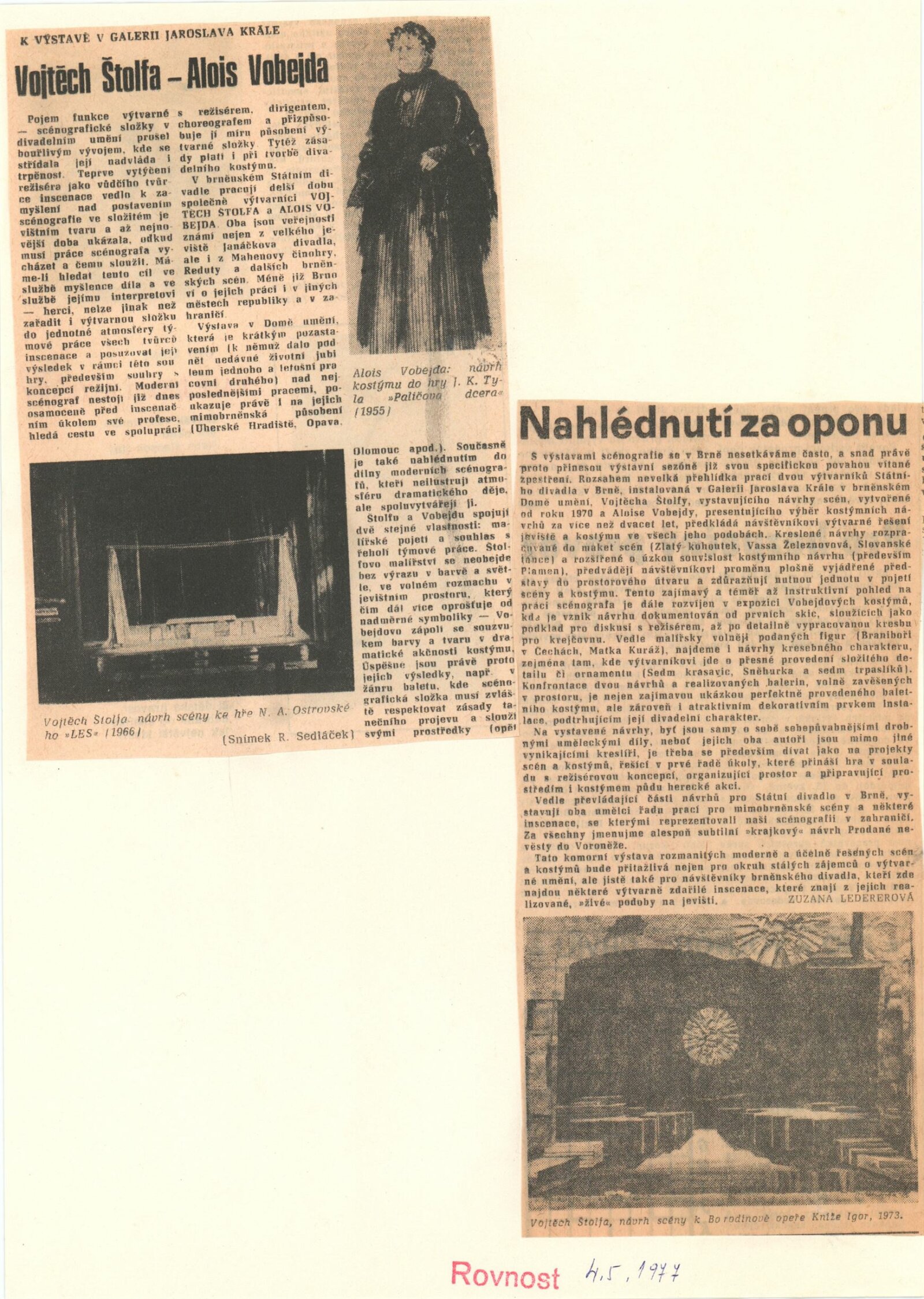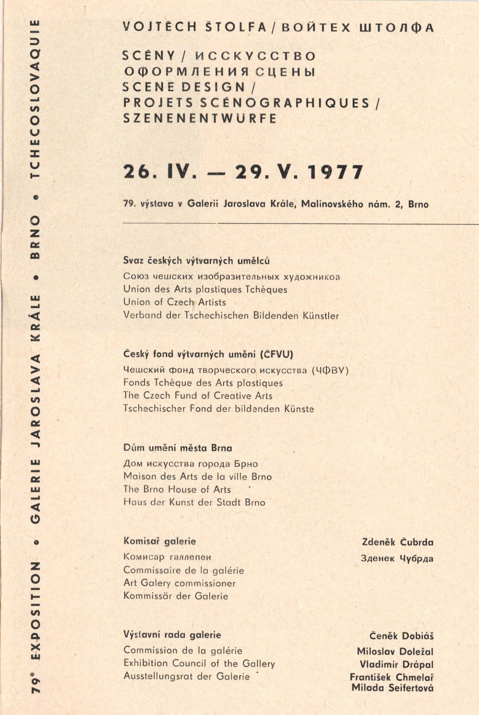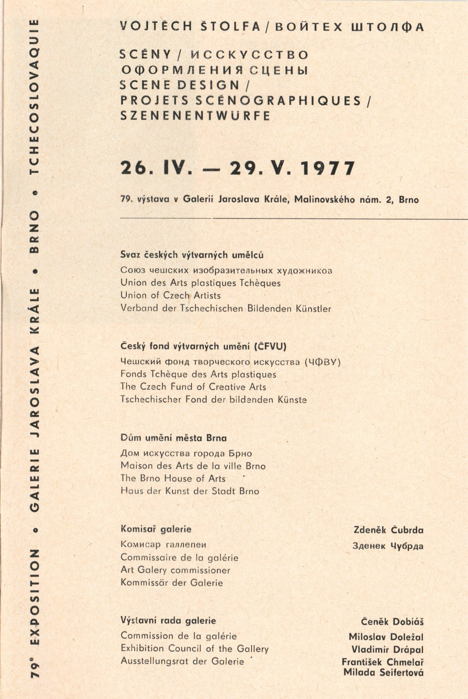 Vojtěch Štolfa. Scény: Dům umění, 79.výstava v Galerii Jaroslava Krále, 26. 4. – 29. 5. 1977 / Text: Jiřina Telcová. – Brno: ČFVU, 1977. – 14 s.,obr., seznam vystavených prací 2 s.. portrét, životopis, seznam výstav, realizací v architektuře, cen, DU 655 / Alois Vobejda. Kostýmy: Dům umění, 79. výstava v Galerii Jaroslava Krále, 26. 4. – 29. 5. 1977 / Text: Jiřina Telcová. – Brno: ČFVU, 1977. – 10 s., obr., seznam vystavených prací 2 s., portrét, životopis, seznam výstav. – DU 655