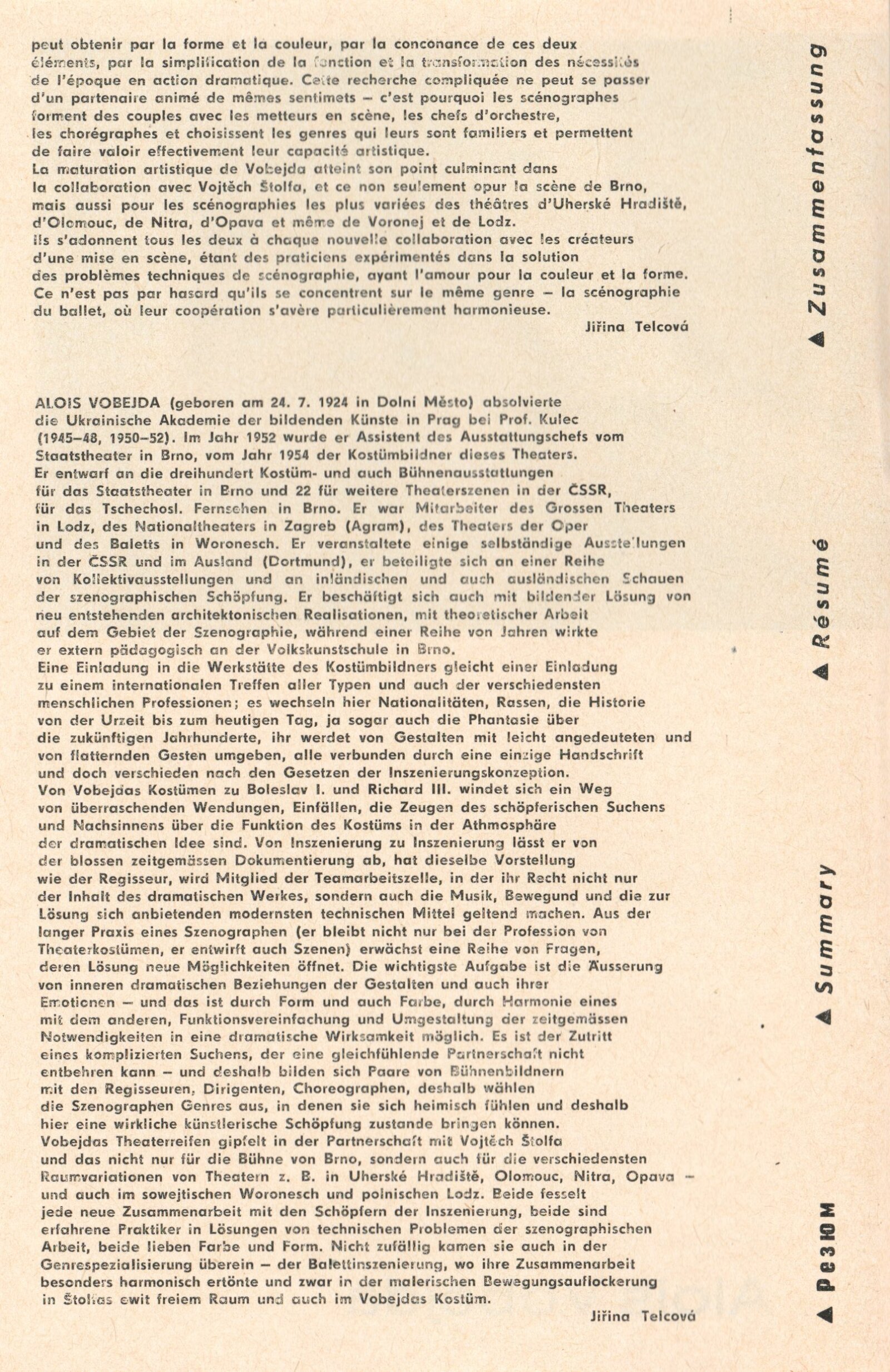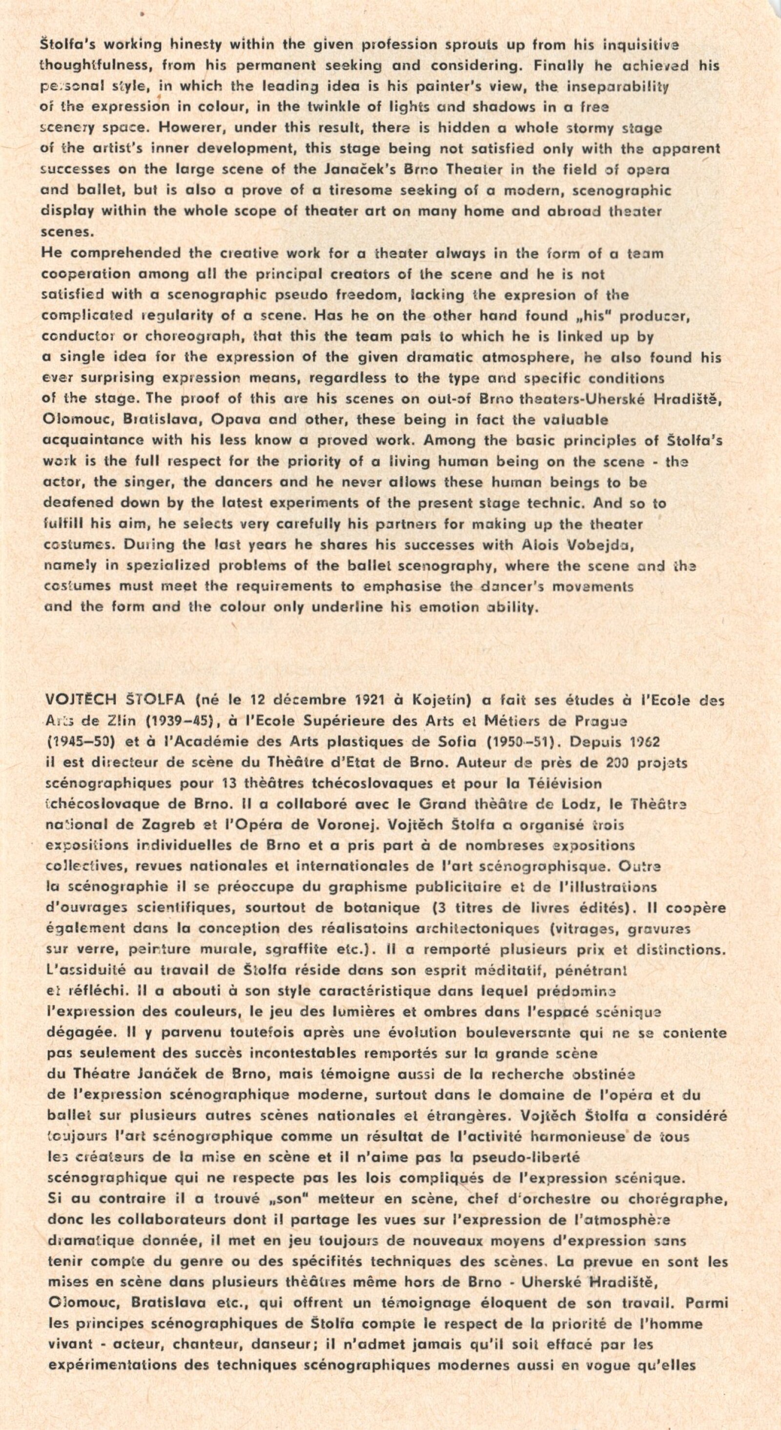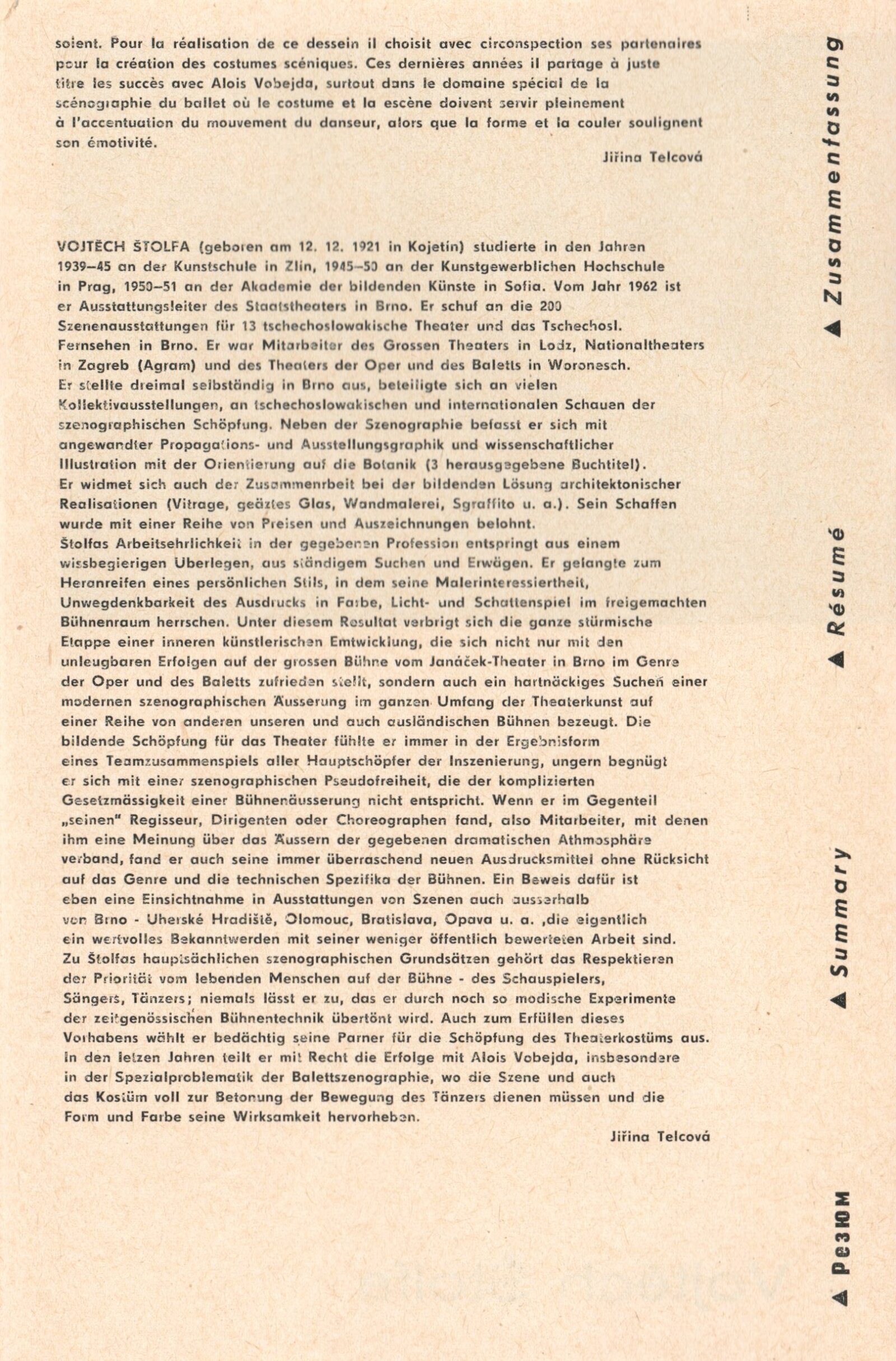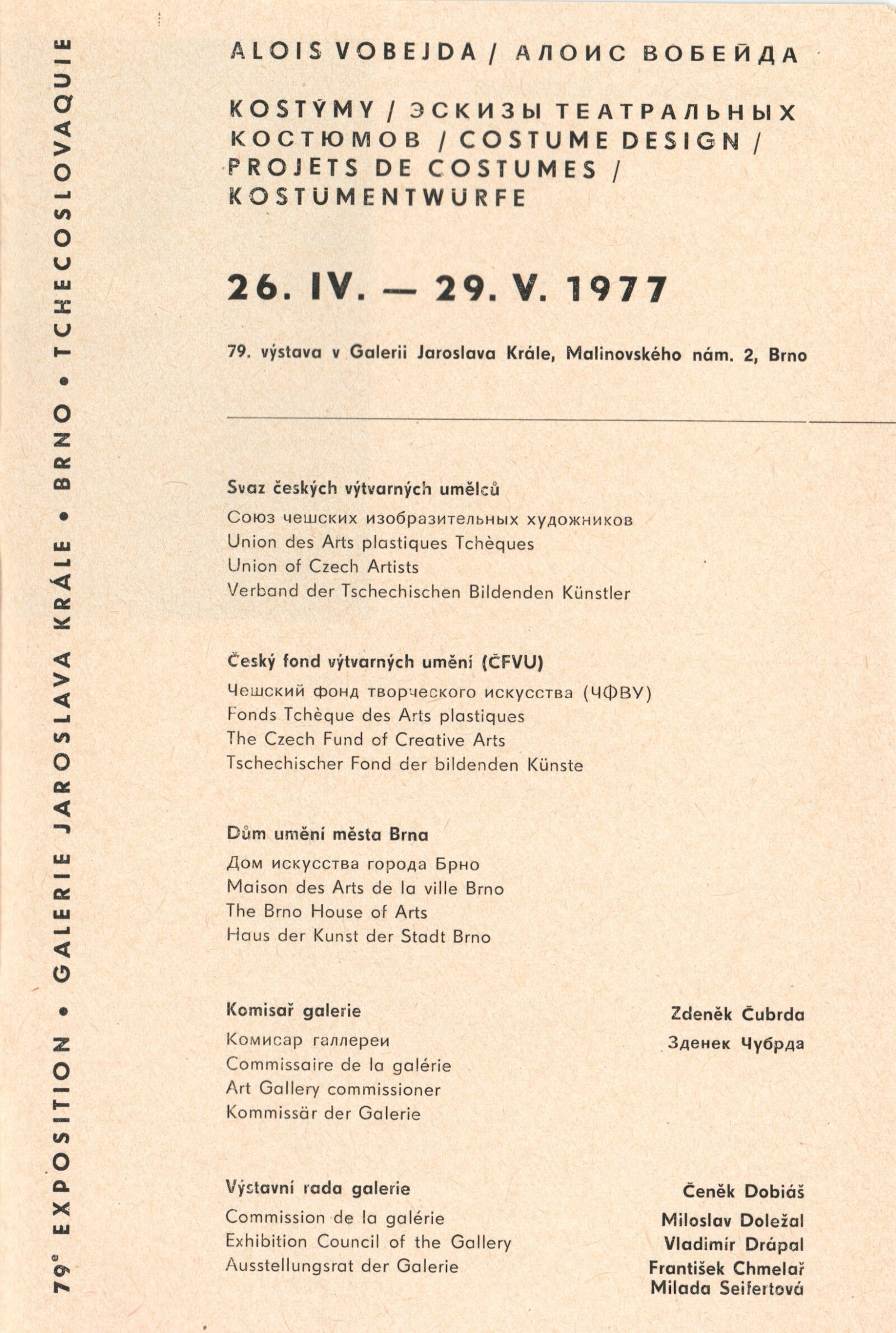 Vojtěch Štolfa. Scény: Dům umění, 79.výstava v Galerii Jaroslava Krále, 26. 4. – 29. 5. 1977 / Text: Jiřina Telcová. – Brno: ČFVU, 1977. – 14 s.,obr., seznam vystavených prací 2 s.. portrét, životopis, seznam výstav, realizací v architektuře, cen, DU 655 / Alois Vobejda. Kostýmy: Dům umění, 79. výstava v Galerii Jaroslava Krále, 26. 4. – 29. 5. 1977 / Text: Jiřina Telcová. – Brno: ČFVU, 1977. – 10 s., obr., seznam vystavených prací 2 s., portrét, životopis, seznam výstav. – DU 655