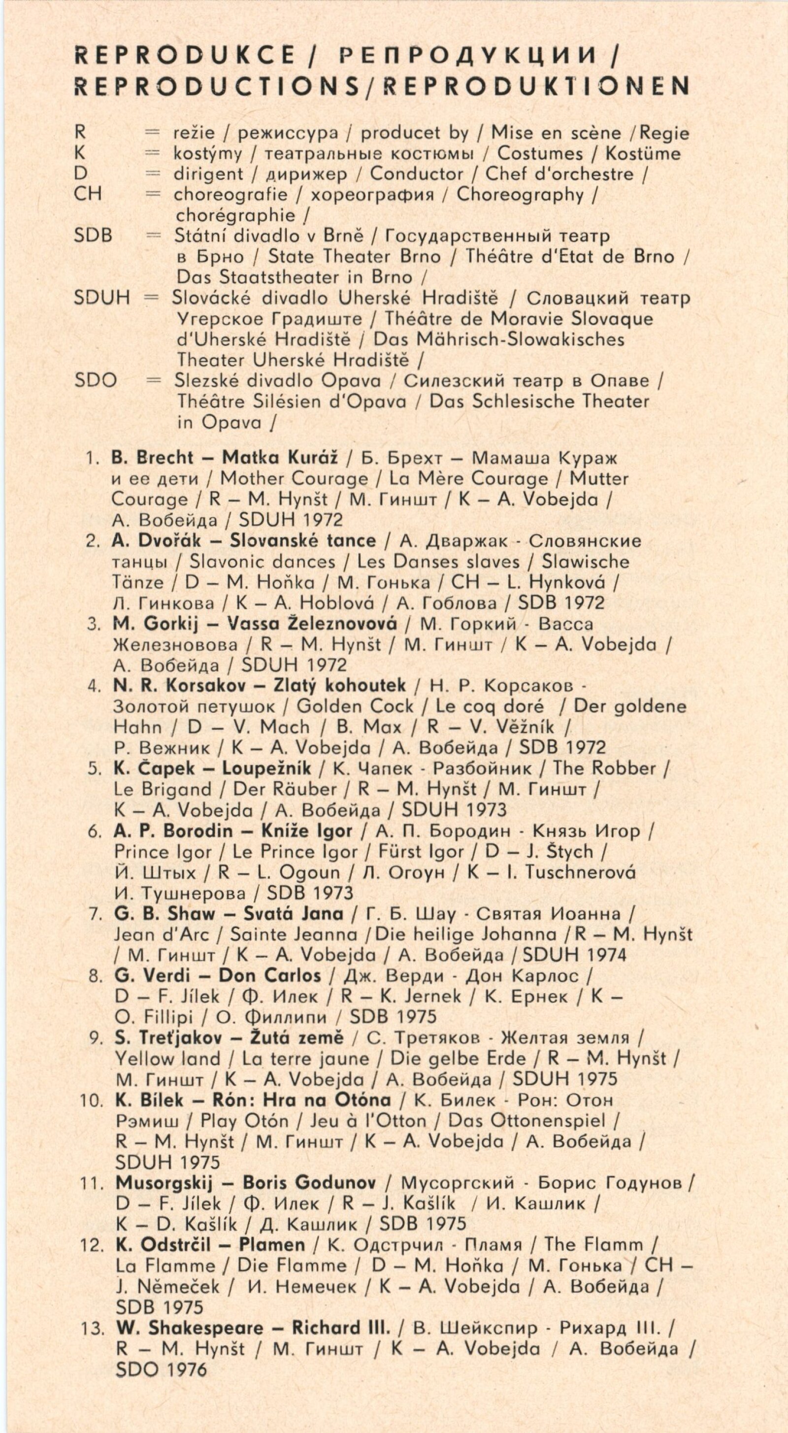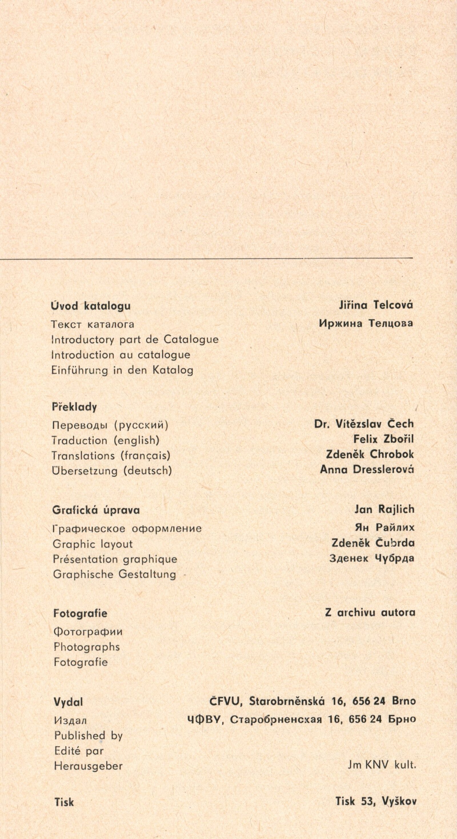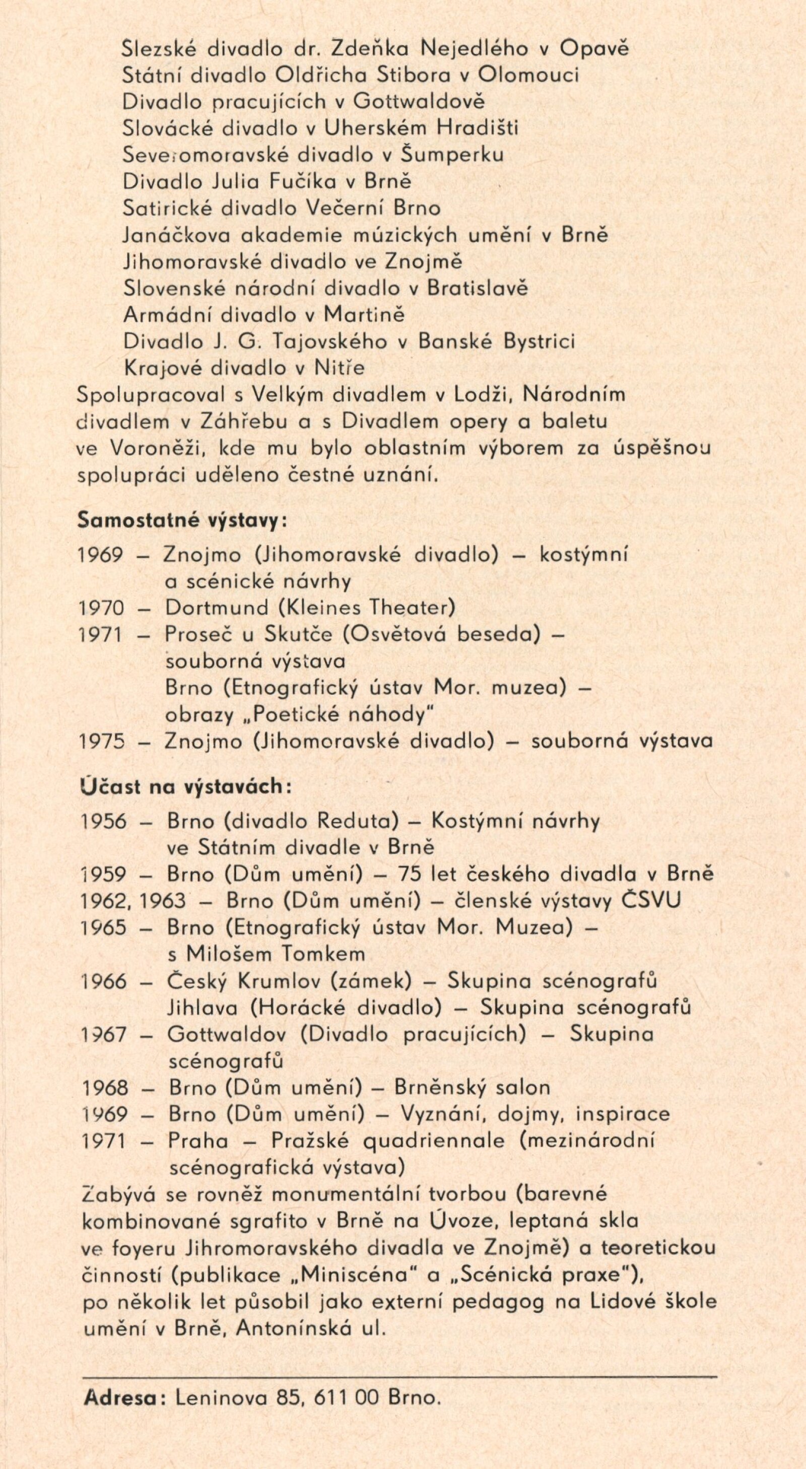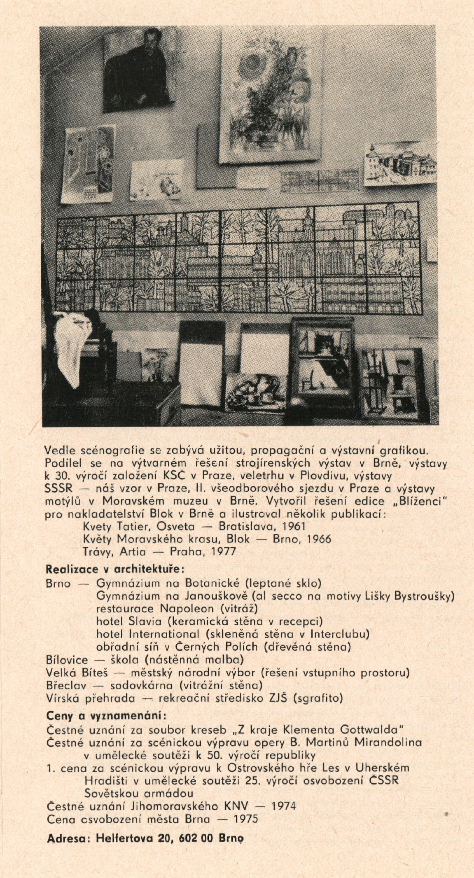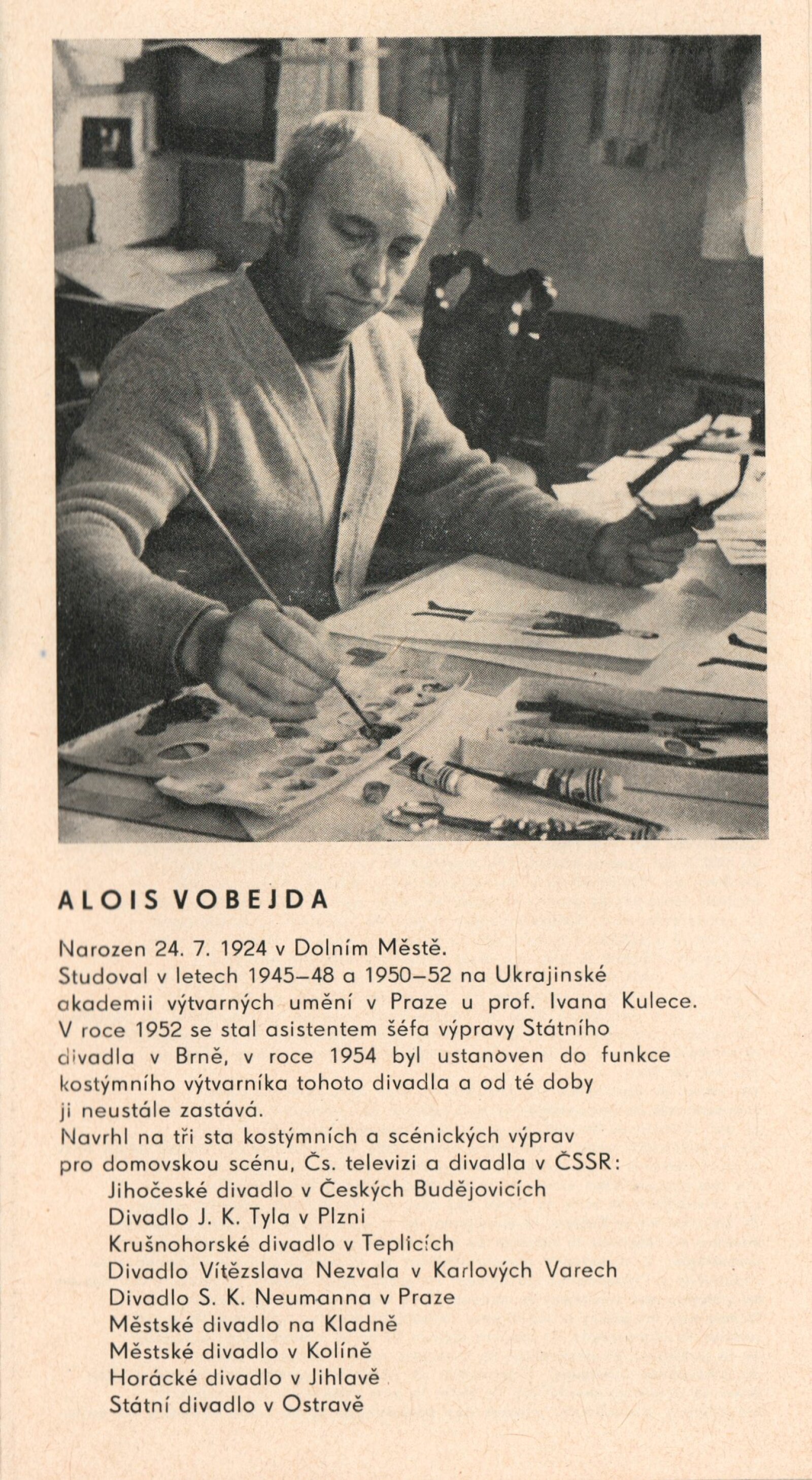 Vojtěch Štolfa. Scény: Dům umění, 79.výstava v Galerii Jaroslava Krále, 26. 4. – 29. 5. 1977 / Text: Jiřina Telcová. – Brno: ČFVU, 1977. – 14 s.,obr., seznam vystavených prací 2 s.. portrét, životopis, seznam výstav, realizací v architektuře, cen, DU 655 / Alois Vobejda. Kostýmy: Dům umění, 79. výstava v Galerii Jaroslava Krále, 26. 4. – 29. 5. 1977 / Text: Jiřina Telcová. – Brno: ČFVU, 1977. – 10 s., obr., seznam vystavených prací 2 s., portrét, životopis, seznam výstav. – DU 655