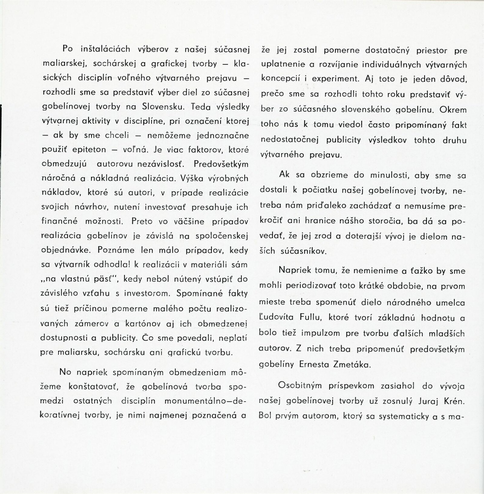 Výběr ze slovenské gobelínové tvorby: Dům umění města Brna / Dům pánů z Kunštátu, 2. 10. – 1. 11. 1970 / Převzatý katalog. IV. Výber zo slovenskej gobelínovej tvroby: Bašta trenčínského hradu, Trenčín, 5. 6. – 30. 7. 1970 / Text: Jaroslav Polakovič. – Bratislava: Osvětový ústav, 1970. – 28 s., obr., portrét, životní data, DPK 447