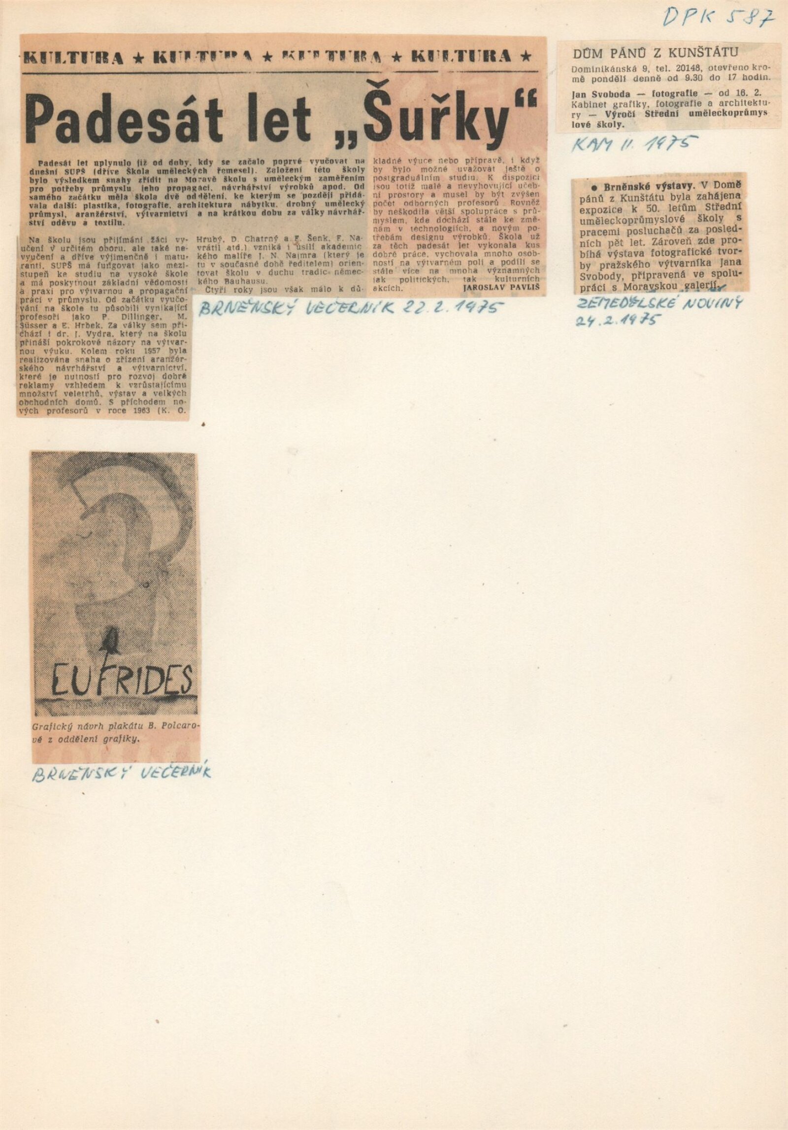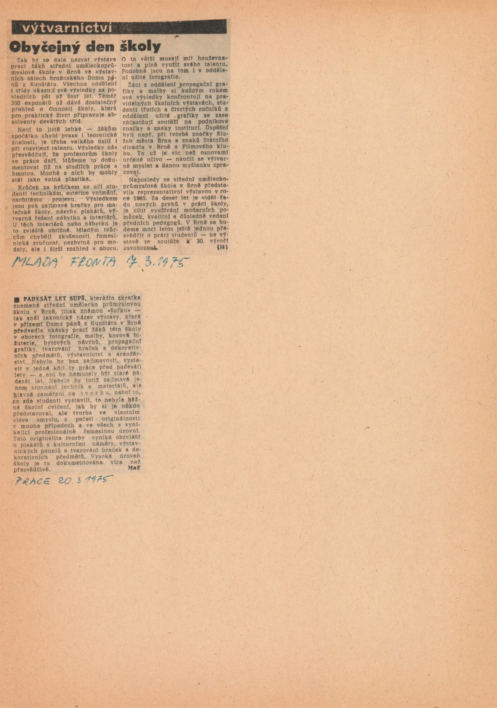 V kabinetu fotografie se prezentovaly práce oboru Fotografie a to jak z oblasti volné i užité tvorby, reklamní, žánrové fotografie i grafiky vytvořené pomocí fotografických technik. Podle hodnocení K. O. Hrubého, který výstavu komentoval v časopise Československá fotografie (1975, č. 10, s. 458) byly vystavené práce absolventů i studentů vyvážené a kvalitní, i když podle autora postrádaly výraznější a novátorské přístupy k danému médiu. V kabinetu architektury se prezentovaly obory Výstavnictví-aranžérství, Drobný umělecký průmysl a nový obor Tvarování plastických hmot, který zde představil například návrhy nafukovacích hraček. Dále zde byly vystaveny návrhy loutek, hraček, výstavnických objektů a další předměty, které podle recenzí vykazovaly cit pro práci s materiálem, hmotou a prostorem a vysokou uměleckou i řemeslnou úroveň. V kabinetu grafiky se představily obory Užitá grafika, Užitá malba a Tvorba interiéru a nábytku, kde byly vedle maleb a grafických děl vystaveny například mozaiky, plakáty, loga, nebo výtvarná řešení nábytku a interiérů. Práce studentů grafiky a malby bývaly na rozdíl od ostatních oborů každoročně prezentovány na školních výstavách a studenti grafického oboru se ve třetím a čtvrtém ročníku účastnili pravidelně podnikových soutěží na návrhy log a firemních značek (úspěšní byli podle recenzí s návrhy pro podnik Služby města Brna, Státní divadlo v Brně i Filmový klub). Pro ostatní obory, studující i čerstvé absolventy a absolventky se jednalo o výjimečnou příležitost prezentace svých realizací, které byly v dobových recenzích hodnoceny velmi pozitivně, jako práce, které svou kvalitou dosahují úrovně profesionální tvorby nikoliv studentských prací. Zahájení výstavy navštívila delegace z bratislavské uměleckoprůmyslové školy, se kterou měla brněnská škola dlouholetou spolupráci. Společně s výstavou školy byla v prvním patře Domu pánů z Kunštátu zahájena samostatná výstava fotografa Jana Svobody. (ms)
