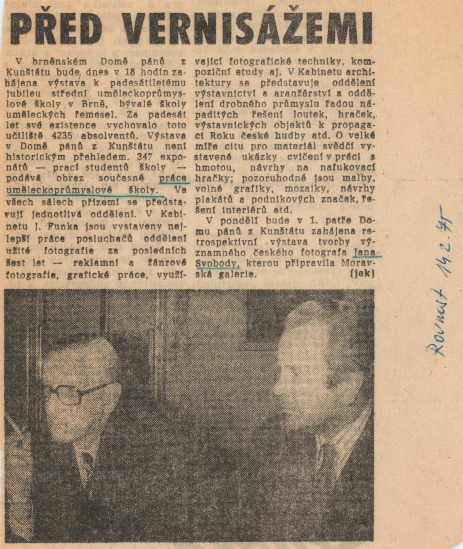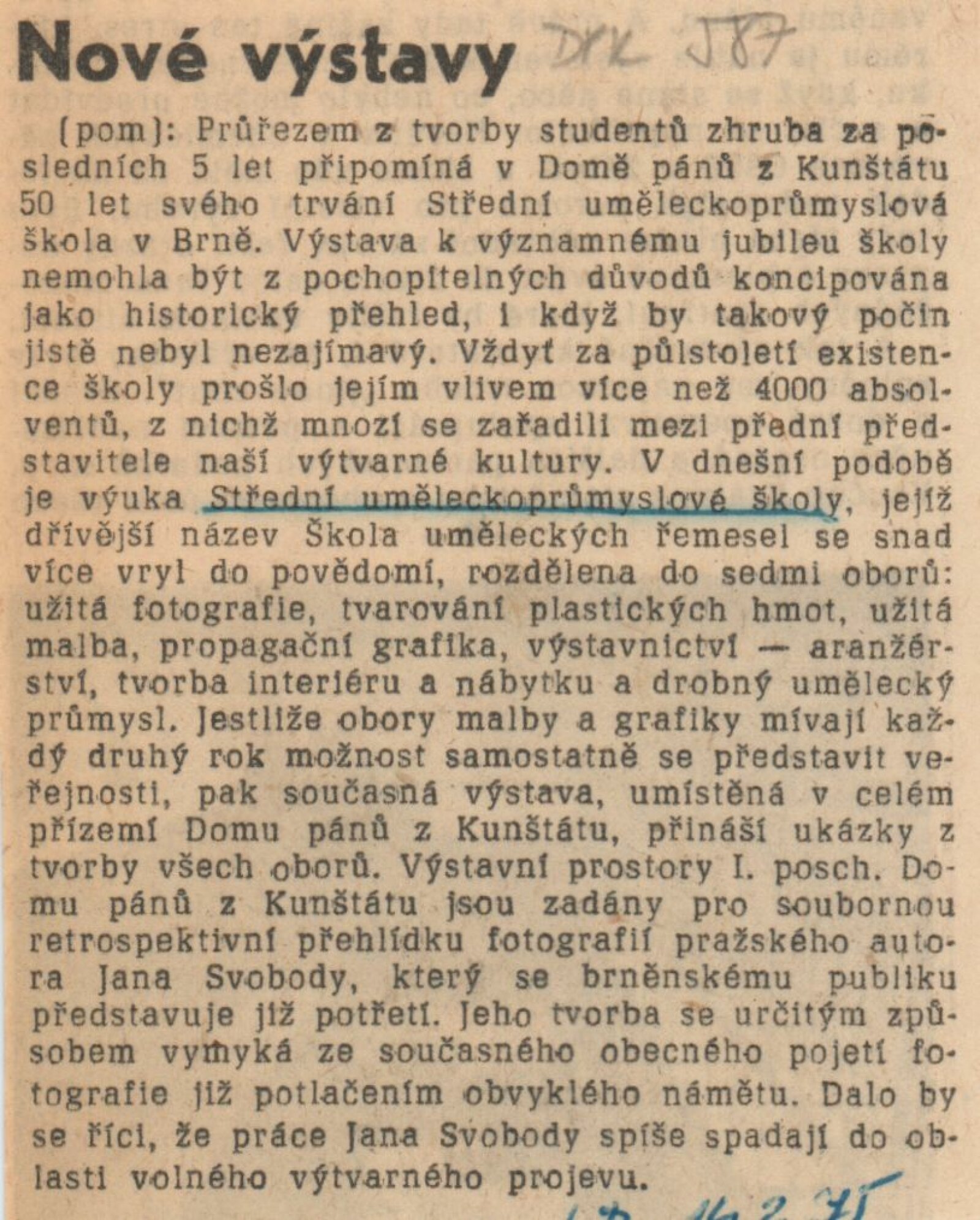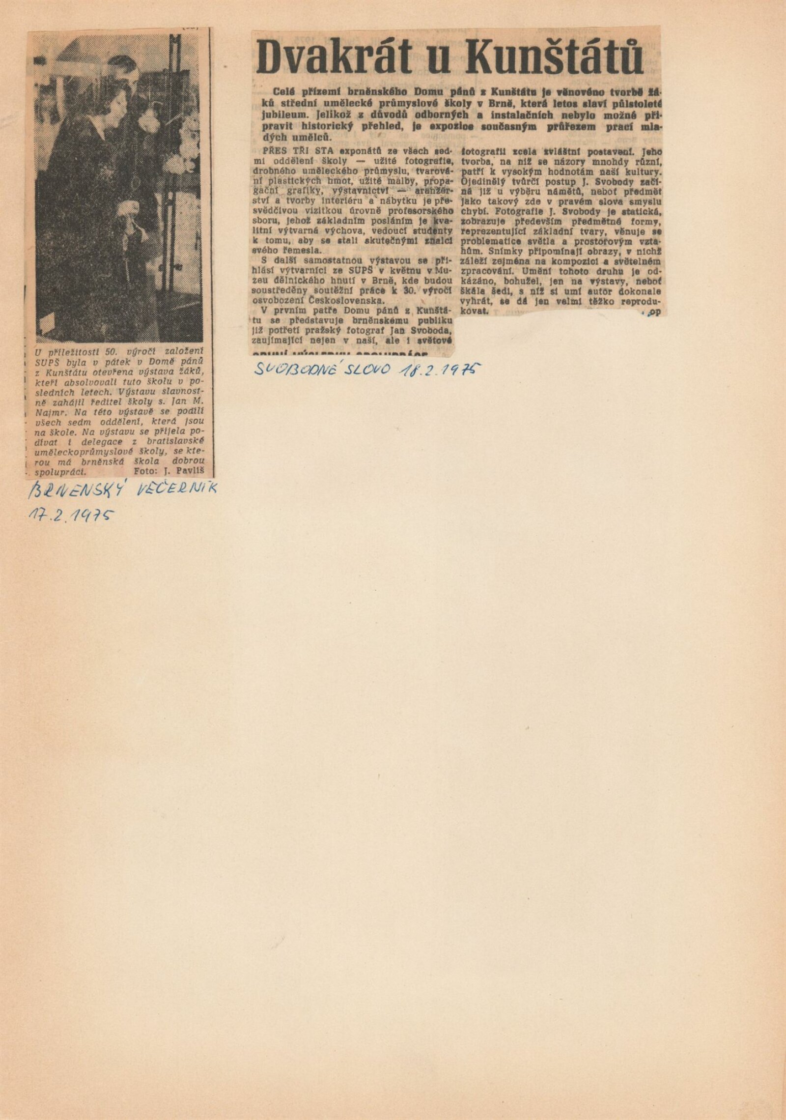V kabinetu fotografie se prezentovaly práce oboru Fotografie a to jak z oblasti volné i užité tvorby, reklamní, žánrové fotografie i grafiky vytvořené pomocí fotografických technik. Podle hodnocení K. O. Hrubého, který výstavu komentoval v časopise Československá fotografie (1975, č. 10, s. 458) byly vystavené práce absolventů i studentů vyvážené a kvalitní, i když podle autora postrádaly výraznější a novátorské přístupy k danému médiu. V kabinetu architektury se prezentovaly obory Výstavnictví-aranžérství, Drobný umělecký průmysl a nový obor Tvarování plastických hmot, který zde představil například návrhy nafukovacích hraček. Dále zde byly vystaveny návrhy loutek, hraček, výstavnických objektů a další předměty, které podle recenzí vykazovaly cit pro práci s materiálem, hmotou a prostorem a vysokou uměleckou i řemeslnou úroveň. V kabinetu grafiky se představily obory Užitá grafika, Užitá malba a Tvorba interiéru a nábytku, kde byly vedle maleb a grafických děl vystaveny například mozaiky, plakáty, loga, nebo výtvarná řešení nábytku a interiérů. Práce studentů grafiky a malby bývaly na rozdíl od ostatních oborů každoročně prezentovány na školních výstavách a studenti grafického oboru se ve třetím a čtvrtém ročníku účastnili pravidelně podnikových soutěží na návrhy log a firemních značek (úspěšní byli podle recenzí s návrhy pro podnik Služby města Brna, Státní divadlo v Brně i Filmový klub). Pro ostatní obory, studující i čerstvé absolventy a absolventky se jednalo o výjimečnou příležitost prezentace svých realizací, které byly v dobových recenzích hodnoceny velmi pozitivně, jako práce, které svou kvalitou dosahují úrovně profesionální tvorby nikoliv studentských prací. Zahájení výstavy navštívila delegace z bratislavské uměleckoprůmyslové školy, se kterou měla brněnská škola dlouholetou spolupráci. Společně s výstavou školy byla v prvním patře Domu pánů z Kunštátu zahájena samostatná výstava fotografa Jana Svobody. (ms)