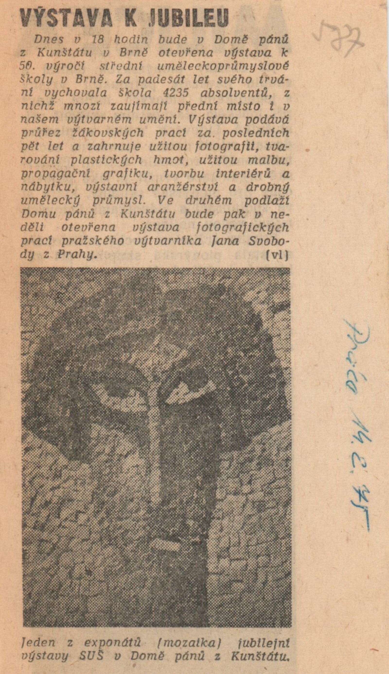 Při příležitosti kulatého výročí od založení Střední uměleckoprůmyslové školy v Brně (název školy se v průběhu let měnil, nejznámější a nejdéle používaný byl název Střední škola umění a řemesel, dnes Střední škola umění a designu) připravilo vedení školy ve spolupráci s Domem umění města Brna reprezentativní výstavu realizovanou v přízemních kabinetech Domu pánů z Kunštátu. Jednalo se o první reprezentativní výstavu školy uspořádanou v této spolupráci, která se v následujících obdobích opakovala. Koncepci výstavy, výběr jednotlivých prací i realizaci výstavy, včetně vydání katalogu měla ve své kompetenci škola. Vzhledem k prostorovým a instalačním možnostem se rozhodla pojmout výstavu nikoliv jako reprezentativní přehlídku osobností a významných pedagogů, ale jako prezentaci soudobé podoby školy a jejich oborů s ukázkami aktuálních prací studentů a čerstvých absolventů z posledních pěti let.