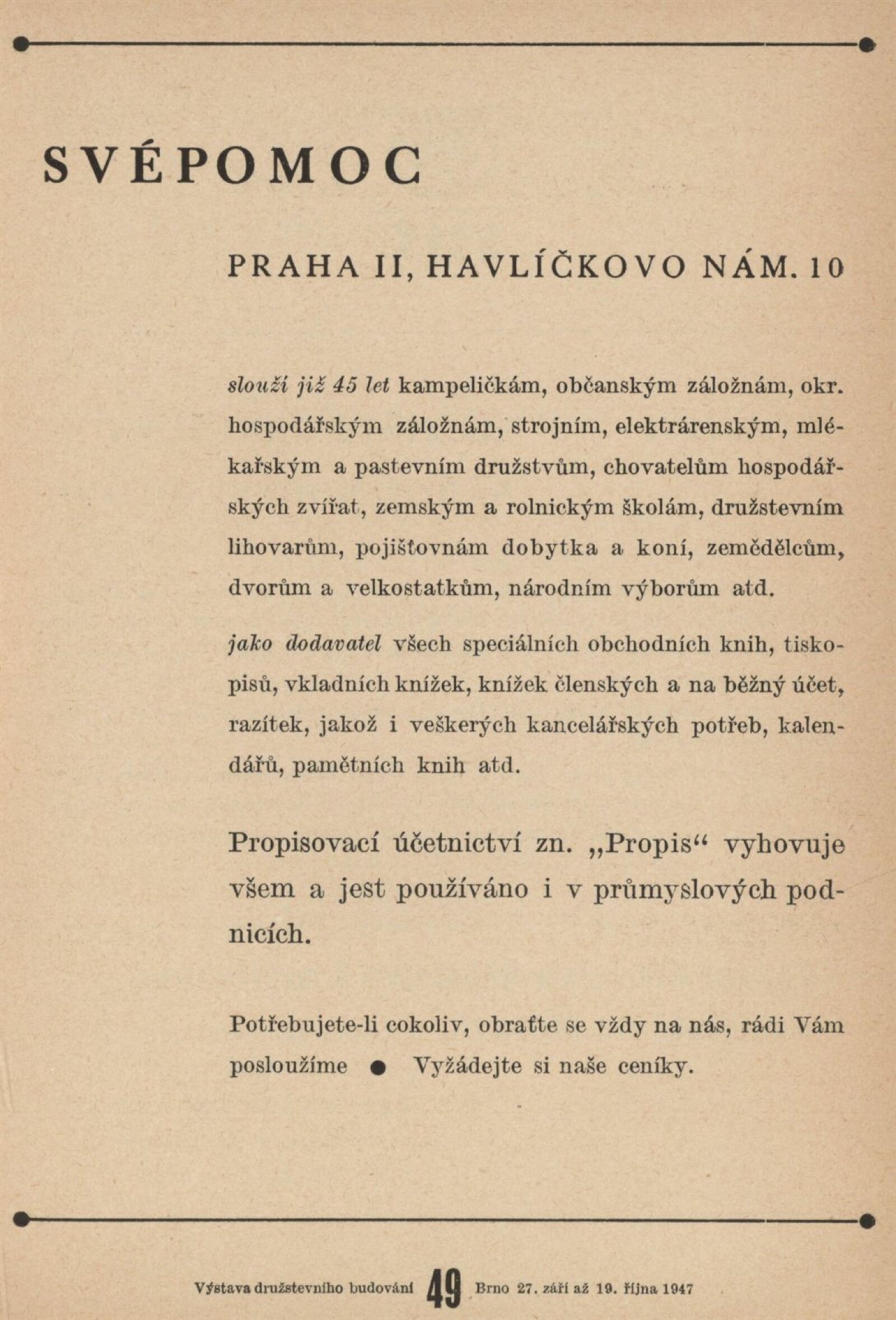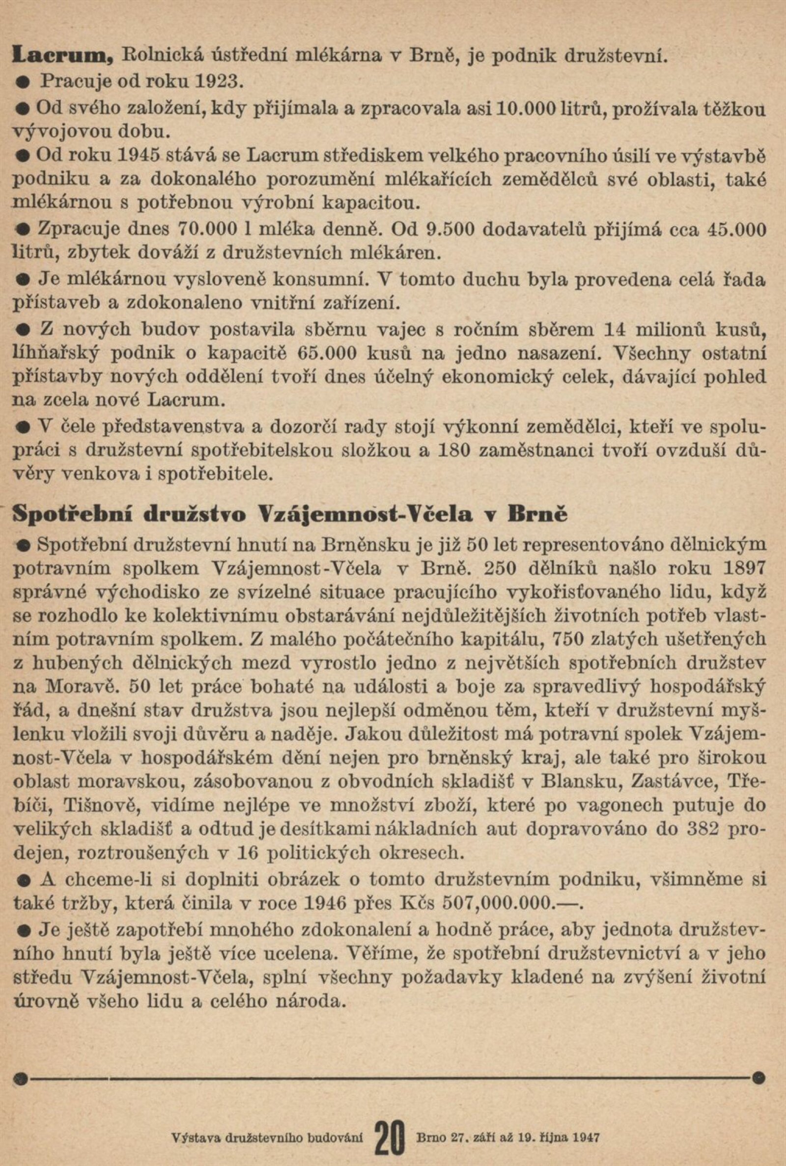 Výstava družstevního budování: Dům umění v Brně, 27. 9. – 19. 10. 1947 / Text: Jaroslav Ondroušek, František Venera. – Brno: Výstavní výbor, 1947. – 64 s., DU 47. – MZK; MG; MMB