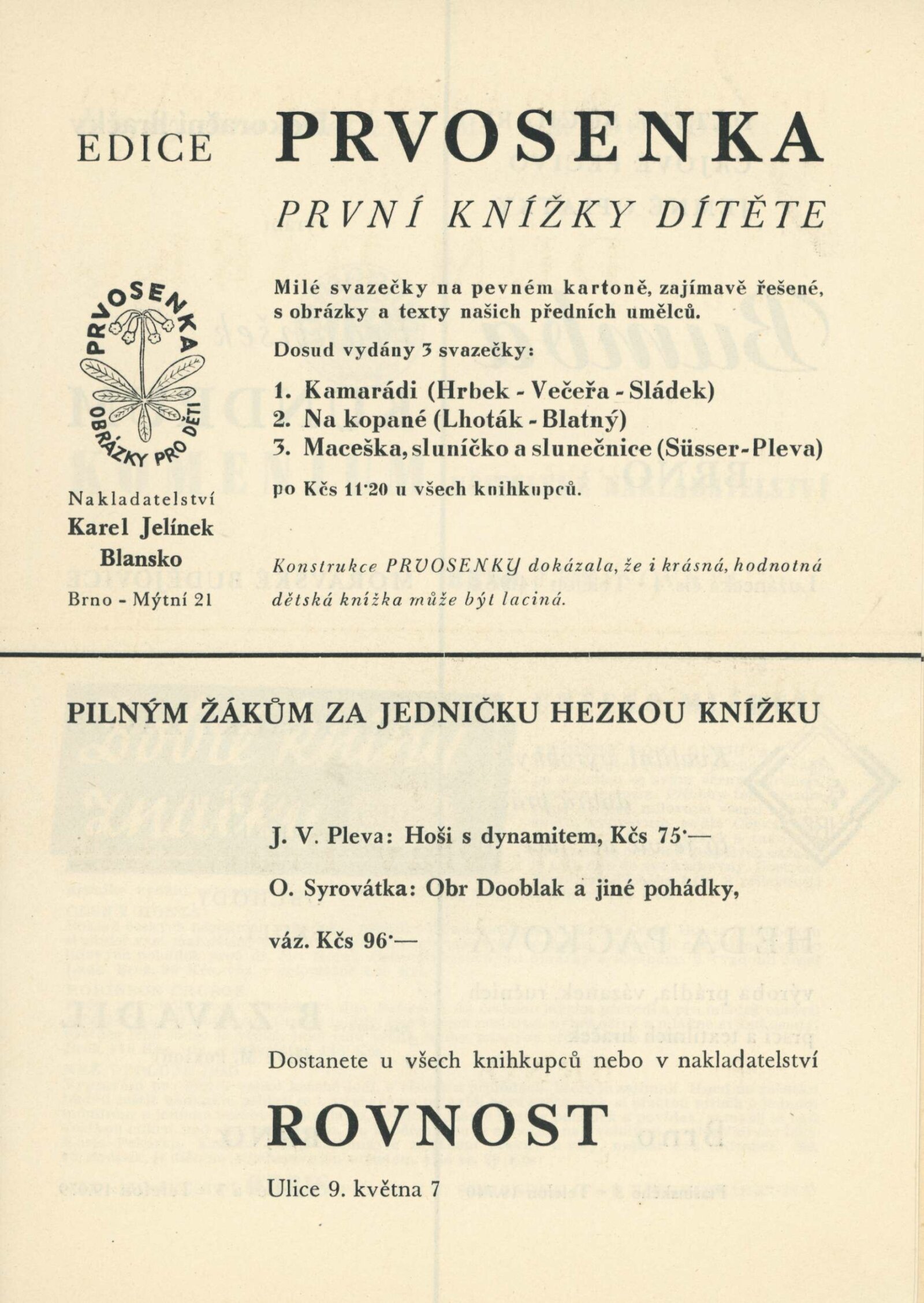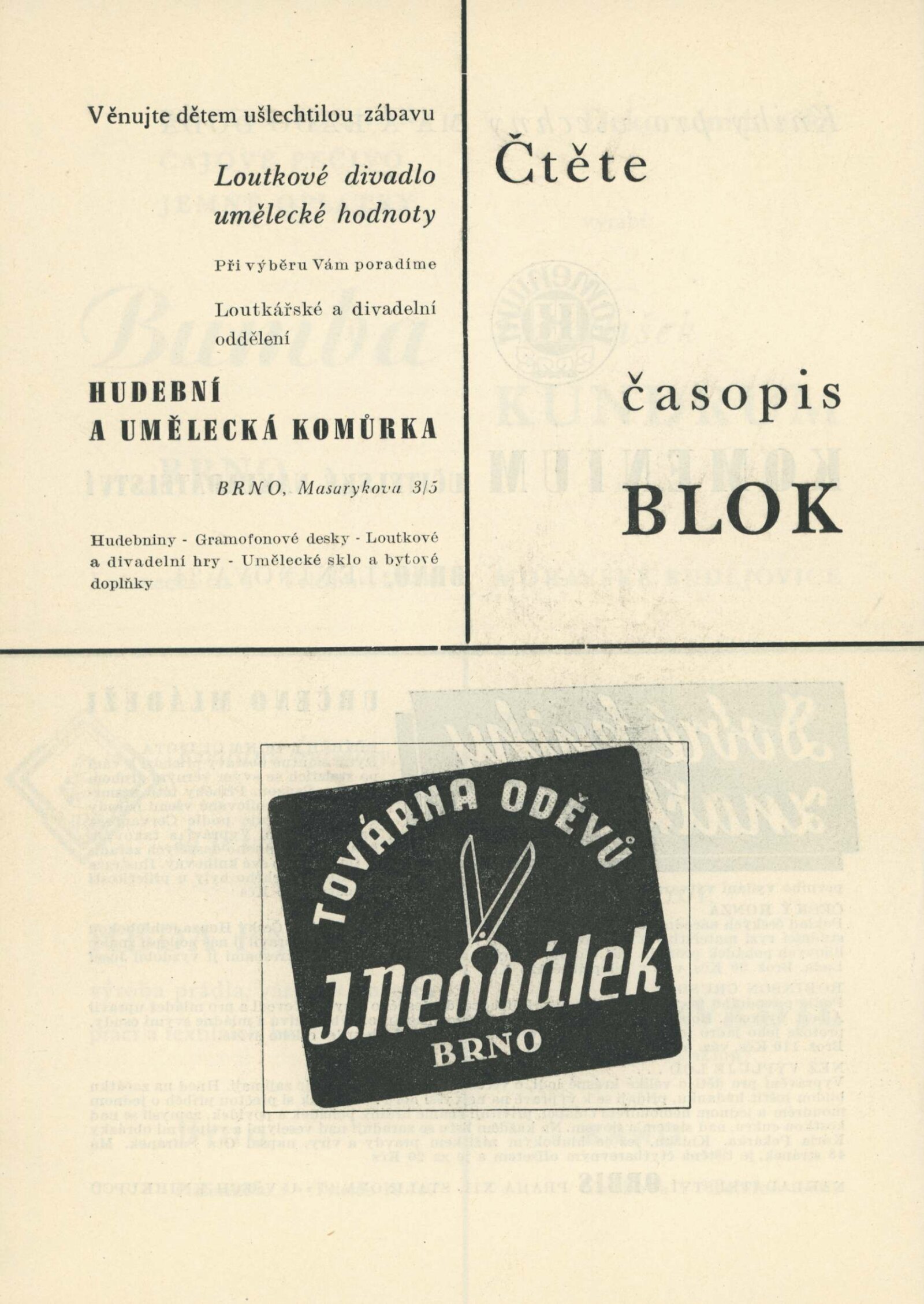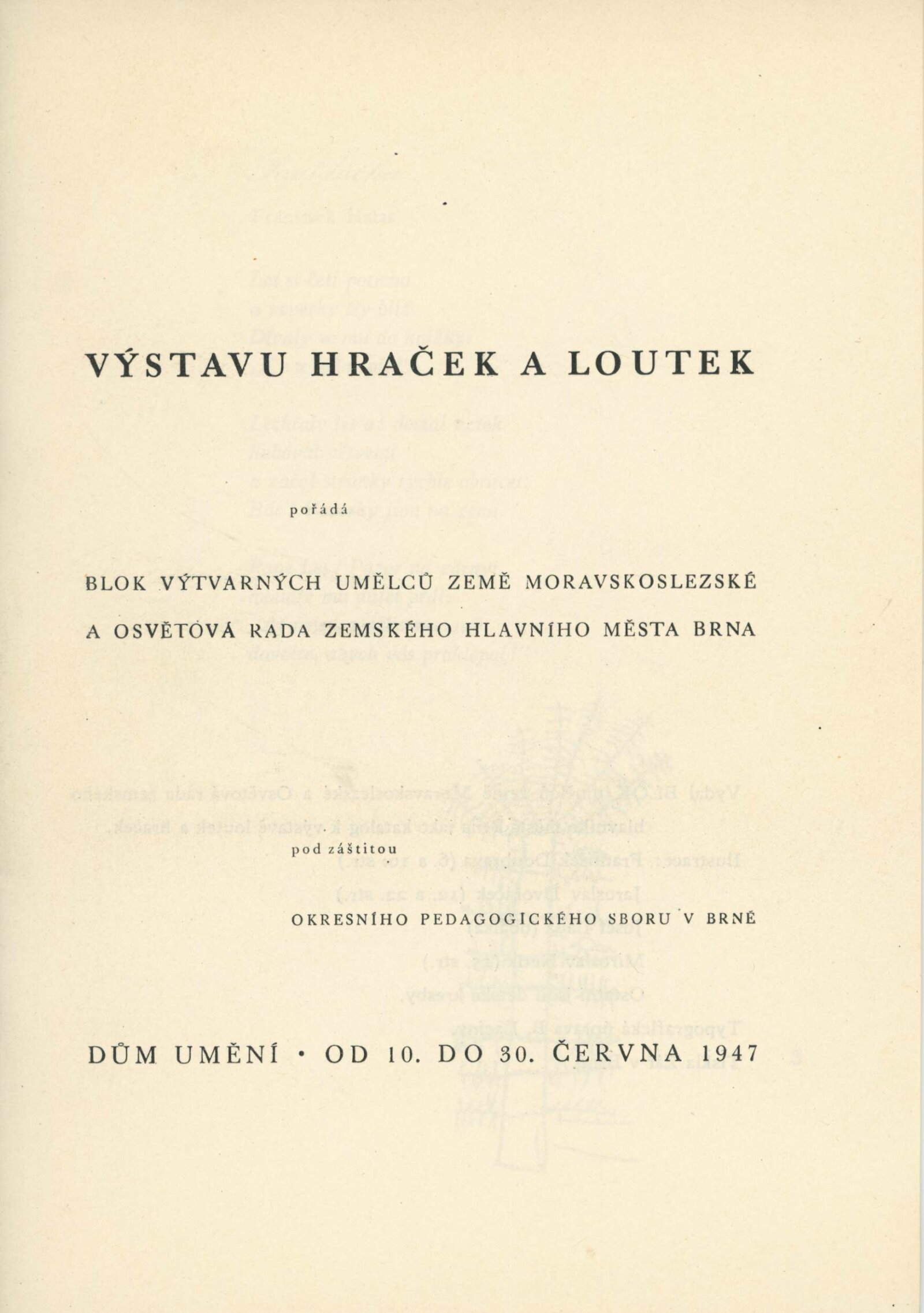 Výstava hraček a loutek: Dům umění v Brně, 10. 6. – 30. 6. 1947 / Text: Karel Langer, Vladimír Matoušek. – Brno: Blok výtvarných umělců země Moravskoslezské, 1947. – 34 s., DU 45a. – Kubíček 8081; MZK; MG; AMB; MMB