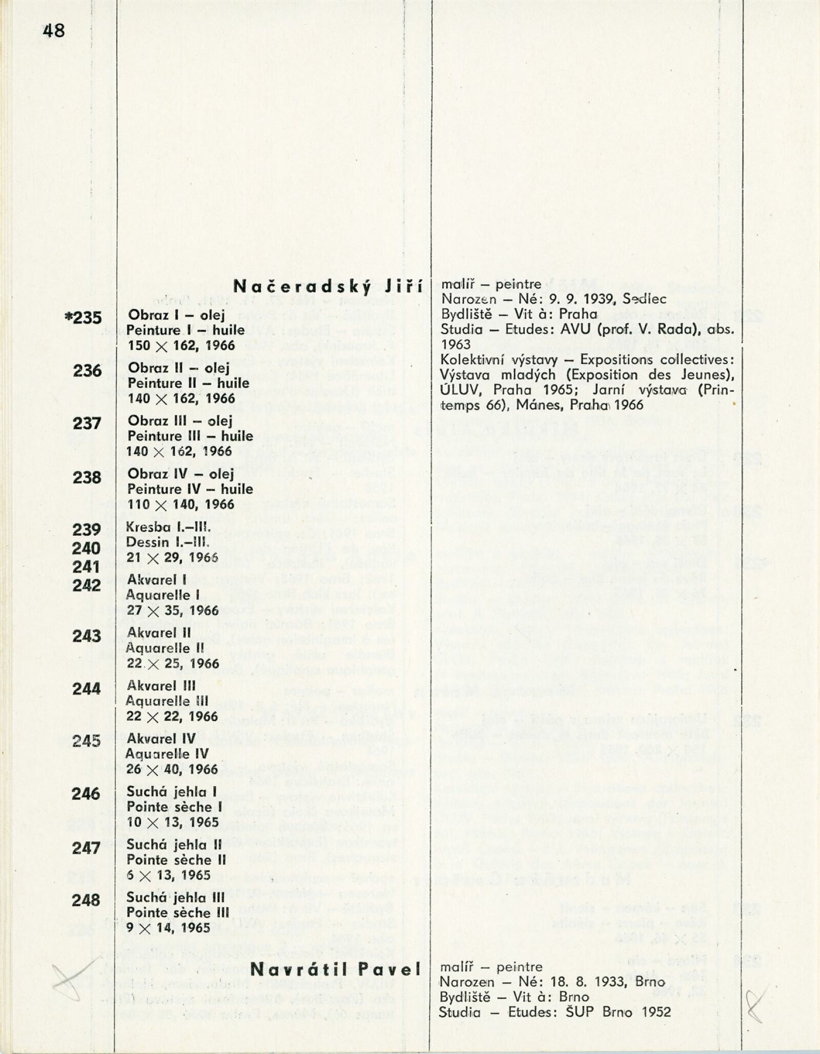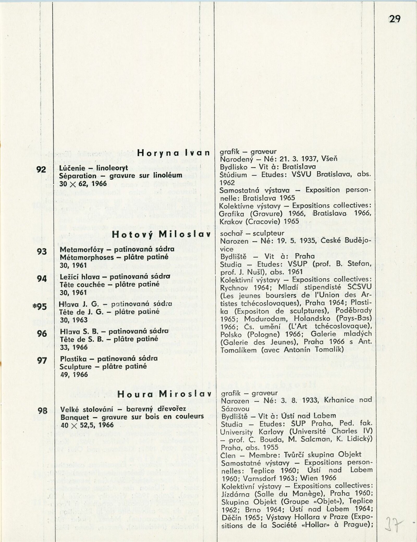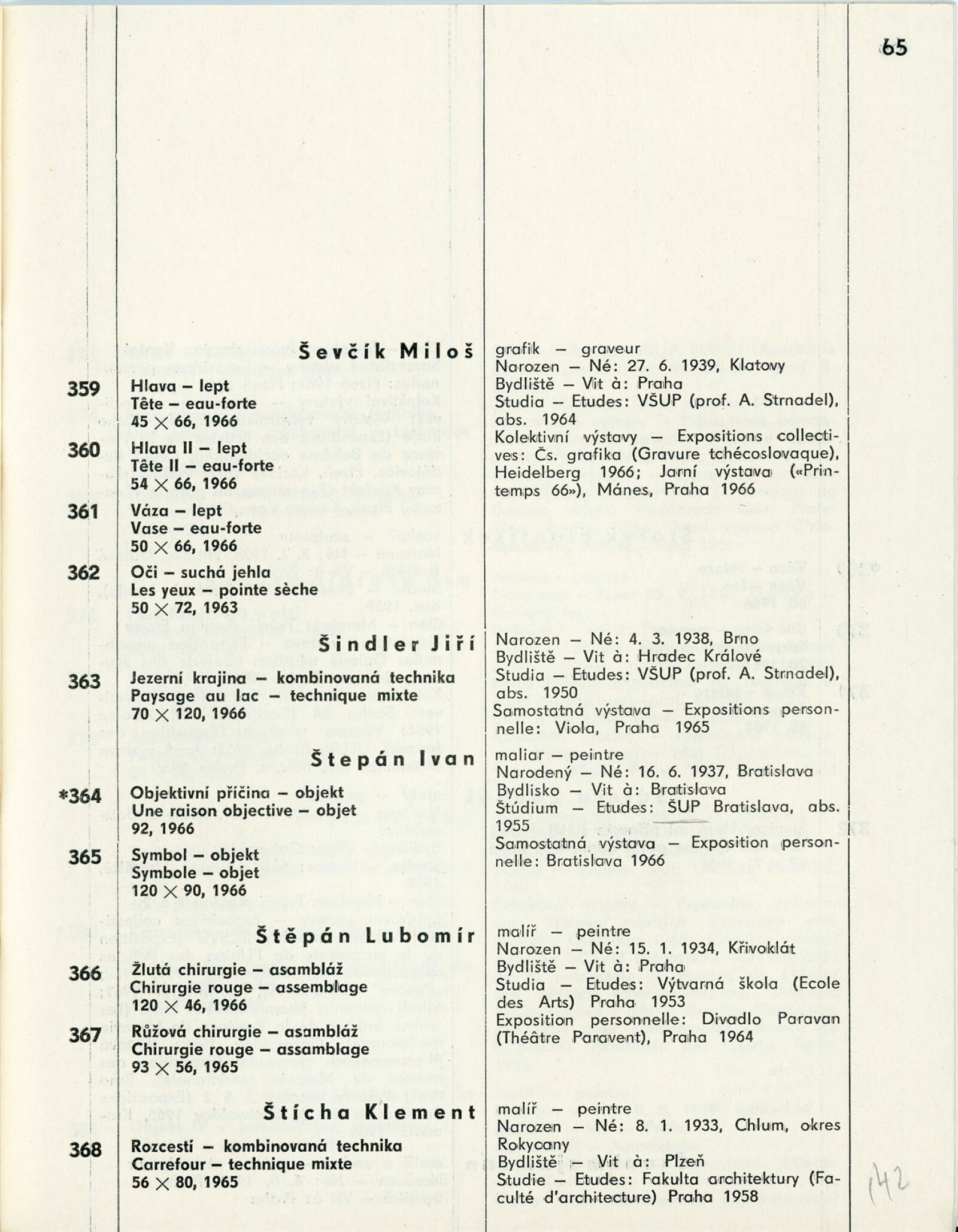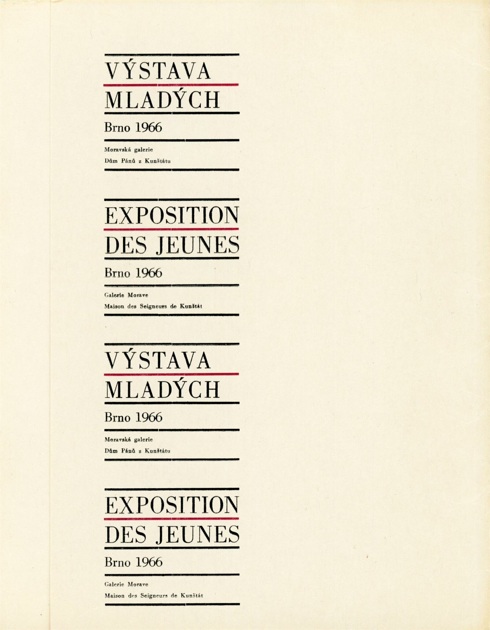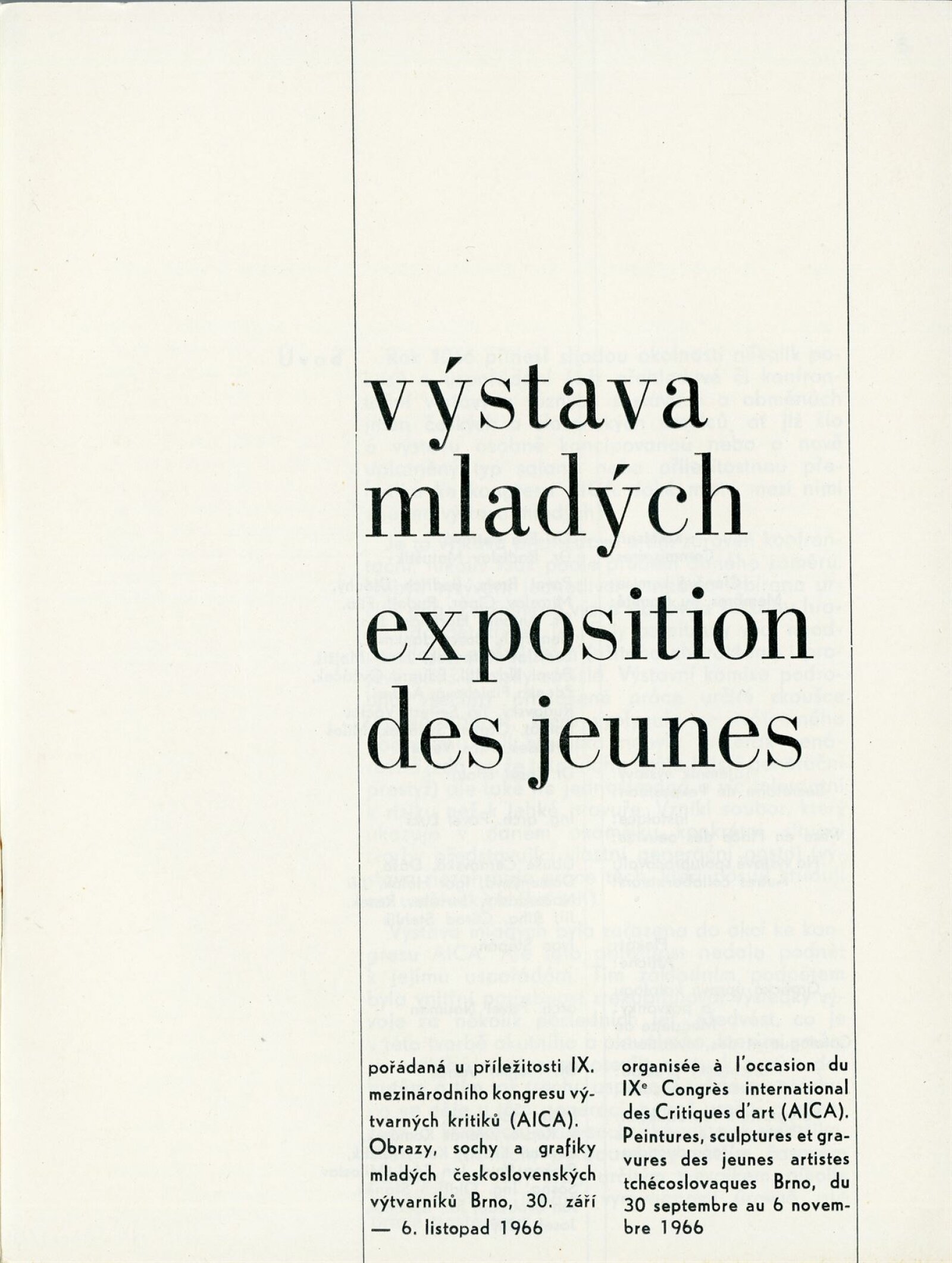 Výstava mladých Brno 1966 pořádaná u příležitosti IX. mezinárodního kongresu výtvarných kritiků (AICA). Obrazy, sochy a grafiky mladých československých výtvarníků: Dům umění města Brna / Dům pánů z Kunštátu, Moravská galerie v Brně, 30. 9. – 6. 11. 1966 / Texty: Eva Petrová, Radislav Matuštík. – Brno: SČSVU, 1966. – 74 s. životní data vystavujících, DPK 311. – MZK; MG