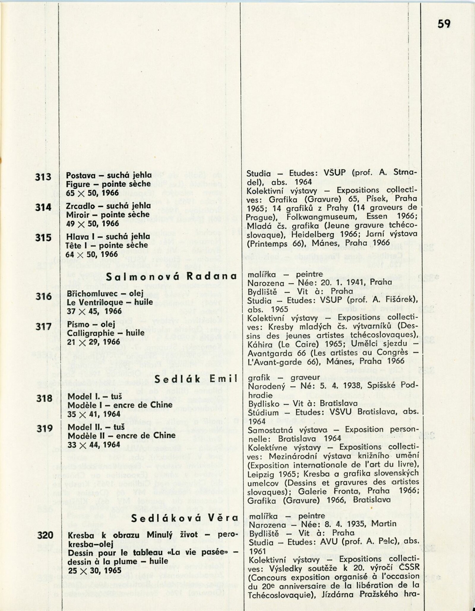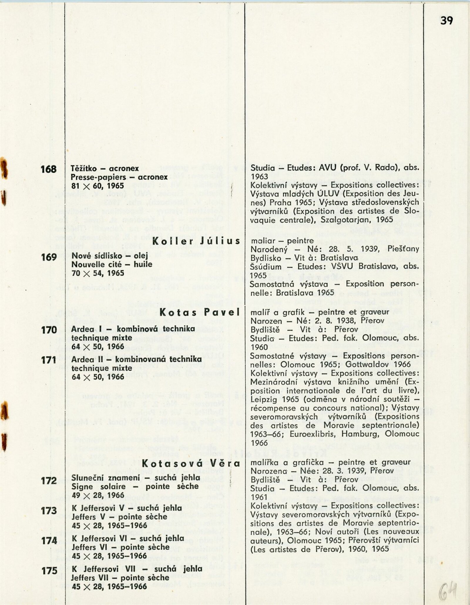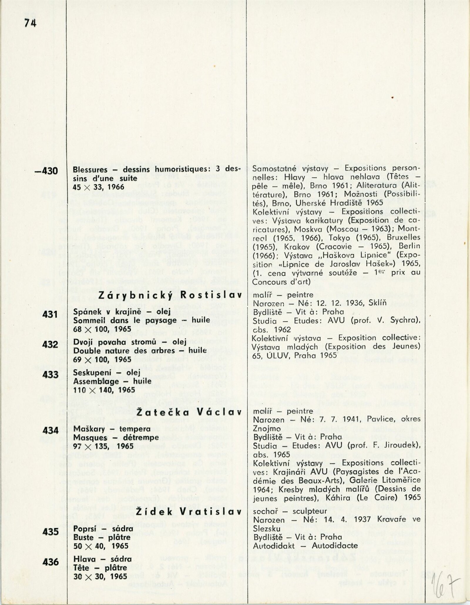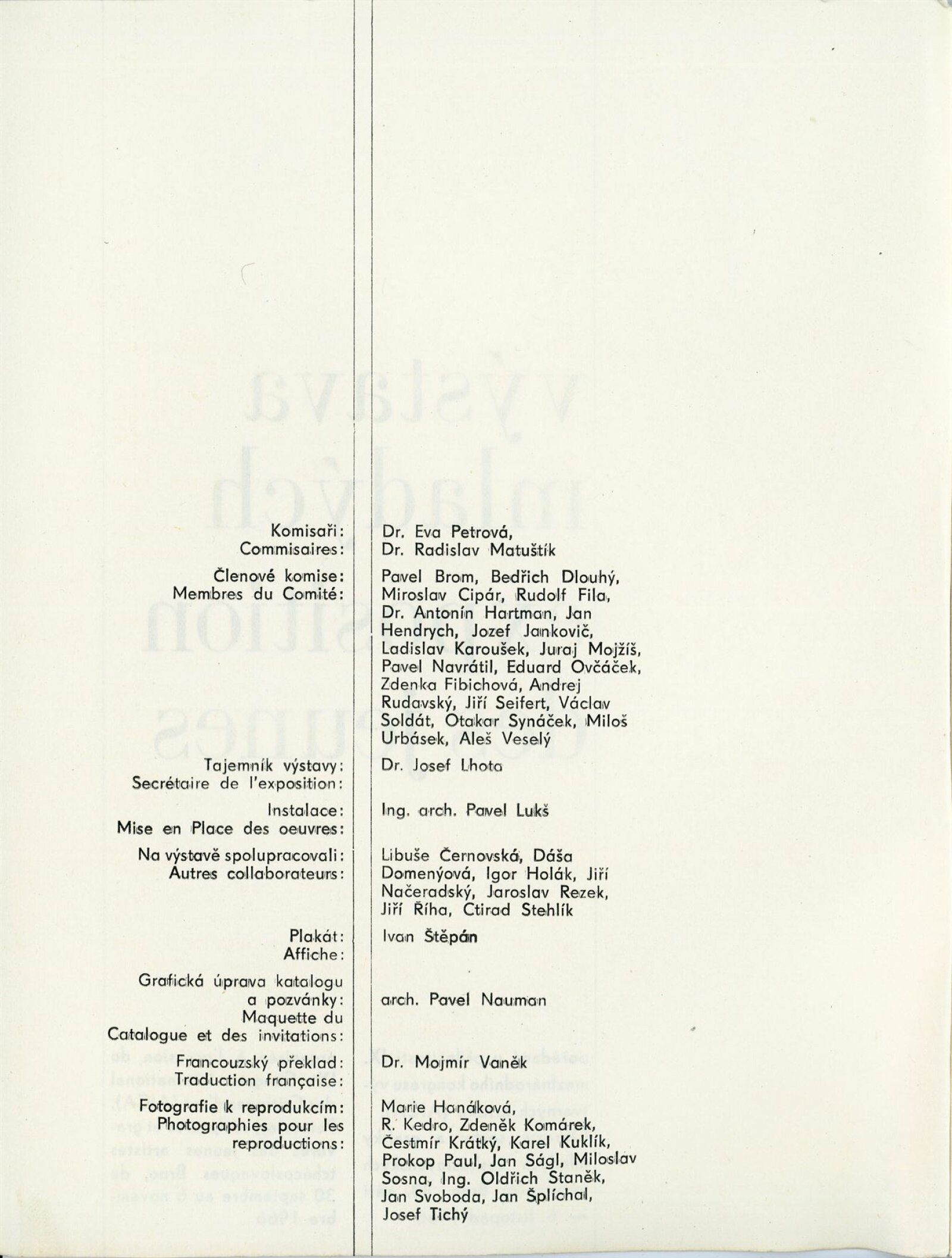 Výstava mladých Brno 1966 pořádaná u příležitosti IX. mezinárodního kongresu výtvarných kritiků (AICA). Obrazy, sochy a grafiky mladých československých výtvarníků: Dům umění města Brna / Dům pánů z Kunštátu, Moravská galerie v Brně, 30. 9. – 6. 11. 1966 / Texty: Eva Petrová, Radislav Matuštík. – Brno: SČSVU, 1966. – 74 s. životní data vystavujících, DPK 311. – MZK; MG