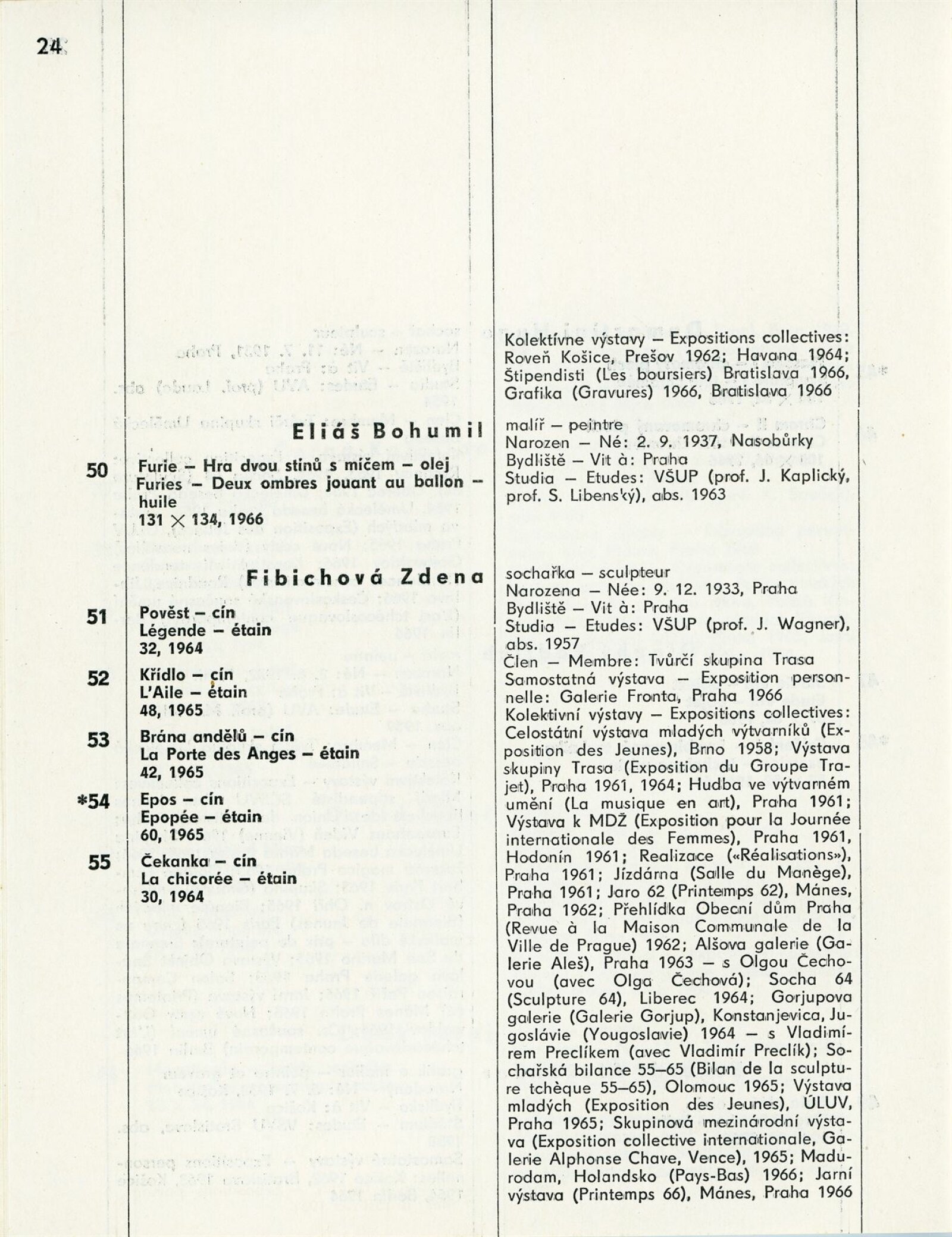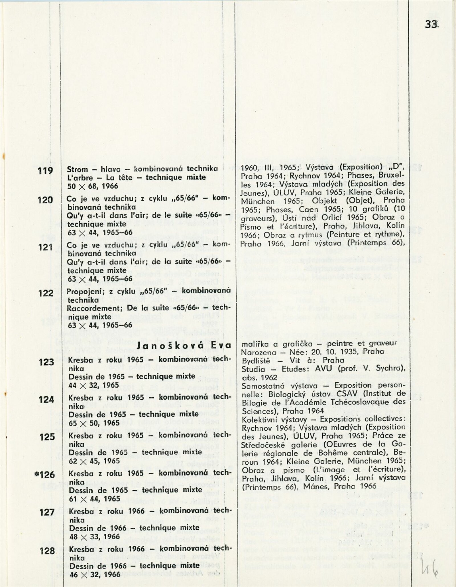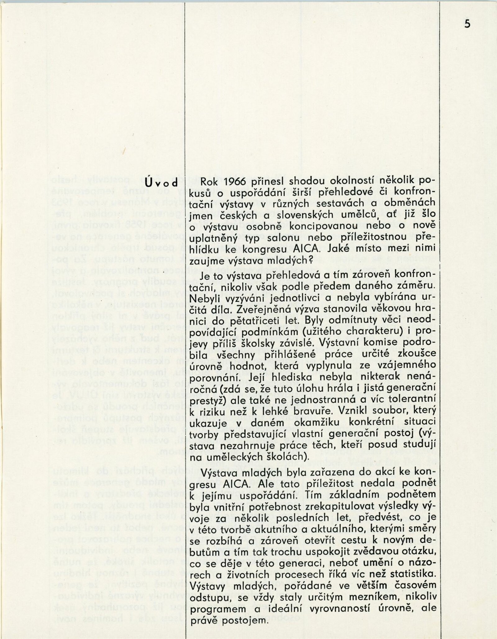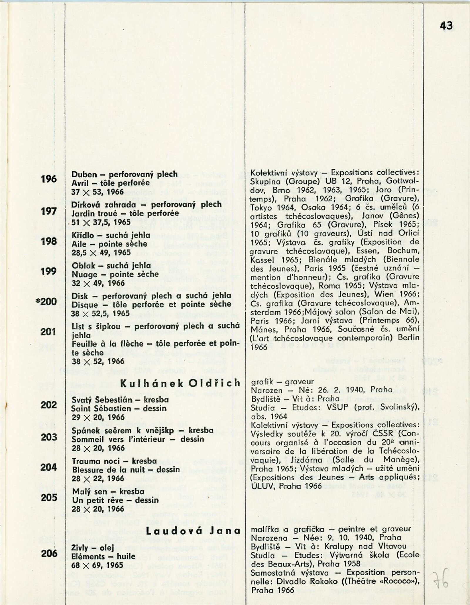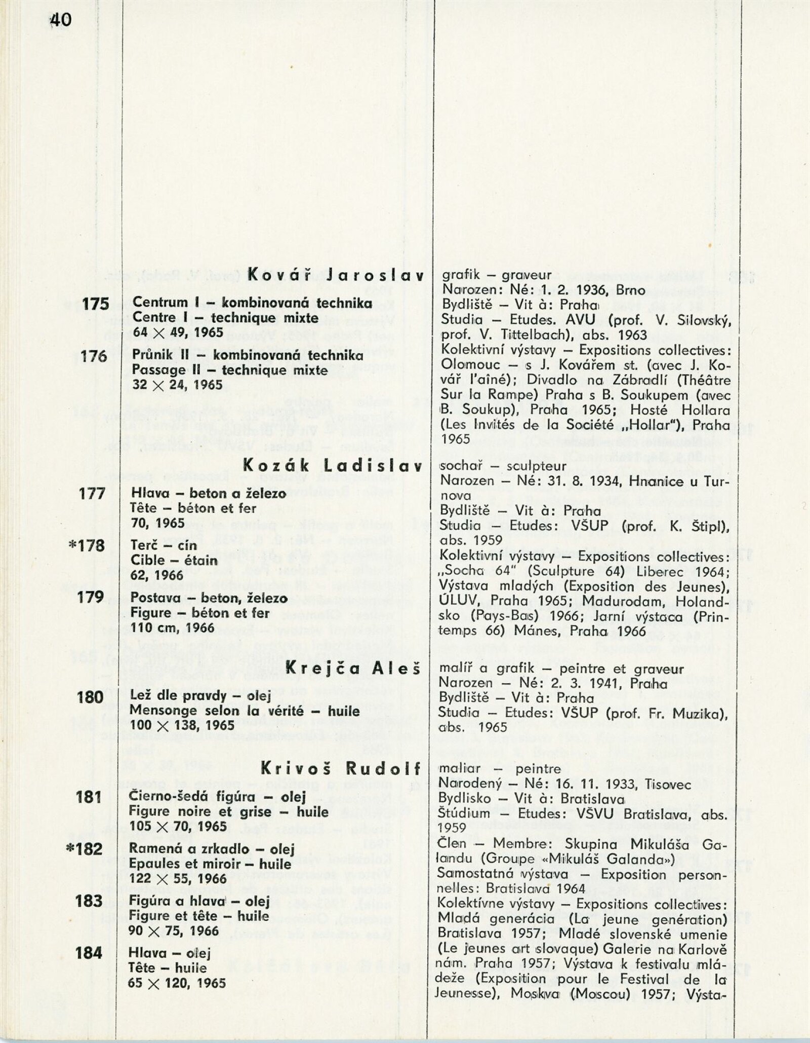 Výstava mladých Brno 1966 pořádaná u příležitosti IX. mezinárodního kongresu výtvarných kritiků (AICA). Obrazy, sochy a grafiky mladých československých výtvarníků: Dům umění města Brna / Dům pánů z Kunštátu, Moravská galerie v Brně, 30. 9. – 6. 11. 1966 / Texty: Eva Petrová, Radislav Matuštík. – Brno: SČSVU, 1966. – 74 s. životní data vystavujících, DPK 311. – MZK; MG