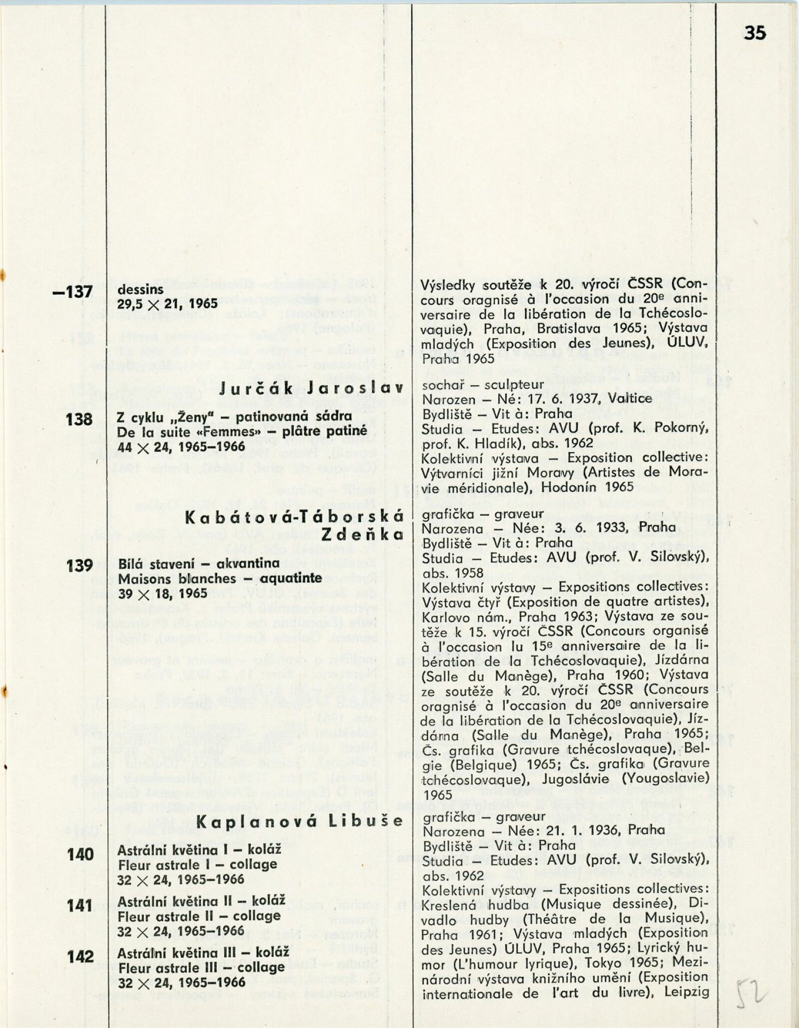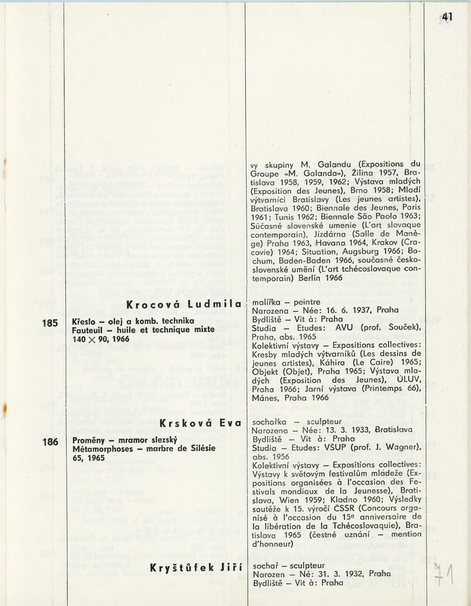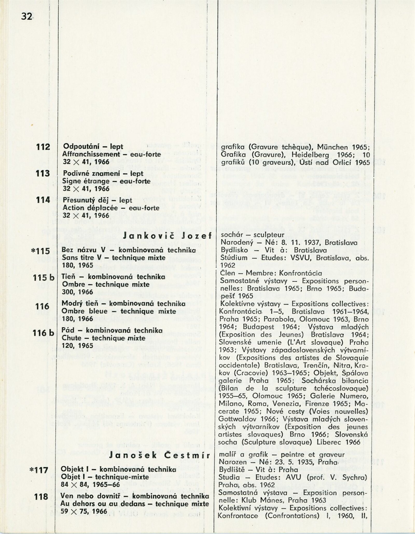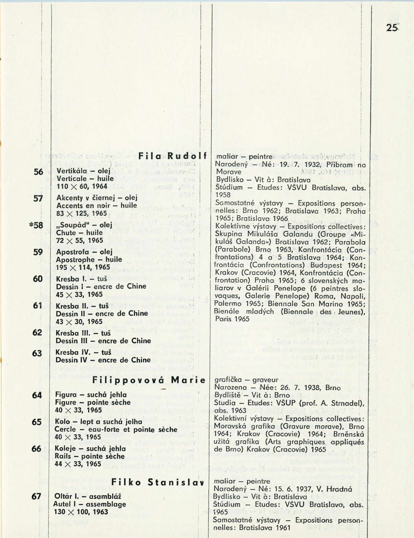 Výstava mladých Brno 1966 pořádaná u příležitosti IX. mezinárodního kongresu výtvarných kritiků (AICA). Obrazy, sochy a grafiky mladých československých výtvarníků: Dům umění města Brna / Dům pánů z Kunštátu, Moravská galerie v Brně, 30. 9. – 6. 11. 1966 / Texty: Eva Petrová, Radislav Matuštík. – Brno: SČSVU, 1966. – 74 s. životní data vystavujících, DPK 311. – MZK; MG