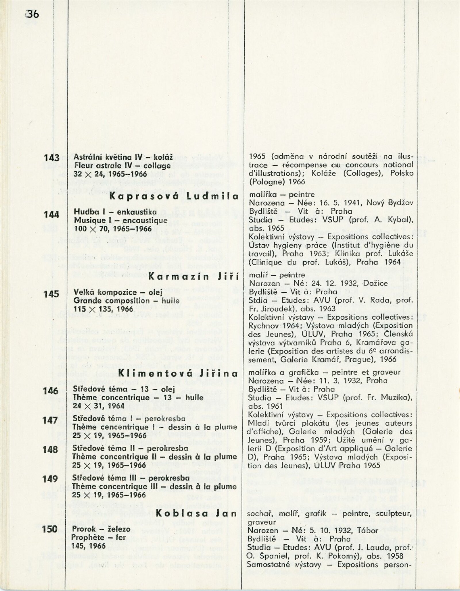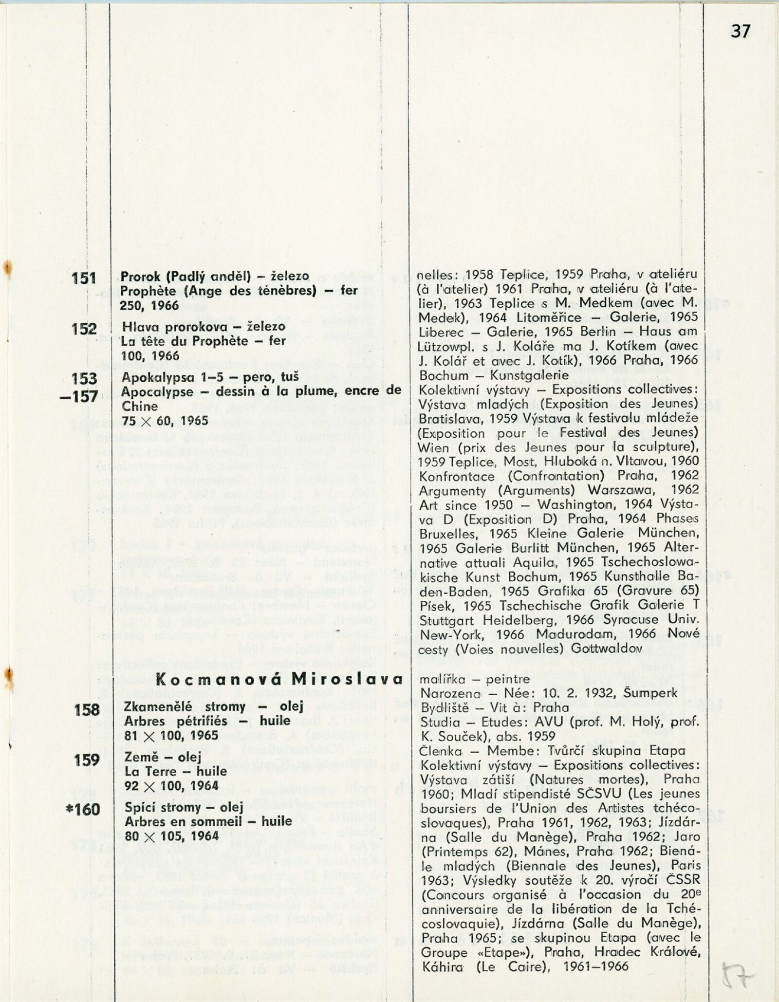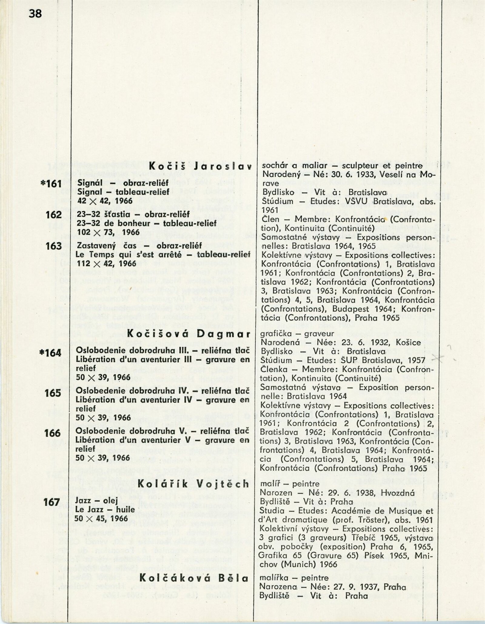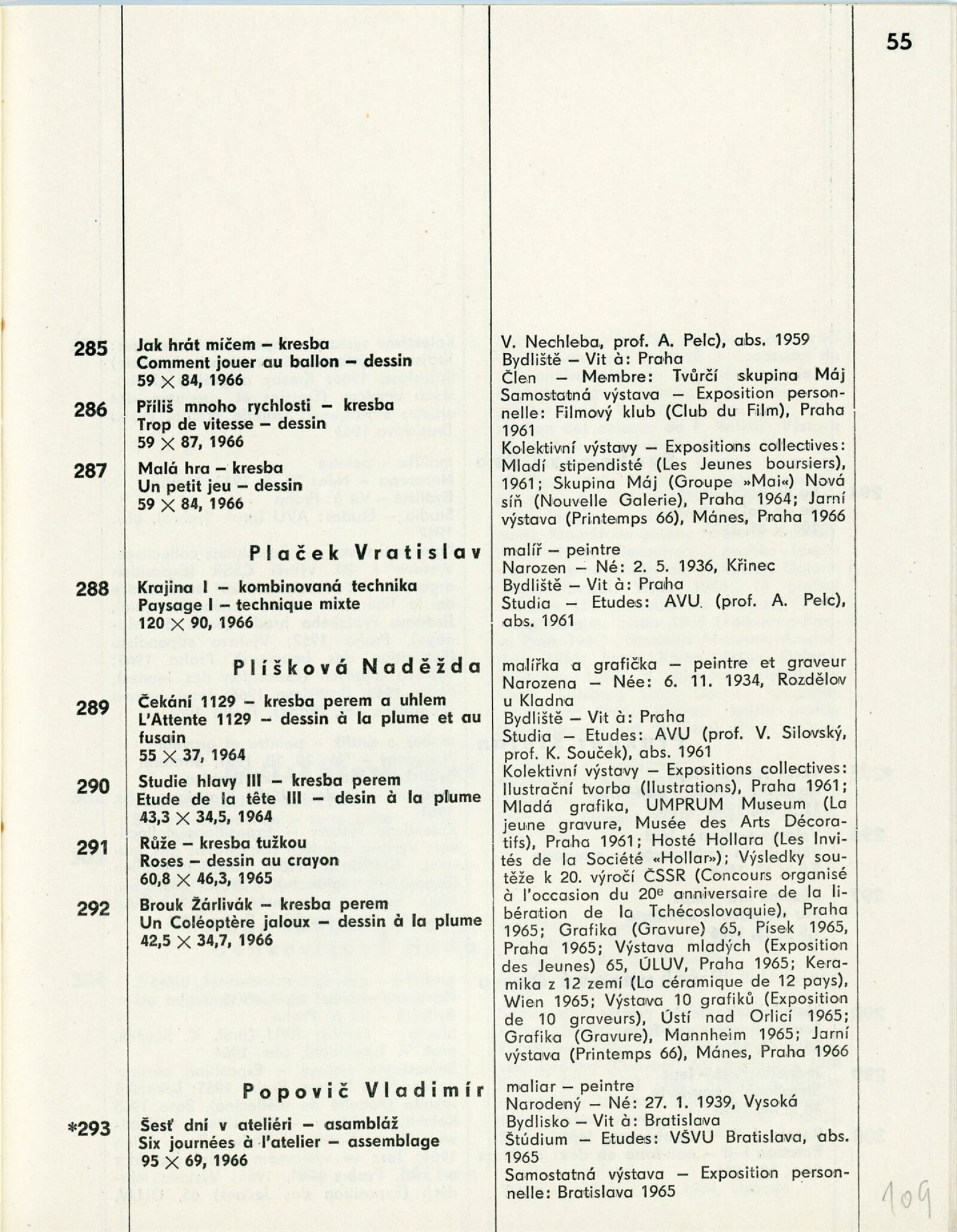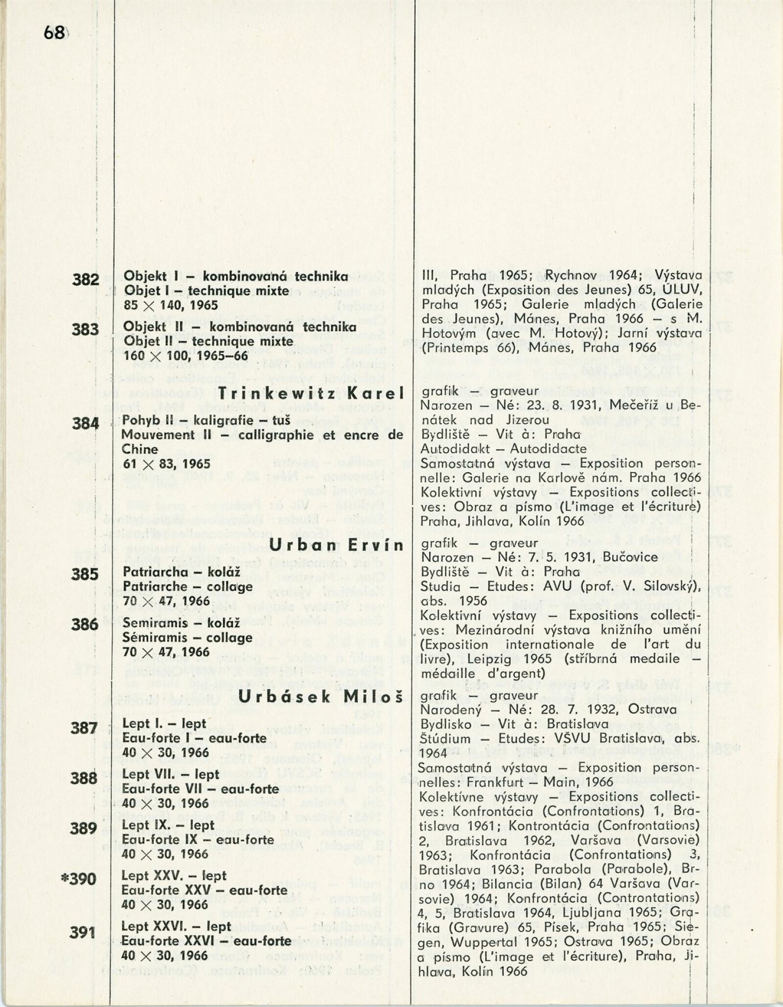Výstava mladých Brno 1966 pořádaná u příležitosti IX. mezinárodního kongresu výtvarných kritiků (AICA). Obrazy, sochy a grafiky mladých československých výtvarníků: Dům umění města Brna / Dům pánů z Kunštátu, Moravská galerie v Brně, 30. 9. – 6. 11. 1966 / Texty: Eva Petrová, Radislav Matuštík. – Brno: SČSVU, 1966. – 74 s. životní data vystavujících, DPK 311. – MZK; MG