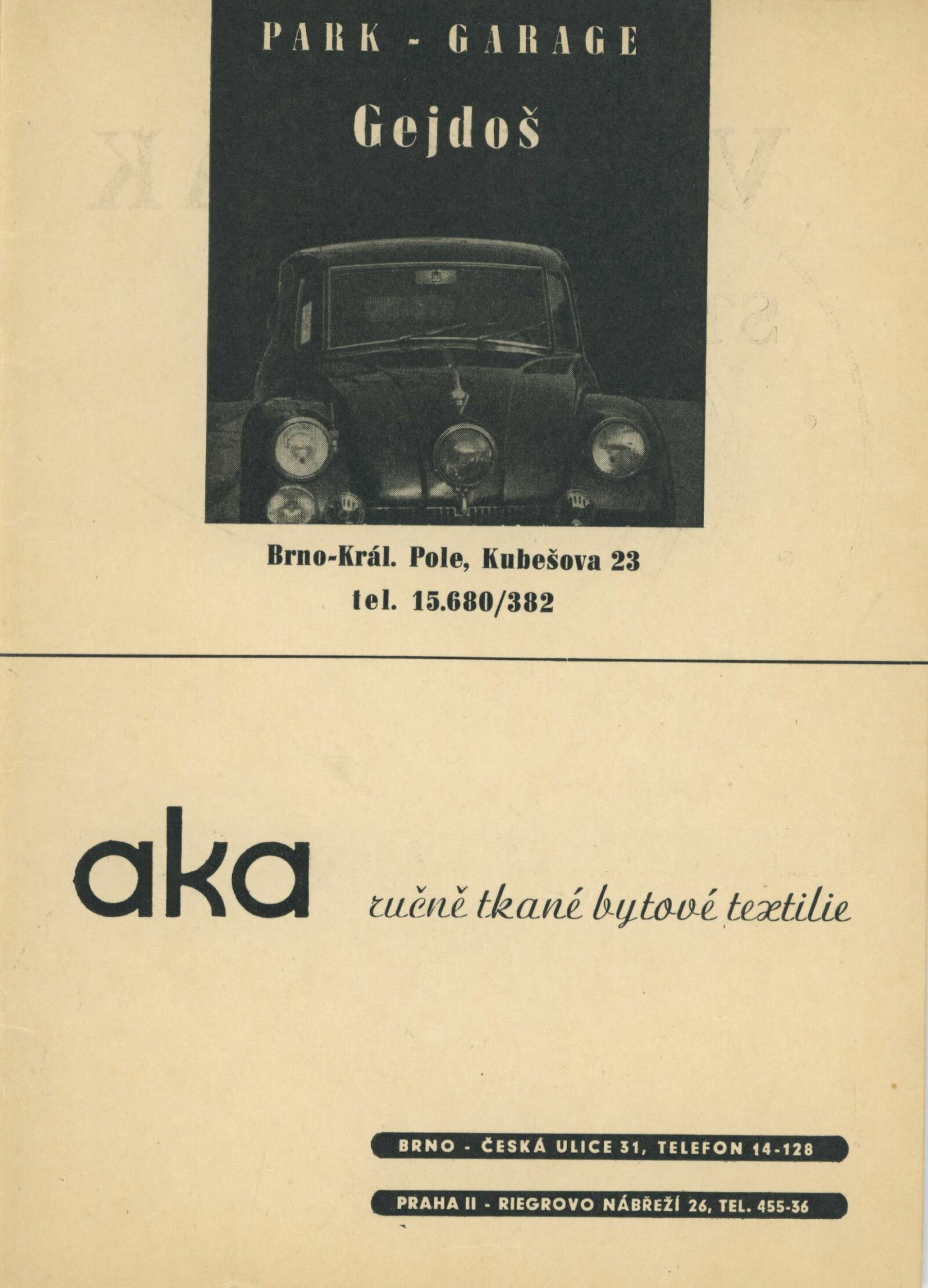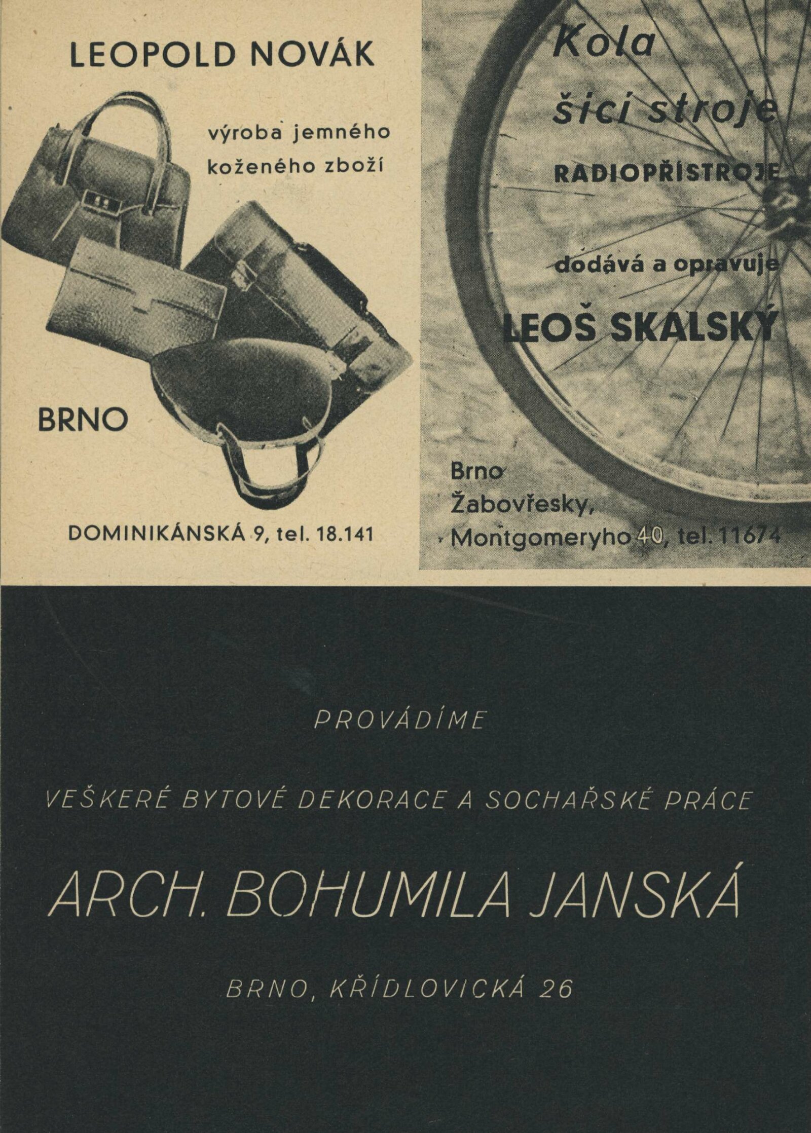 Výstava nové bytové kultury v Československu: Dům umění Brno, 7. 5. – 15. 6. 1947 / Text: Vladimír Mareček (poznámka k výstavě), Jan Vaněk: Brno a bytová kultura v ČSR. – Brno: Svaz Českého díla – odbor Brno, 1947. – 25 s., seznam vystavovatelů, DU 43. – MG; MMB