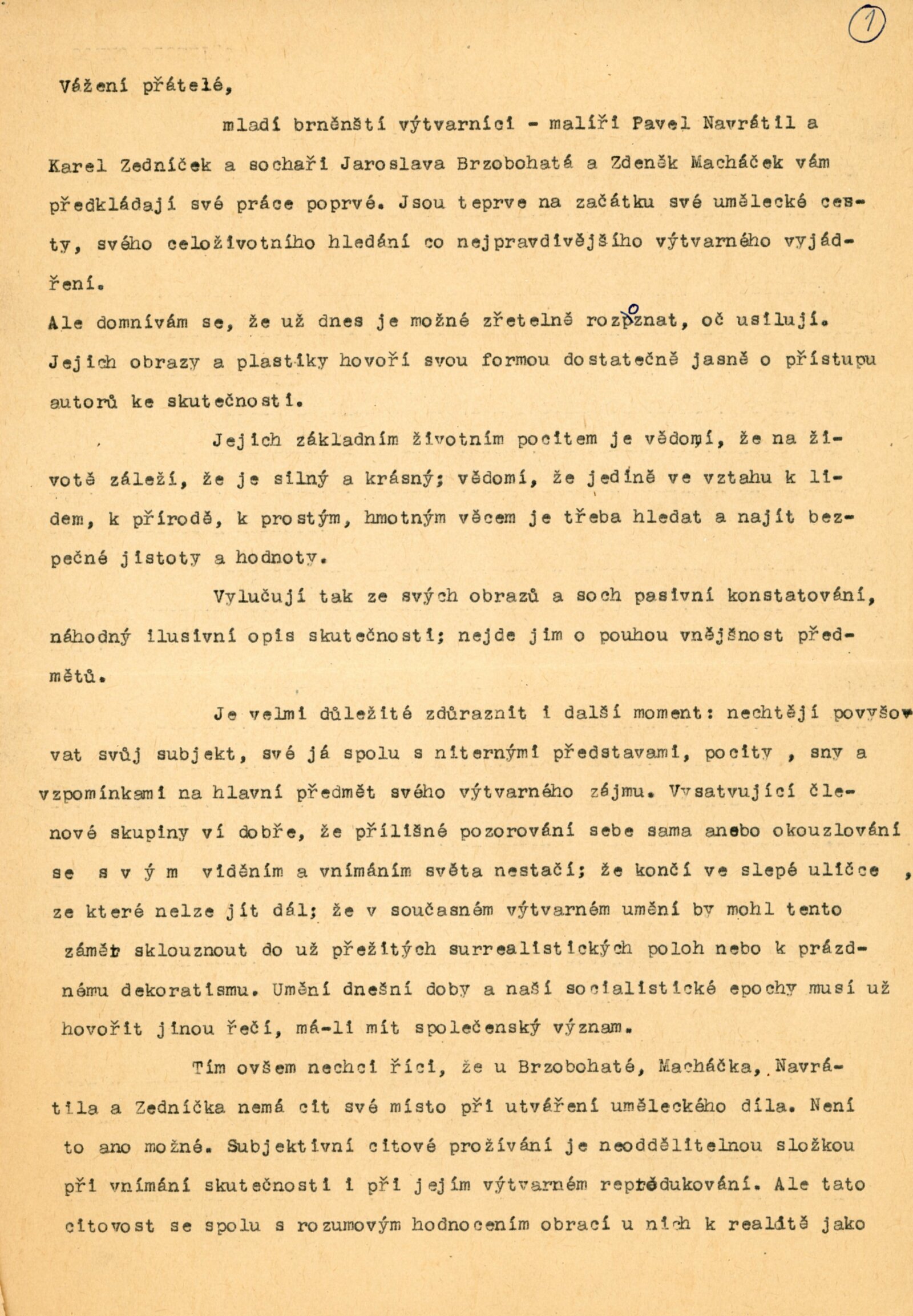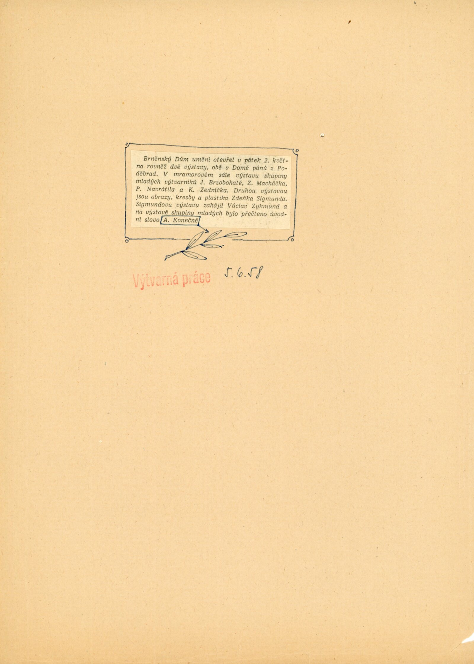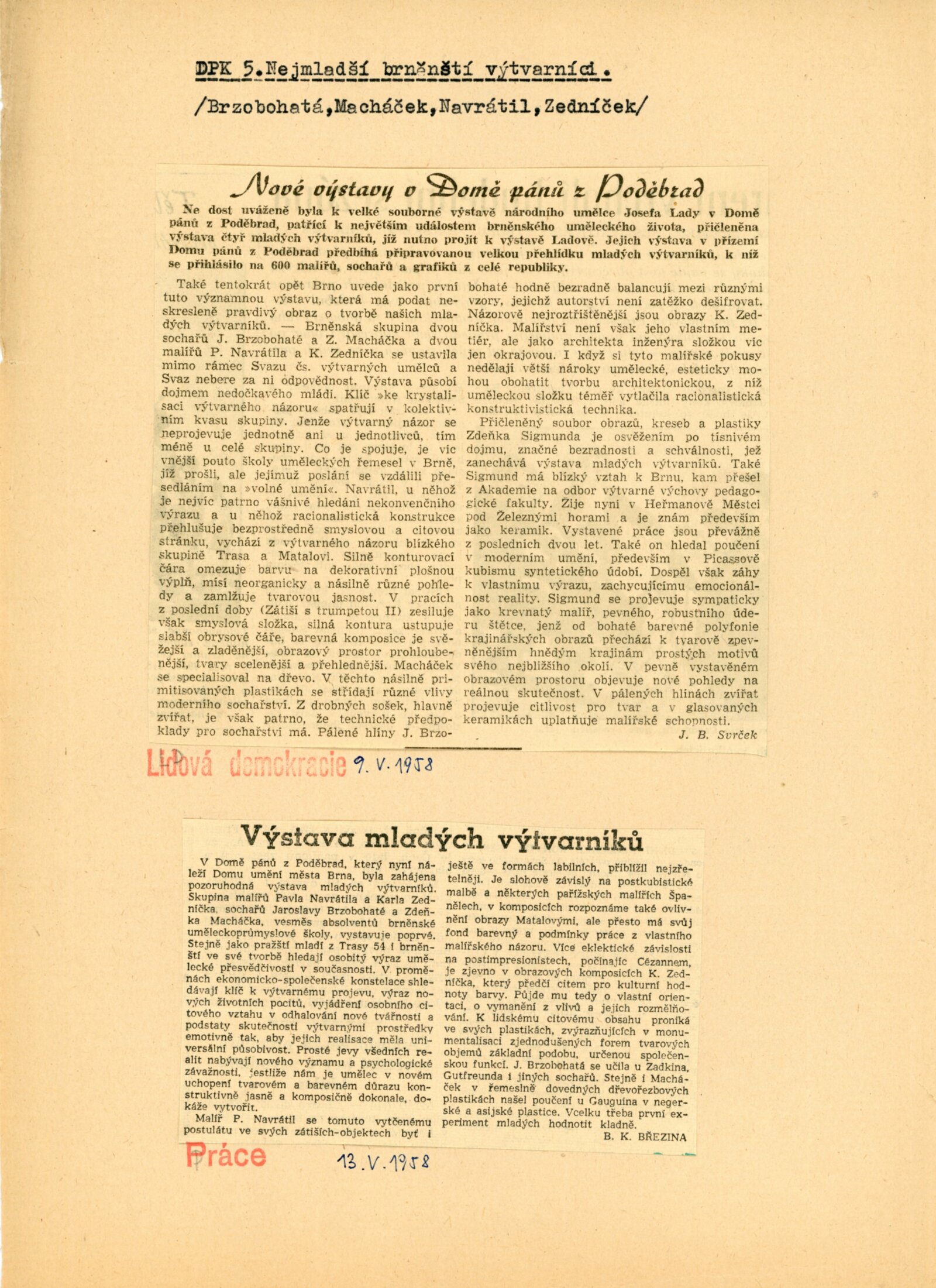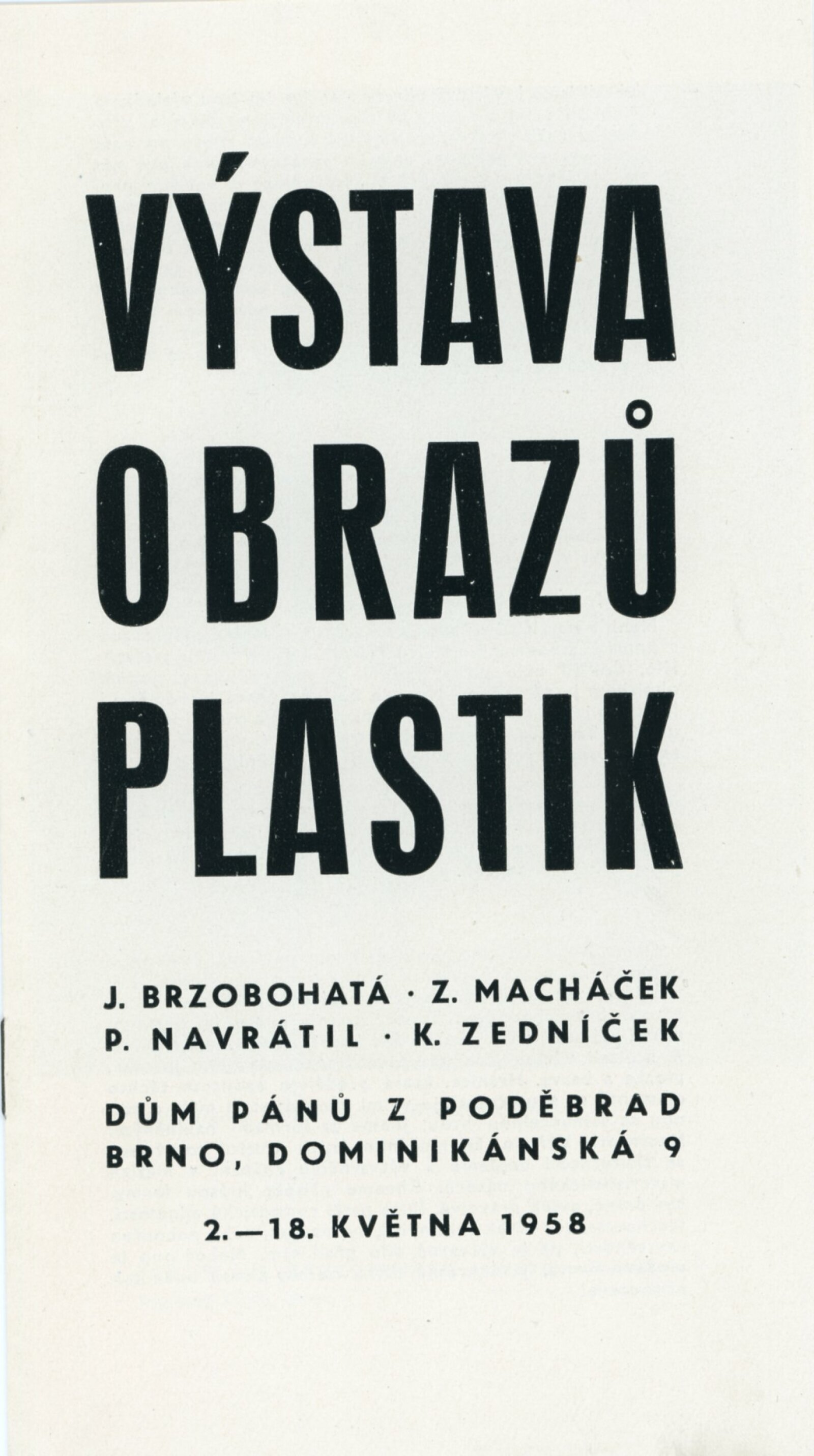 Výstava obrazů, plastik. Jaroslava Brzobohatá, Zdeněk Macháček, Pavel Navrátil, Karel Zedníček, Dům umění v Brně / Dům pánů z Kunštátu, 2. 5. – 18. 5. 1958 / Text: anonymní. – Brno: DUmB, 1958. – 8 s., obr., DPK 5. – MZK; MG