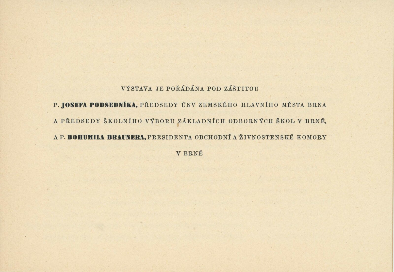 Výstava padesáti povolání. Práce učňů základních odborných škol v Brně: Dům umění v Brně, Uměleckoprůmyslové museum v Brně, 18. 6. – 26. 6. 1947 / Text: František Dušek, Stanislav Horák. – Brno: základní odborné školy, 1947. – 15 s., DU 45. – MG