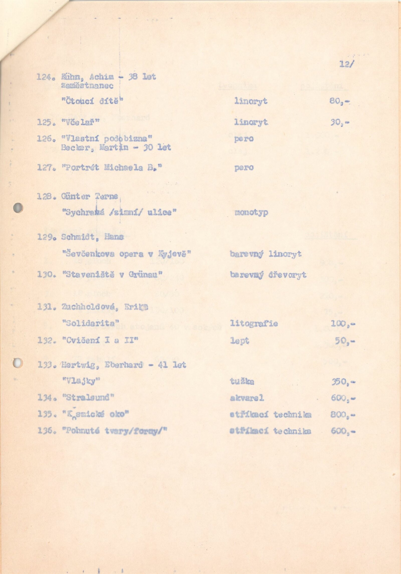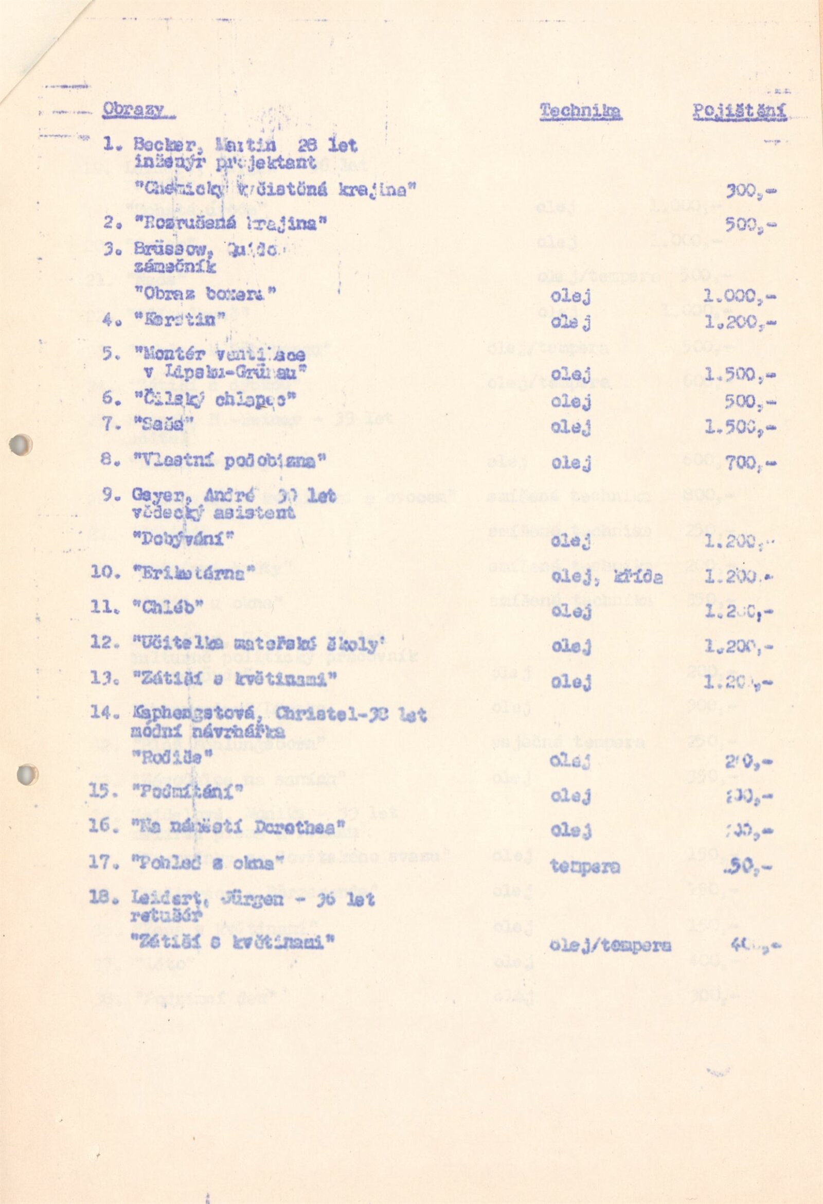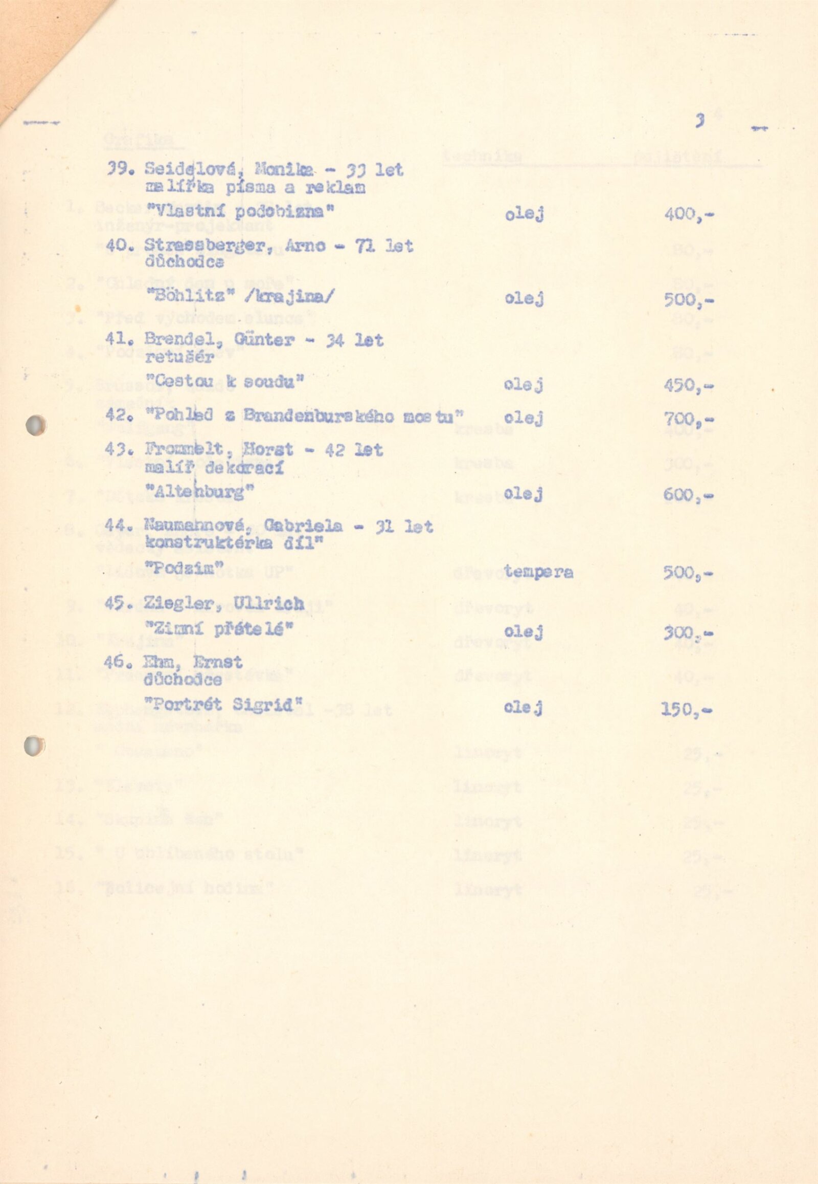 katalog, celní prohlášení k vývozu, seznam autorů a děl s pojistnými cenami, revers, dohoda o spolupráci (DU a Krajské kulturní středisko a Městské kulturní středisko Stanislava Kostky Neumanna, politicko-organizační zabezpečení akce (ideový záměr, rozpočet, program), provozní korespondence, žádost o povolení výstavy, recenze v tisku