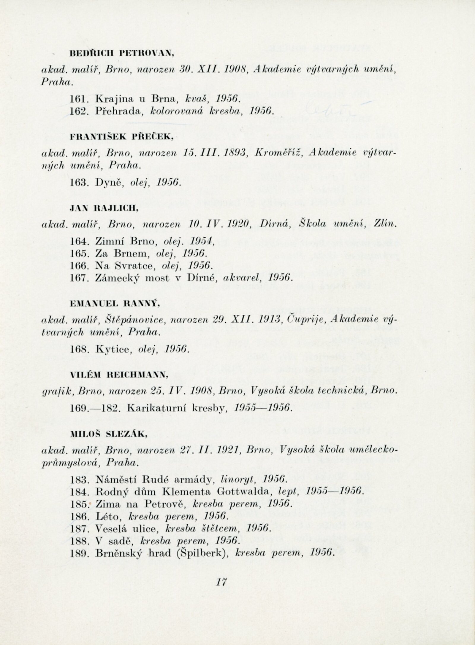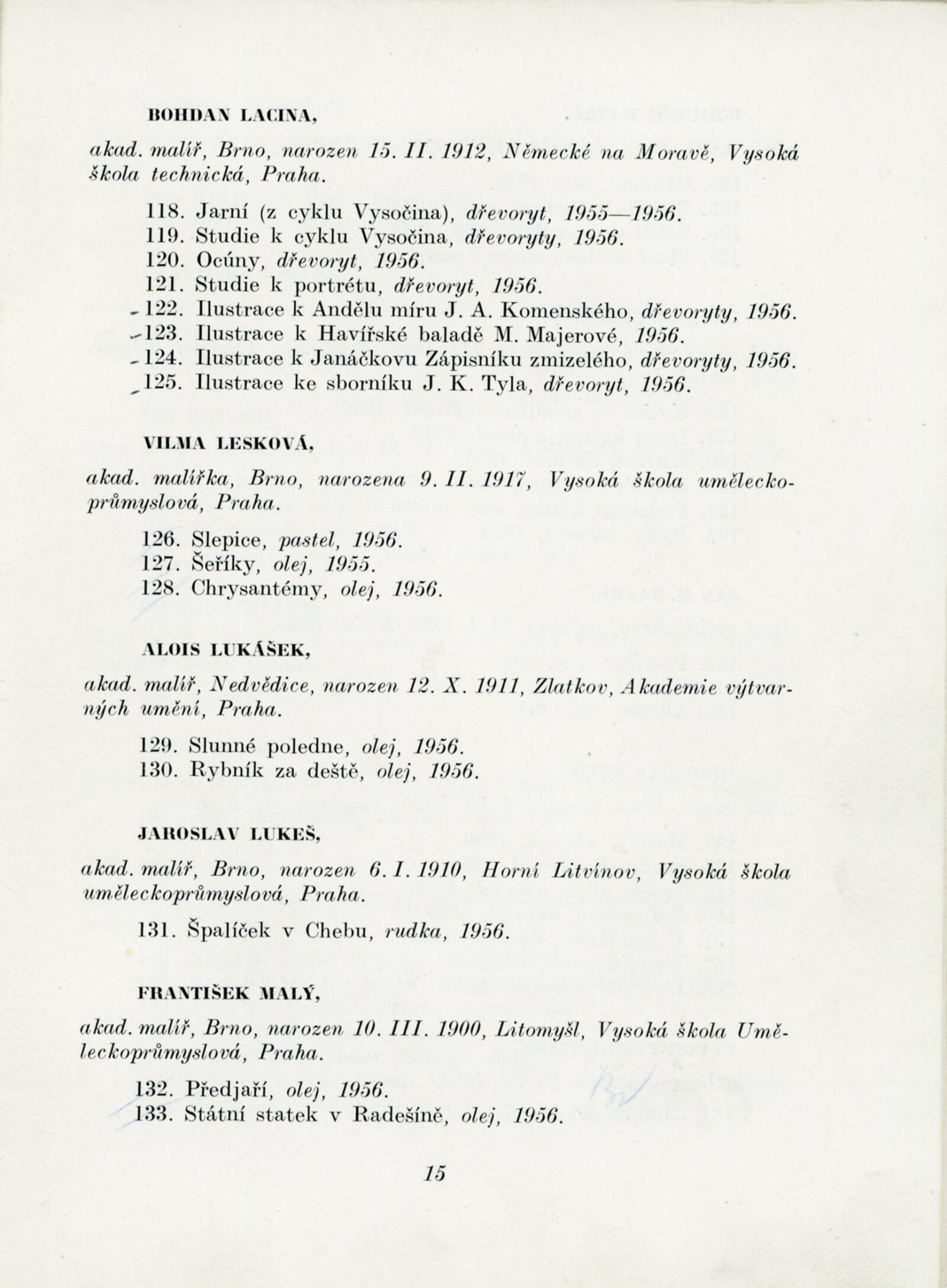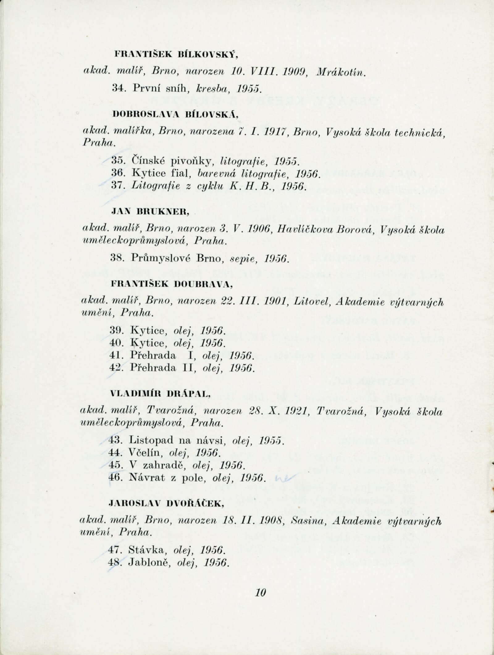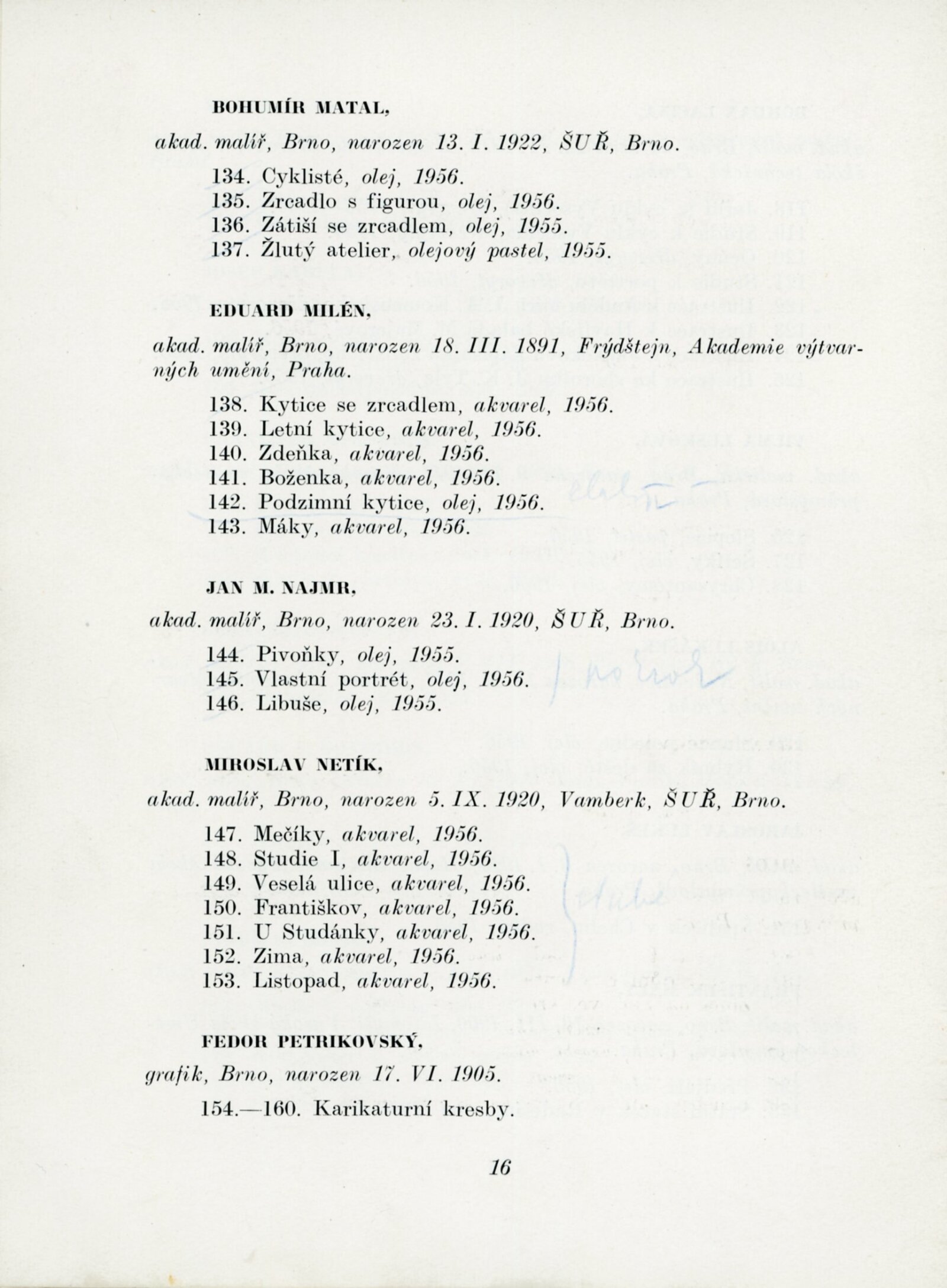 Výstava výtvarných umělců Brněnského kraje. Šestá členská výstava: Dům umění města Brna, 4. 11. – 2. 12. 1956 / Text: J. B. Svrček. – Brno: SČSVU, 1956. – 22 s., životní data vystavujících umělců, DU 267. – MZK; MG