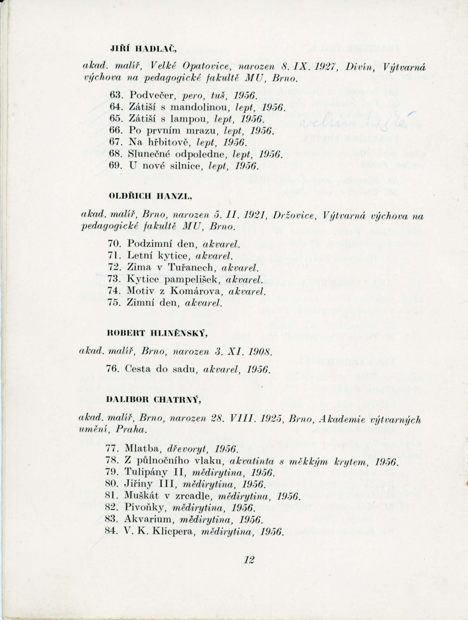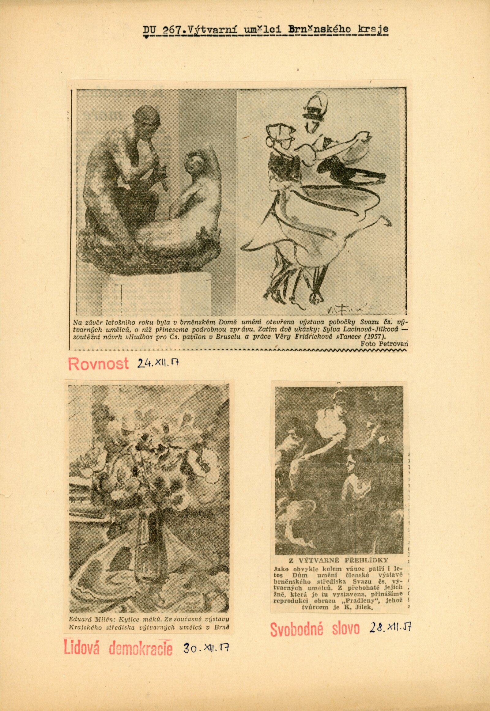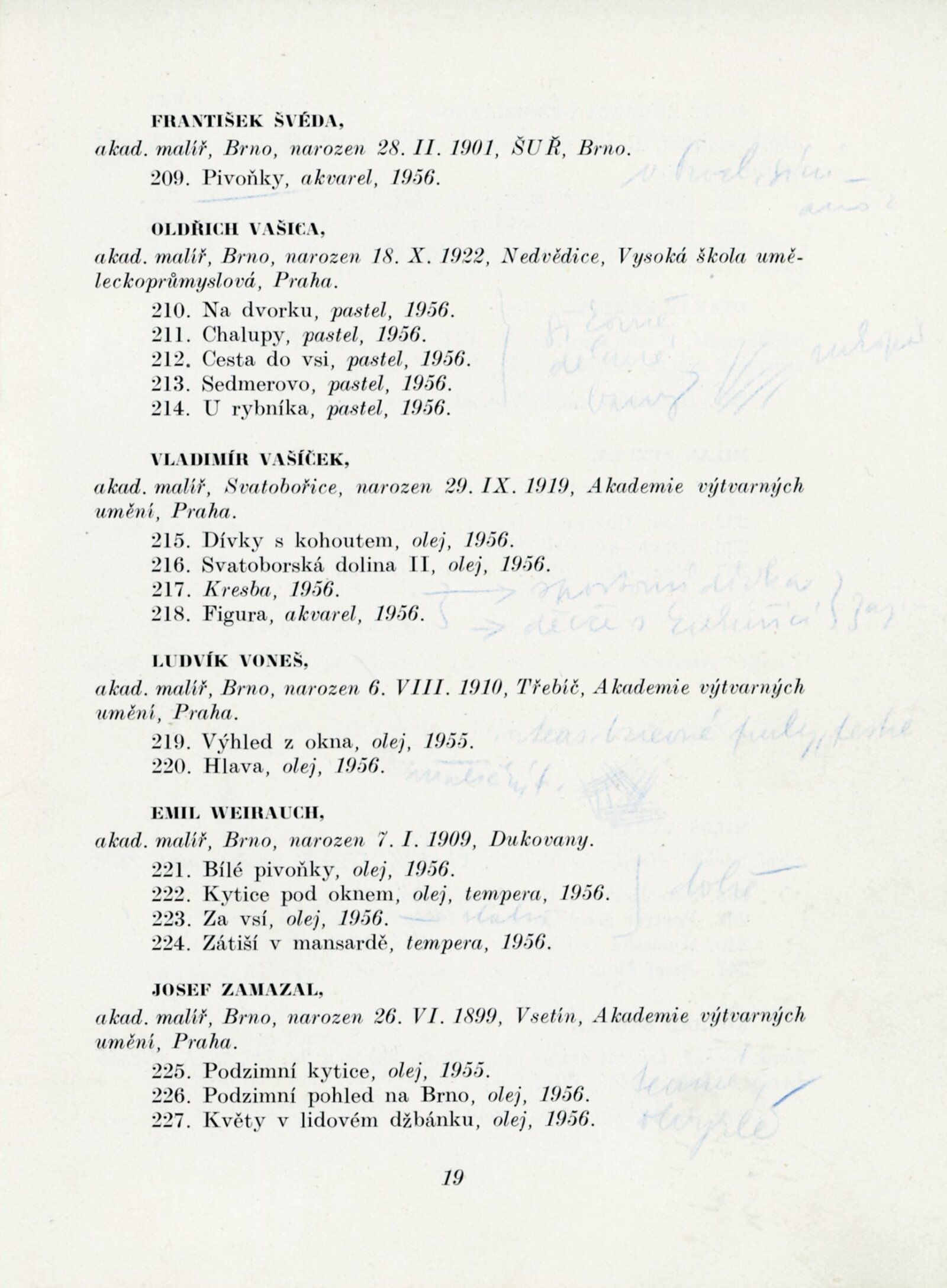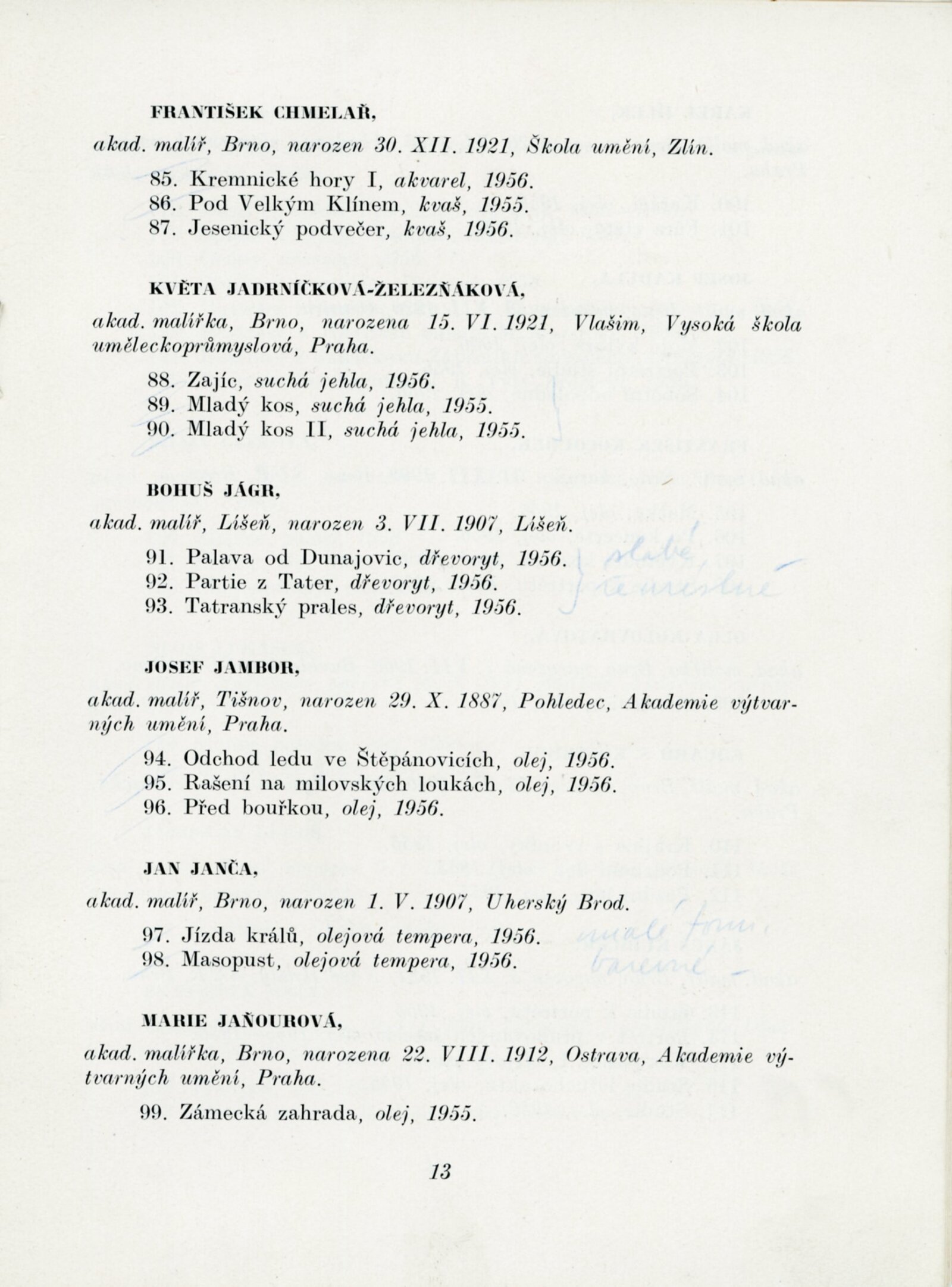 Výstava výtvarných umělců Brněnského kraje. Šestá členská výstava: Dům umění města Brna, 4. 11. – 2. 12. 1956 / Text: J. B. Svrček. – Brno: SČSVU, 1956. – 22 s., životní data vystavujících umělců, DU 267. – MZK; MG