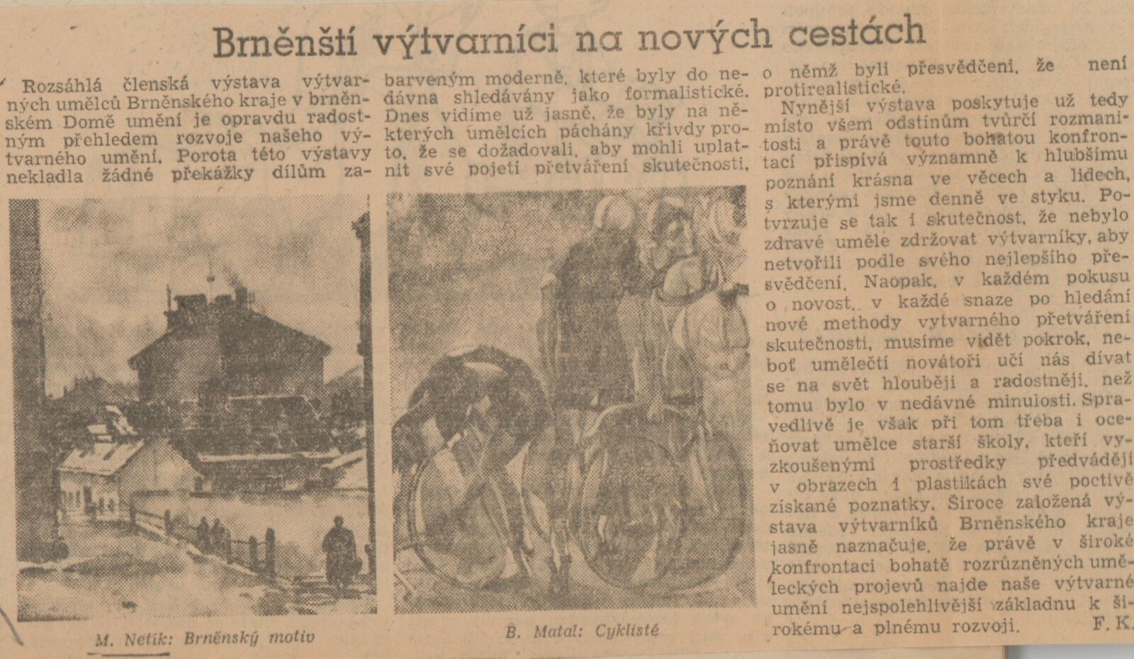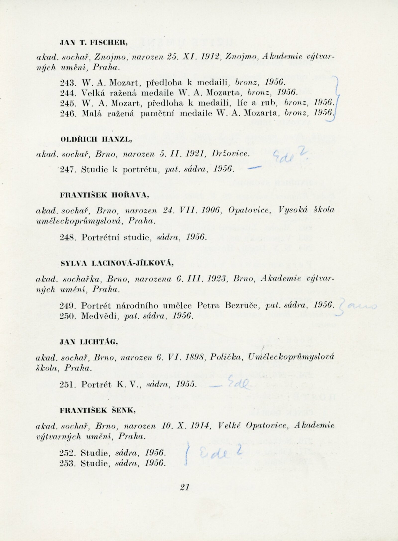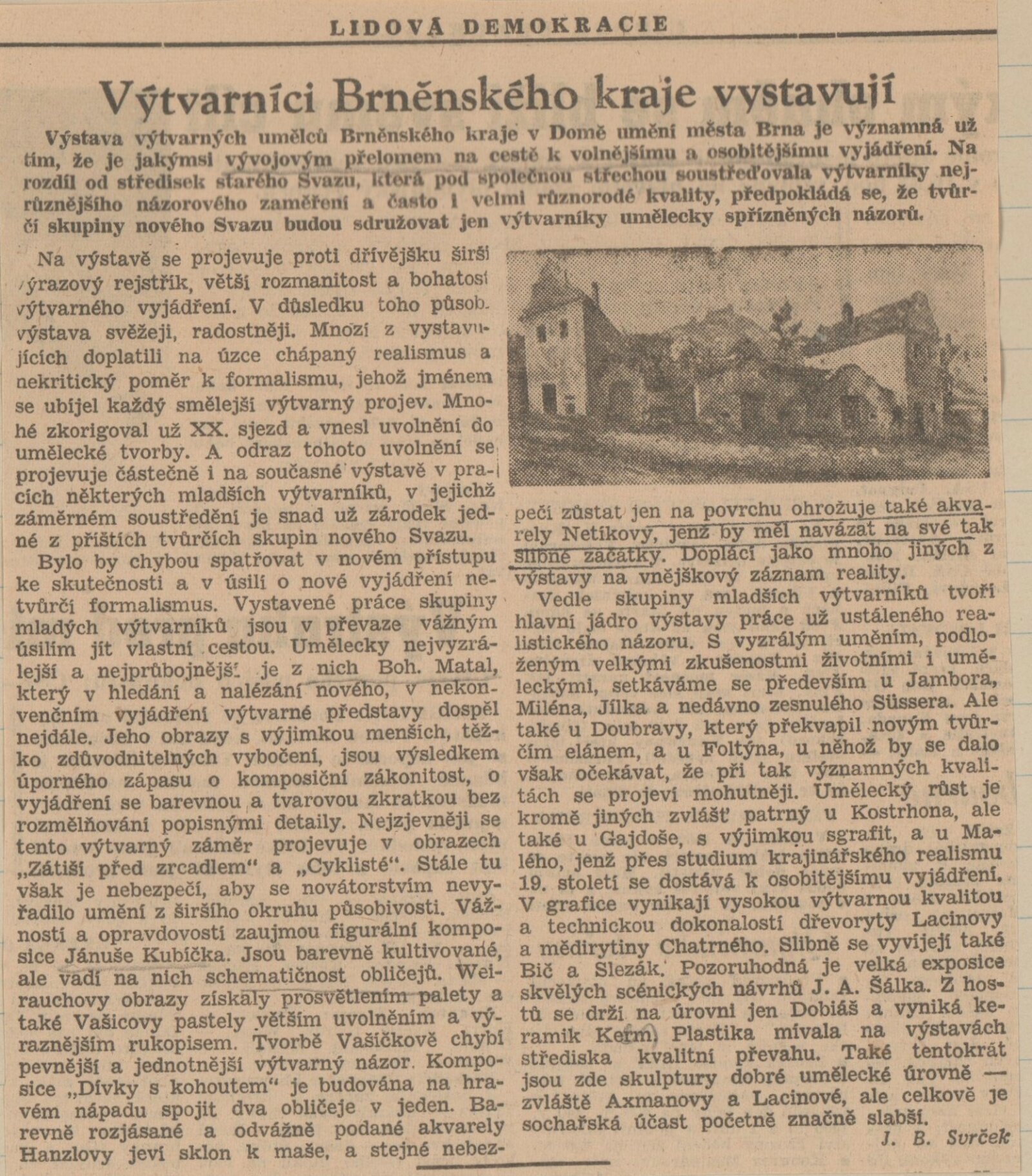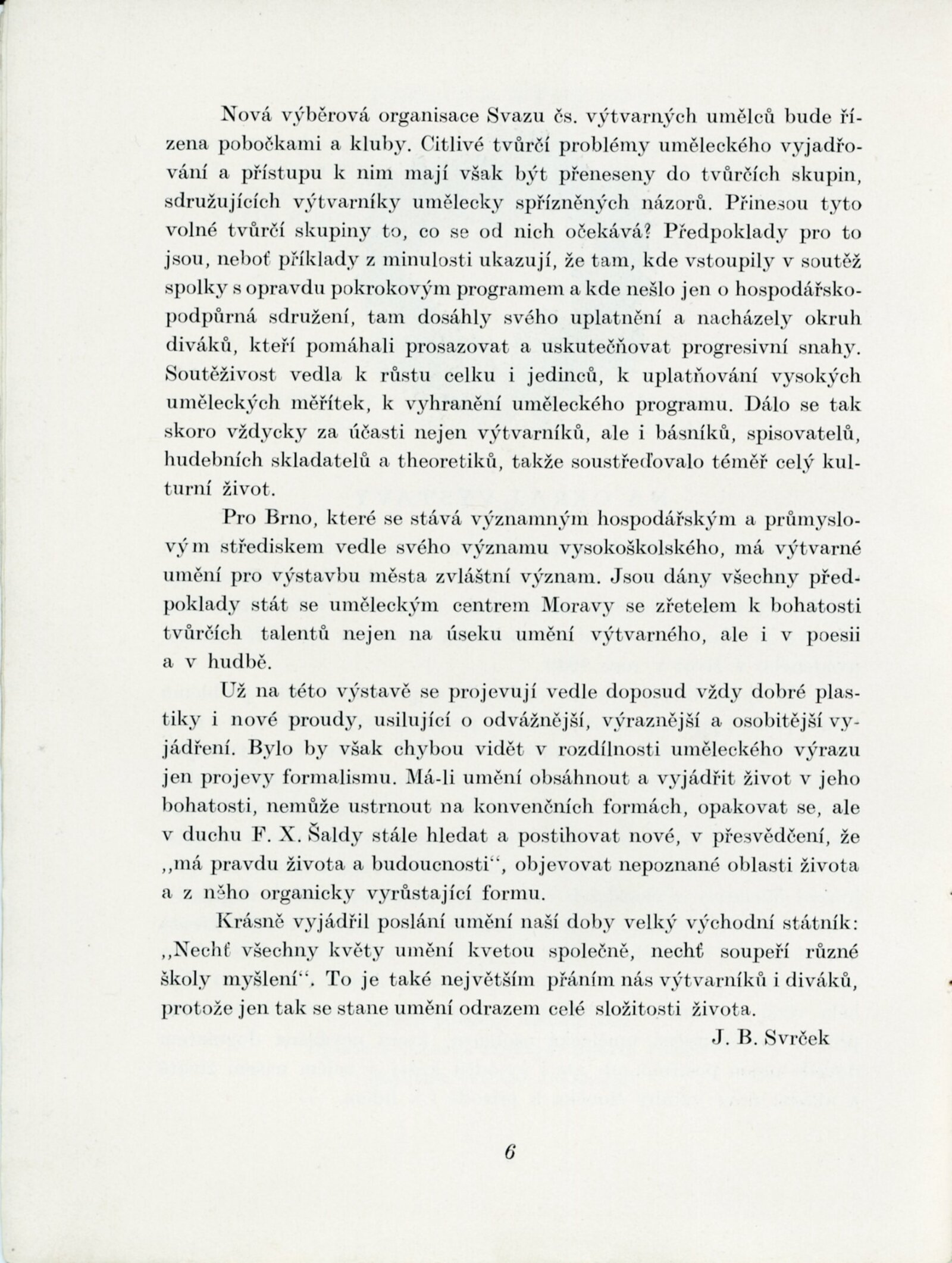 Výstava výtvarných umělců Brněnského kraje. Šestá členská výstava: Dům umění města Brna, 4. 11. – 2. 12. 1956 / Text: J. B. Svrček. – Brno: SČSVU, 1956. – 22 s., životní data vystavujících umělců, DU 267. – MZK; MG