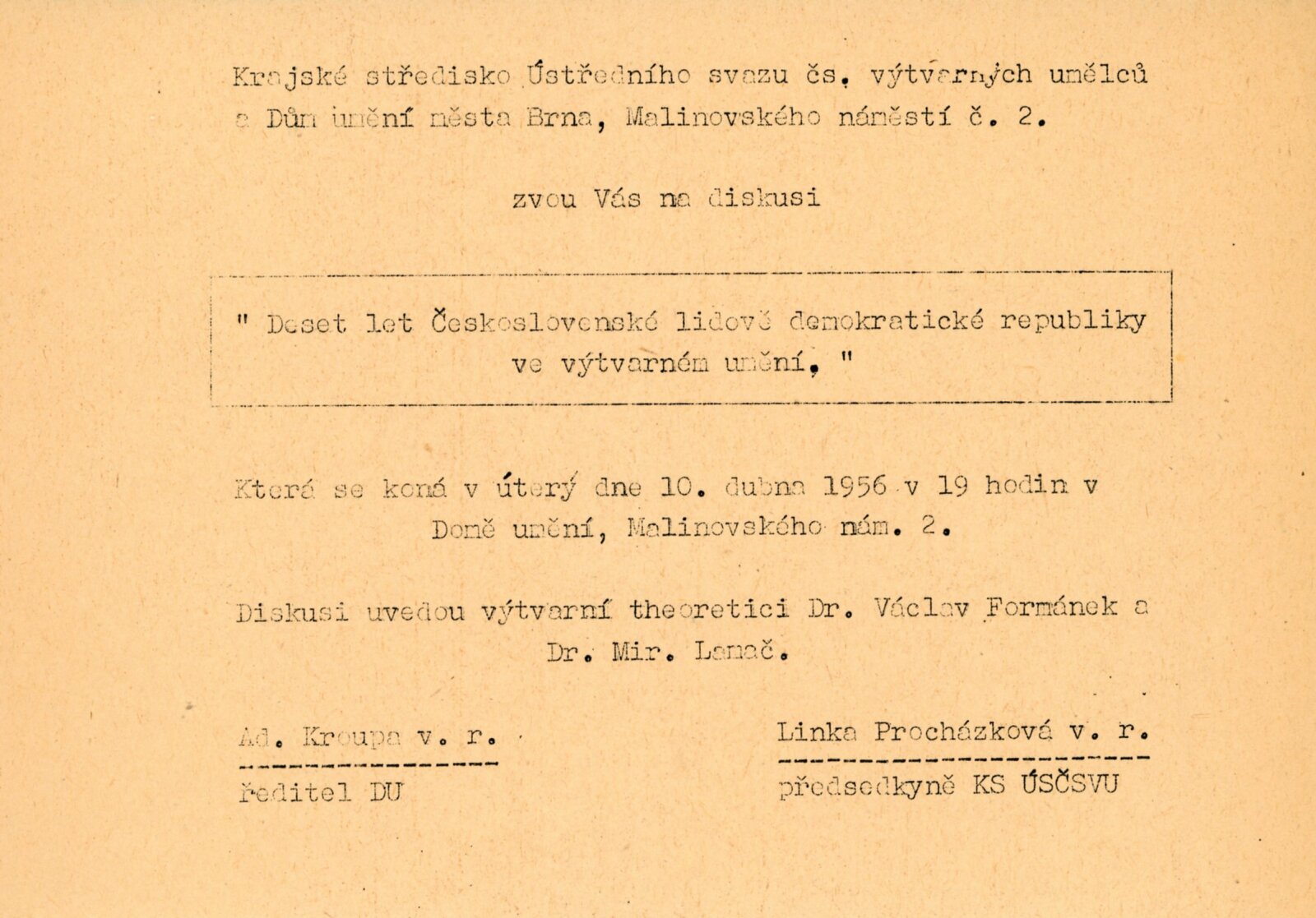 Josef Adamíček, Miloš Axman, Konrád Babraj, Olga Babrajová, Taťána Bakalová, Pavel Bačovský, František Bič, Josef Bieber, František Bílkovský, Dobroslava Bílovská, Jan Brukner, Čeněk Dobiáš, František Doubrava, Vladimír Drápal, Jaroslav Dvořáček, František Fiala, Jan T. Fischer, František Foltýn, Miroslav Fridrich, Olga Fridrichová-Steinzová, Věra Fridrichová, Rudolf Gajdoš, Jiří Hadlač, Oldřich Hanzl, Drahomíra Hanzlová, Robert Hliněnský, František Hořava, Dalibor Chatrný, František Chmelař, Květa Jadrníčková-Železňáková, Bohuš Jágr, Josef Jambor, Jan Janča, Marie Jaňourová, Antonín Jero, Karel Jílek, Sylva Lacinová-Jílková, Josef Kadula, Jiří Kemr, Milan Klvaňa, František Kocourek, Olga Kolovratová, Eduard S. Kostrhon, Karel Kryl, Jánuš Kubíček, Bohdan Lacina, Vilma Lesková, Jan Lichtág, Alois Lukášek, Jaroslav Lukeš, František Malý, Bohumír Matal, Eduard Milén, Jan M. Najmr, Miroslav Netík, Fedor Petrikovský, Bedřich Petrovan, František Přeček, Jan Rajlich, Emanuel Ranný, Vilém Reichmann, Miloš Slezák, Svatopluk Souček, Jindřich Svoboda, František Süsser, Josef A. Šálek, Milena Šimková-Elgrová, František Šenk, Miroslav Šimorda, Vojtěch Štolfa, František Švéda, Oldřich Vašica, Vladimír Vašíček, Jiří Vláčil, Ludvík Voneš, Emil Weirauch, Josef Zamazal, Julie Zemanová-Procházková, Otakar Zemina, Milan Zezula