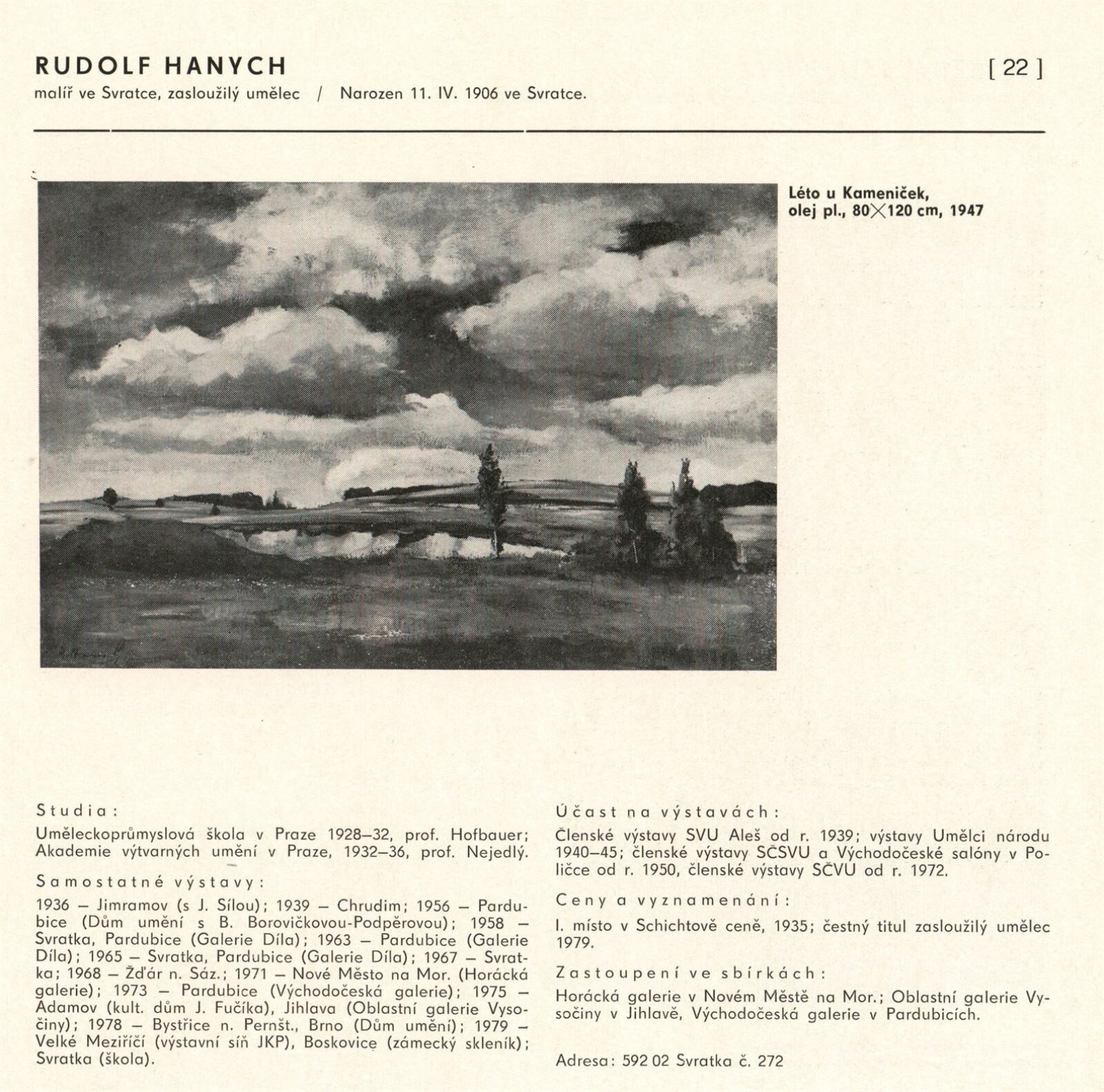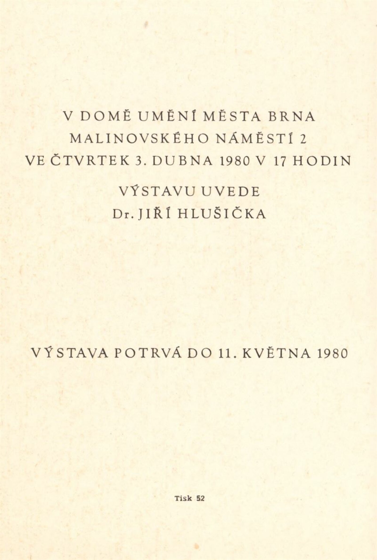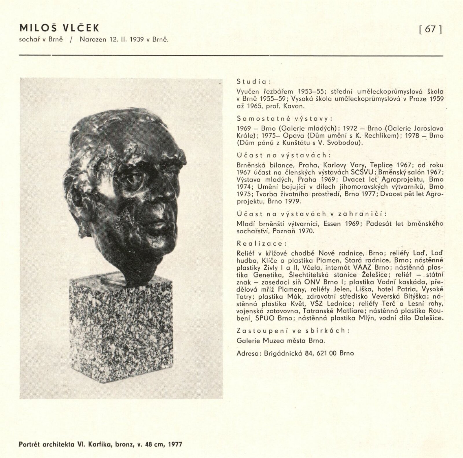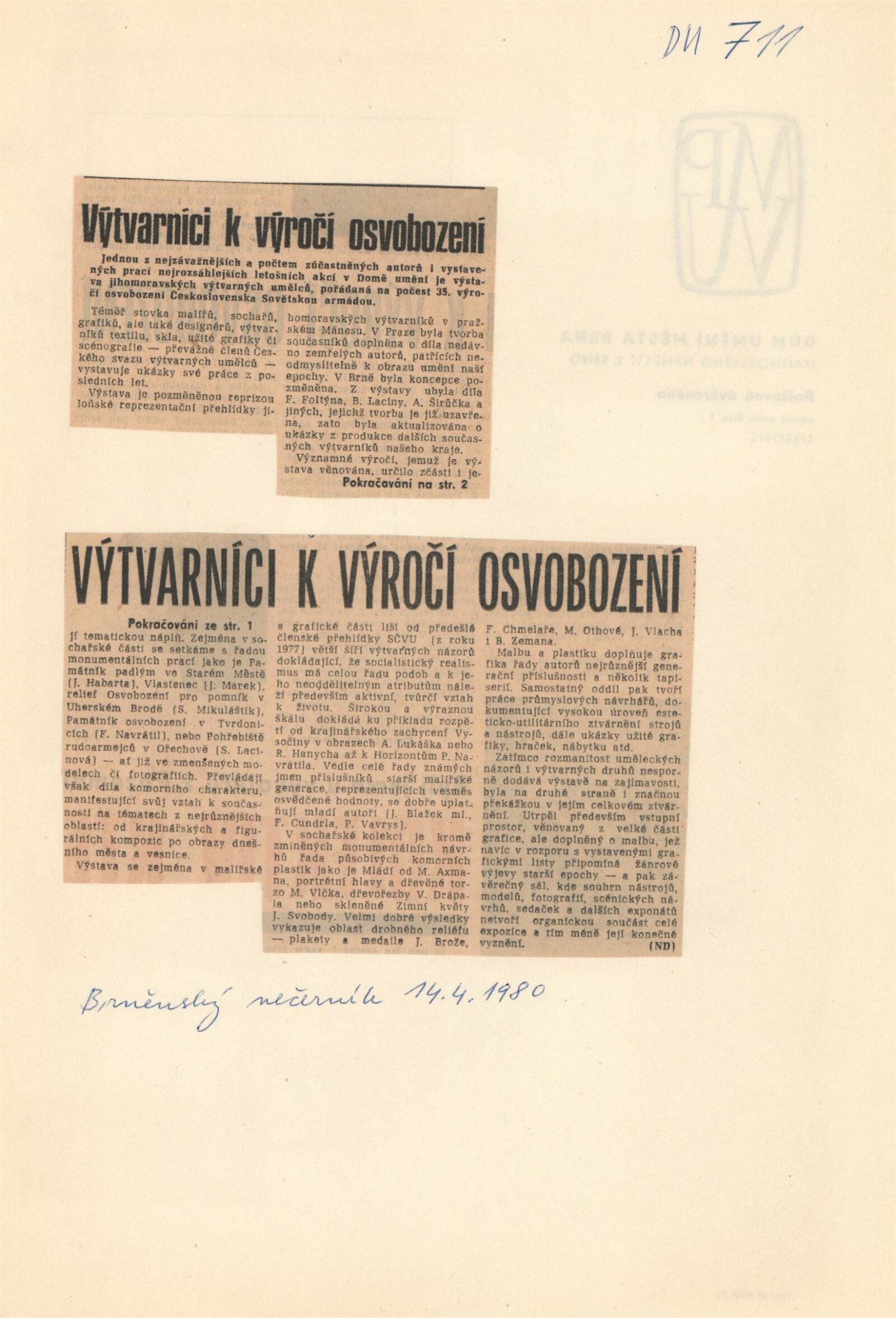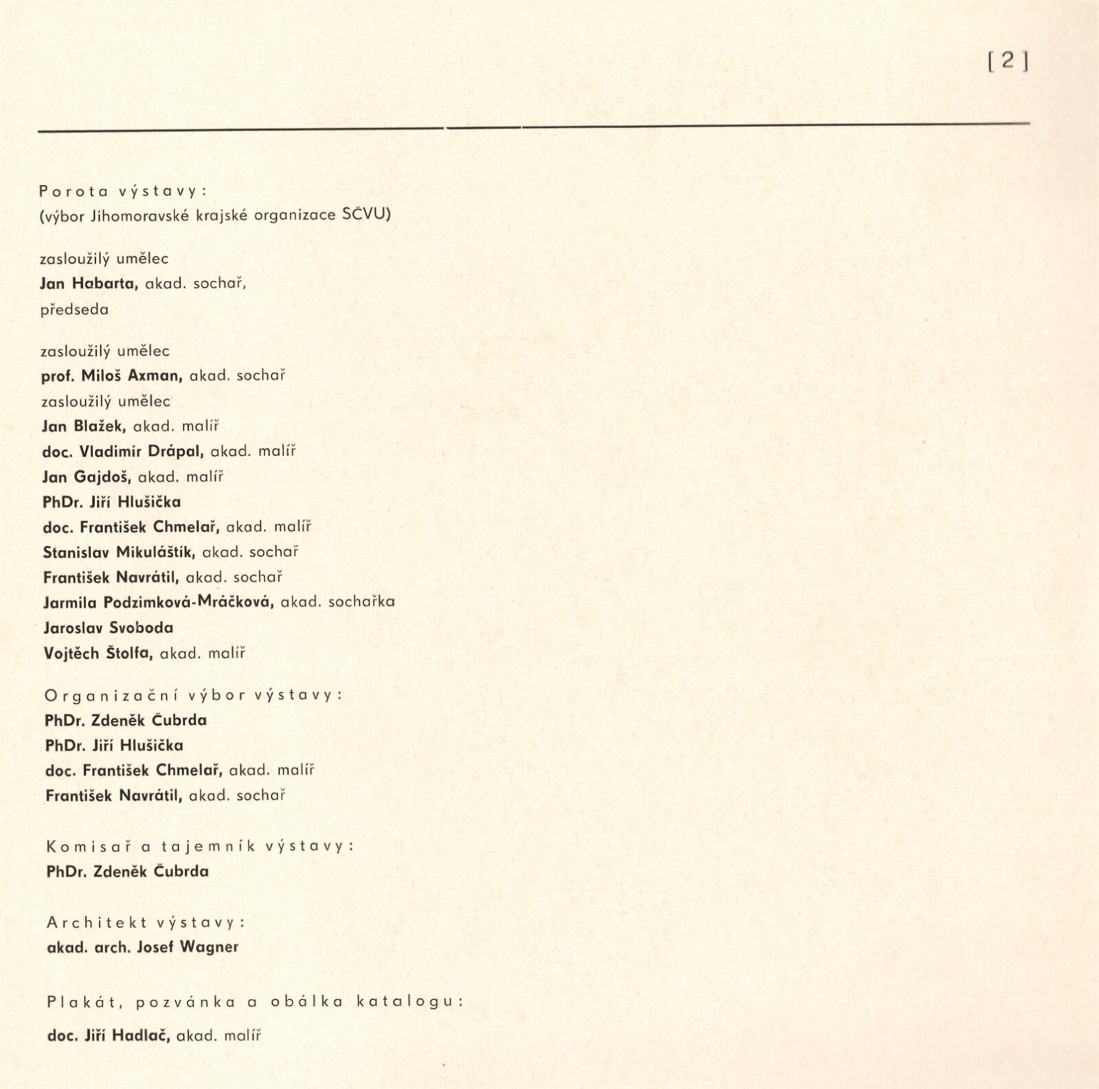 Výtvarné umění Jihomoravského kraje: Dům umění města Brna, 1. patro, 3. 4. – 1. 5. 1980 / Text: Jiří Hlušička. – Praha: SČVU, 1980. – 96 s., obr., životní data vystavujících, seznam výstav, cen, realizací, zastoupení ve sbírkách, DU 711. – MG