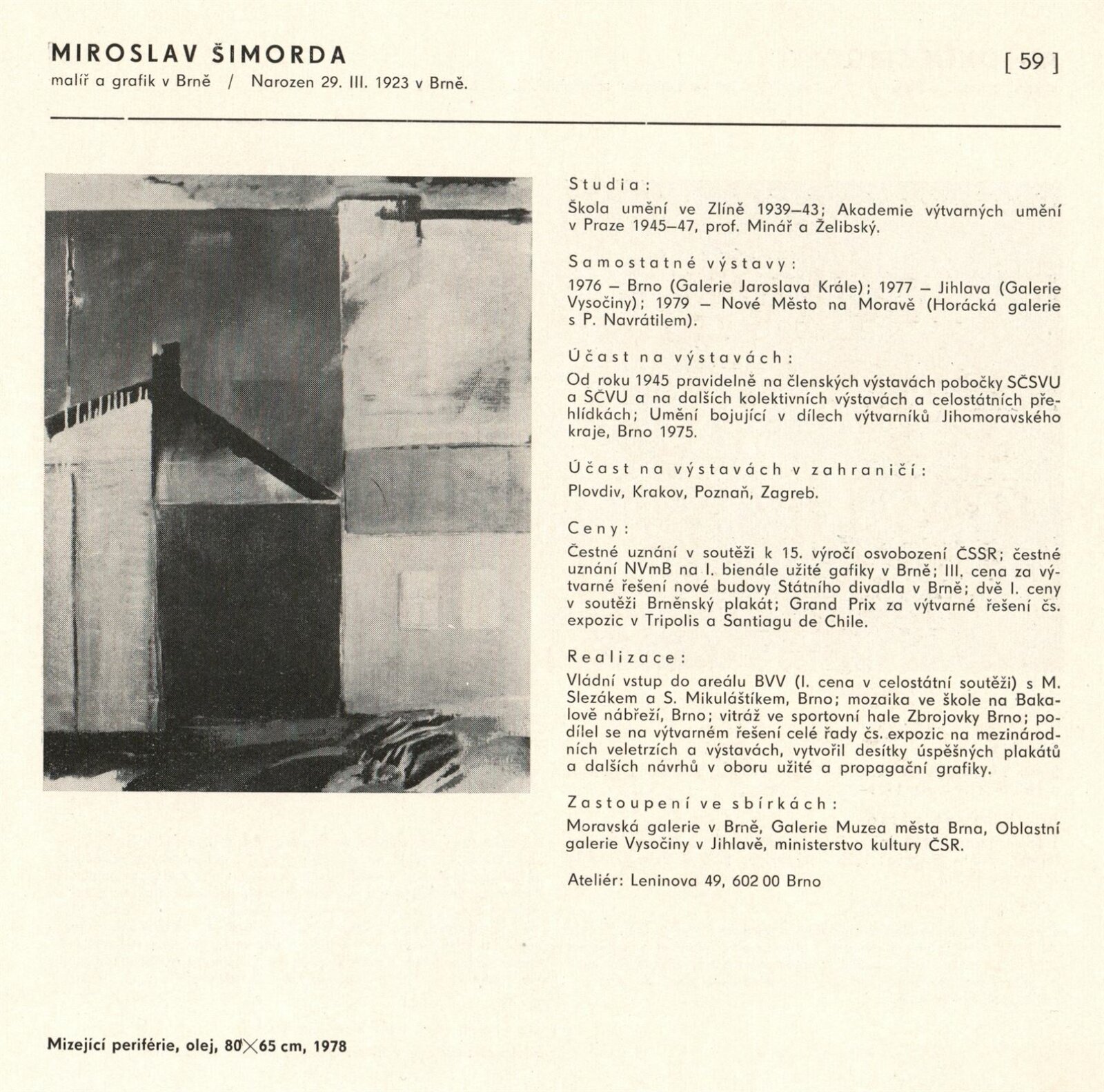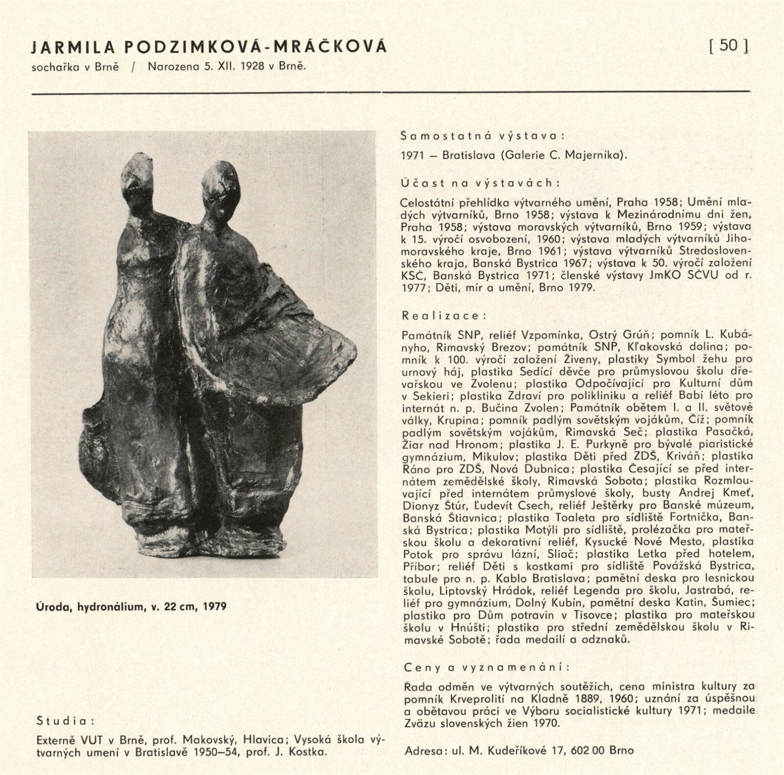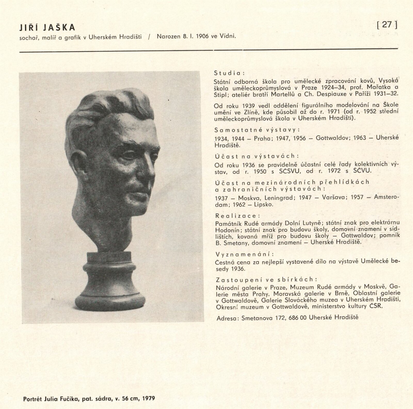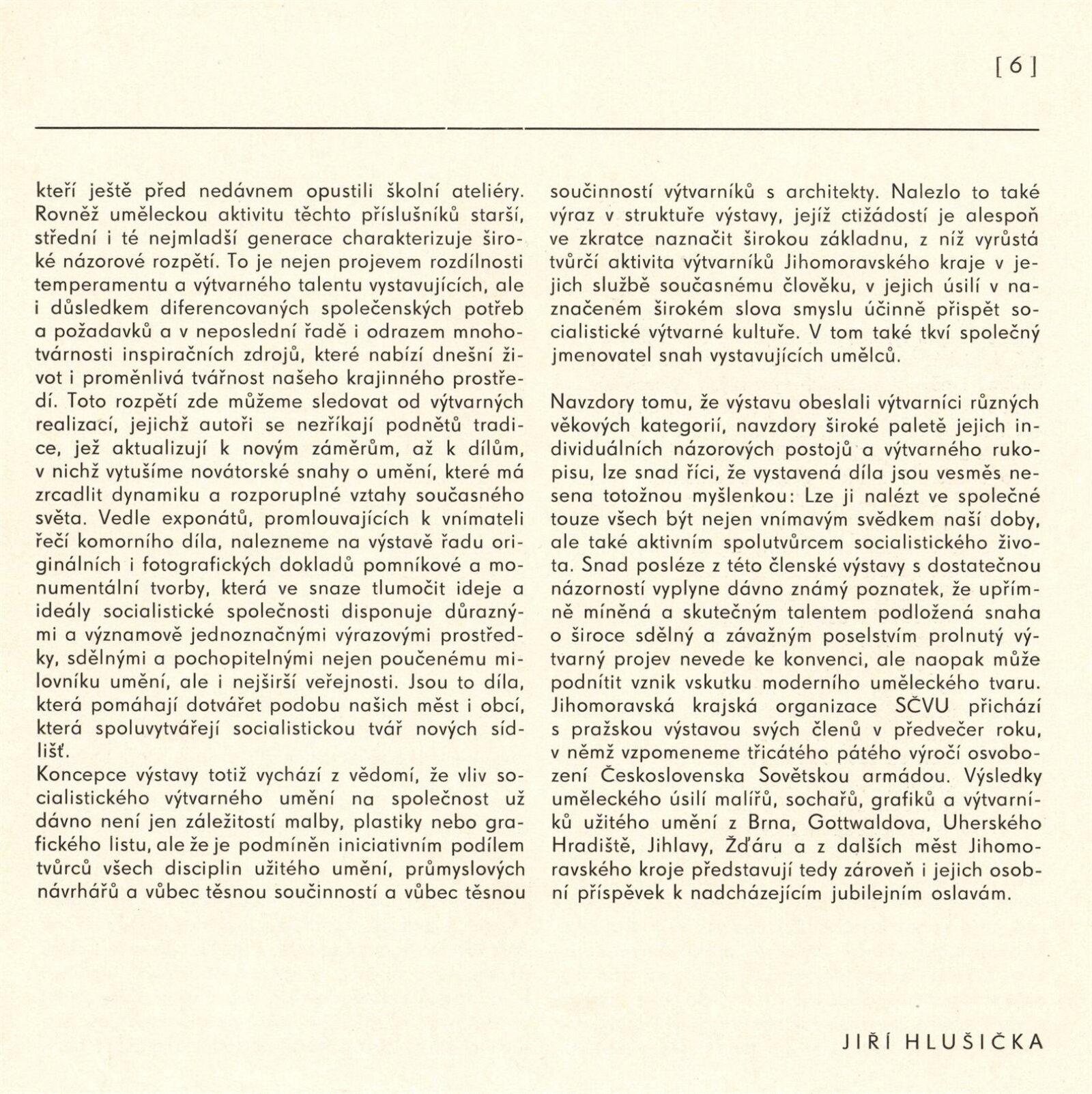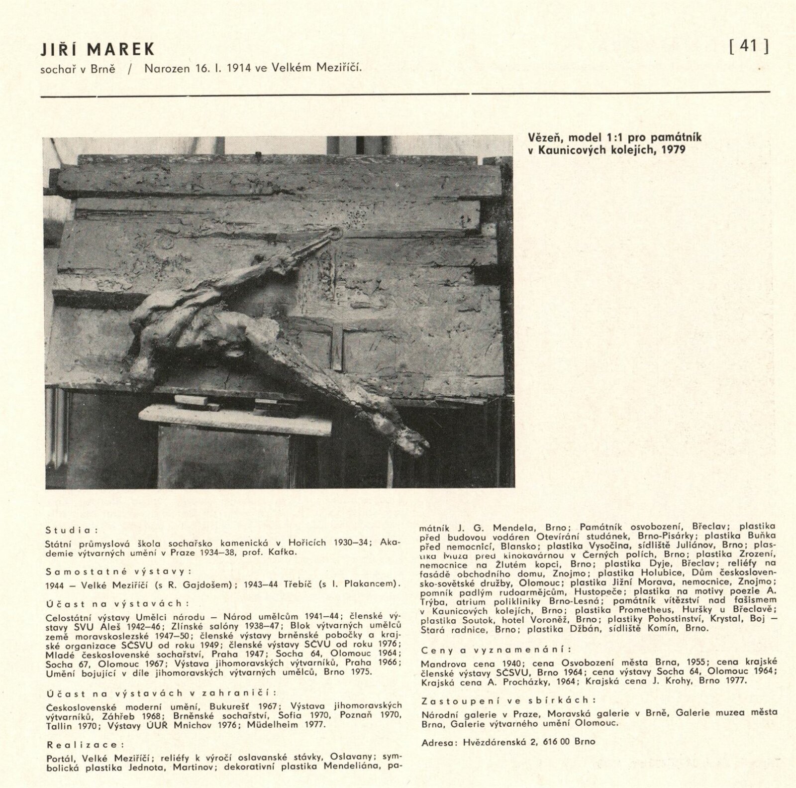 Výtvarné umění Jihomoravského kraje: Dům umění města Brna, 1. patro, 3. 4. – 1. 5. 1980 / Text: Jiří Hlušička. – Praha: SČVU, 1980. – 96 s., obr., životní data vystavujících, seznam výstav, cen, realizací, zastoupení ve sbírkách, DU 711. – MG