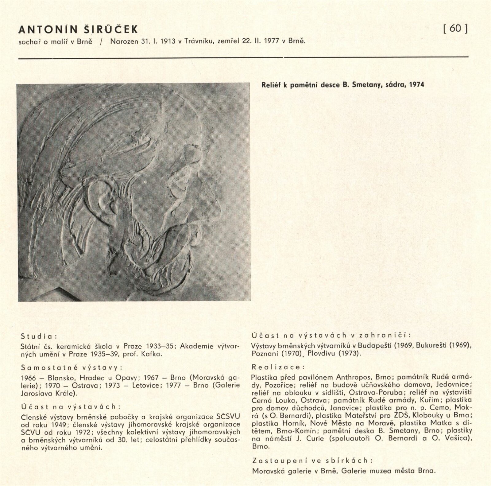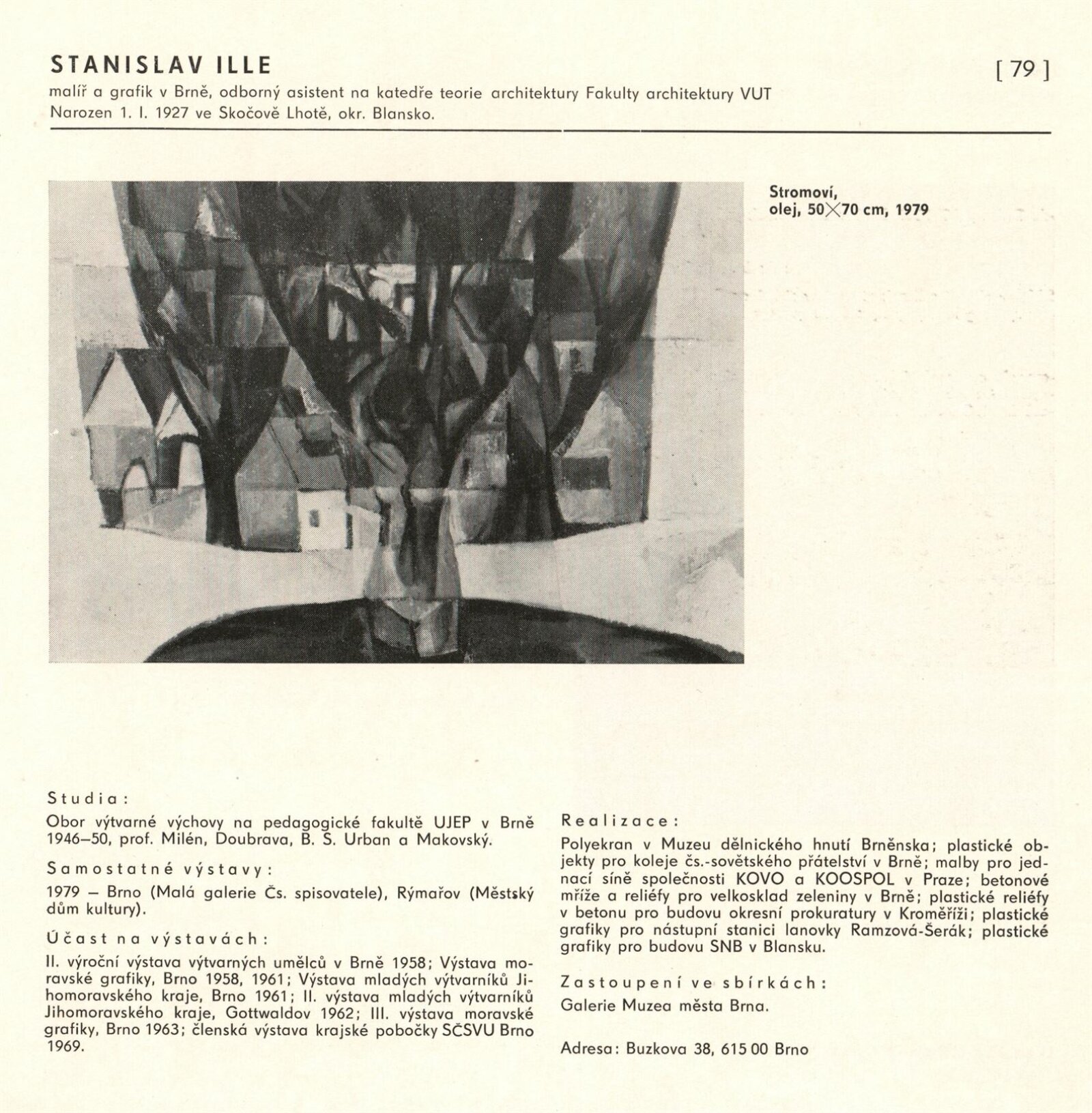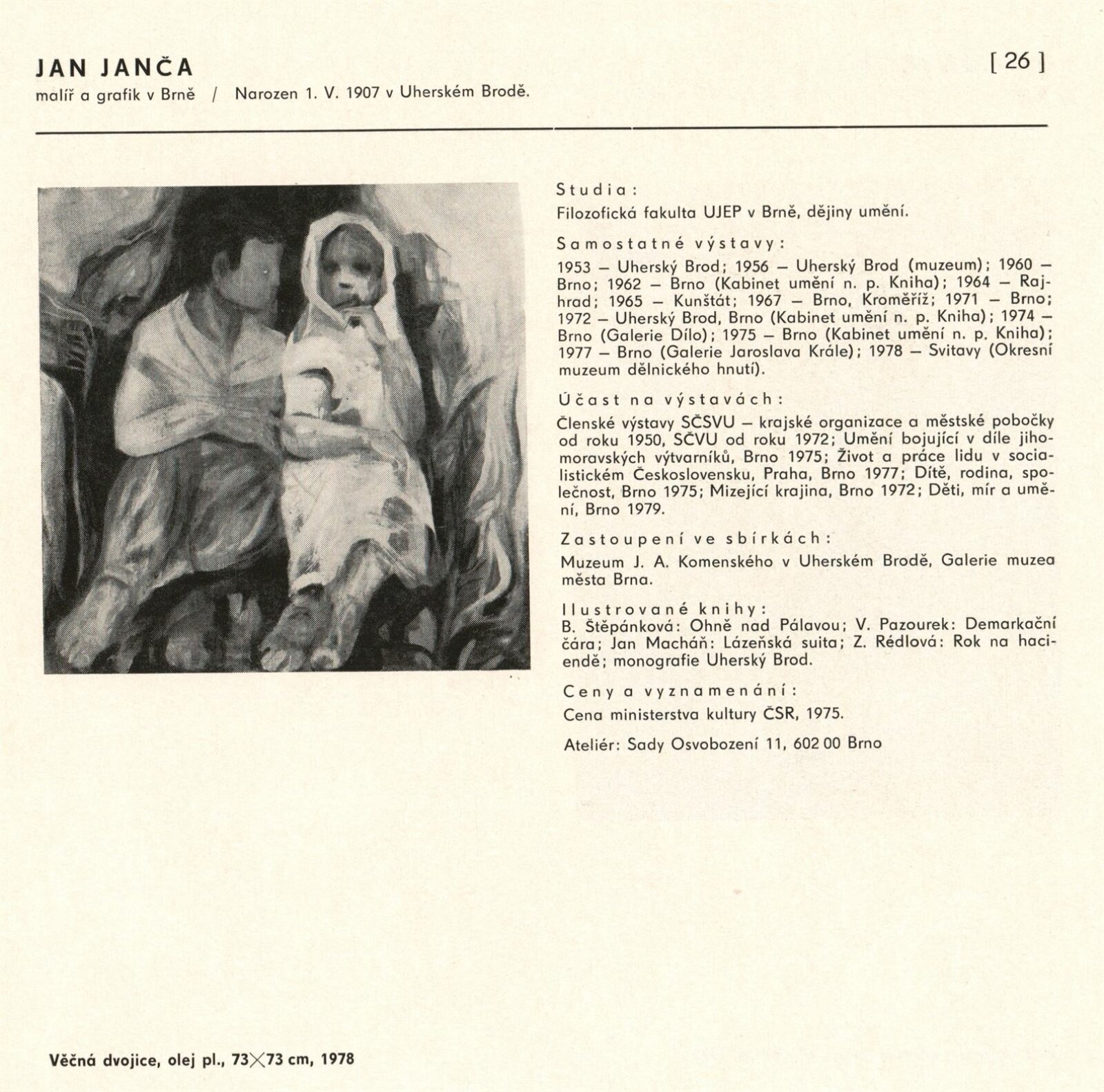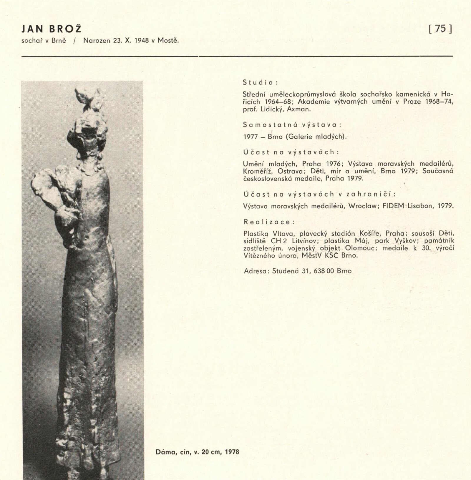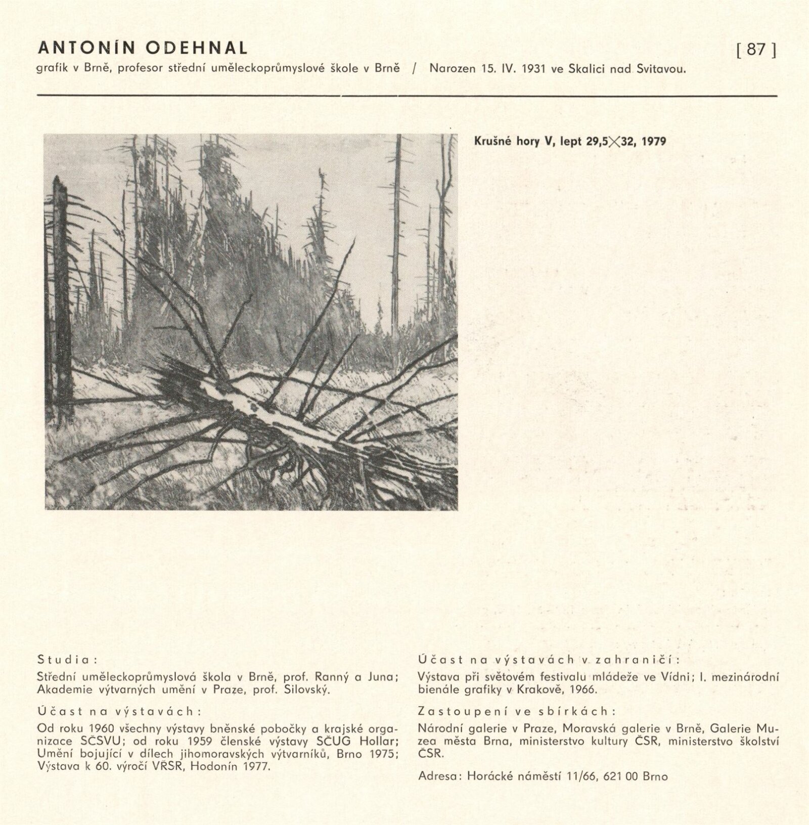 Výtvarné umění Jihomoravského kraje: Dům umění města Brna, 1. patro, 3. 4. – 1. 5. 1980 / Text: Jiří Hlušička. – Praha: SČVU, 1980. – 96 s., obr., životní data vystavujících, seznam výstav, cen, realizací, zastoupení ve sbírkách, DU 711. – MG