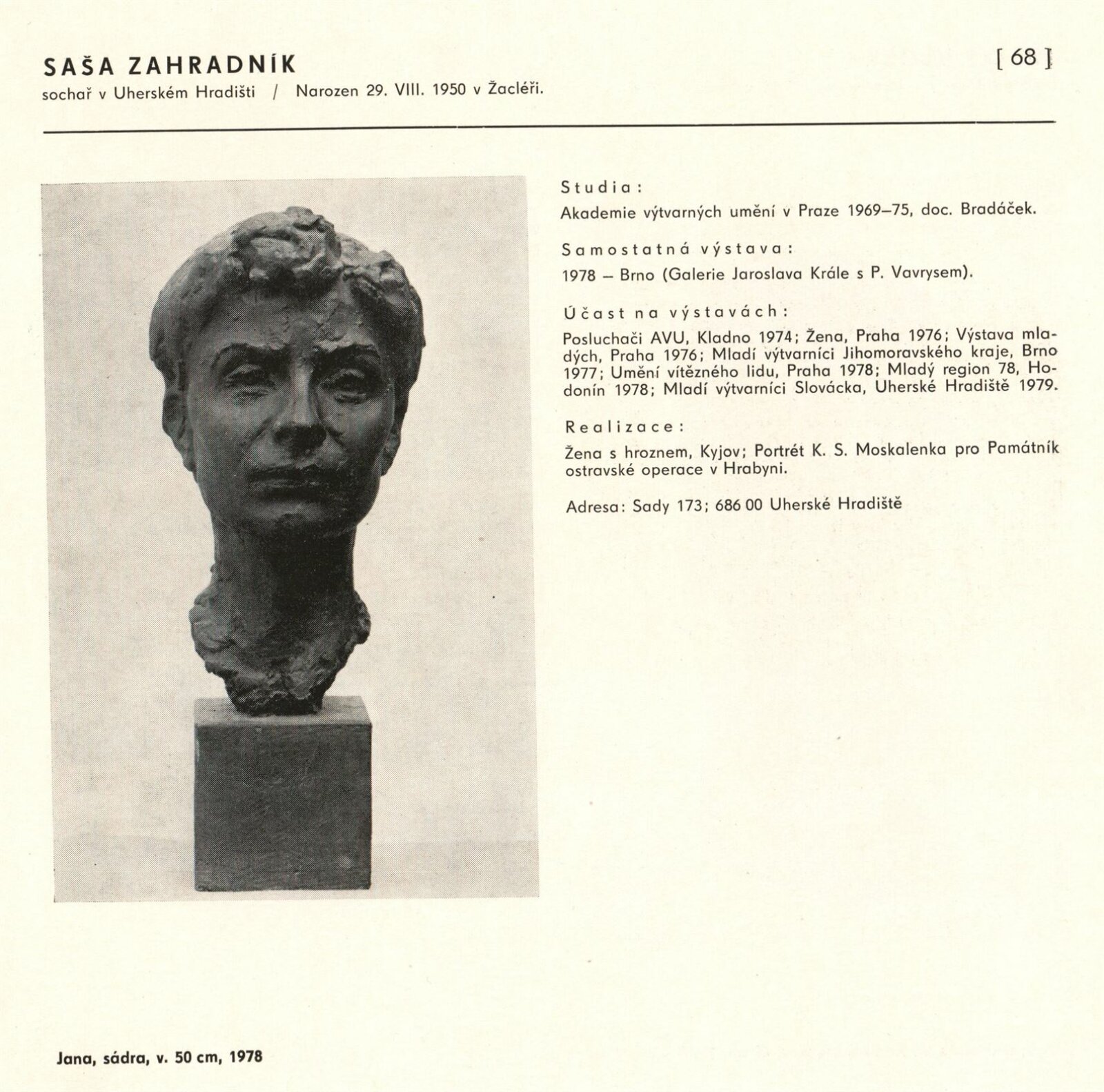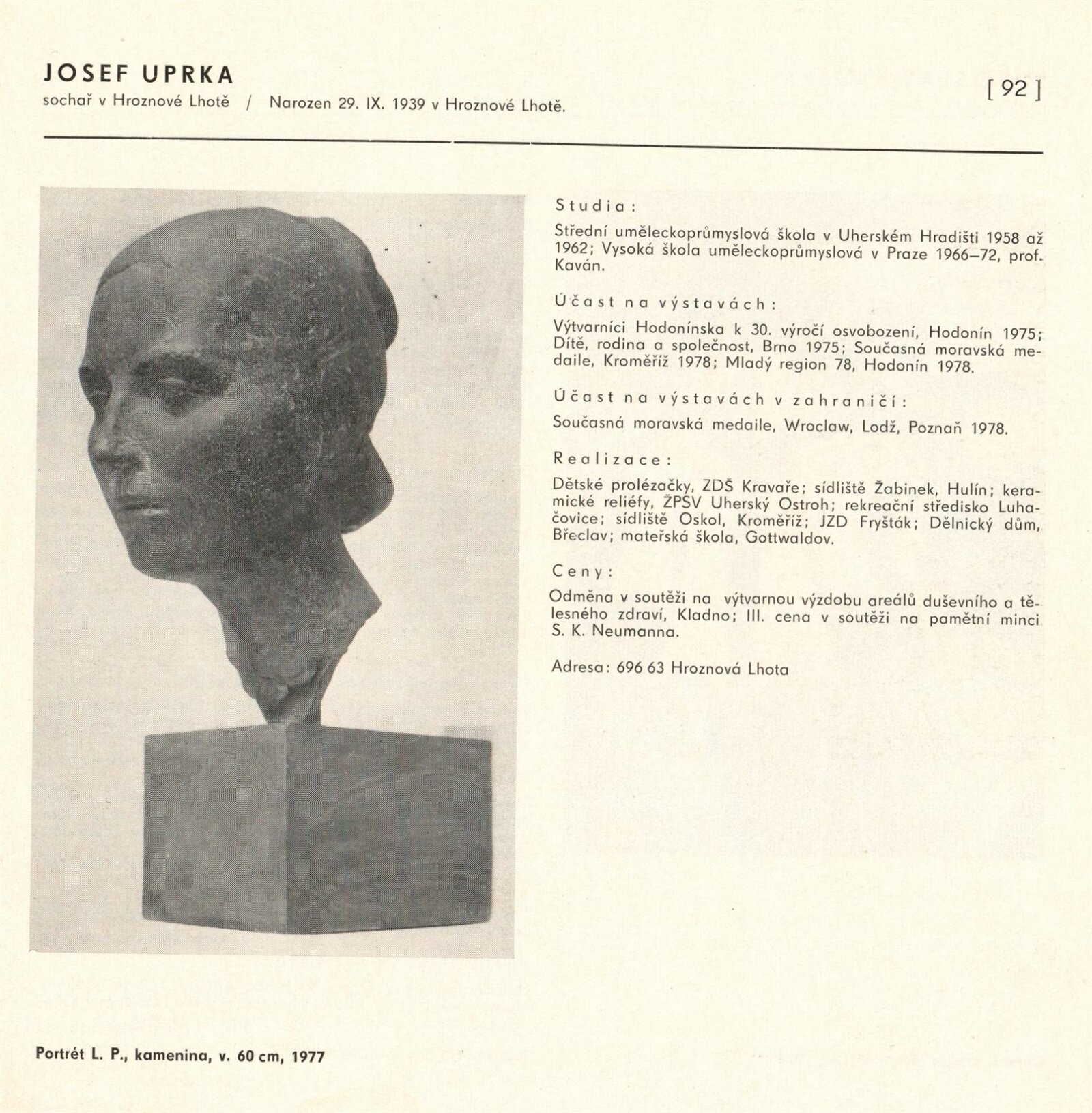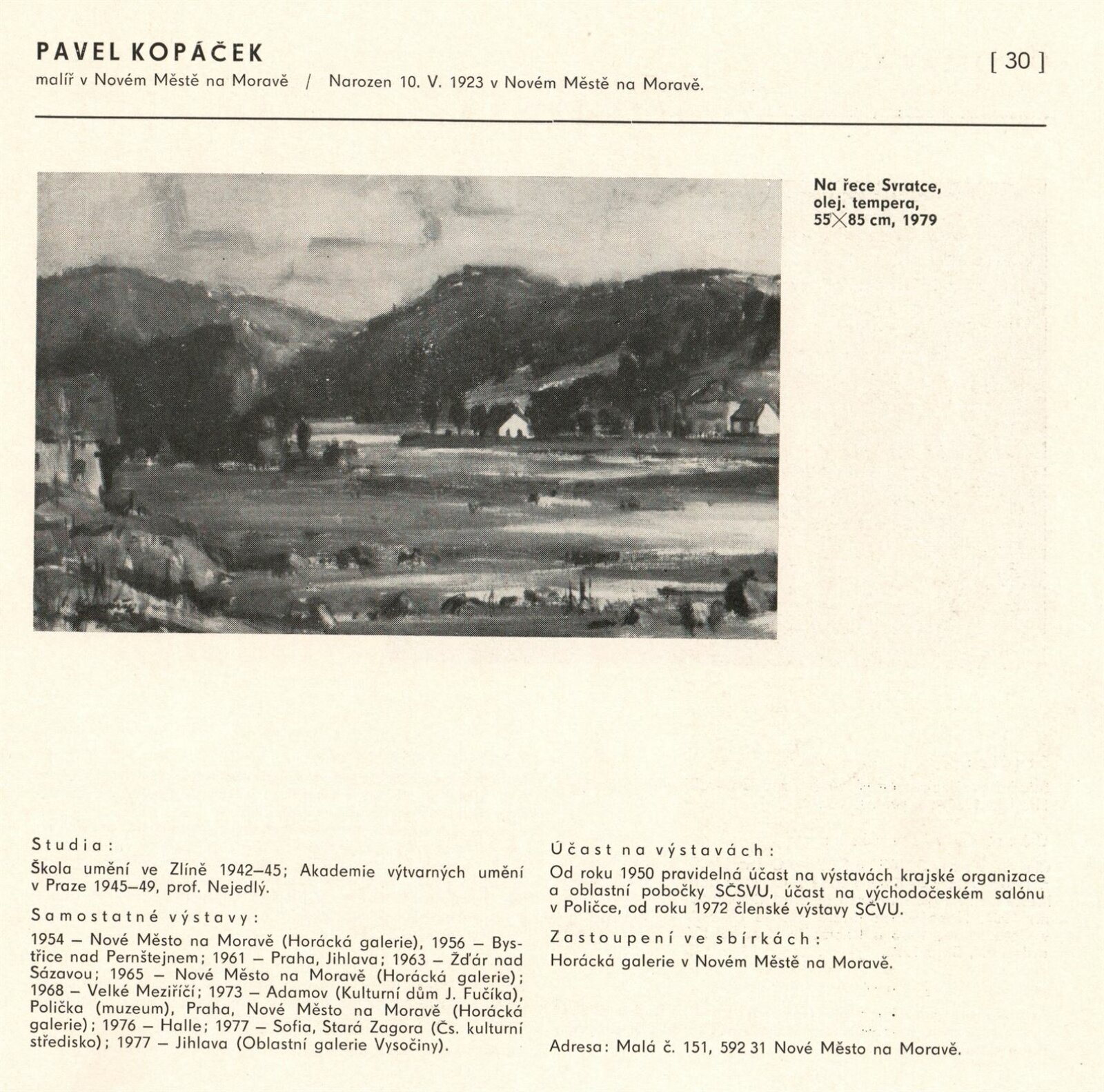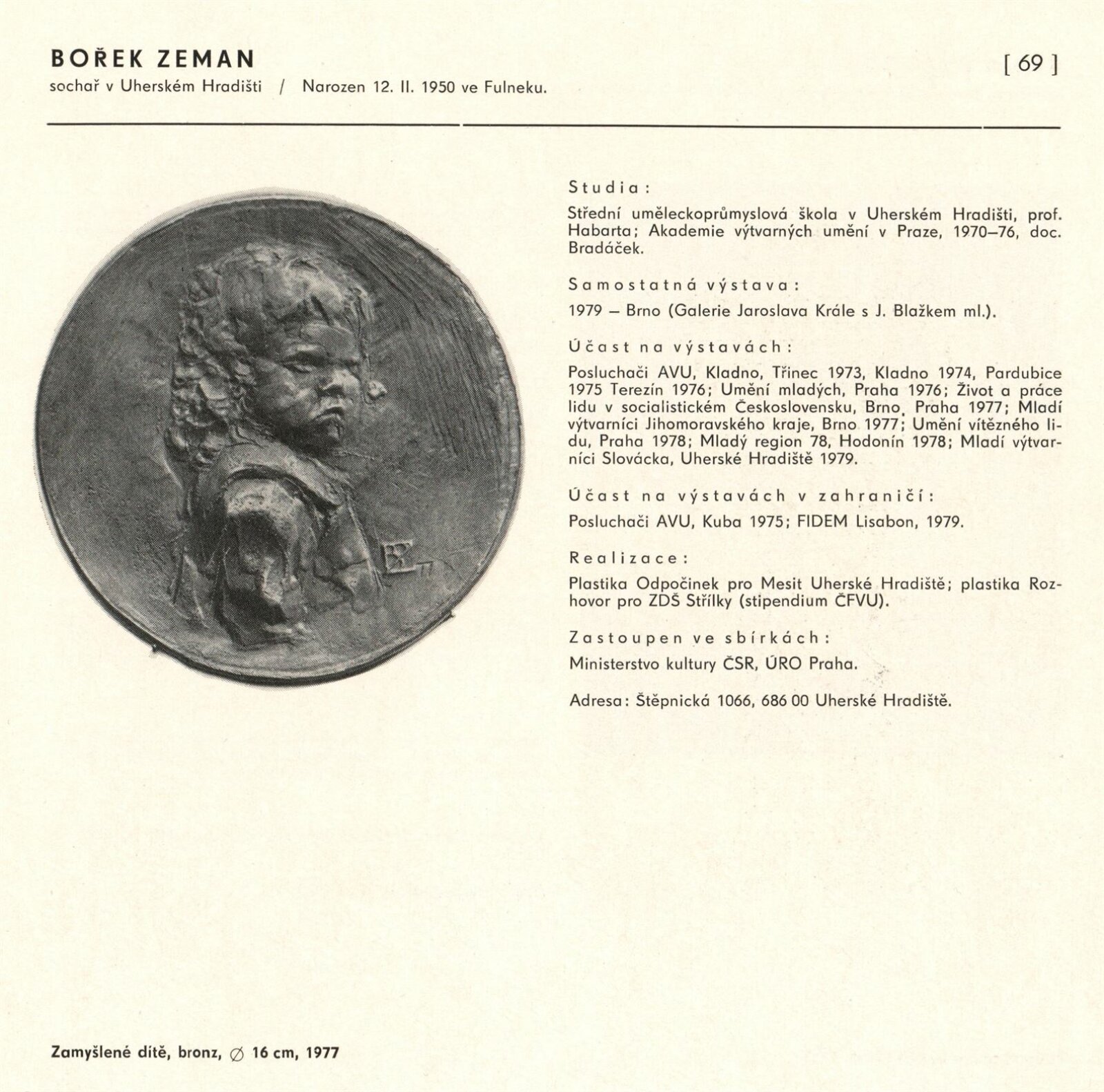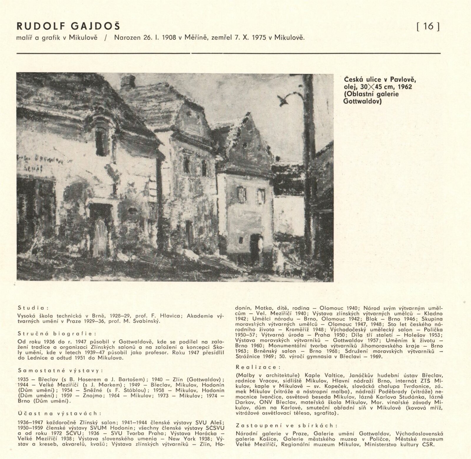 Výtvarné umění Jihomoravského kraje: Dům umění města Brna, 1. patro, 3. 4. – 1. 5. 1980 / Text: Jiří Hlušička. – Praha: SČVU, 1980. – 96 s., obr., životní data vystavujících, seznam výstav, cen, realizací, zastoupení ve sbírkách, DU 711. – MG