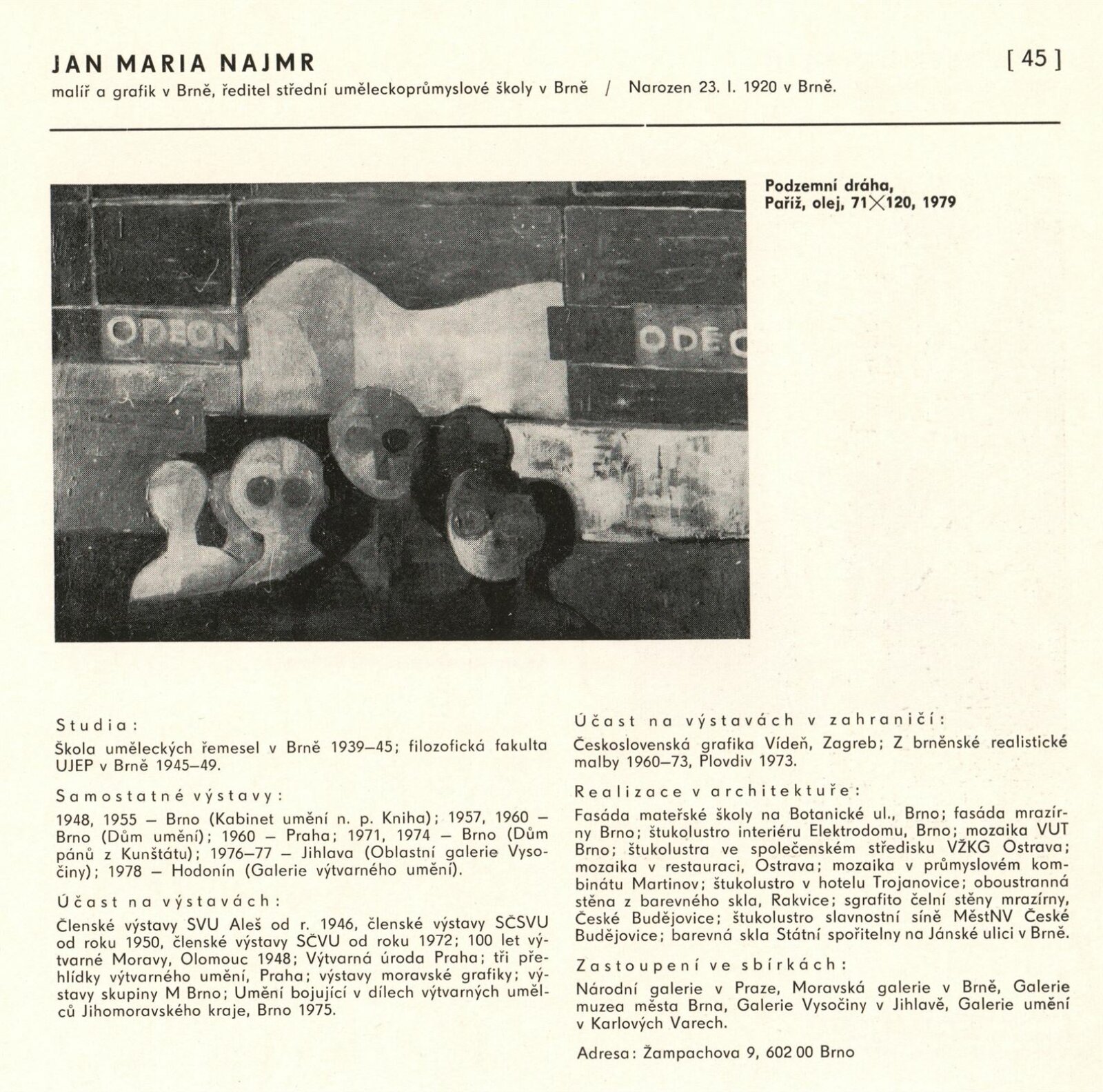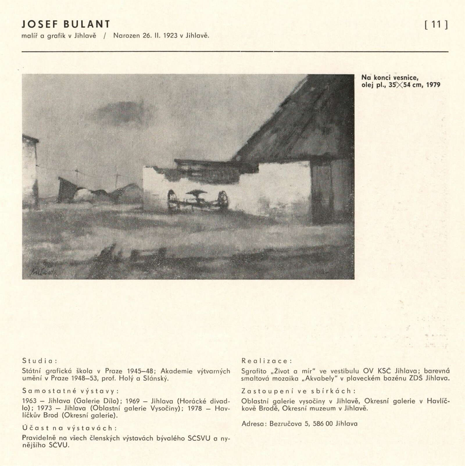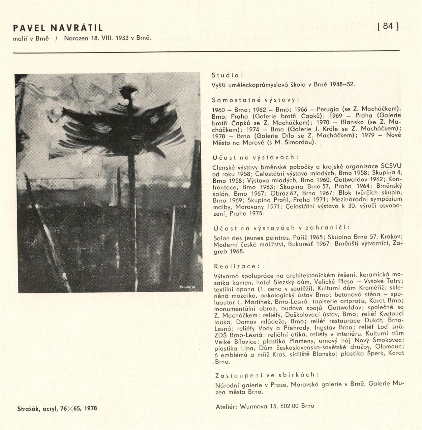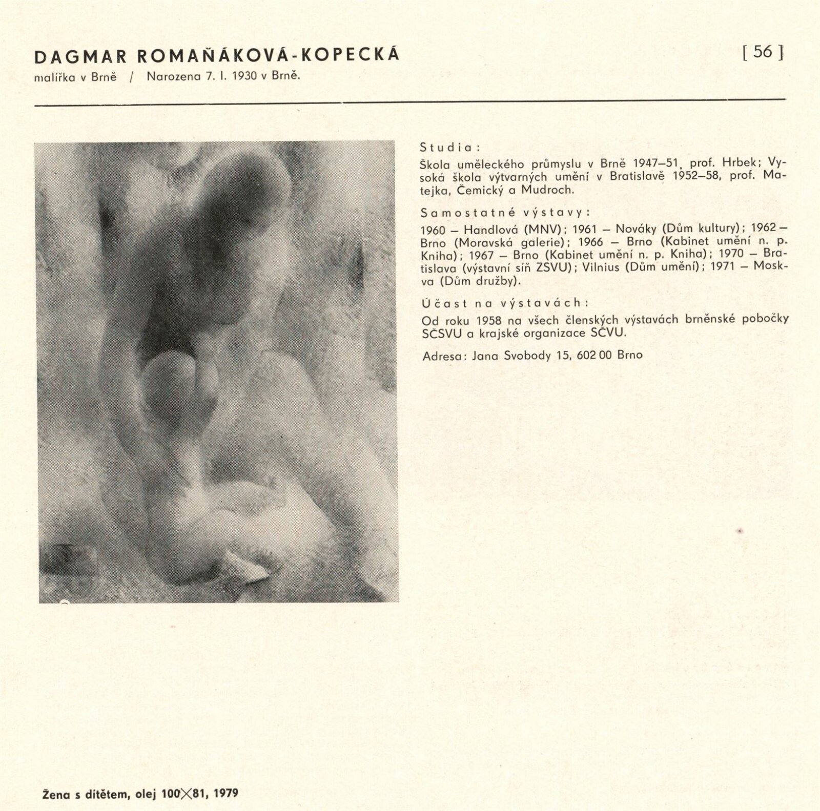 pozvánka, katalog, fotografie z vernisáže, provozní korespondence (organizace besedy, zařazení výstavy, žádost o povolení výstavy), reversy, recenze v tisku, pozvánky na výstavu v jiných městech (Praha, Trenčín)