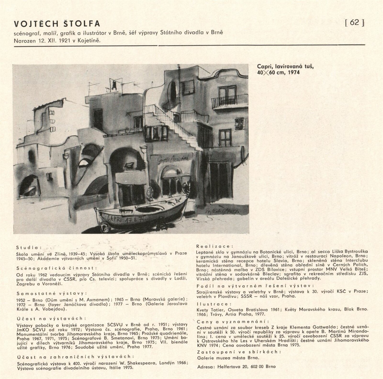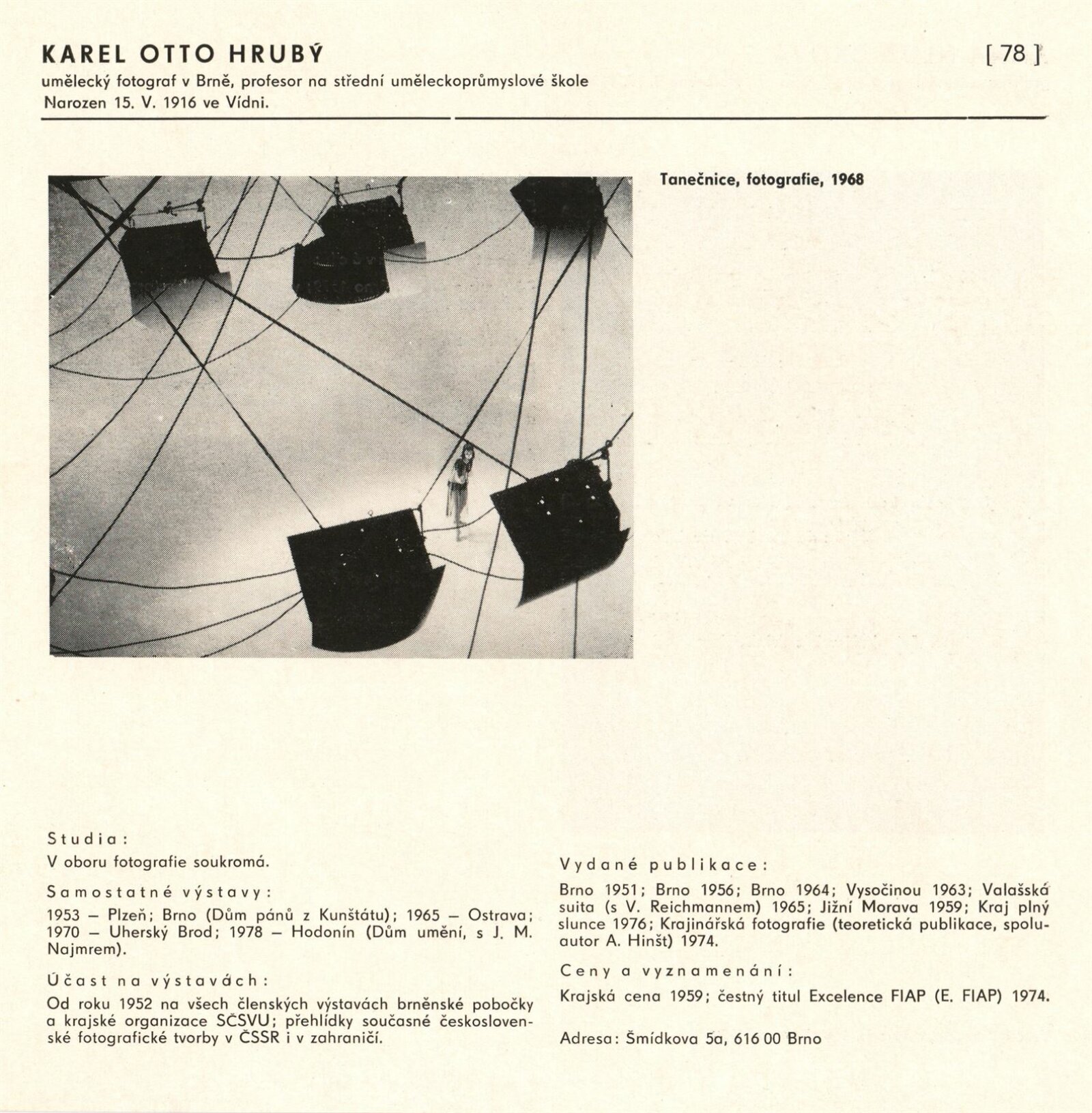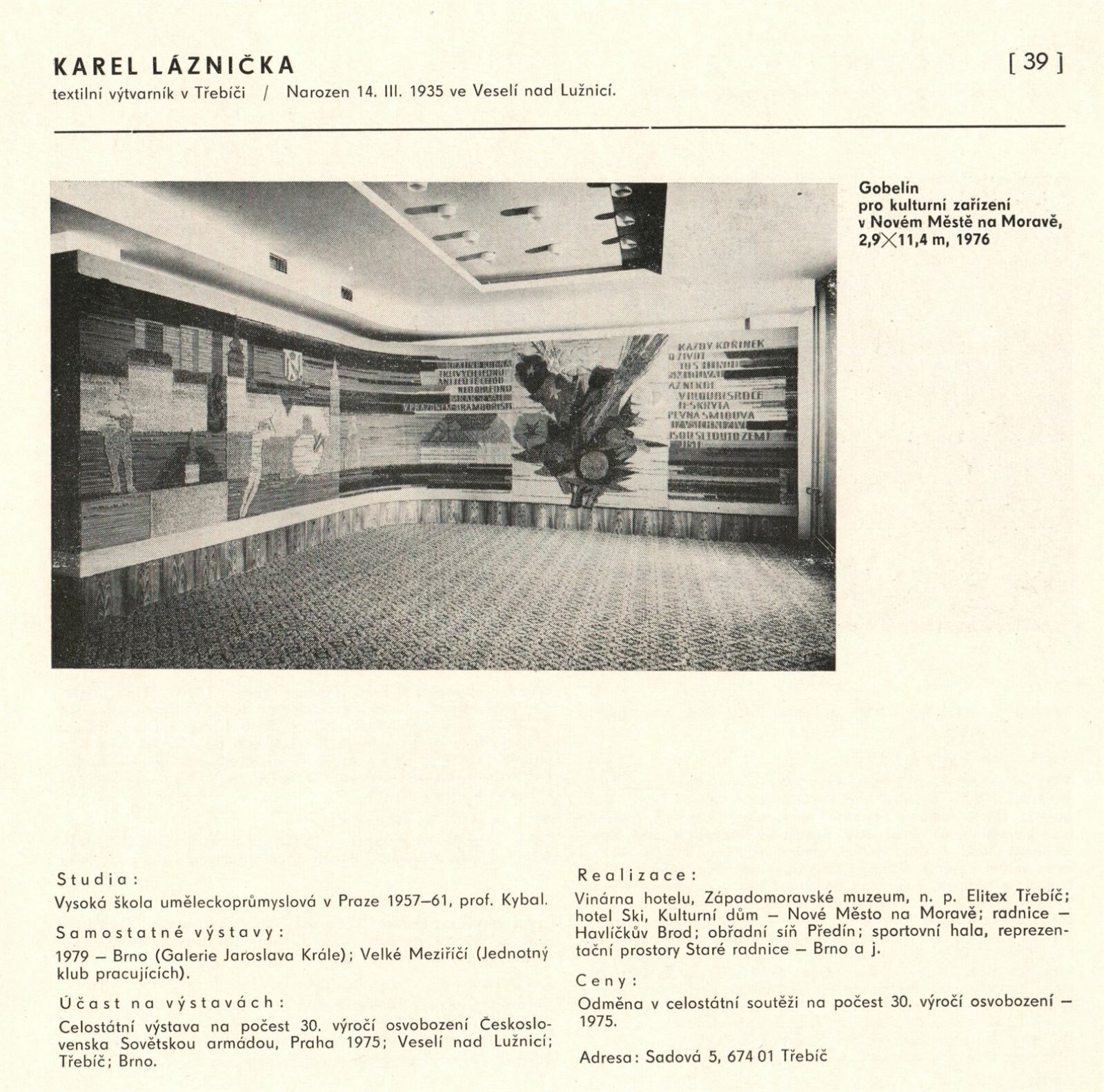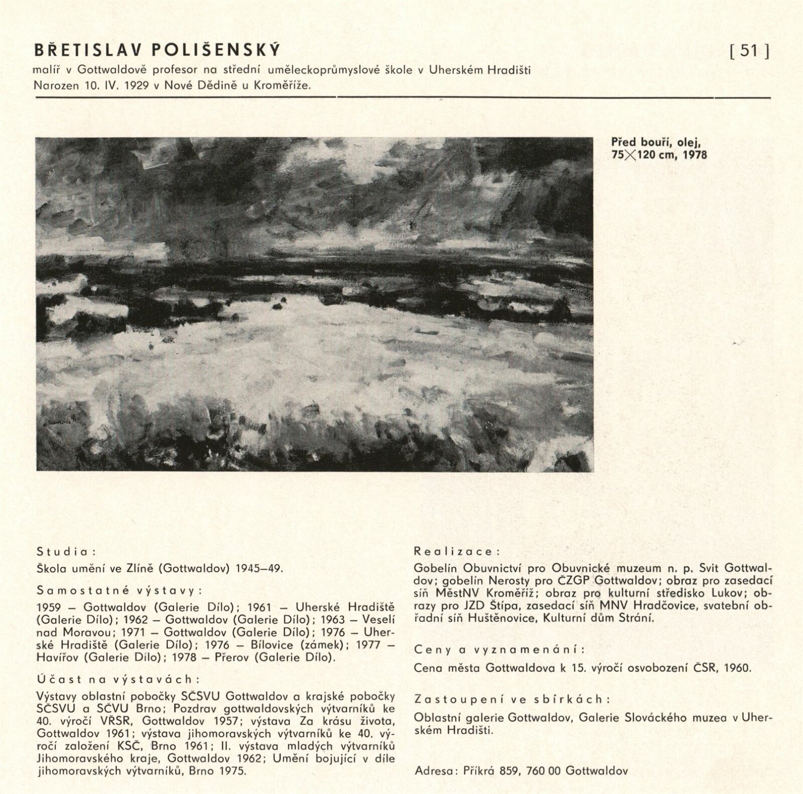 pozvánka, katalog, fotografie z vernisáže, provozní korespondence (organizace besedy, zařazení výstavy, žádost o povolení výstavy), reversy, recenze v tisku, pozvánky na výstavu v jiných městech (Praha, Trenčín)