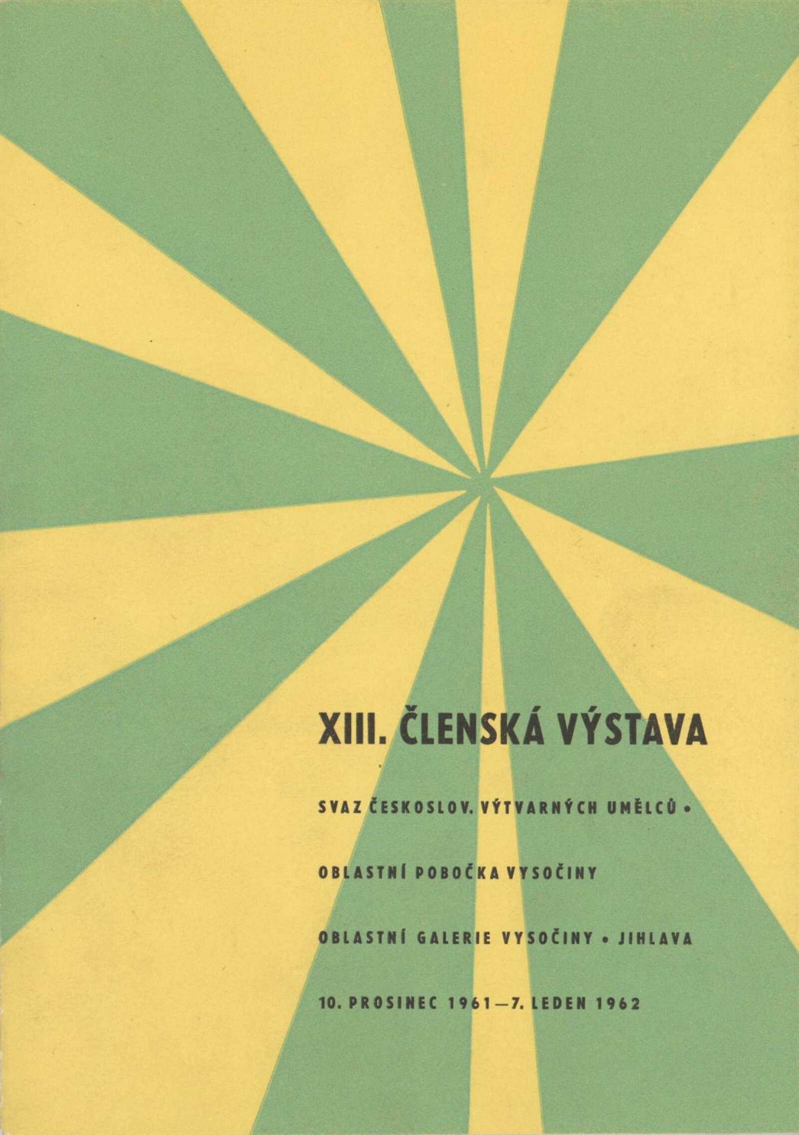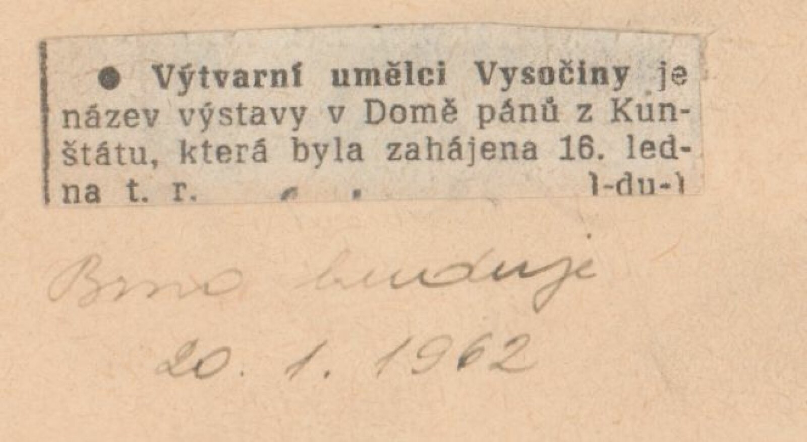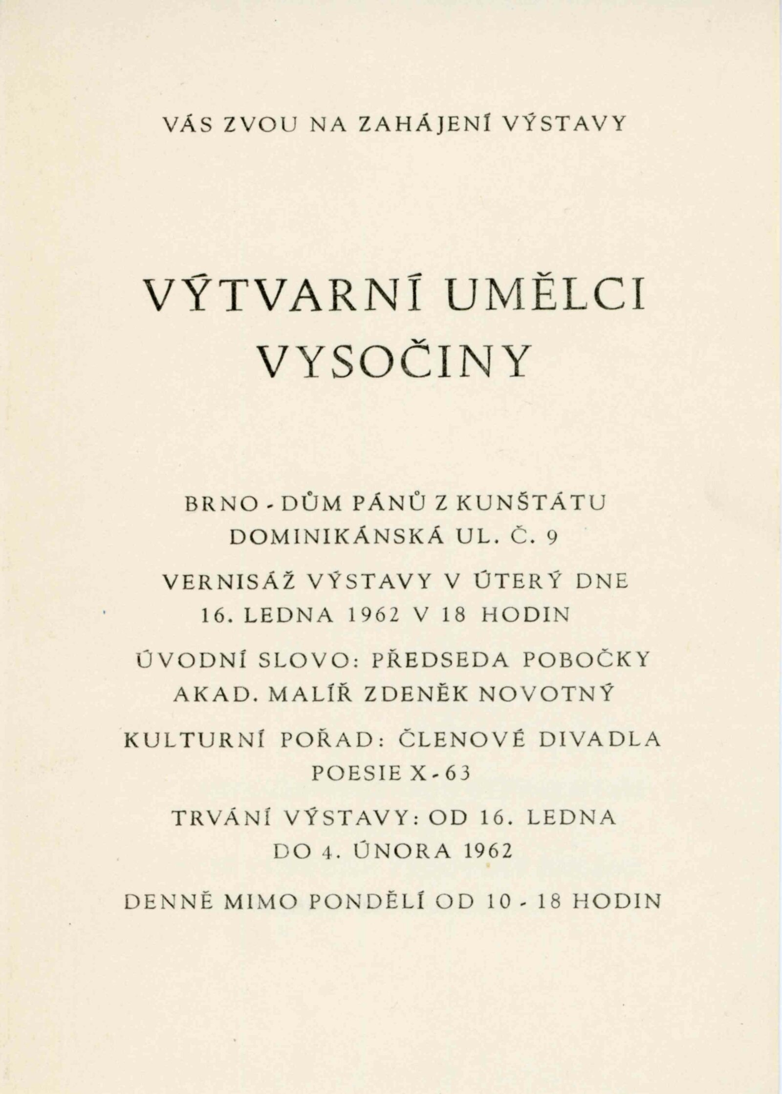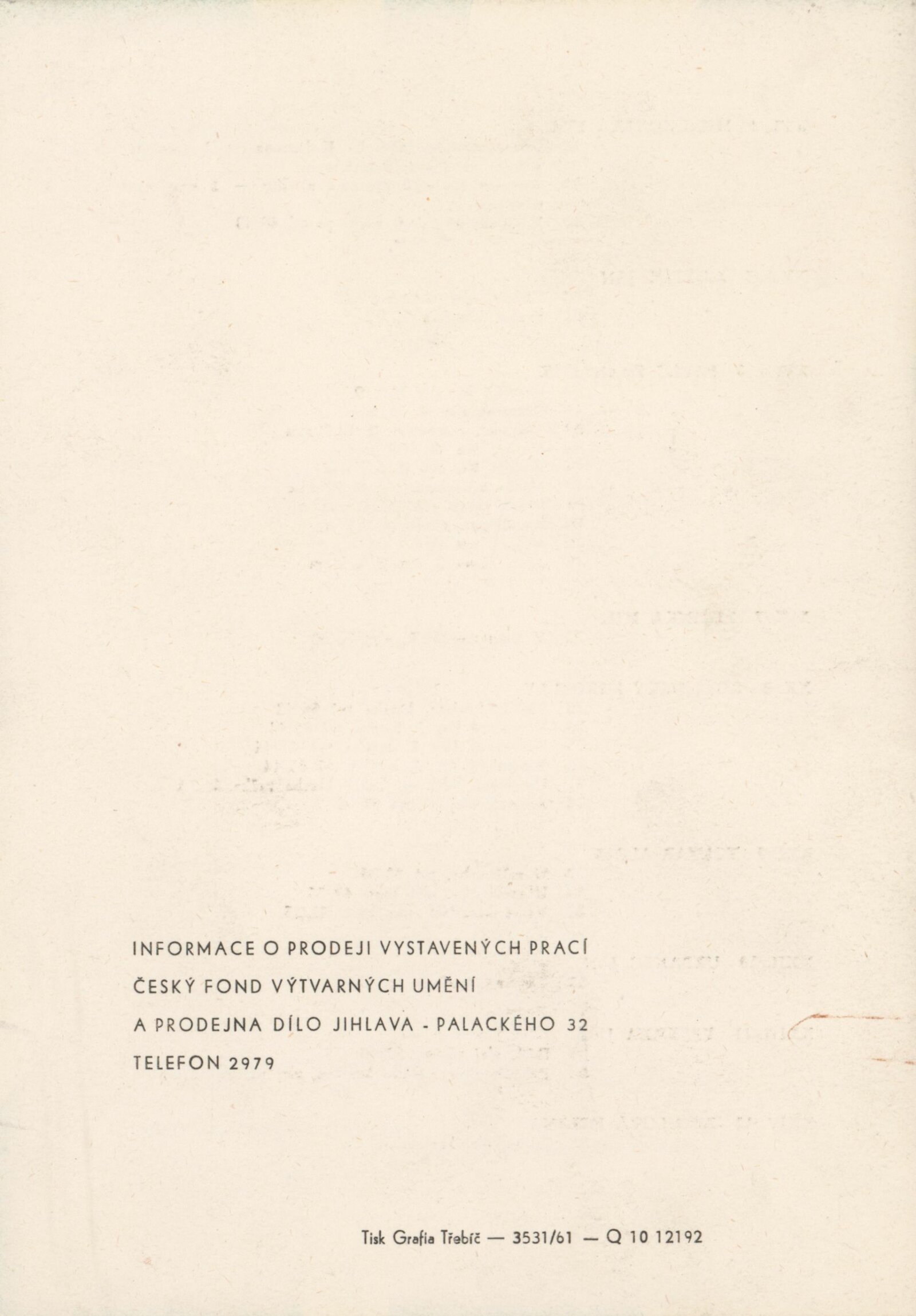 Výtvarní umělci Vysočiny: Dům umění města Brna / Dům pánů z Kunštátu, 1. patro, 16. 1. – 4. 2. 1962 / Převzatý katalog. XIII. členská výstava. Svaz československých výtvarných umělců. Oblastní pobočka Vysočiny: Oblastní galerie Vysočiny, Jihlava, 10. 12. 1961 – 7. 1. 1962 / Text: J. D. – Jihlava: SČSVU, 1961. – 13 s., obr., DPK 140. – MZK