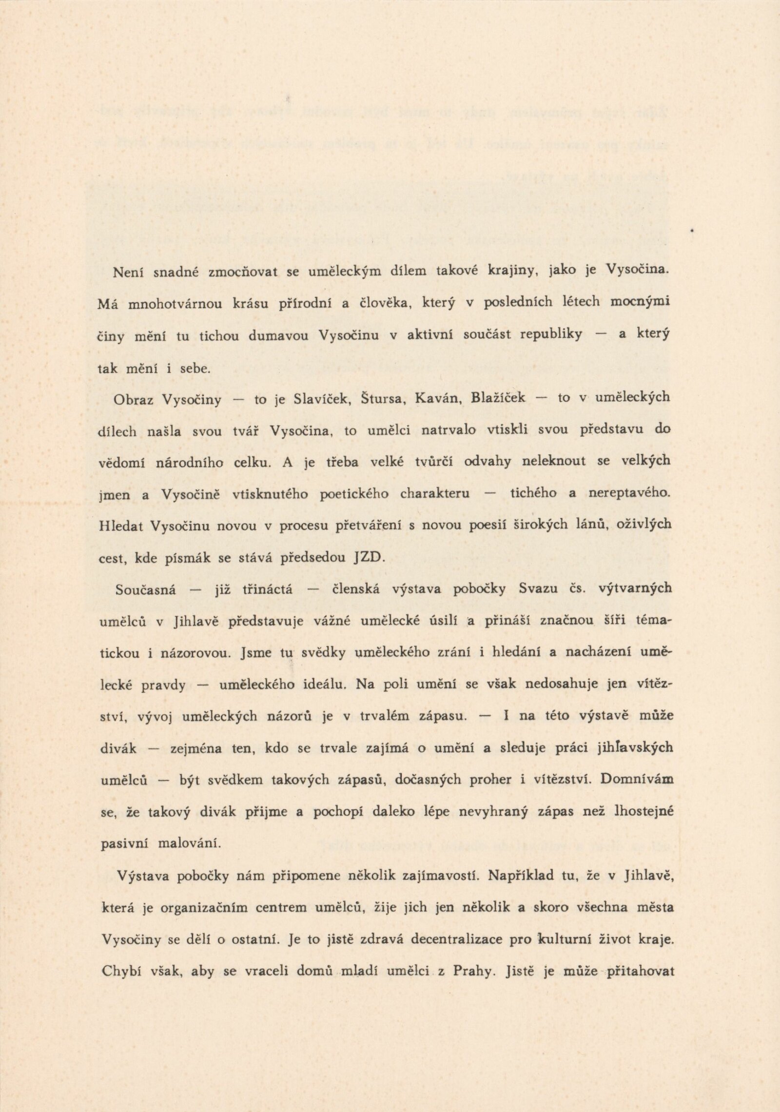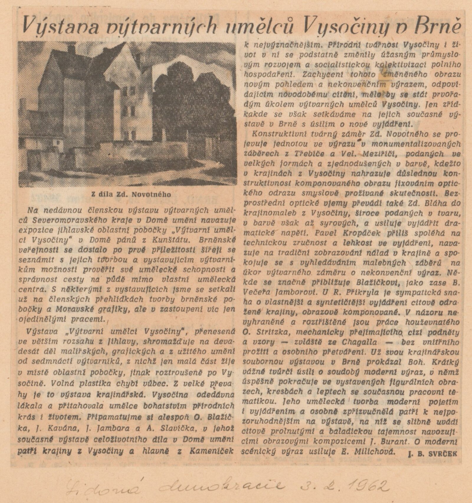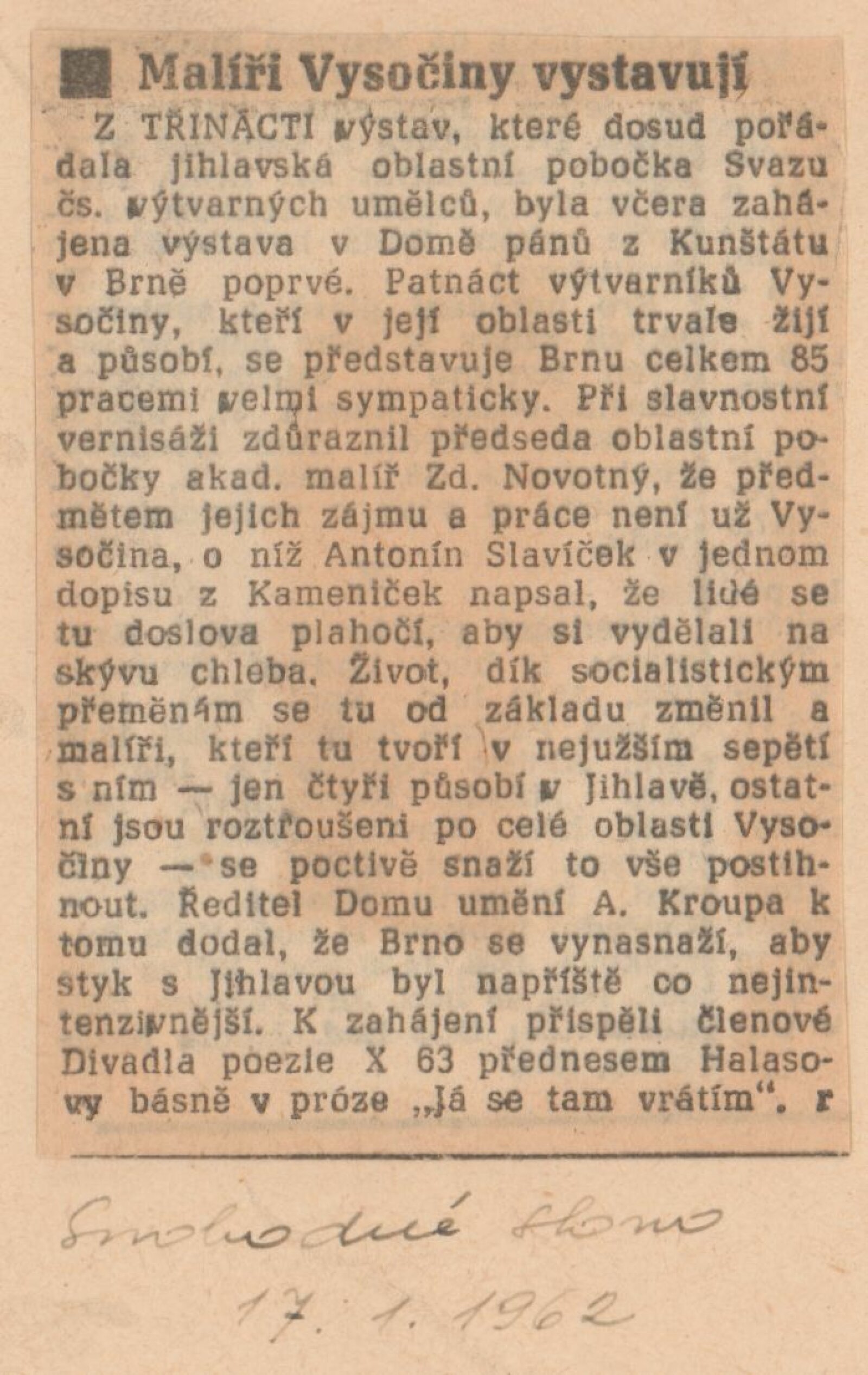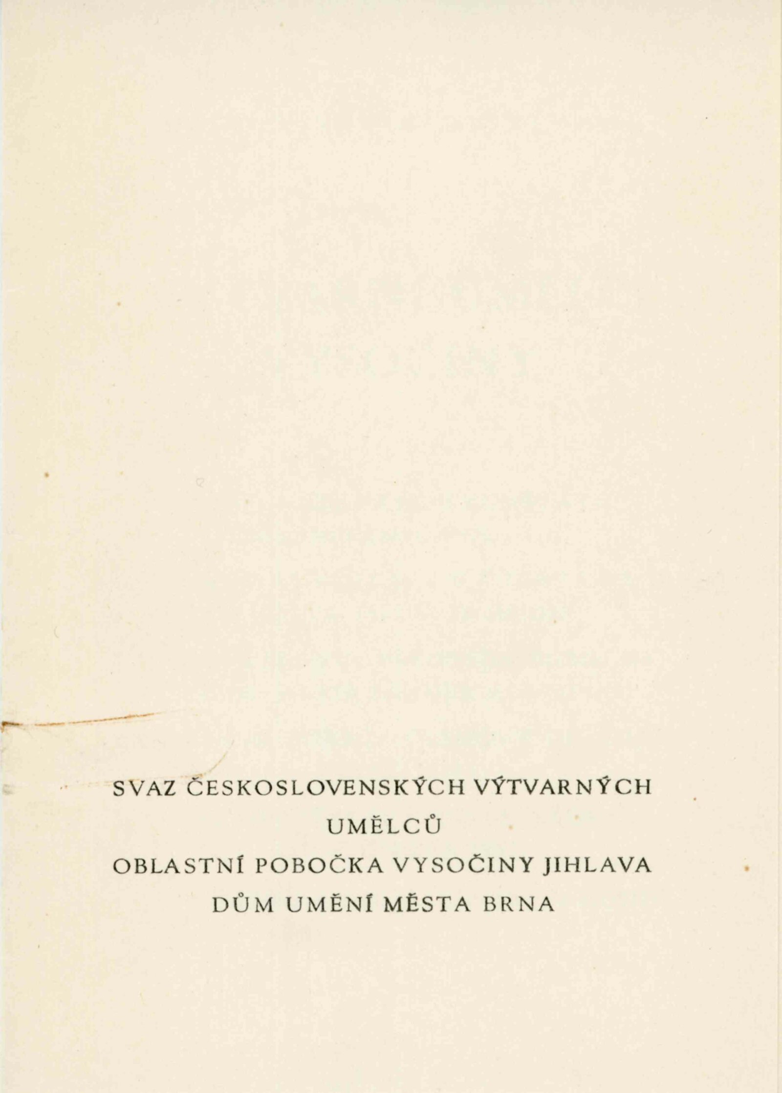 Výtvarní umělci Vysočiny: Dům umění města Brna / Dům pánů z Kunštátu, 1. patro, 16. 1. – 4. 2. 1962 / Převzatý katalog. XIII. členská výstava. Svaz československých výtvarných umělců. Oblastní pobočka Vysočiny: Oblastní galerie Vysočiny, Jihlava, 10. 12. 1961 – 7. 1. 1962 / Text: J. D. – Jihlava: SČSVU, 1961. – 13 s., obr., DPK 140. – MZK