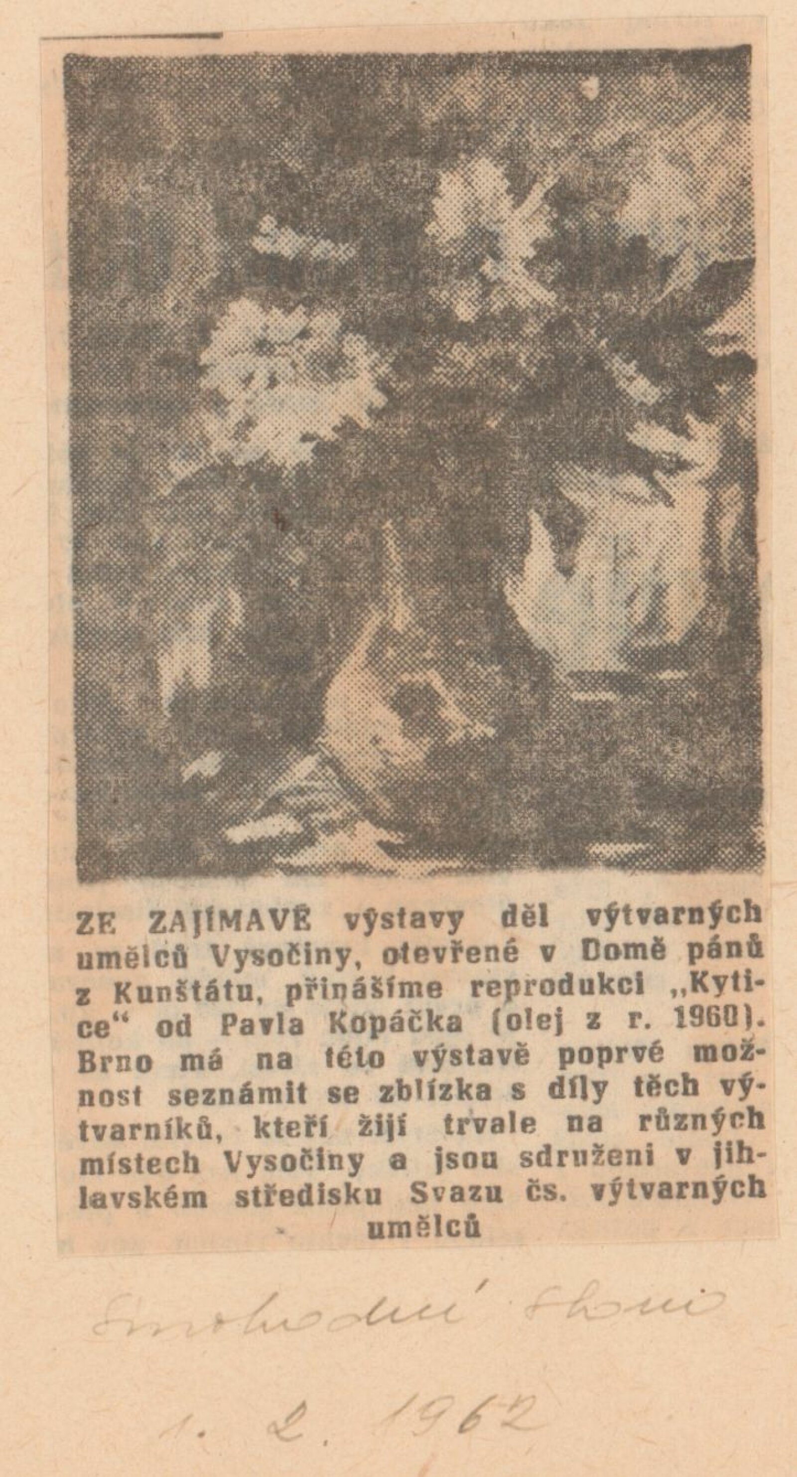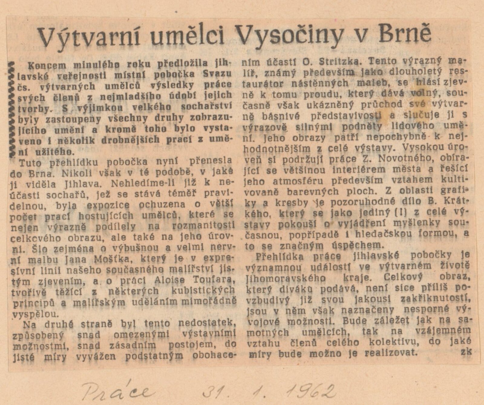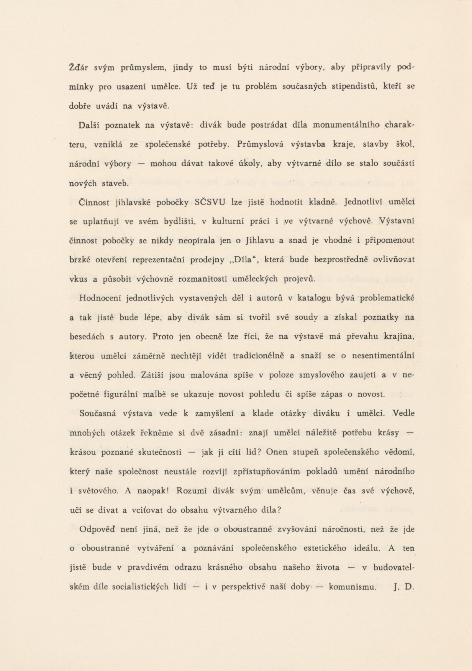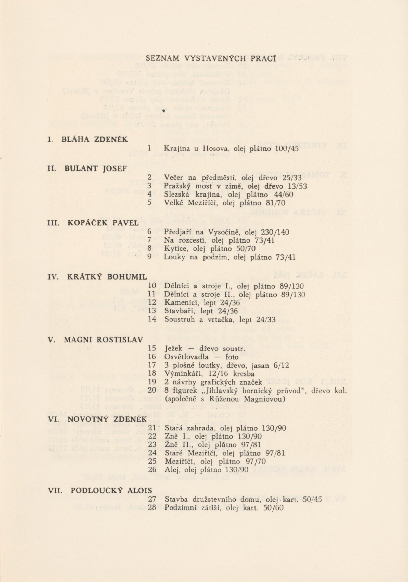 Výtvarní umělci Vysočiny: Dům umění města Brna / Dům pánů z Kunštátu, 1. patro, 16. 1. – 4. 2. 1962 / Převzatý katalog. XIII. členská výstava. Svaz československých výtvarných umělců. Oblastní pobočka Vysočiny: Oblastní galerie Vysočiny, Jihlava, 10. 12. 1961 – 7. 1. 1962 / Text: J. D. – Jihlava: SČSVU, 1961. – 13 s., obr., DPK 140. – MZK