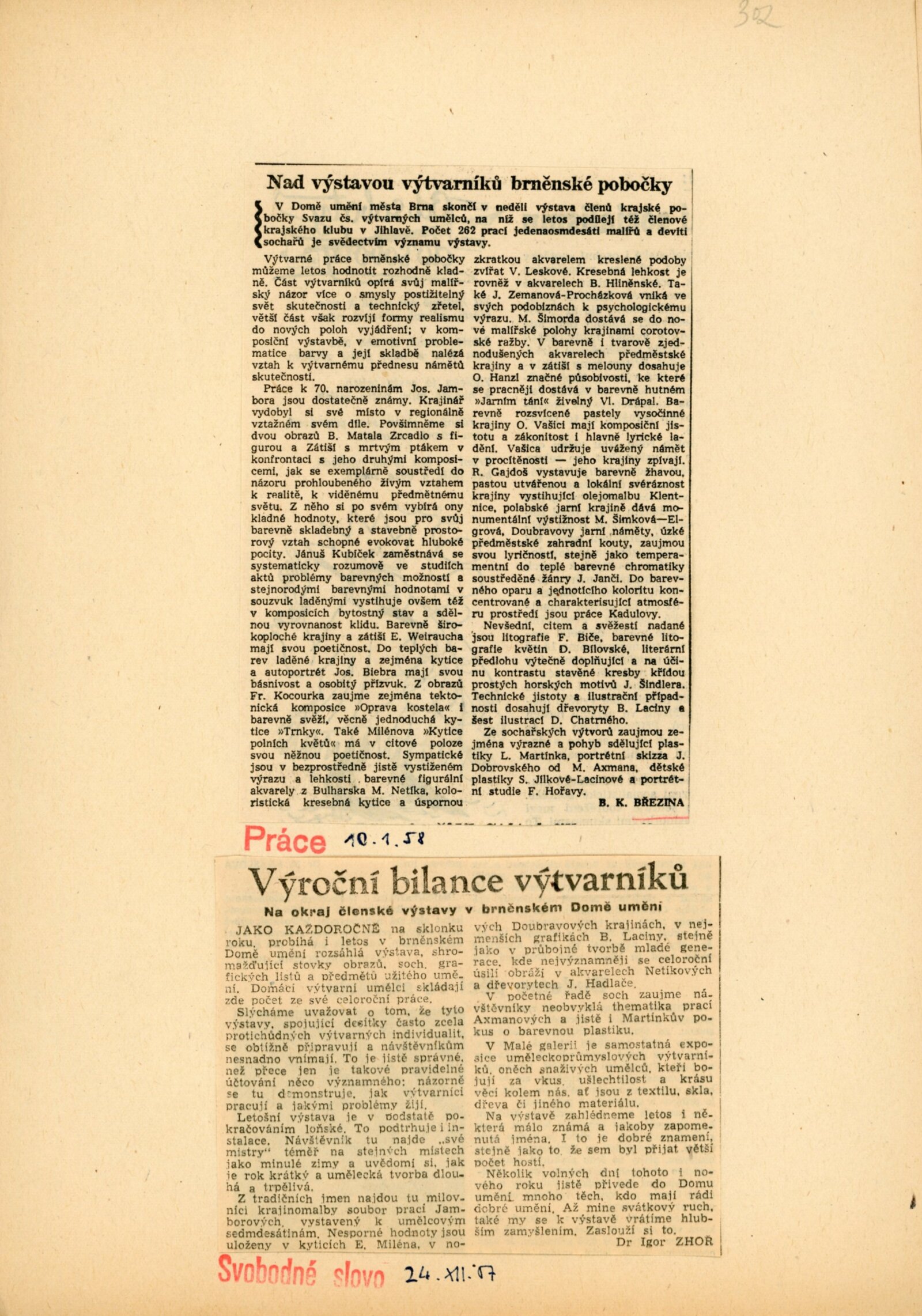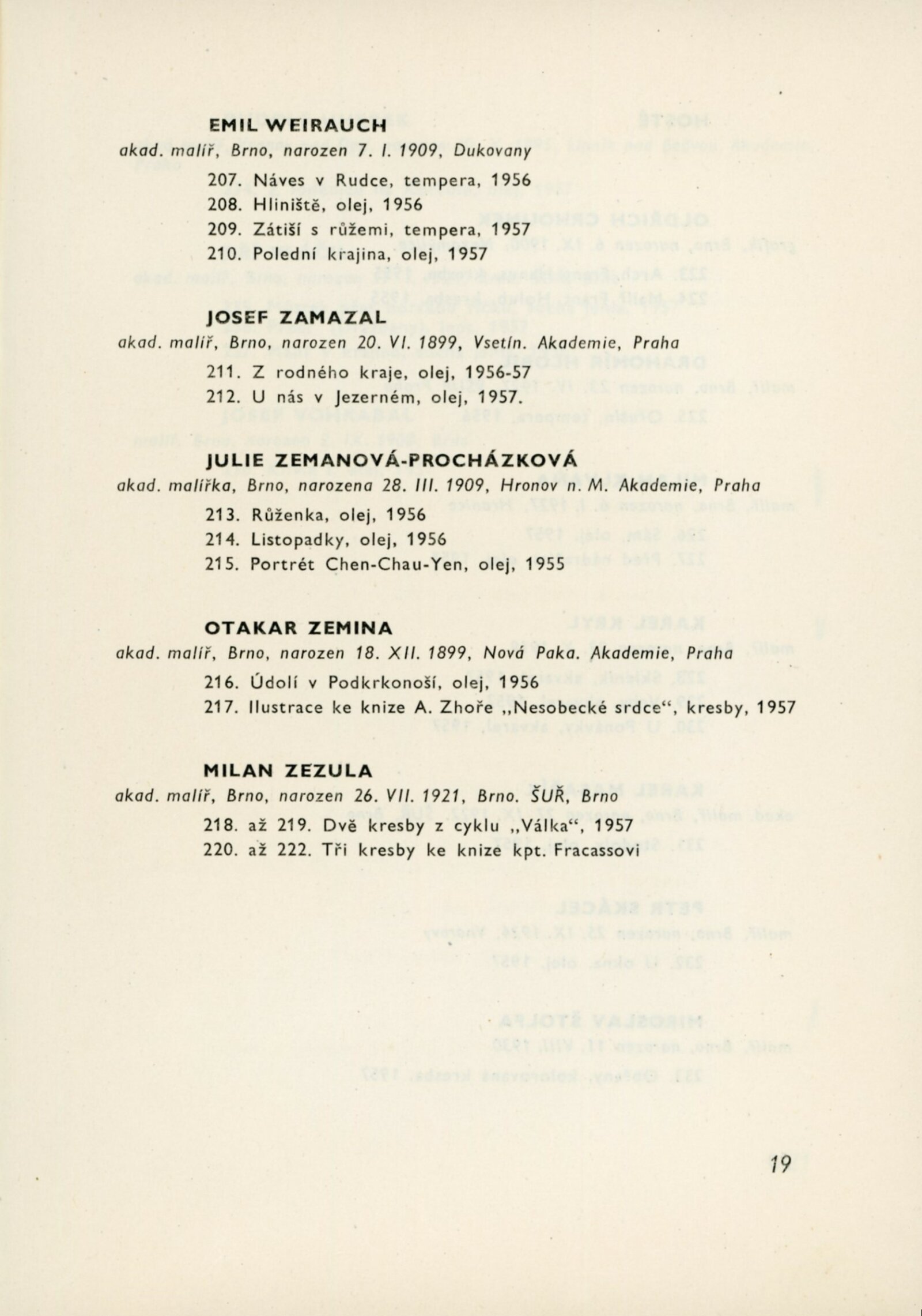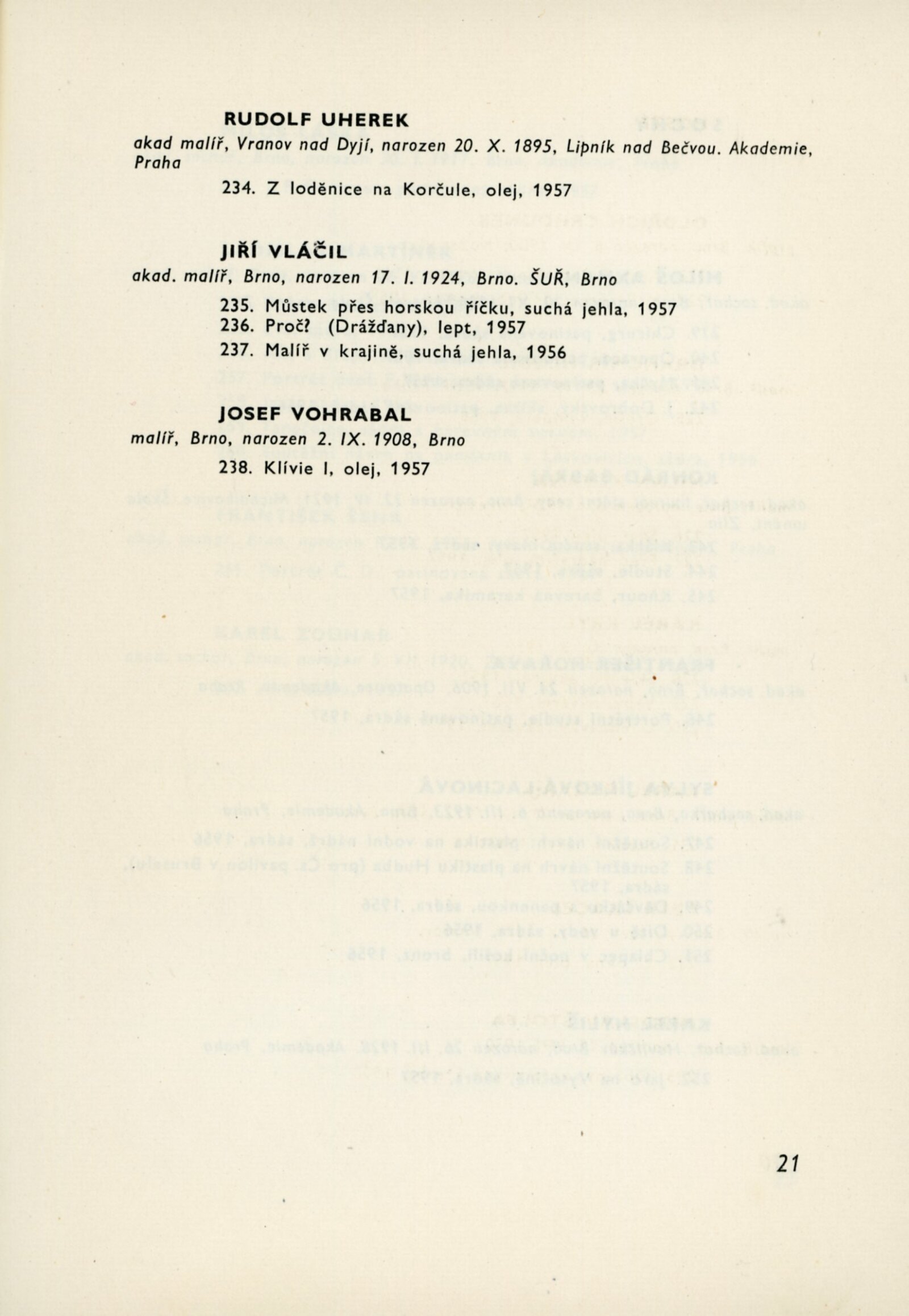 Výstava výtvarníků brněnské pobočky. Svaz československých výtvarných umělců. První členská výstava: Dům umění města Brna, 15. 12. 1957 – 15. 1. 1958 / Text: J. B. Svrček. – Brno: SČSVU, 1957. – 27 s., životní data vystavujících, DU 302. – Kubíček 7635; MZK; MG