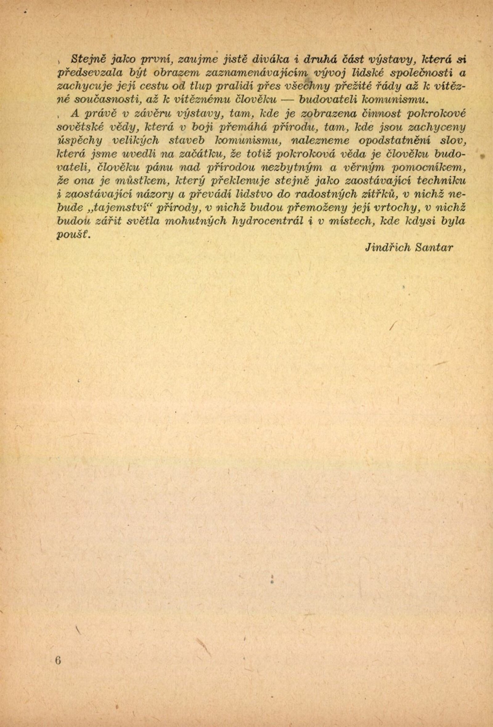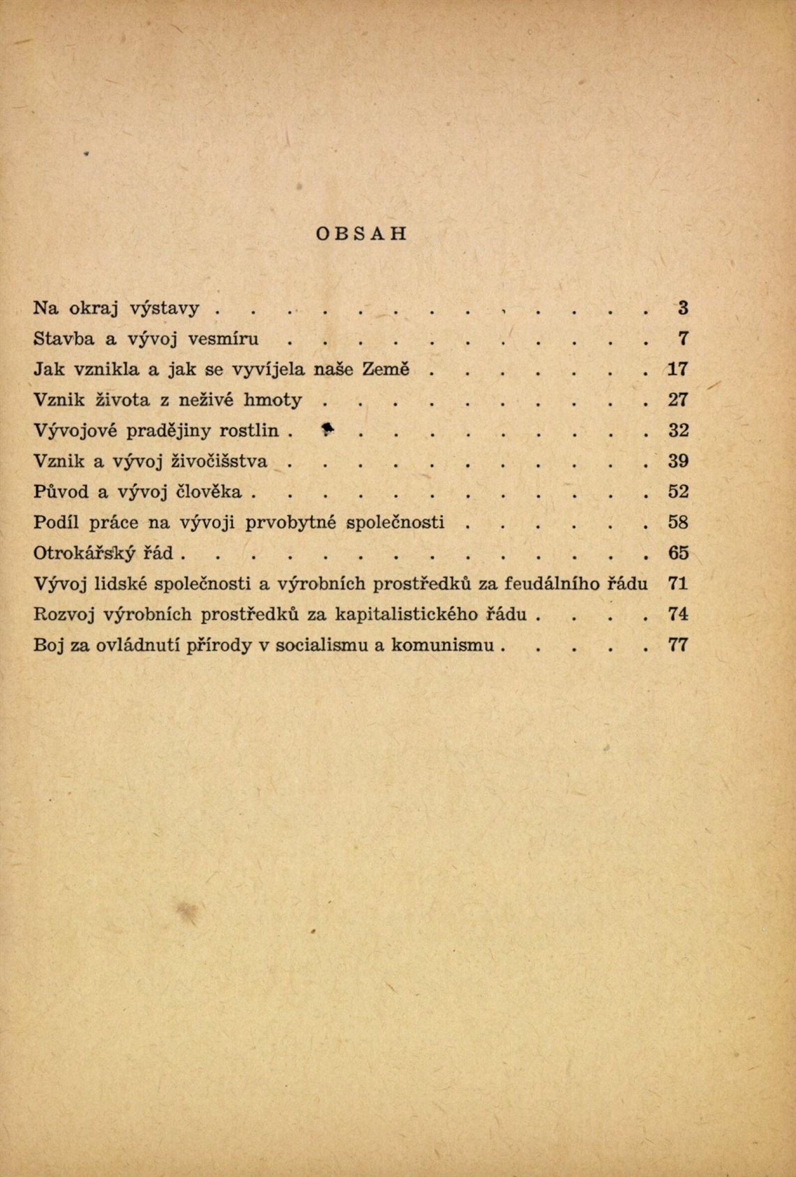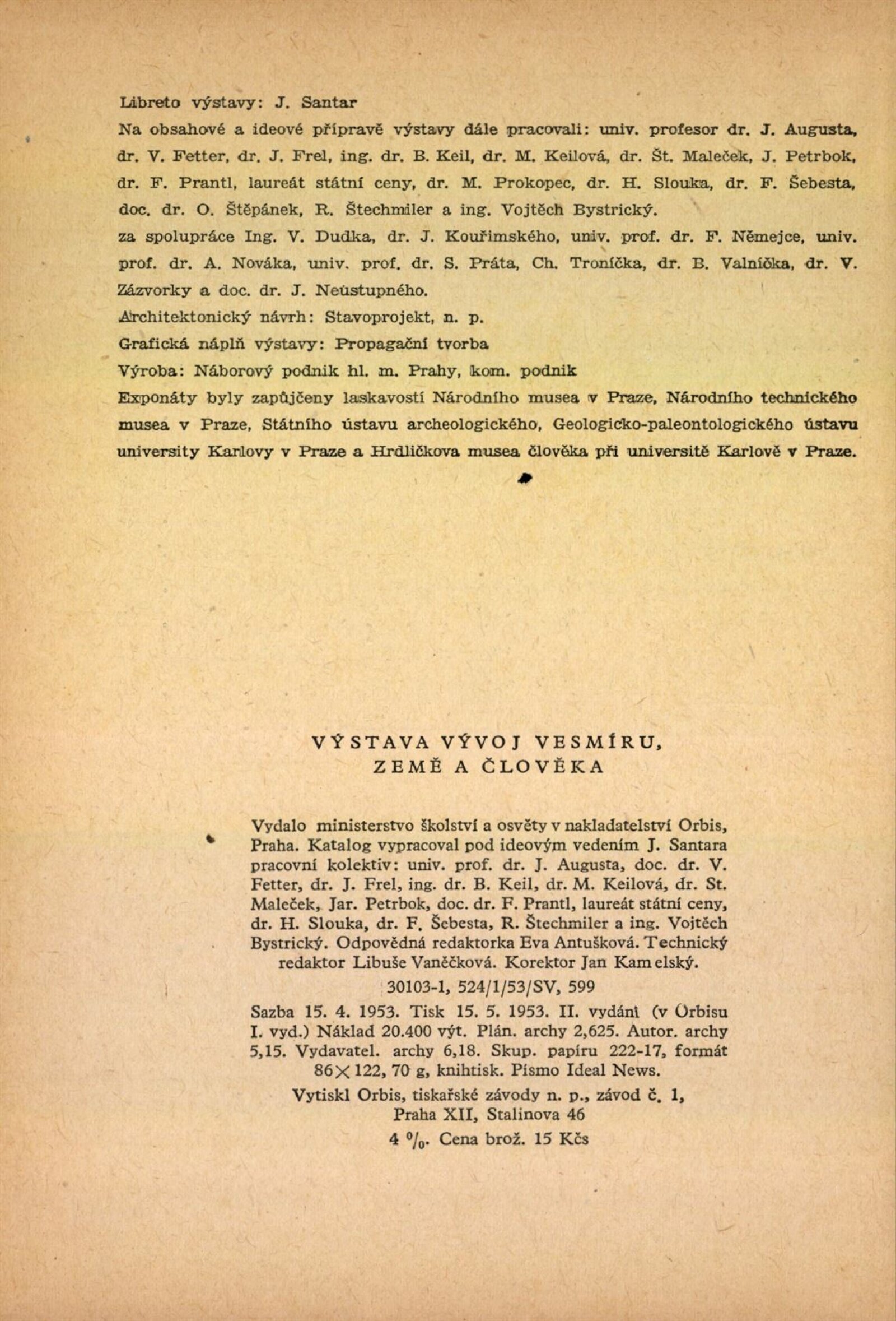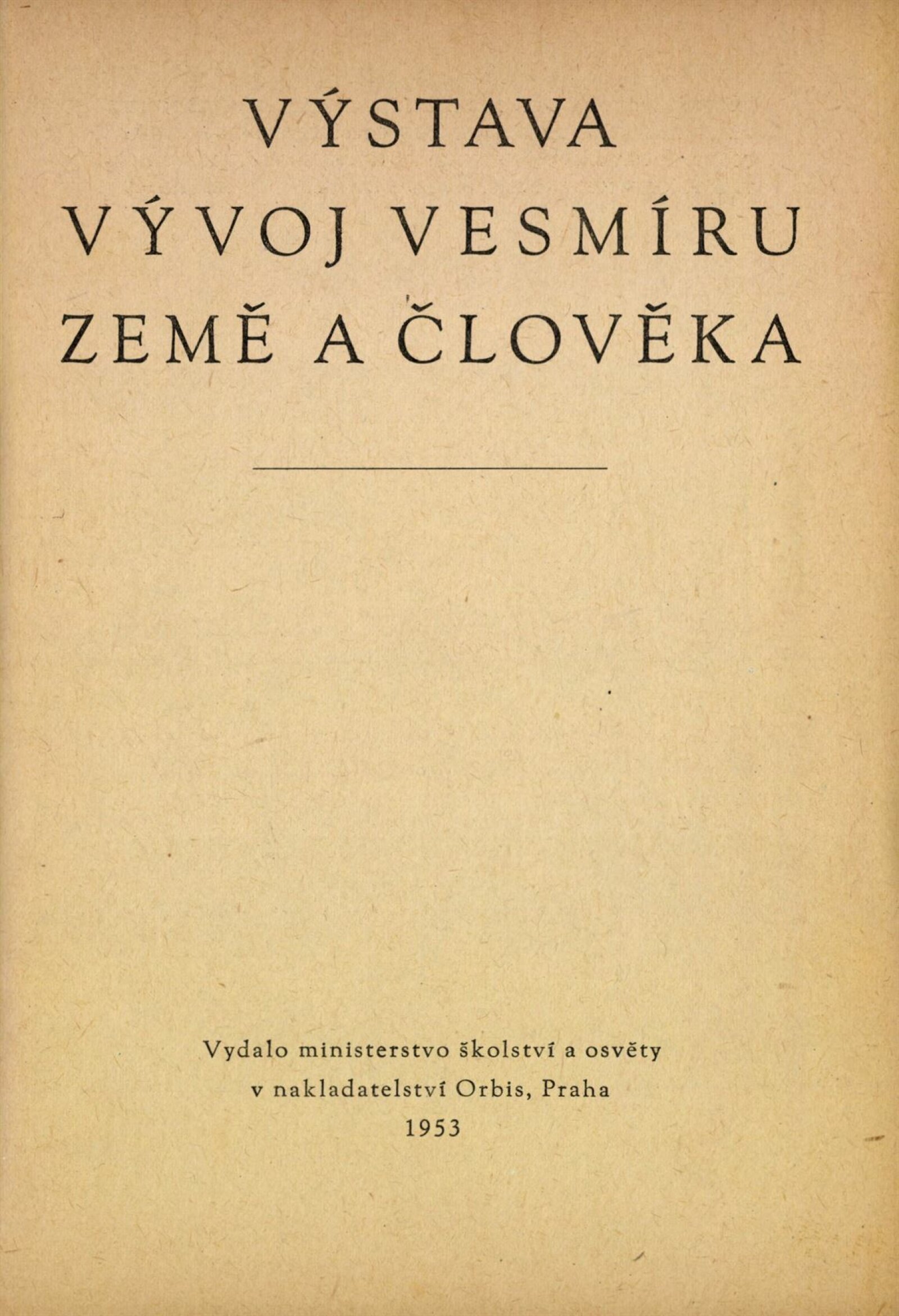 Vývoj vesmíru, země a člověka: Dům umění, 20. 2 – 10. 5. 1953 / Text: Pod ideovým vedením Jindřicha Santara vypracoval pracovní kolektiv. – Praha: Ministerstvo školství a osvěty v nakladatelství Orbis, 1953. – 82 s., DU 180. – MZK; MG