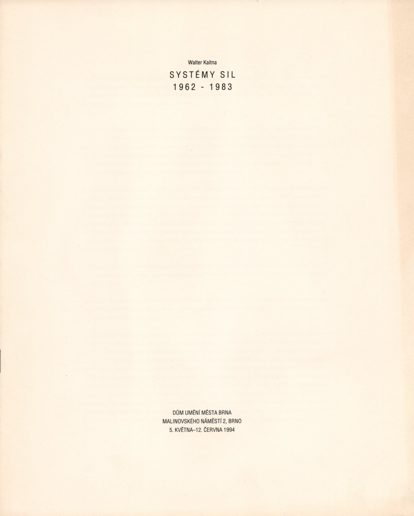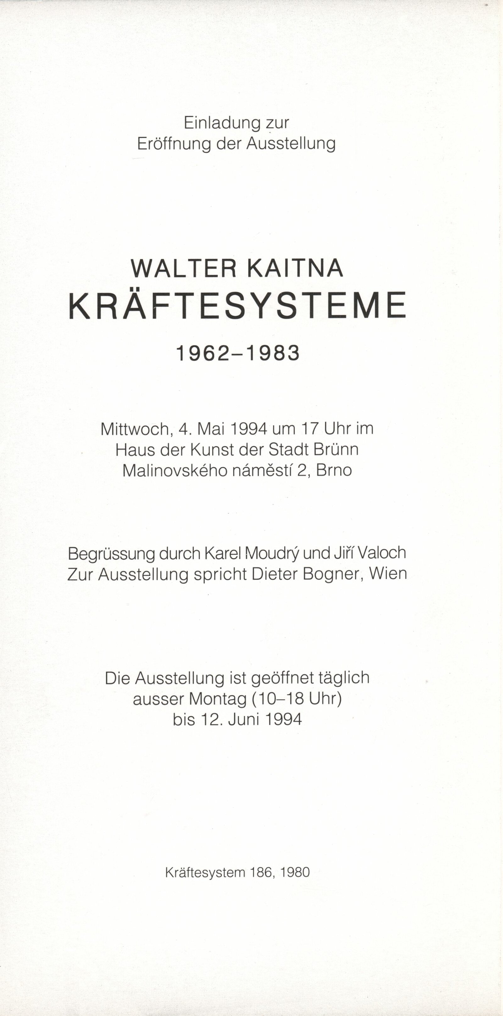 Walter Kaitna. Kräftesysteme 1962–1983: Dům umění města Brna 5. Mai – 12. Juni 1994 ... / Texty Jiří Valoch, Dieter Bogner, Wolfgang Pauser, Dietmar Guderian, autor. - Wien: Kunstraum Buchberg, - 130 s., obr. Český překlad Systémy sil. 1962-Texty Jiří Valoch, Dieter Bogner. - Brno: DUmB, - [8] s. Portrét, životní data, výstavy DU 968; MZK; MG
