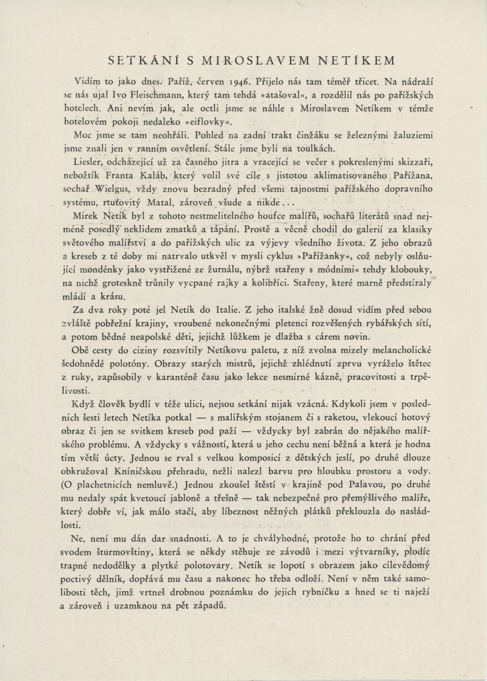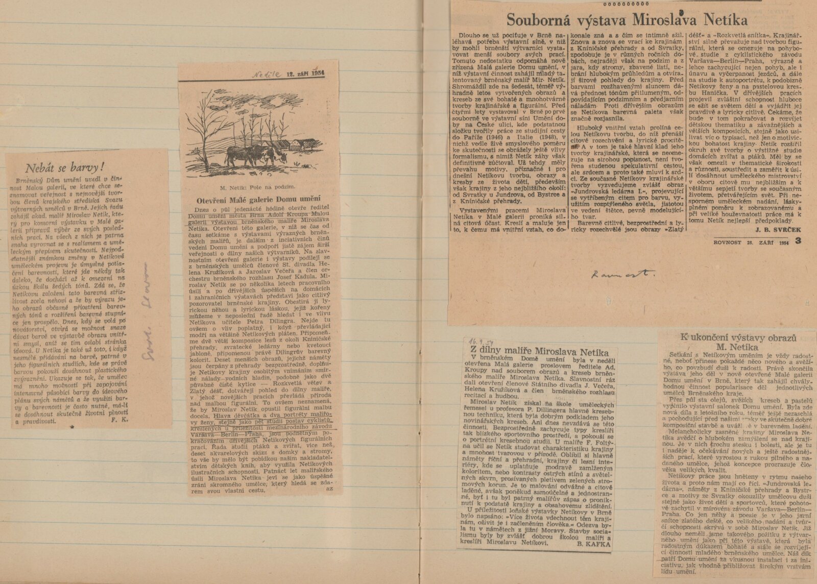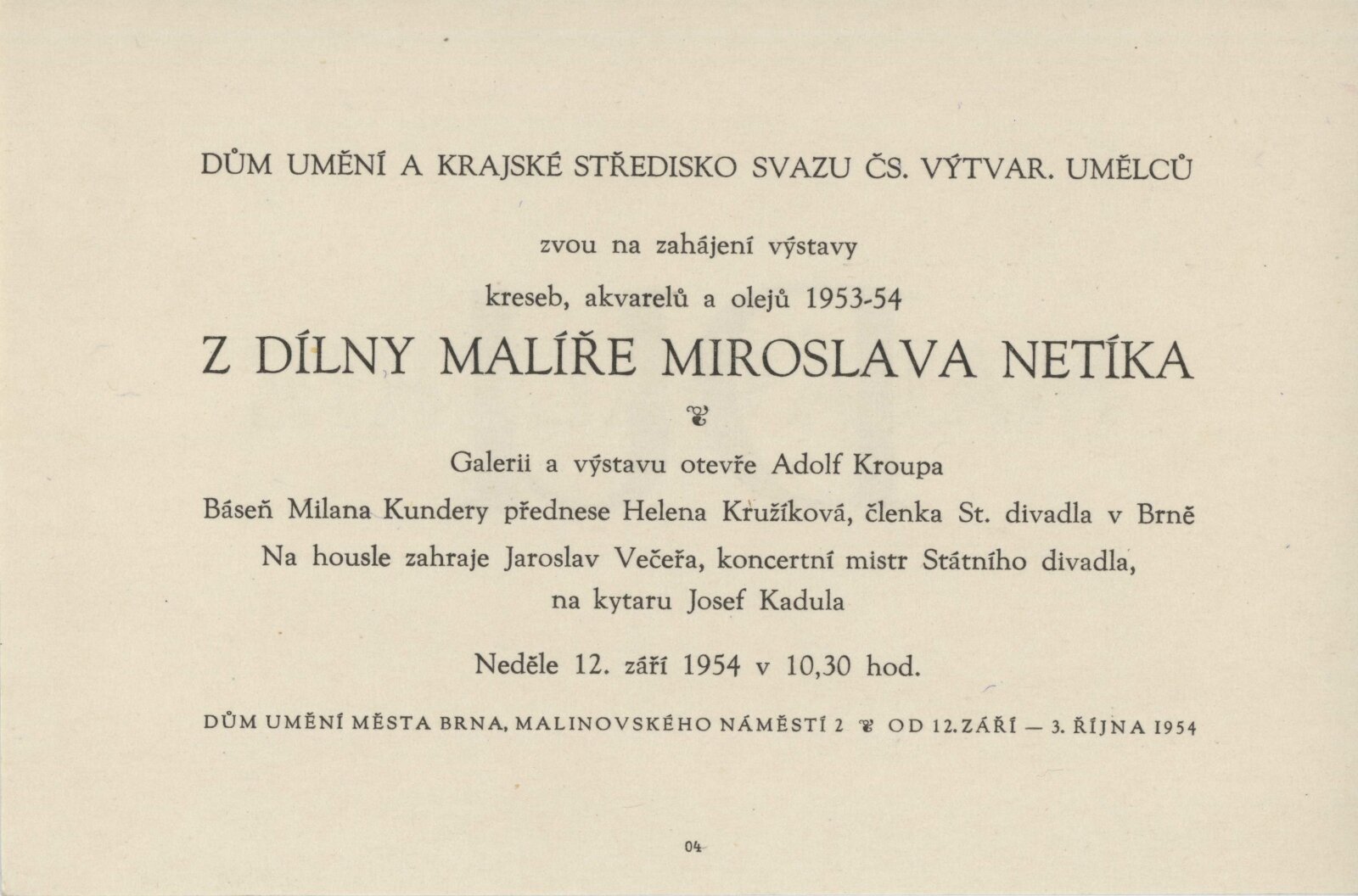 Z dílny malíře Miroslava Netíka: Dům umění, Malá galerie, 12. 9. – 10. 10. 1954 / Text: Ludvík Kundera. – Brno: Dům umění v Brně, 1954. – 4 s., obr., DU 204. – MG; MMB