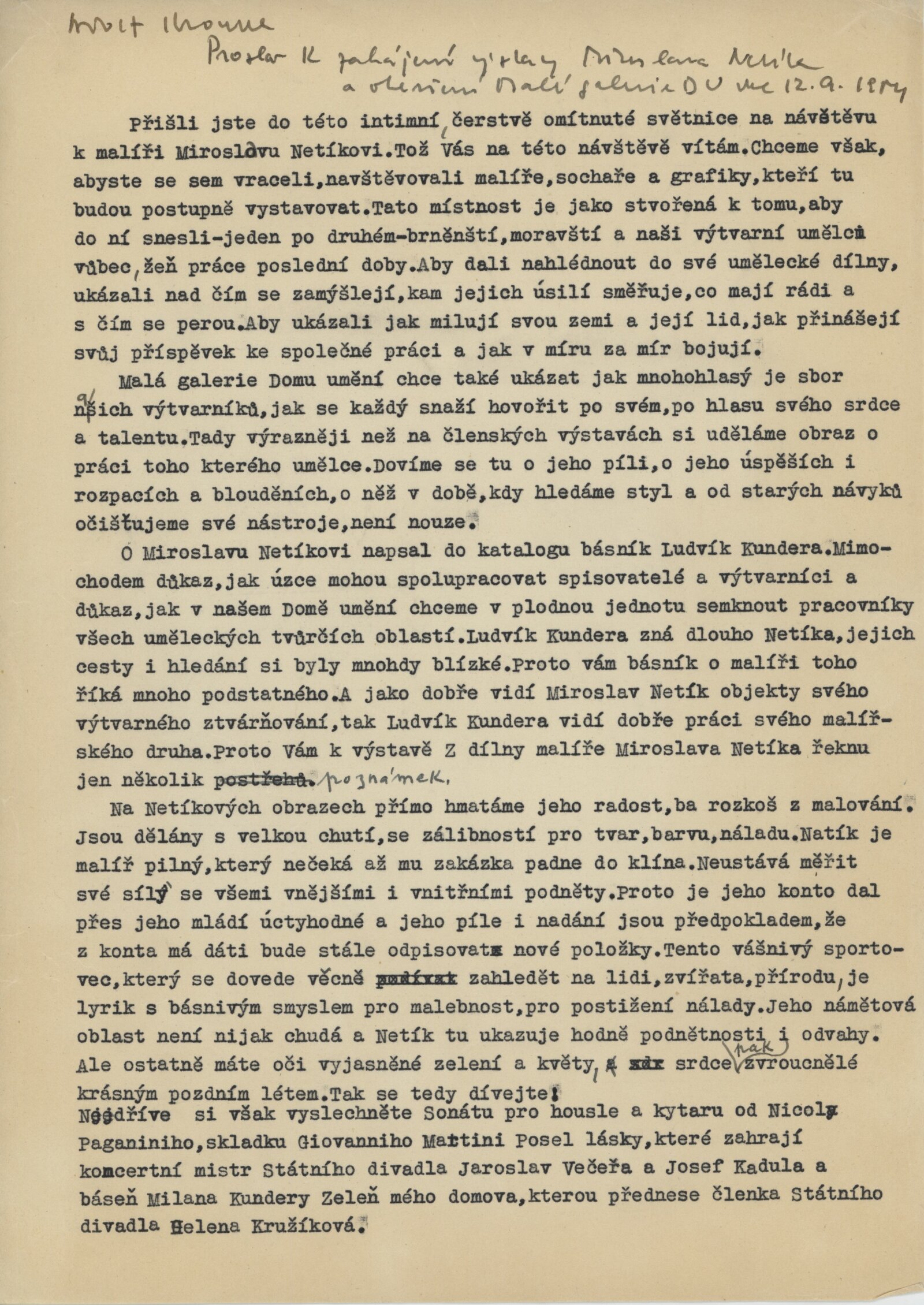 pozvánka, katalog, úvodní slovo (Adolf Kroupa), seznam vystavených děl, provozní korespondence (Miroslav Netík, Ludvík Kundera)
