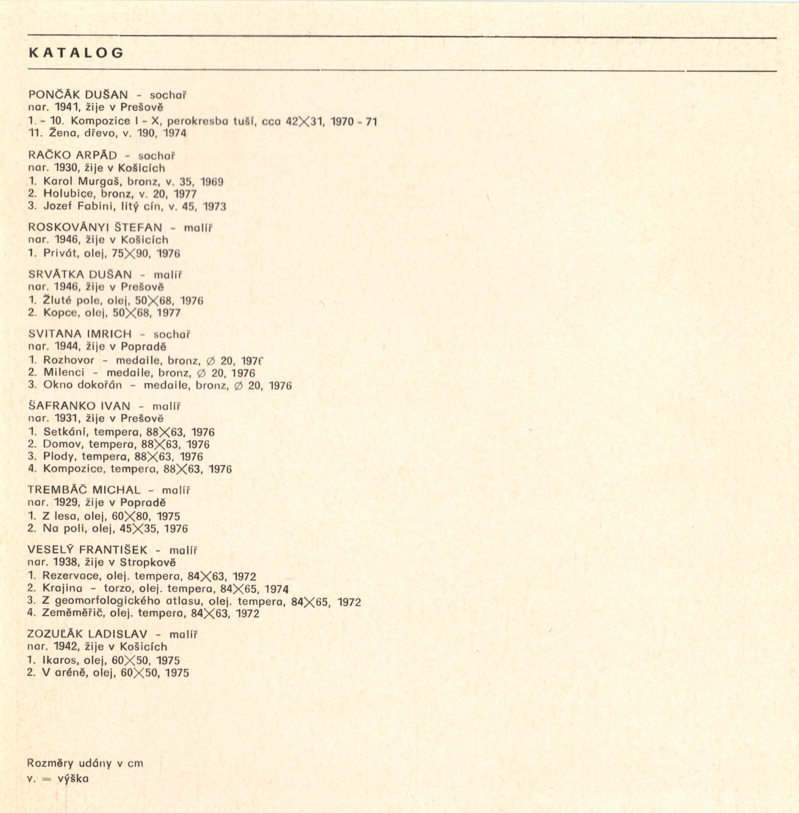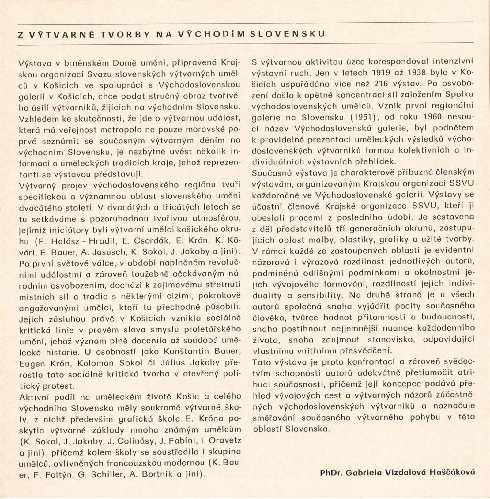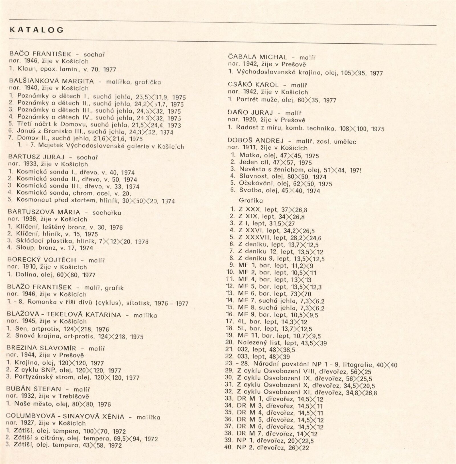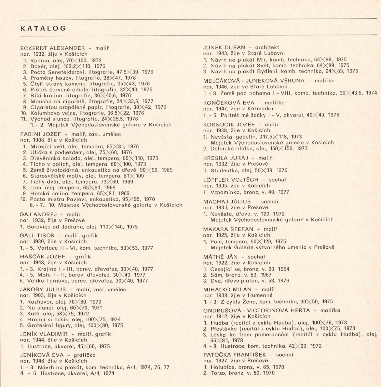 Z výtvarné tvorby na východním Slovensku. Plastika, malba, kresba, grafika: Dům umění města Brna, 2. 9. – 9. 10. 1977 / Text: Gabriela Vizdalová Haščáková. – Brno: DUmB, 1977. – 25 s., obr., DU 659. – MG
