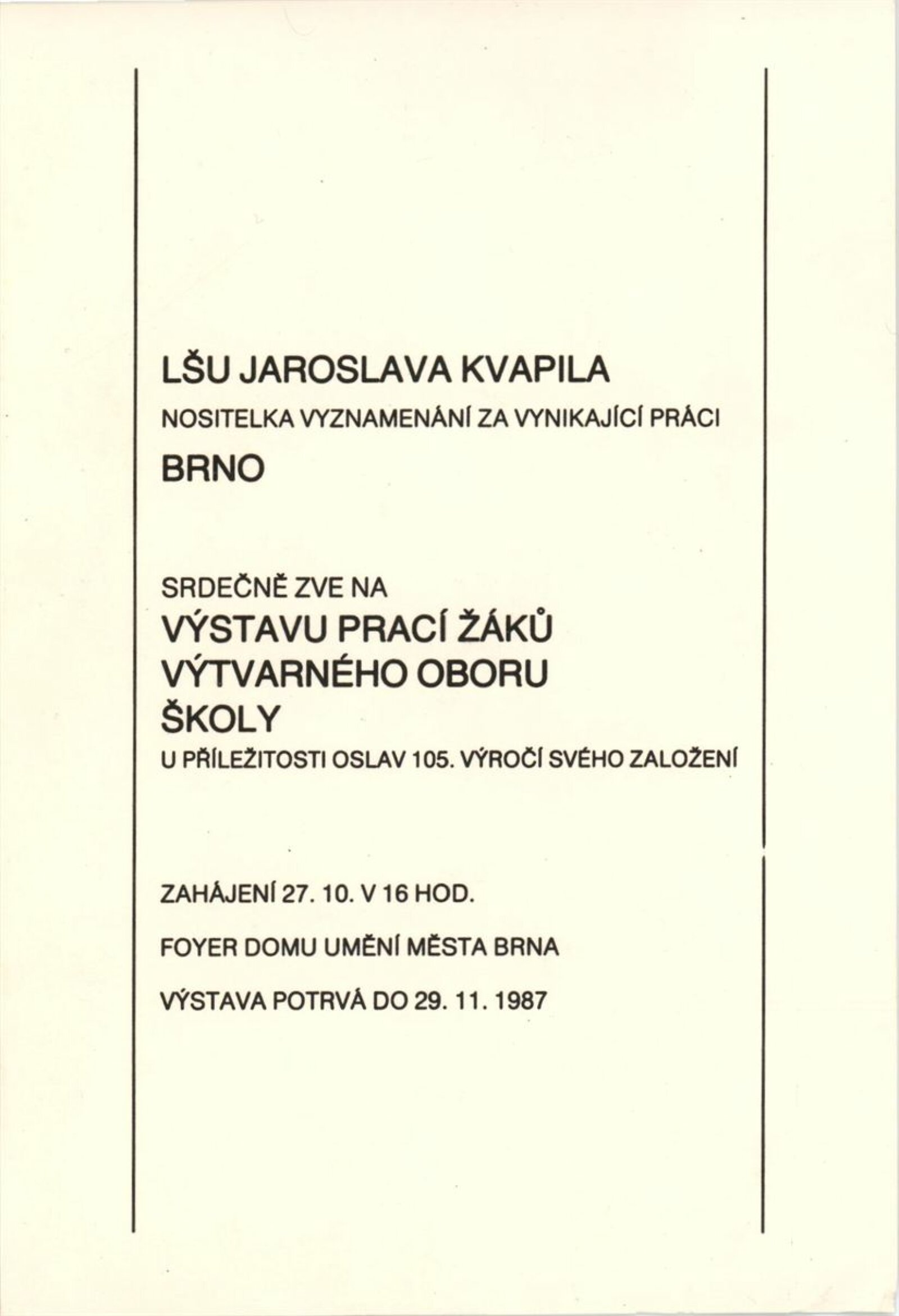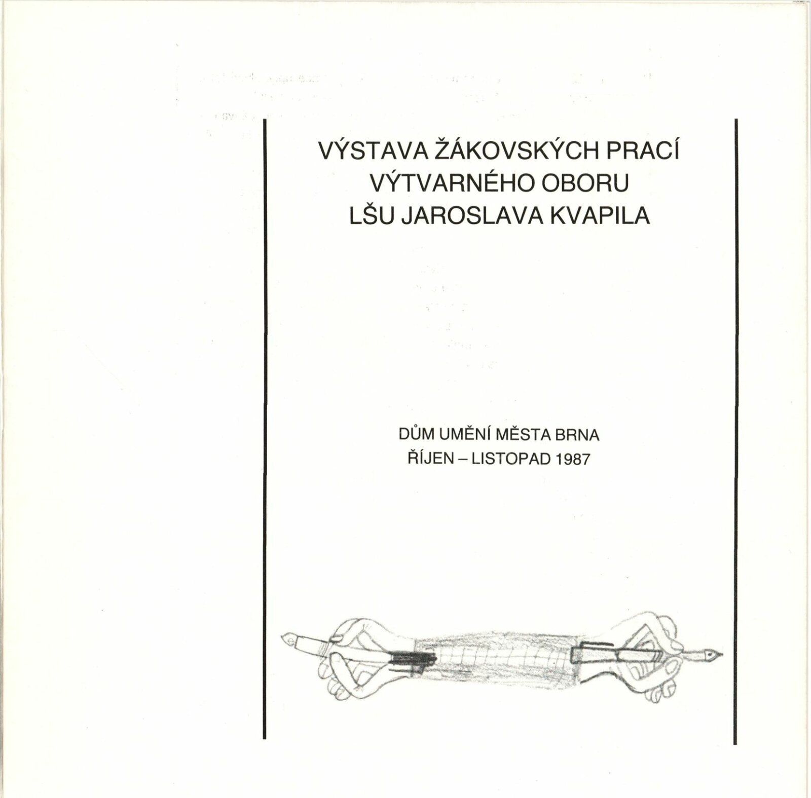 Výstava žákovských prací výtvarného odboru LŠU Jaroslava Kvapila: Dům umění města Brna, [hala], 27. 10. – 29. 11. 1987 / Text: anonymní. – Brno: Lidová škola umění Jaroslava Kvapila, 1987. – [12] s., obr., DU 842