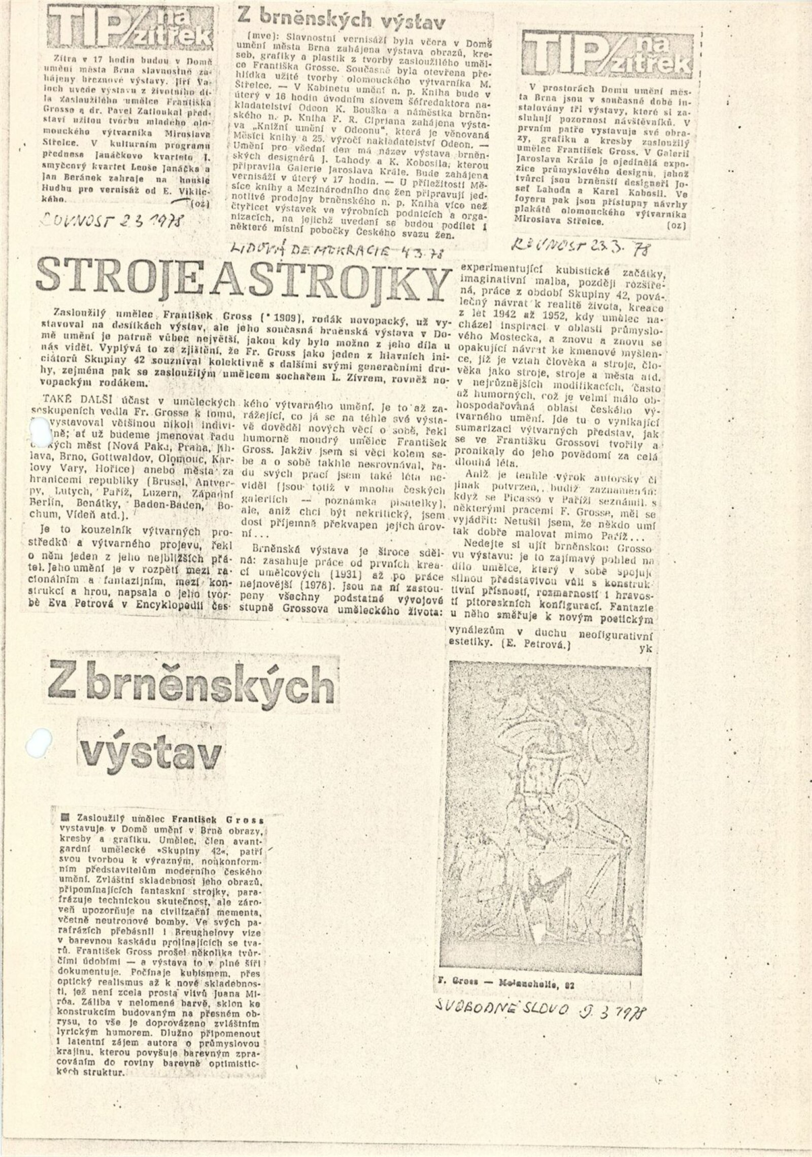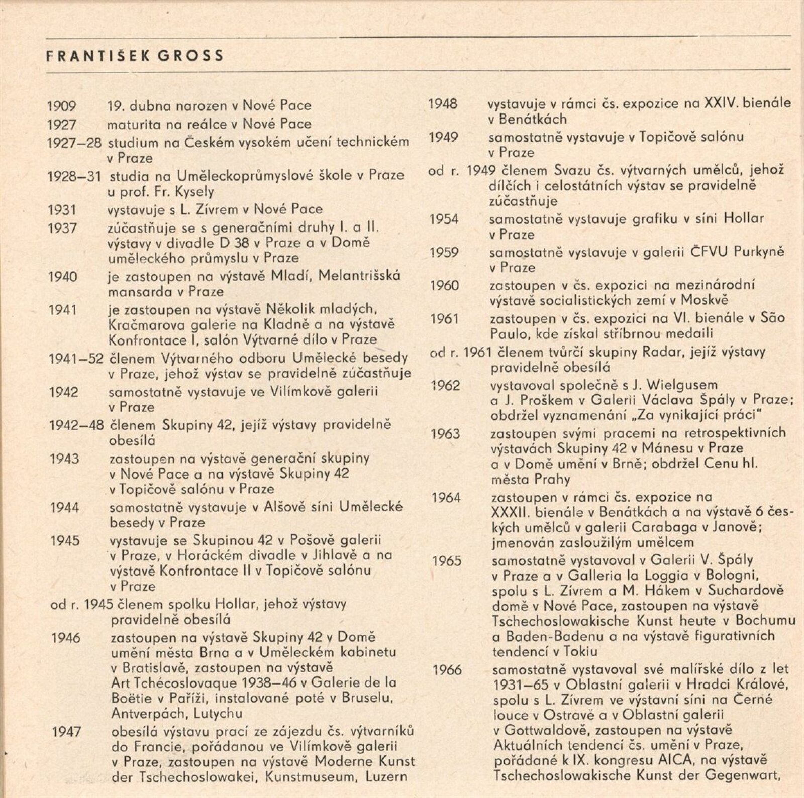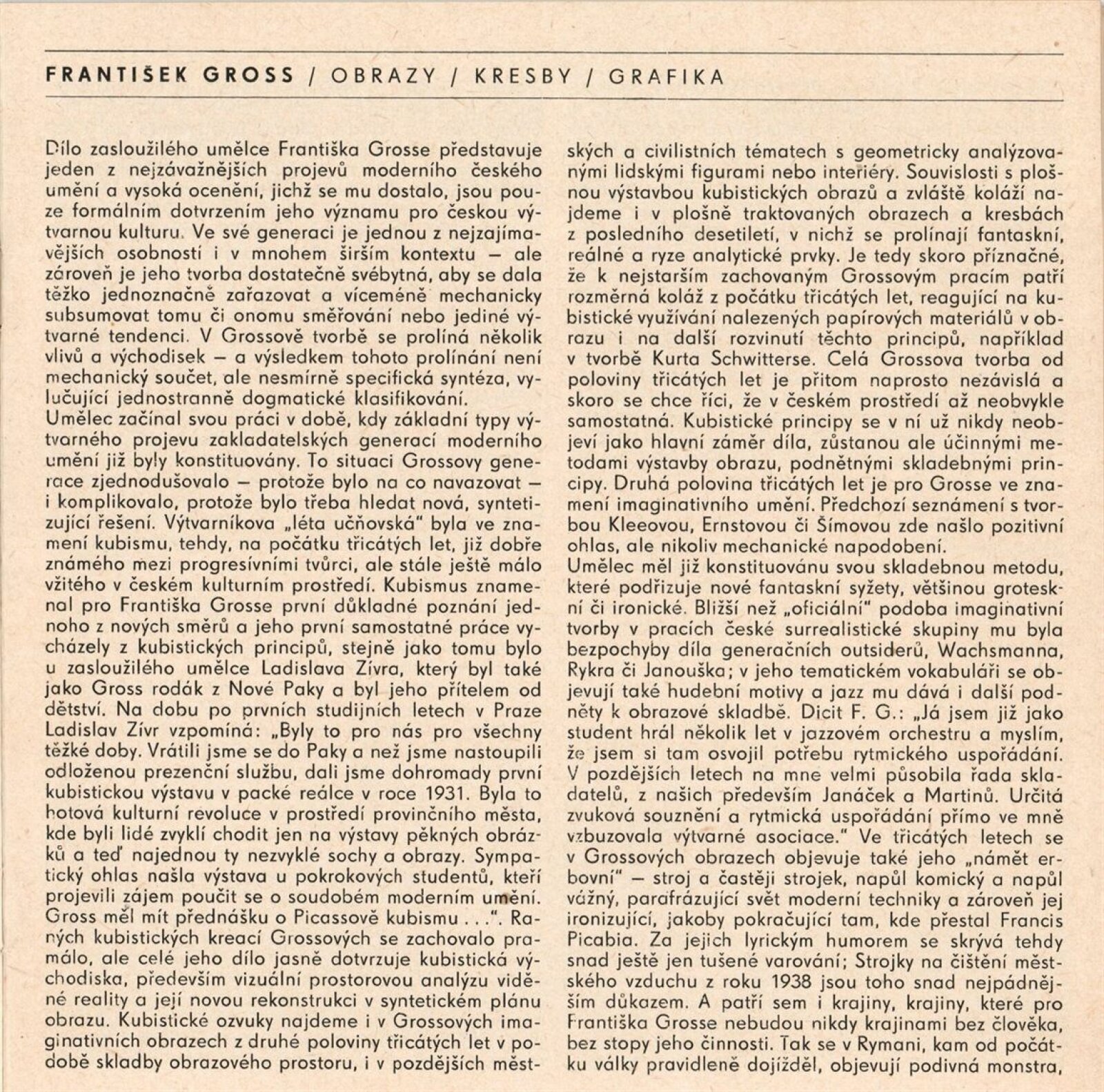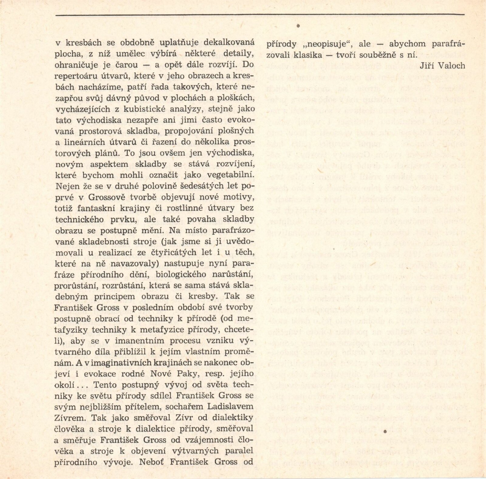 Zasloužilý umělec František Gross. Obrazy, kresby, grafika: Dům umění města Brna, 3. 3. – 9. 4. 1978 / Text: Jiří Valoch. – Brno: DUmB, 1978. – 32 s., obr., seznam exponátů 2 s., životopis DU 670; MZK