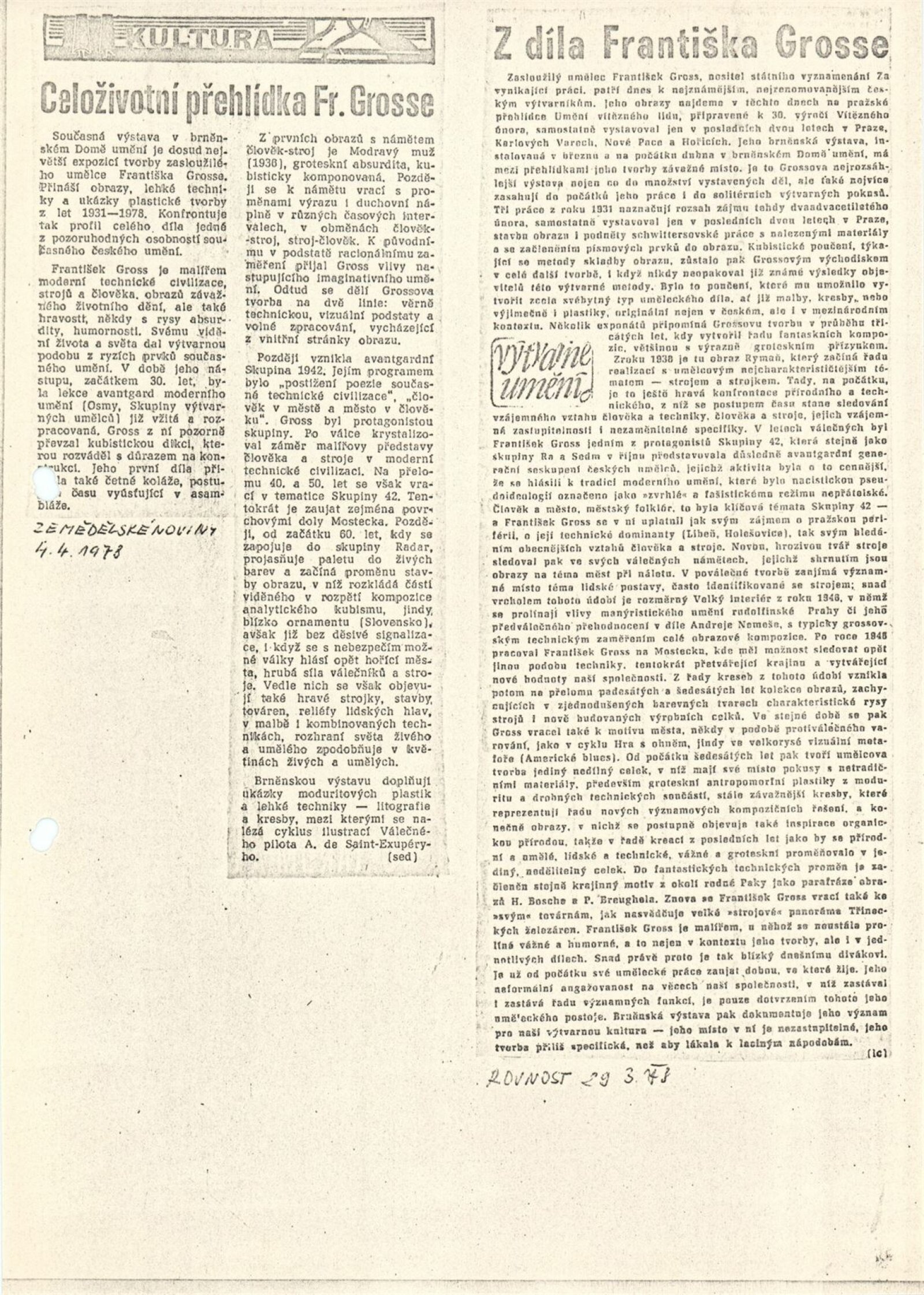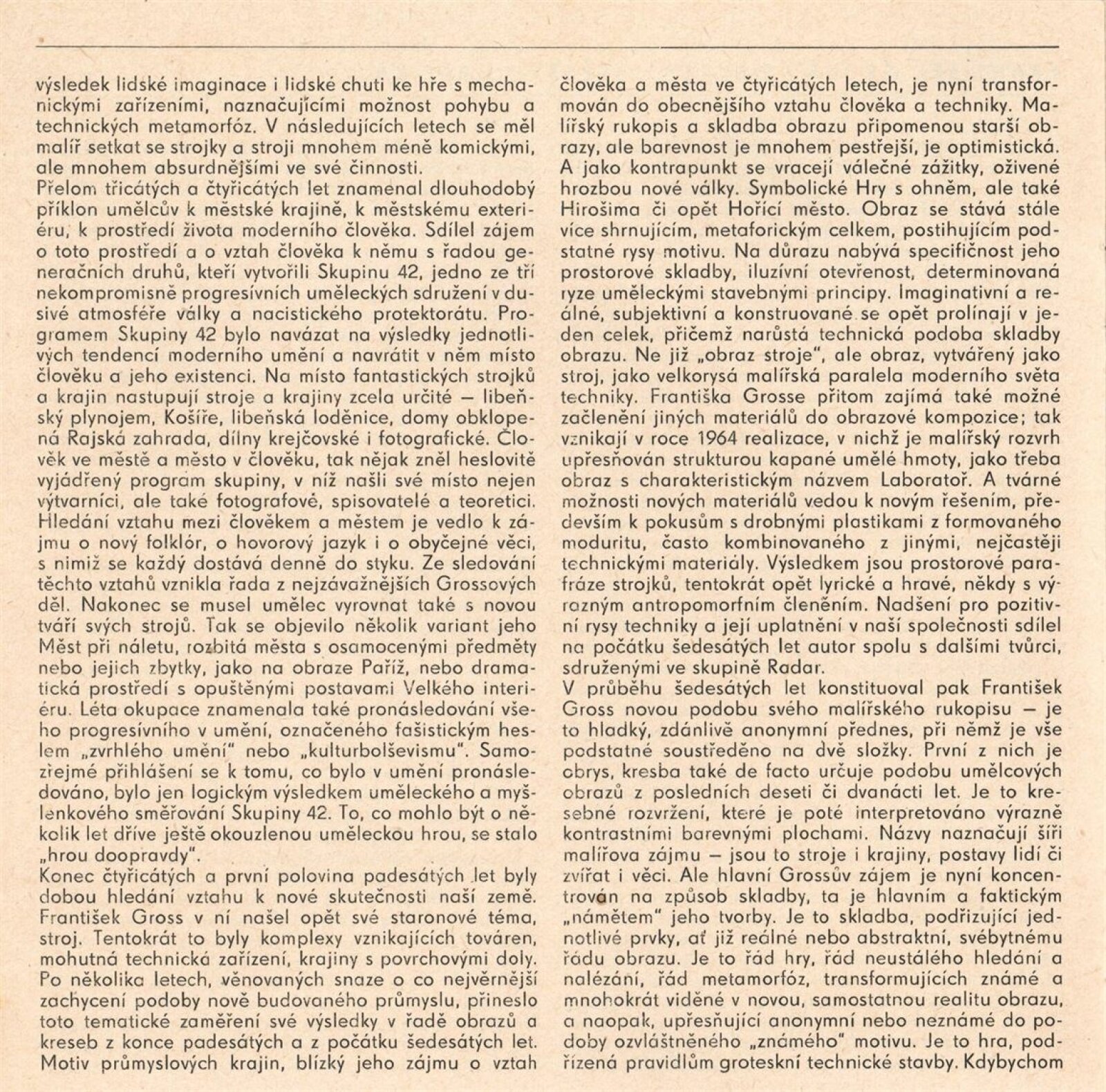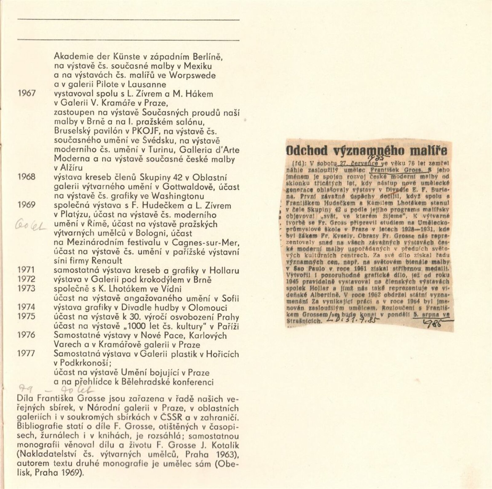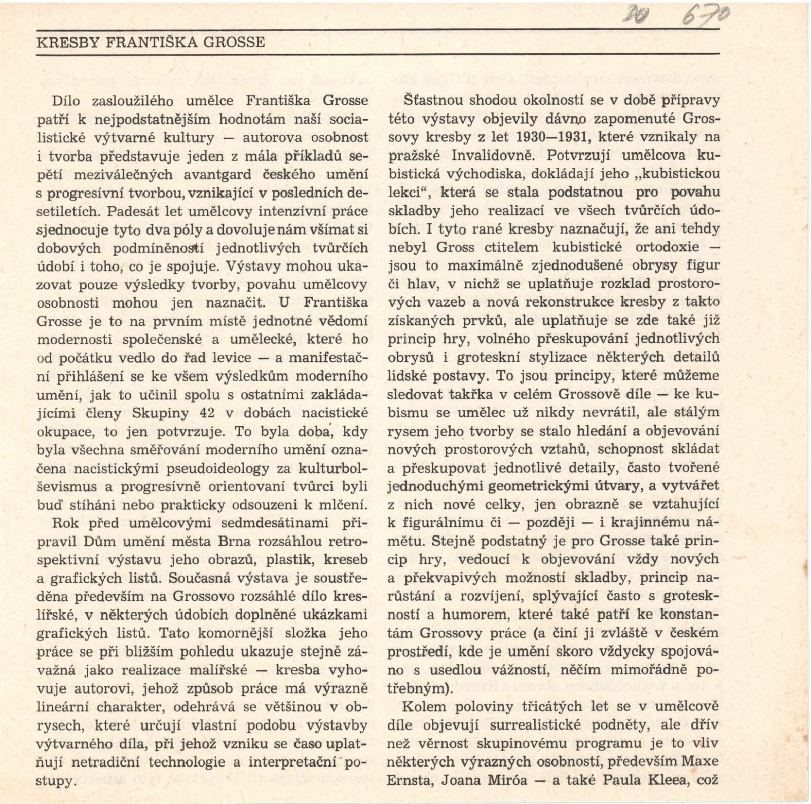 Zasloužilý umělec František Gross. Obrazy, kresby, grafika: Dům umění města Brna, 3. 3. – 9. 4. 1978 / Text: Jiří Valoch. – Brno: DUmB, 1978. – 32 s., obr., seznam exponátů 2 s., životopis DU 670; MZK