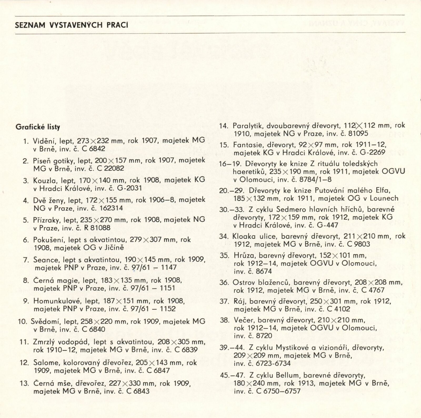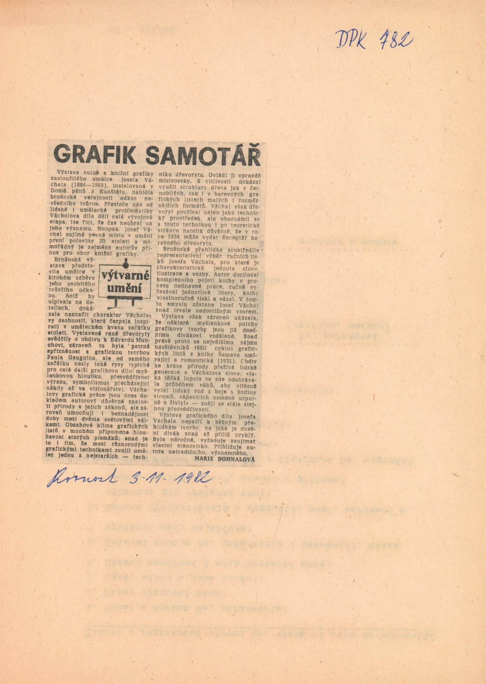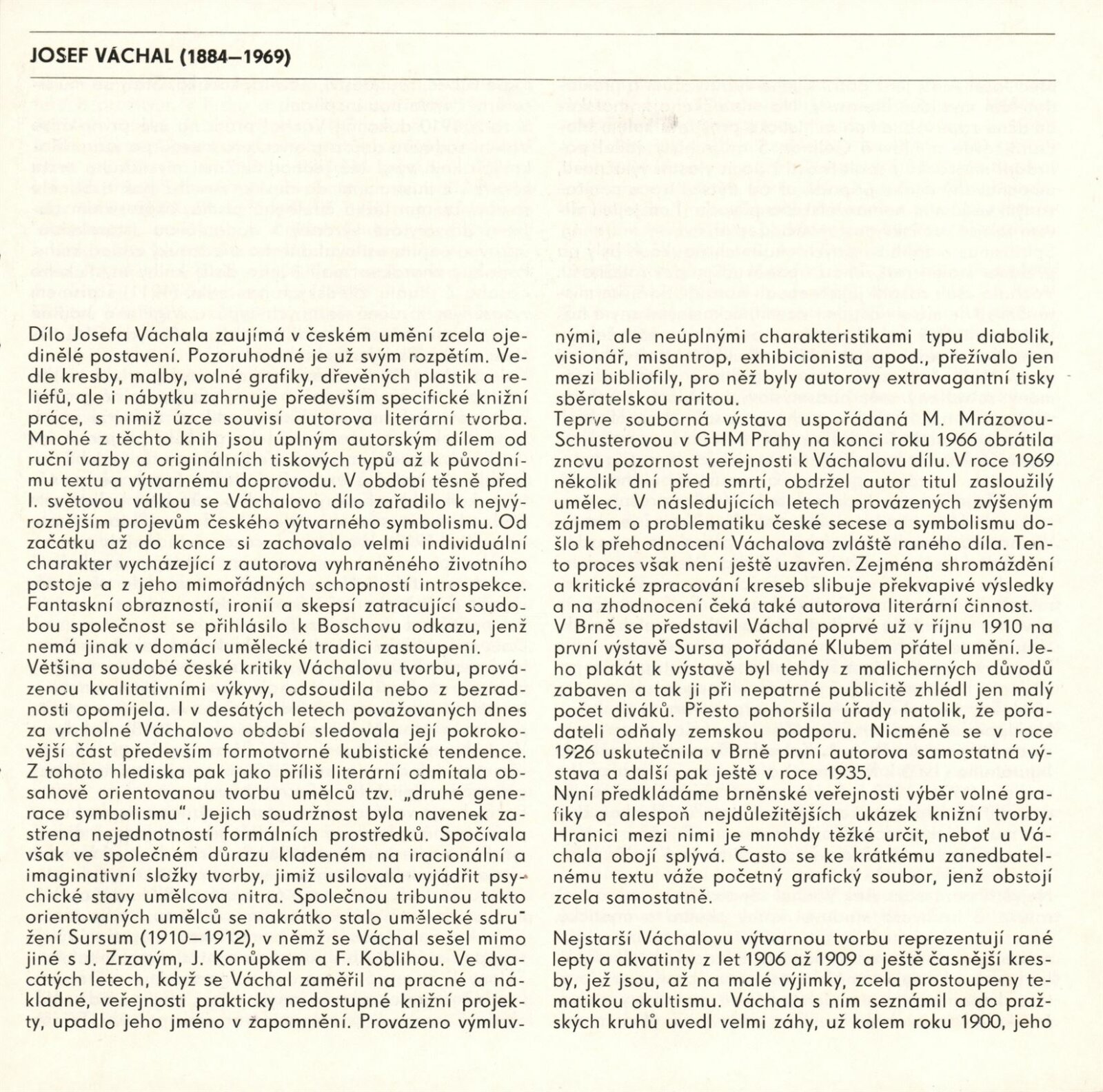 Zasloužilý umělec Josef Váchal. Volná a knižní grafika: Dům umění / Dům pánů z Kunštátu, Kabinet grafiky, 5. 10. – 7. 11. 1982 / Text: Michal Gregor. – Brno: DUmB, 1982. – 20 s., obr., životní data, výstavy, ceny a uznání, DPK 782. – MZK; MG; MMB