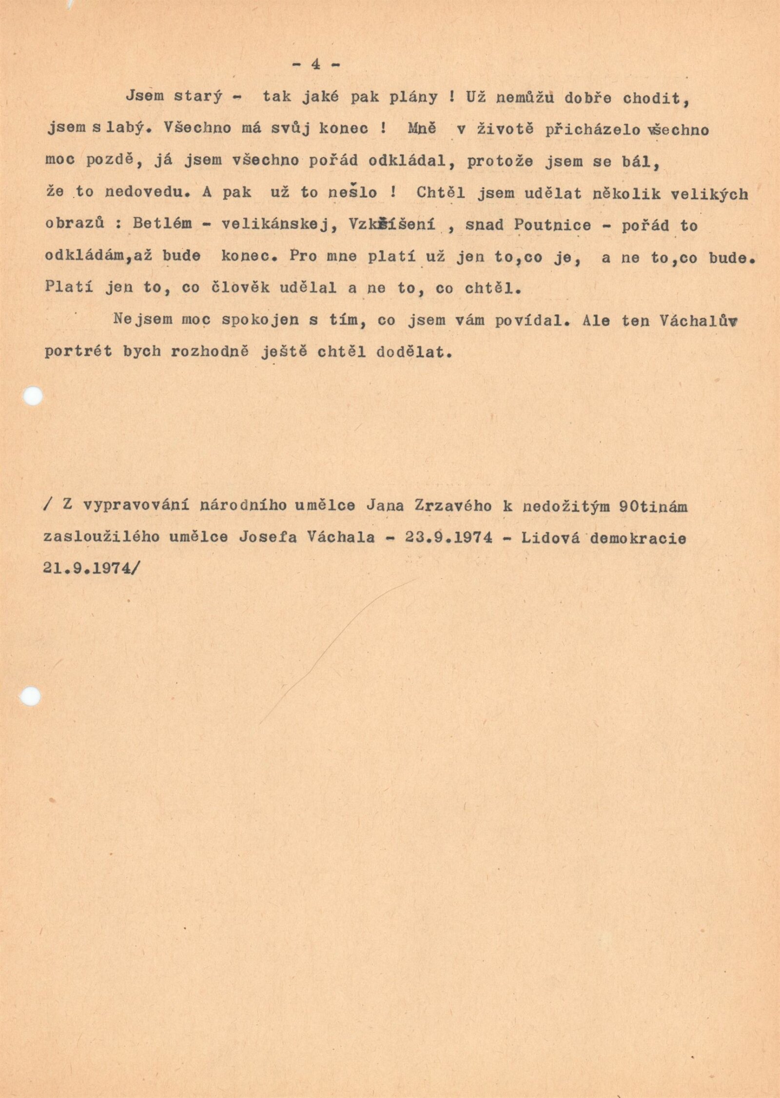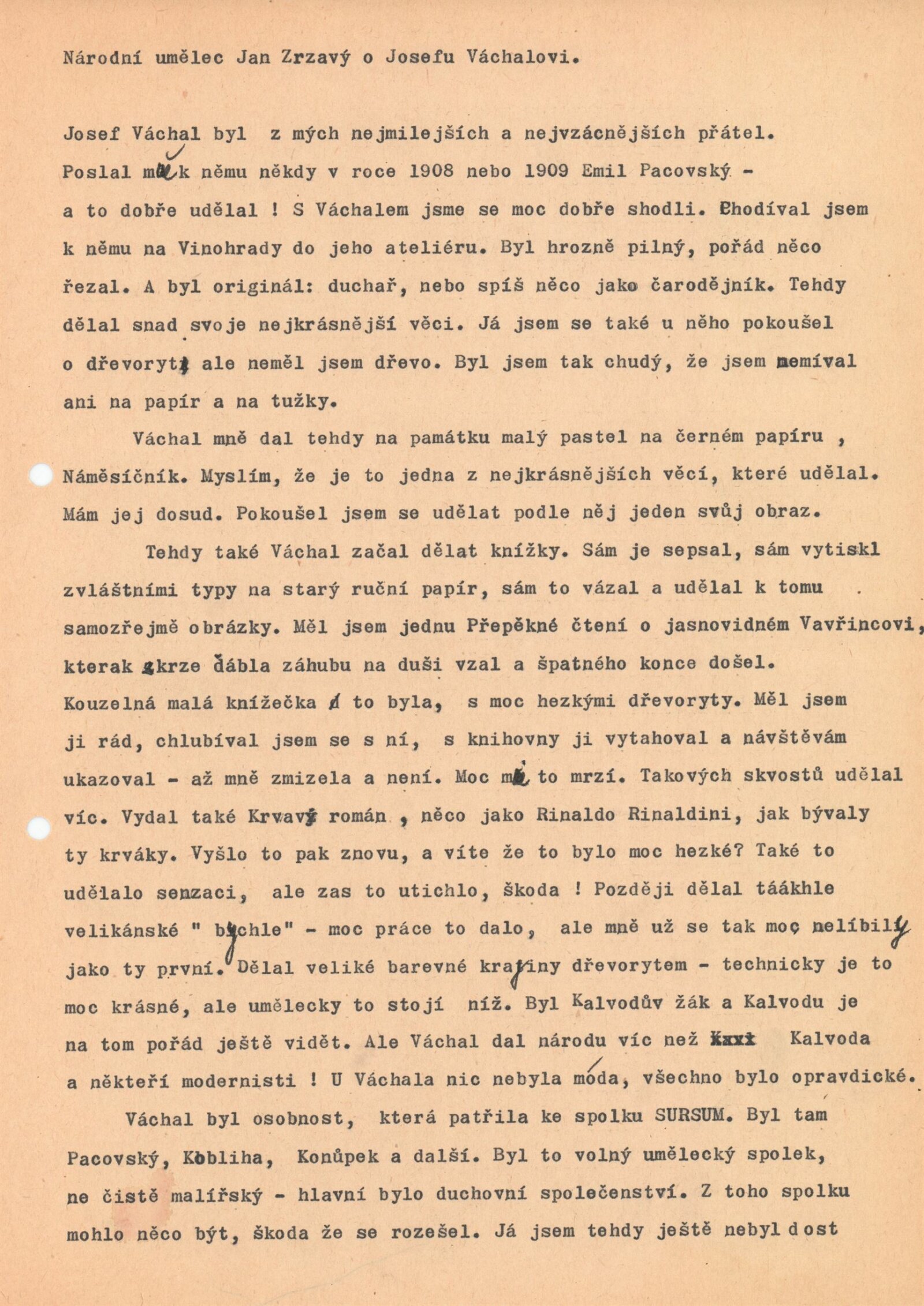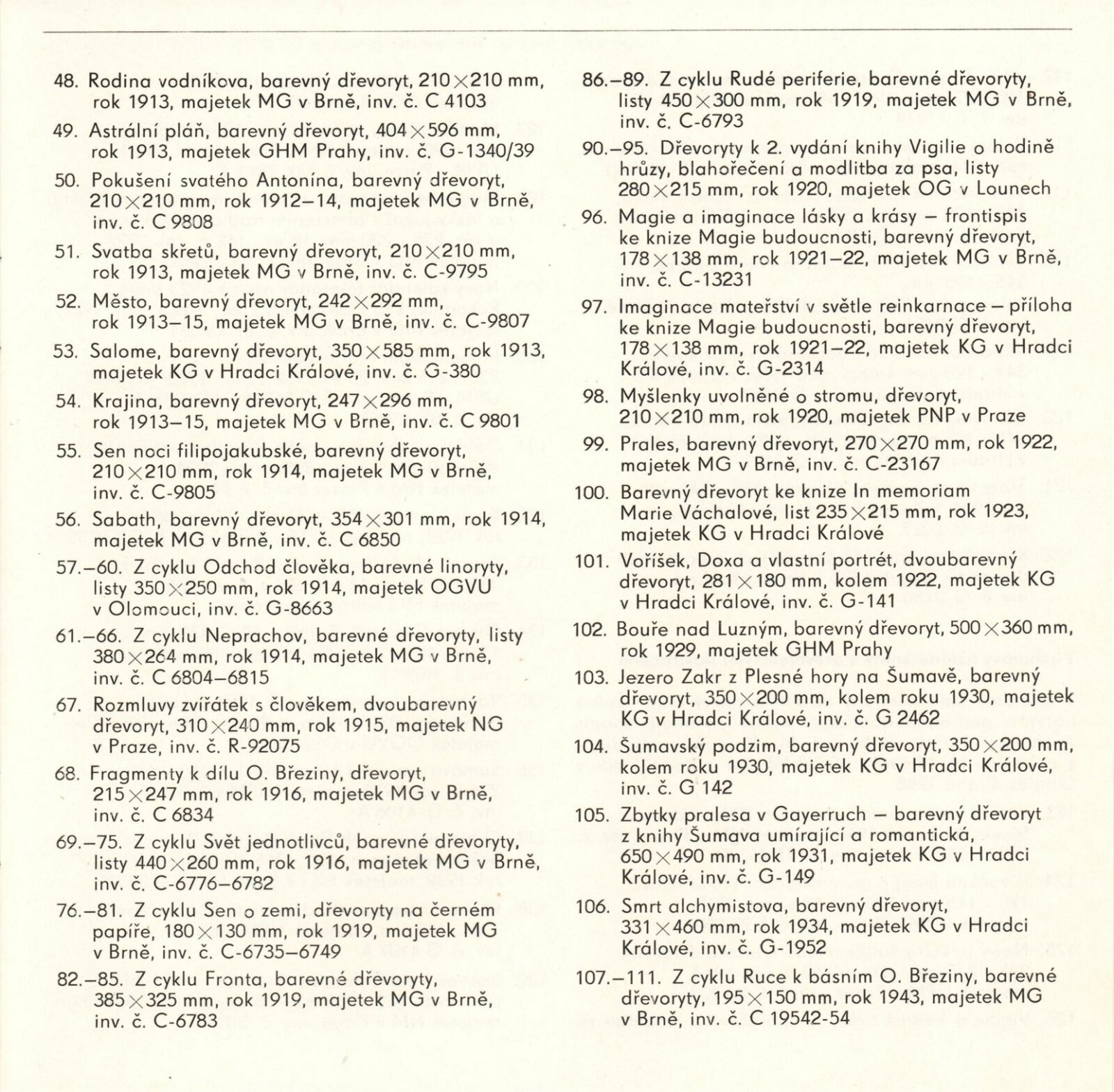pozvánka, katalog, strojopis katalogu, soupis vystavovaných děl, text – z vypravování Jana Zrzavého (Lidová demokracie 1974), souhrnný pojistný seznam děl pro výstavu, korespondence o pojištění vystavených děl mezi jednotlivými institucemi, provozní korespondence, dohody o zapůjčení, navrácení, reversy (MG v Brně, KG v Hradci Králové, OG v Jičíně, Praha aj.), žádost o povolení výstavy, výtky k textu katalogu z OK NVmB a odpověď DU, dohody o pořádání výstavy, recenze v tisku, parte Josefa Váchala