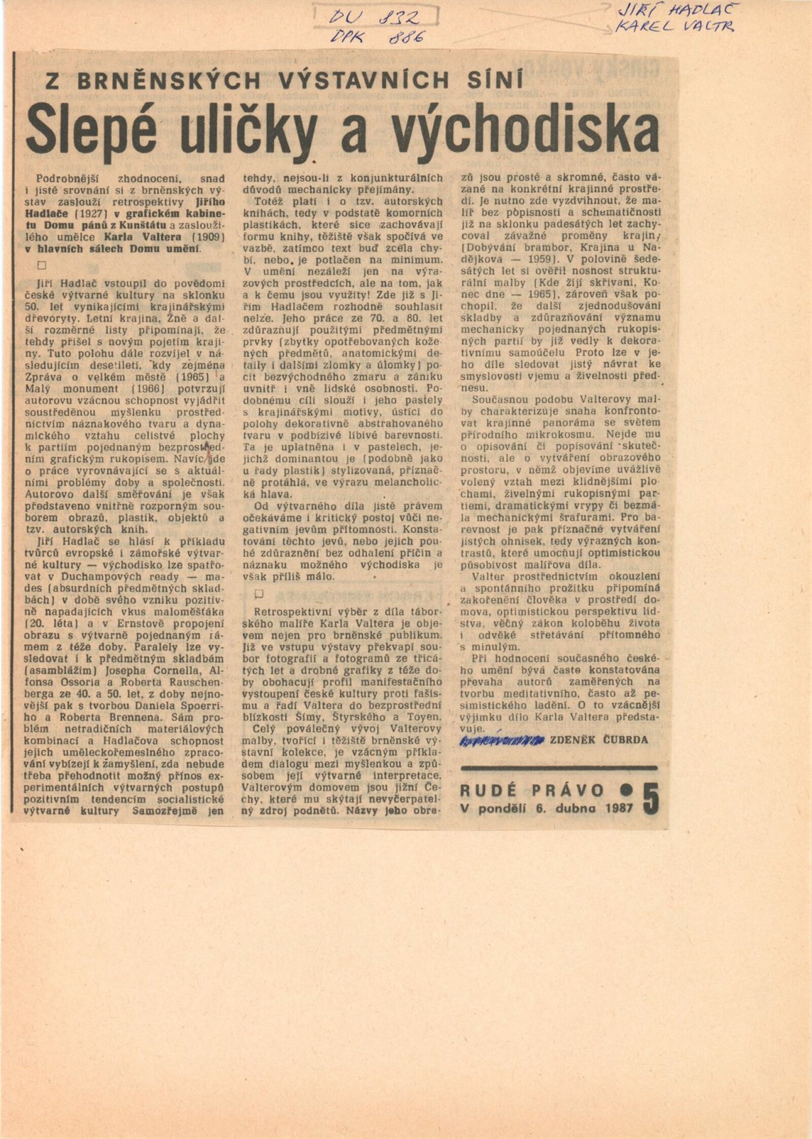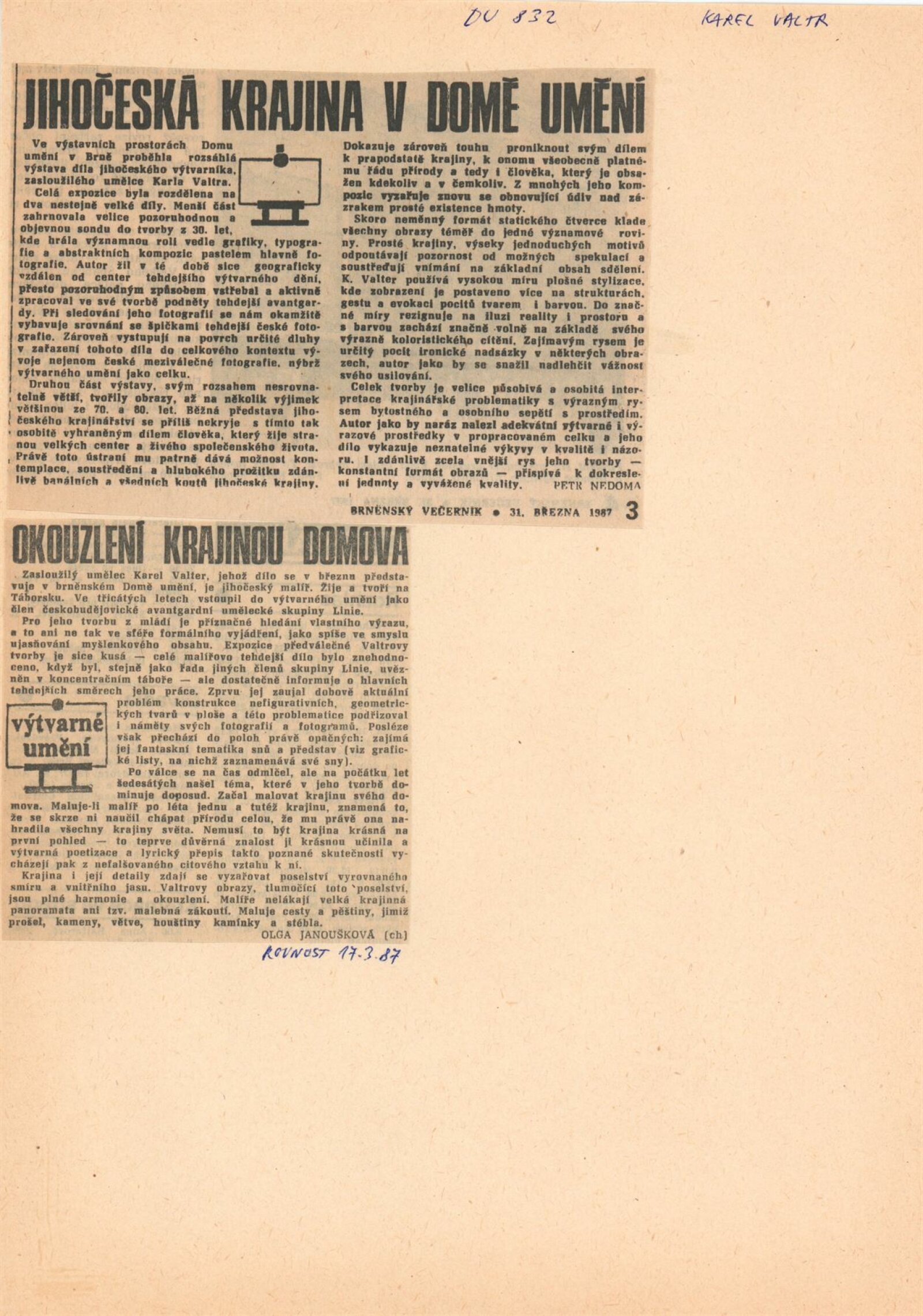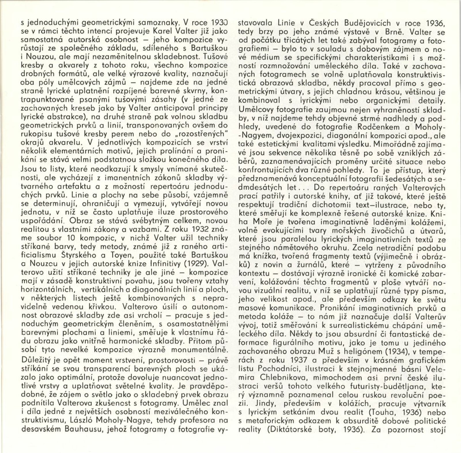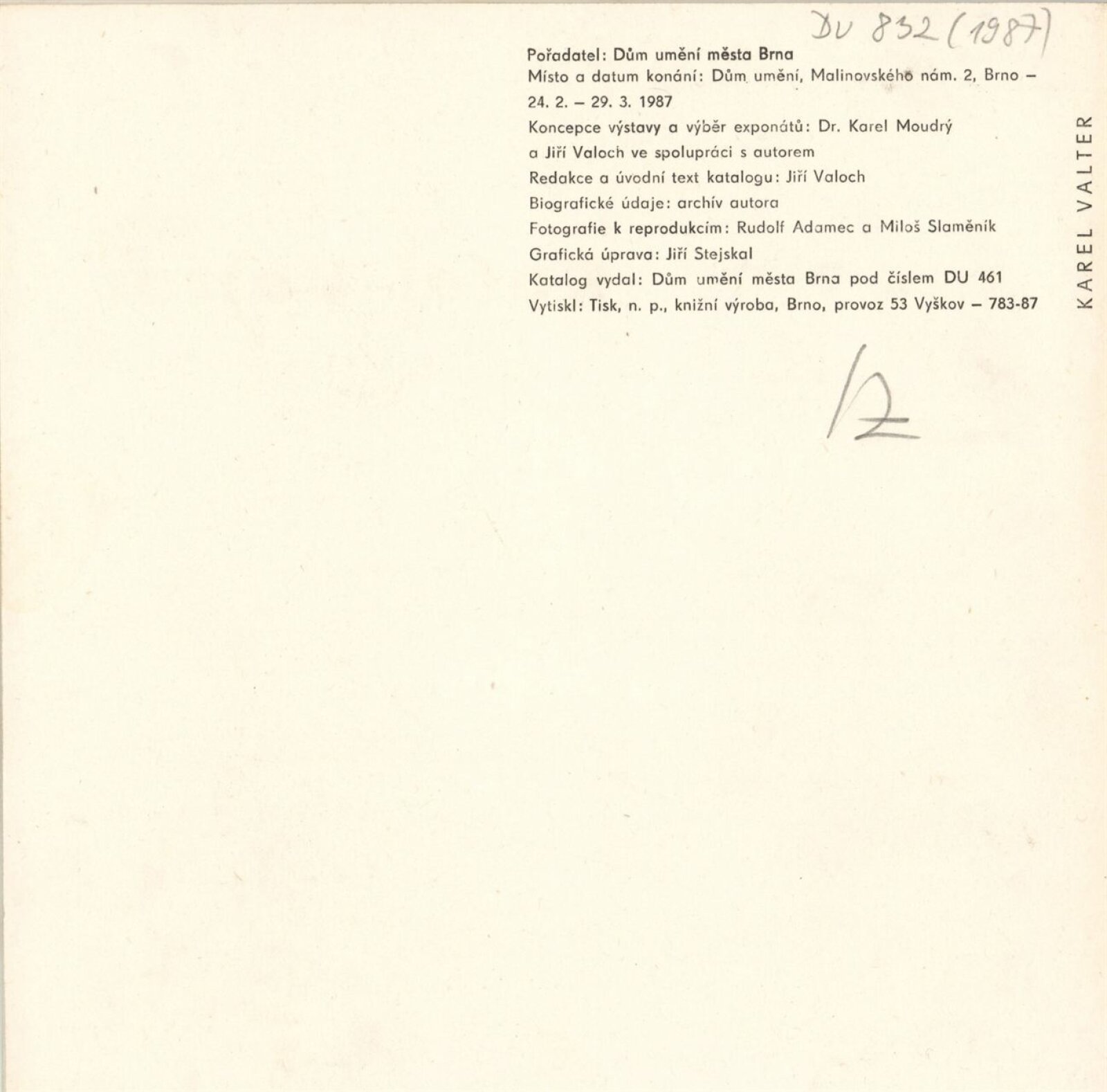 Zasloužilý umělec Karel Valter. Obrazy, kresby, fotografie, grafika: Dům umění města Brna, 24. 2. – 29. 3. 1987 / Text: Jiří Valoch. – Brno: DUmB, 1987. – [32] s., obr., seznam vystavených prací [3] s., životní data, výstavy, zastoupení ve sbírkách, ceny, DU 832. – MZK; MG