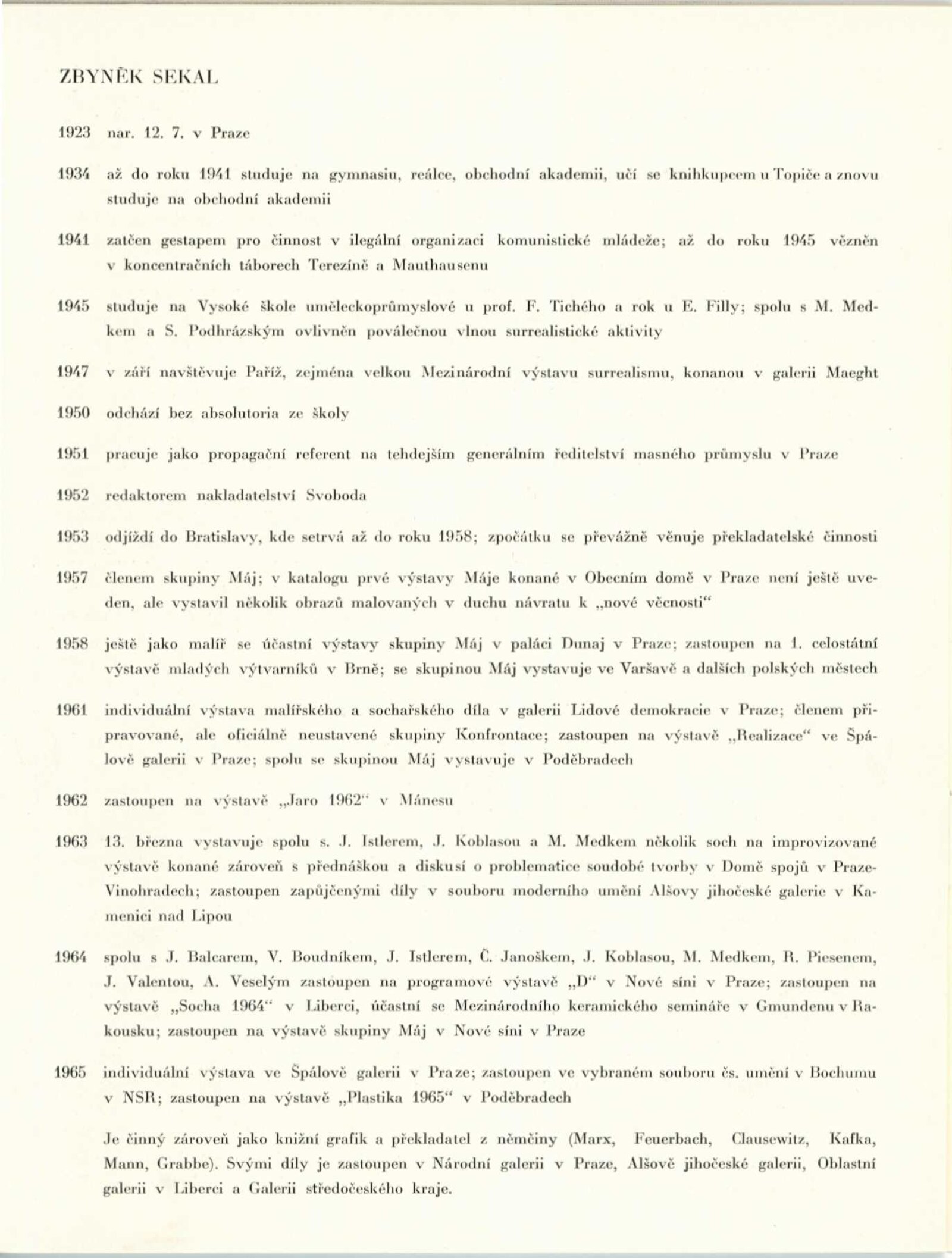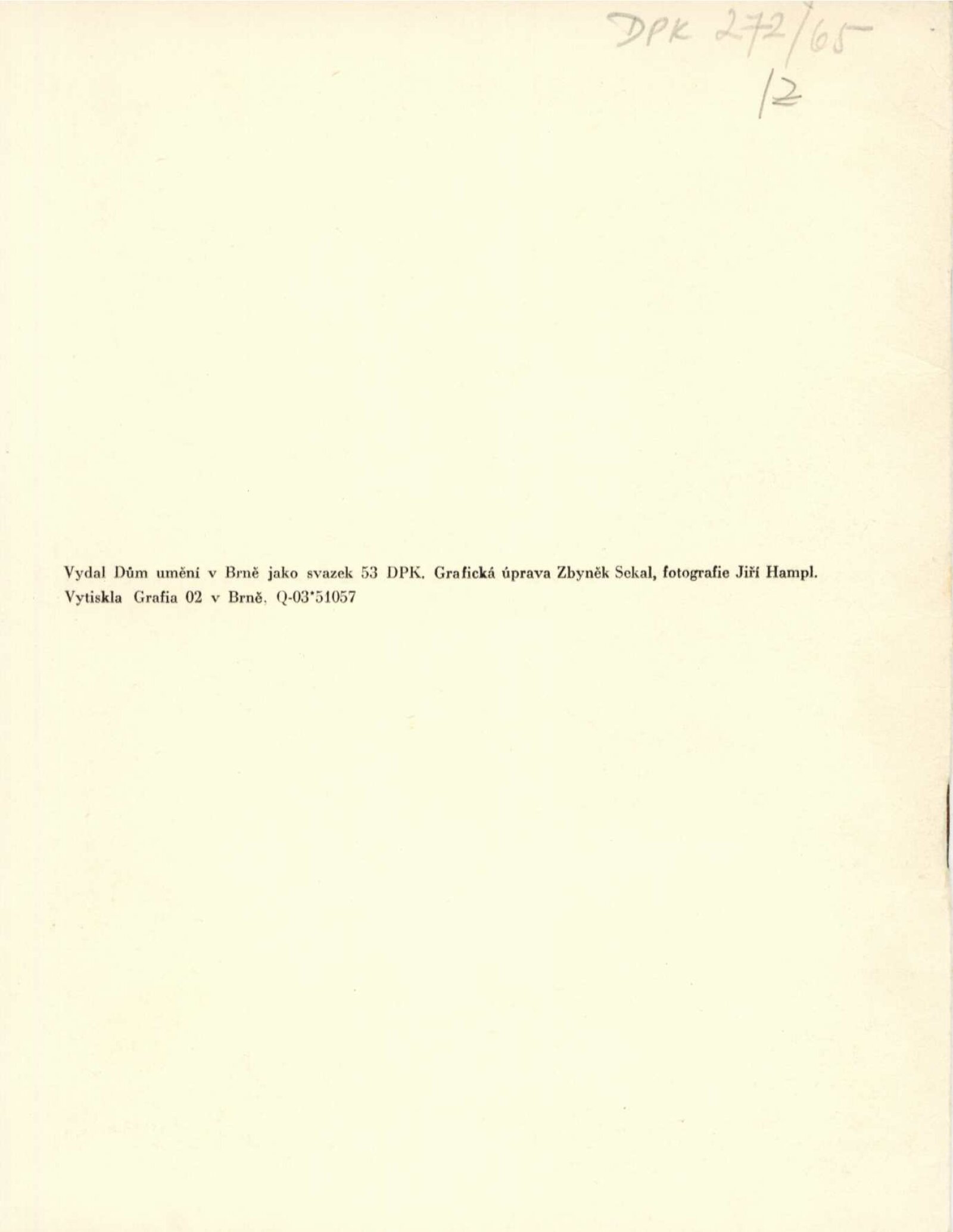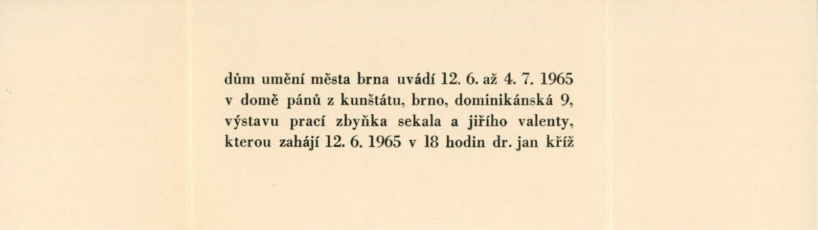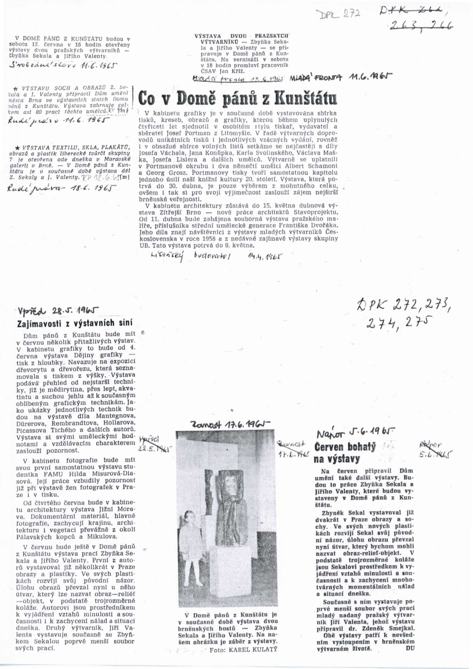 Zbyněk Sekal. Sochy, reliéfy 1948–1965: Dům umění města Brna / Dům pánů z Kunštátu, 12. 6. – 4. 7. 1965 / Text: Jan Kříž. – Brno: DUmB, 1965. – 28 s., obr., životní data, DPK 272. – MZK; MG; MMB Jiří Valenta. Obrazy z let 1959–1965: Dům umění města Brna / Dům pánů z Kunštátu, 12. 6. – 4. 7. 1965 / Text: František Šmejkal. – Brno: DUmB, 1965. – 12 s., obr., DPK 272. – MZK; MG