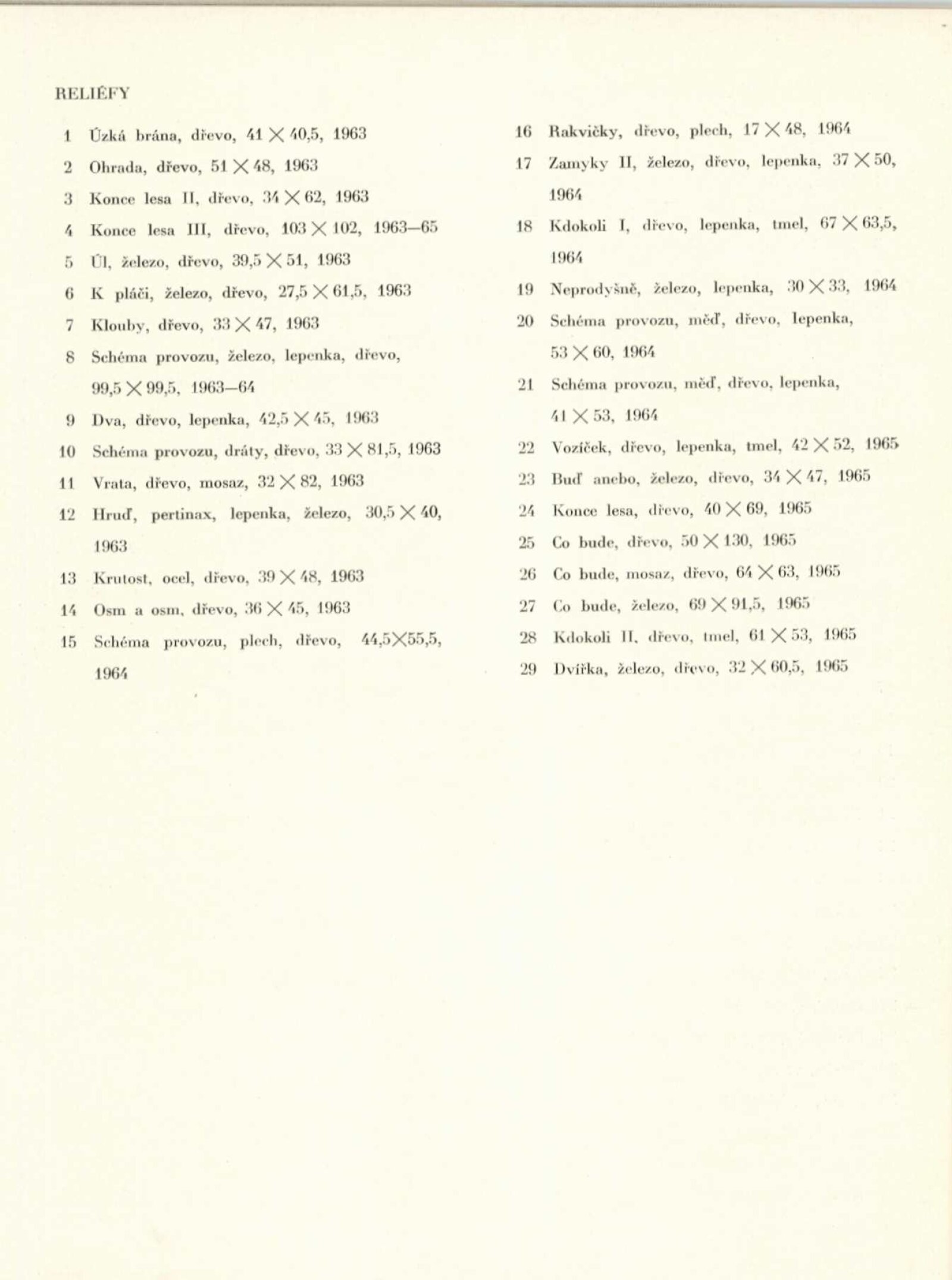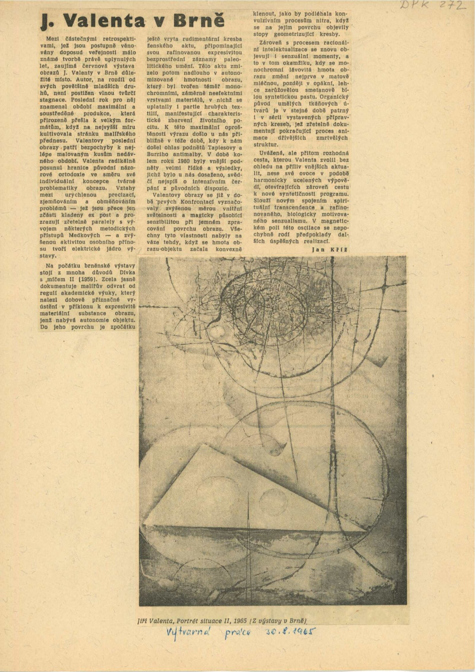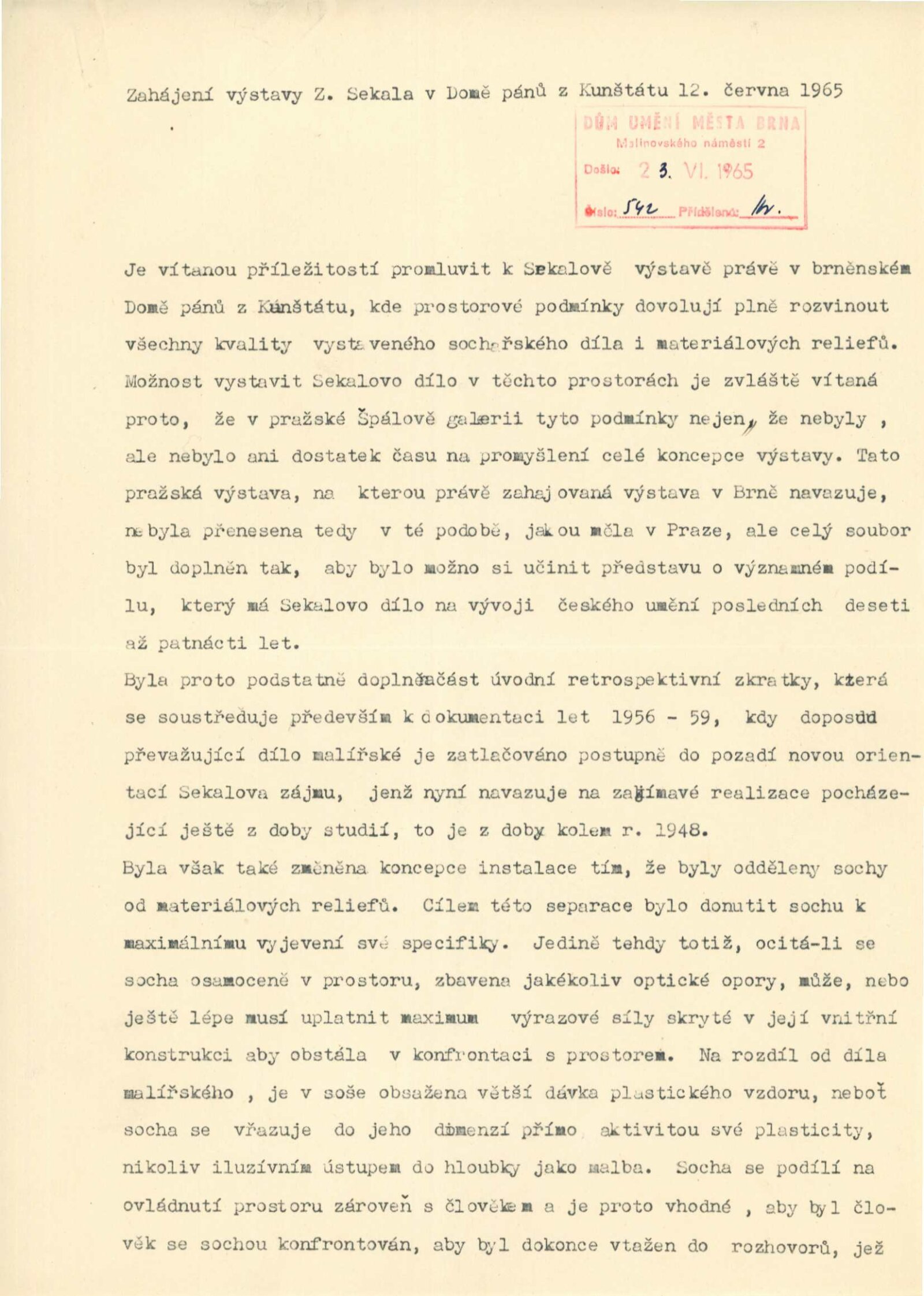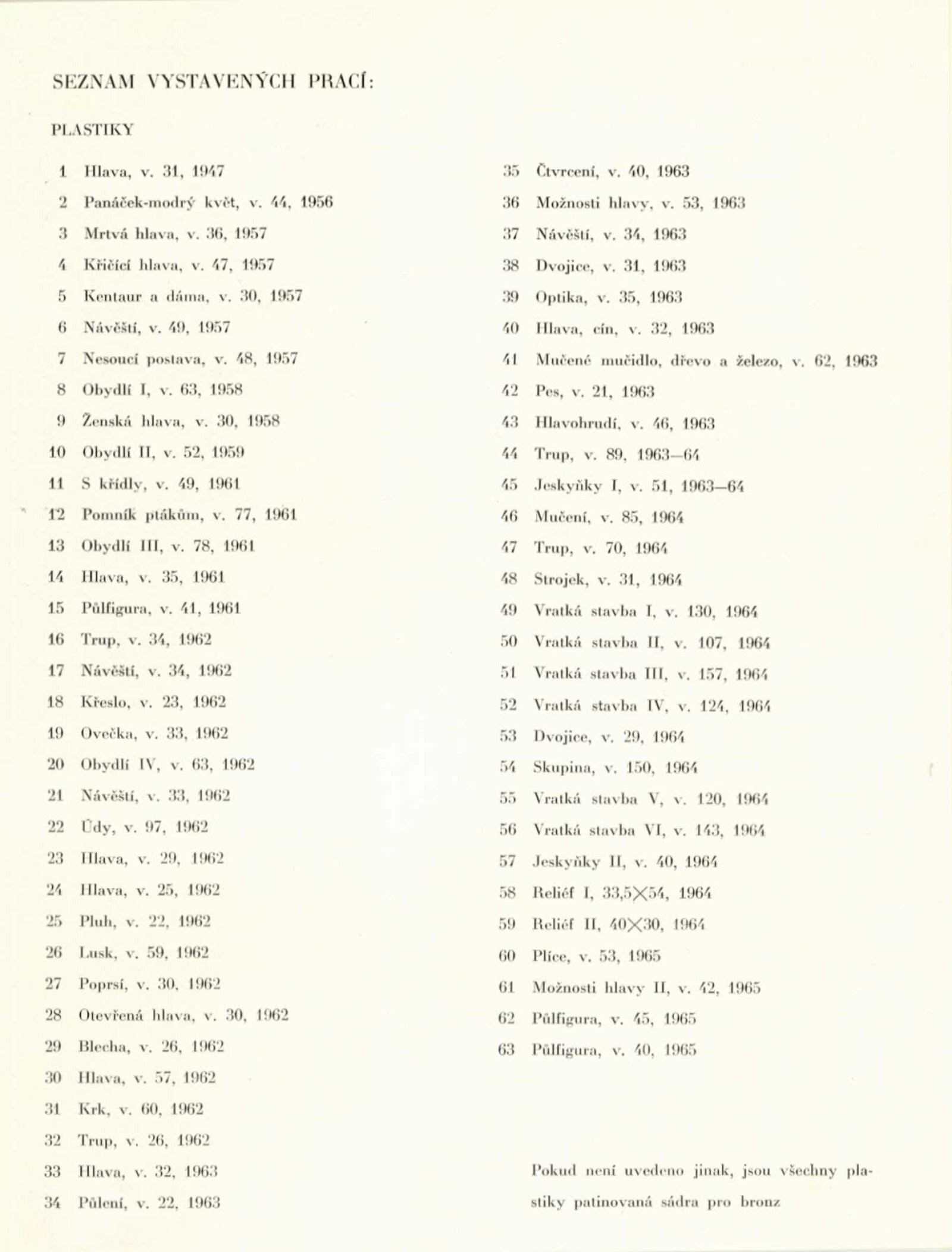 Zbyněk Sekal. Sochy, reliéfy 1948–1965: Dům umění města Brna / Dům pánů z Kunštátu, 12. 6. – 4. 7. 1965 / Text: Jan Kříž. – Brno: DUmB, 1965. – 28 s., obr., životní data, DPK 272. – MZK; MG; MMB Jiří Valenta. Obrazy z let 1959–1965: Dům umění města Brna / Dům pánů z Kunštátu, 12. 6. – 4. 7. 1965 / Text: František Šmejkal. – Brno: DUmB, 1965. – 12 s., obr., DPK 272. – MZK; MG