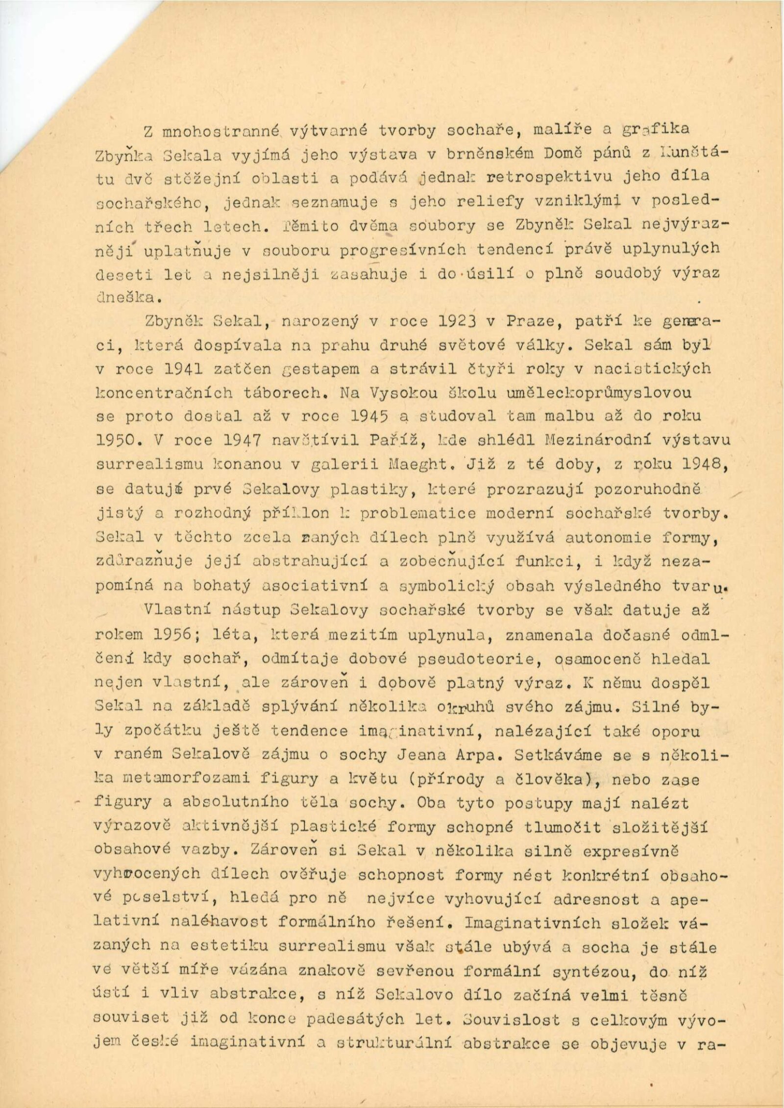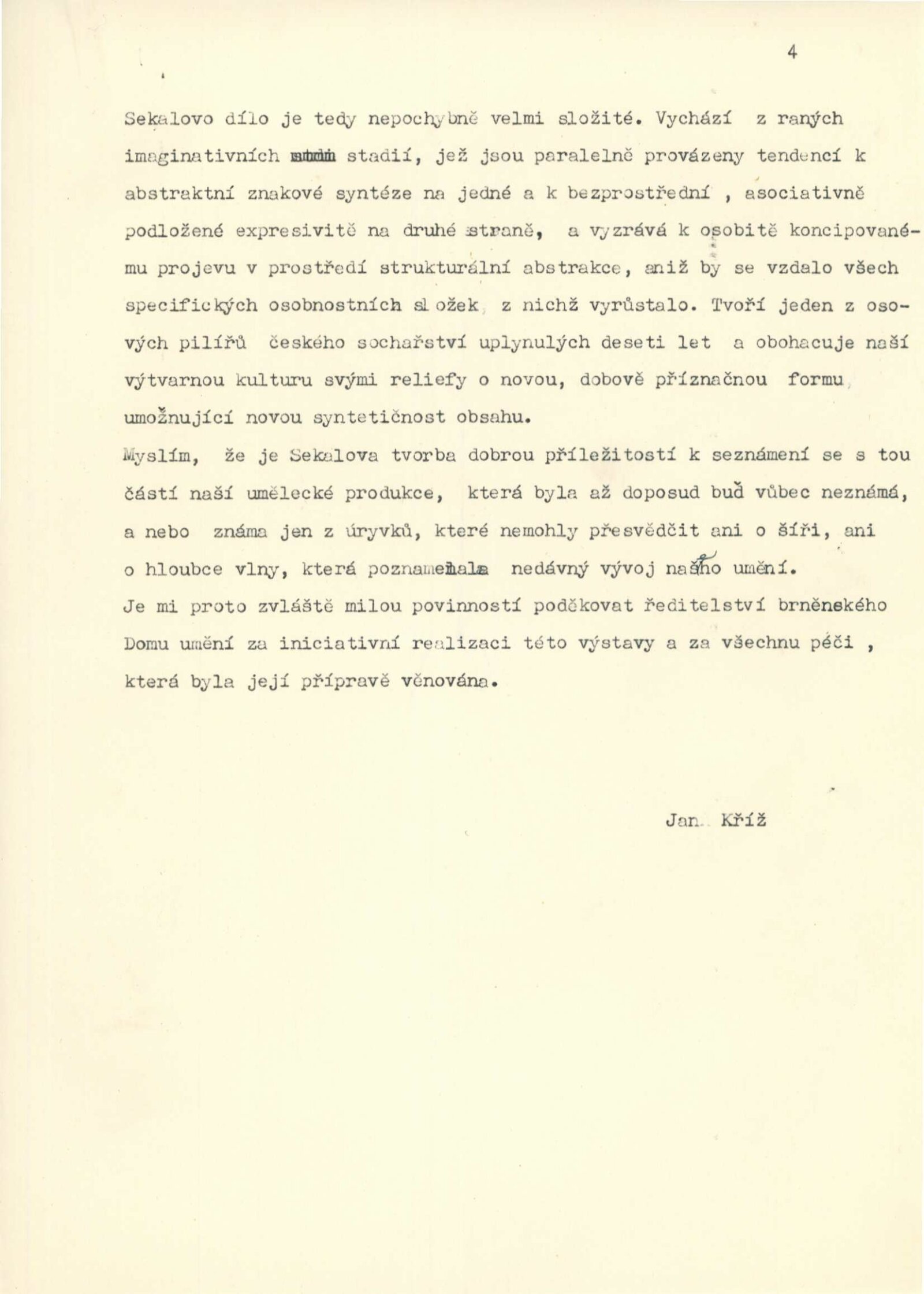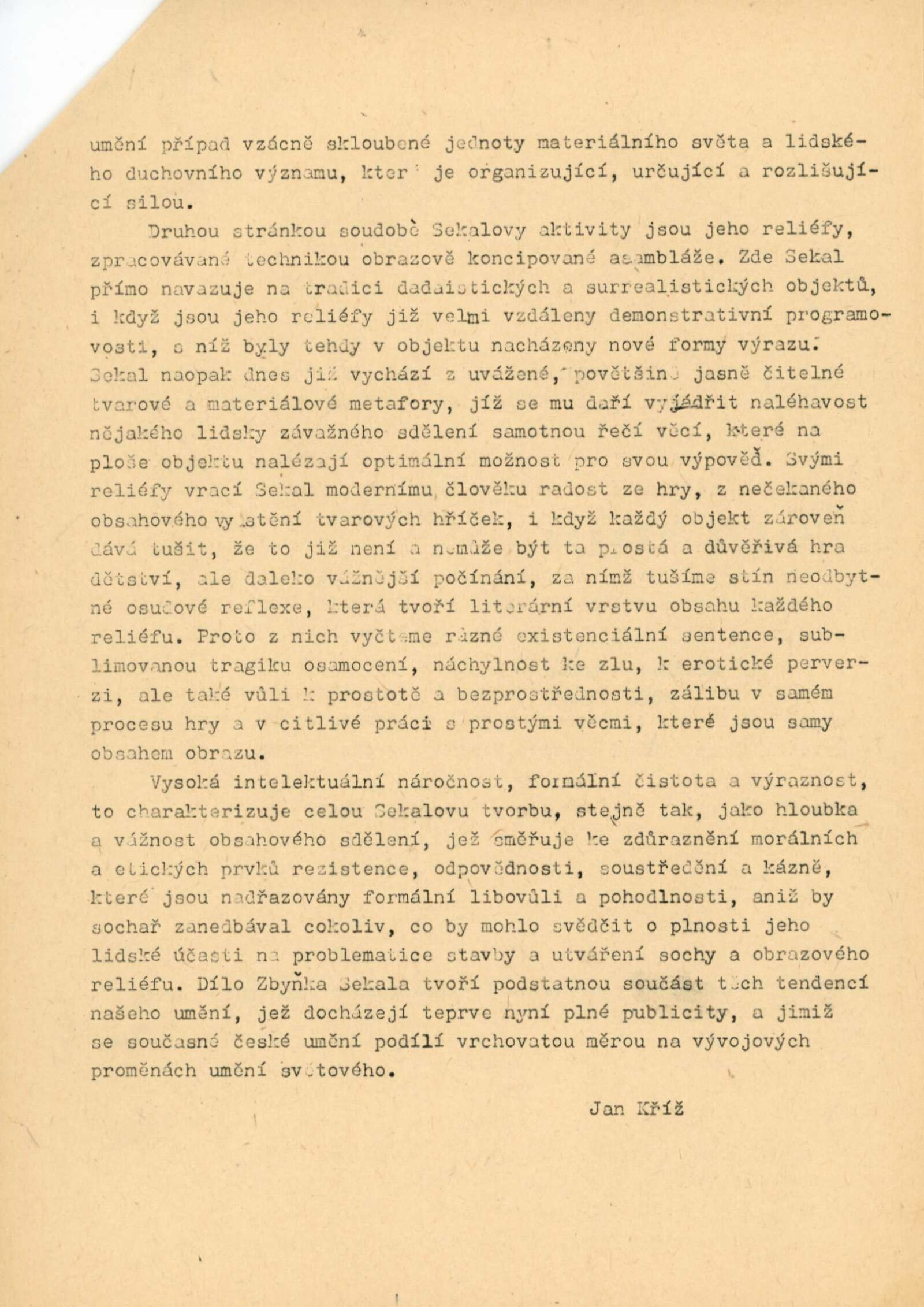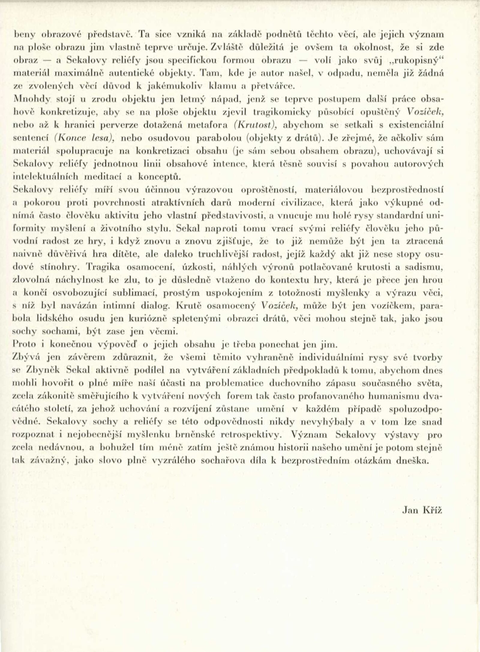 pozvánka, strojopis katalogu (Zbyněk Sekal a Jiří Valenta), strojopis zahájení výstavy (Jan Kříž), tištěný text o (ZS – Jan Kříž), podklady ke katalogu, seznam vystavených děl, pojistné seznamy, smlouva k výstavě, korespondence (příprava výstavy, Zbyněk Sekal, Jan Kříž s DU), recenze v tisku, katalogy umělců