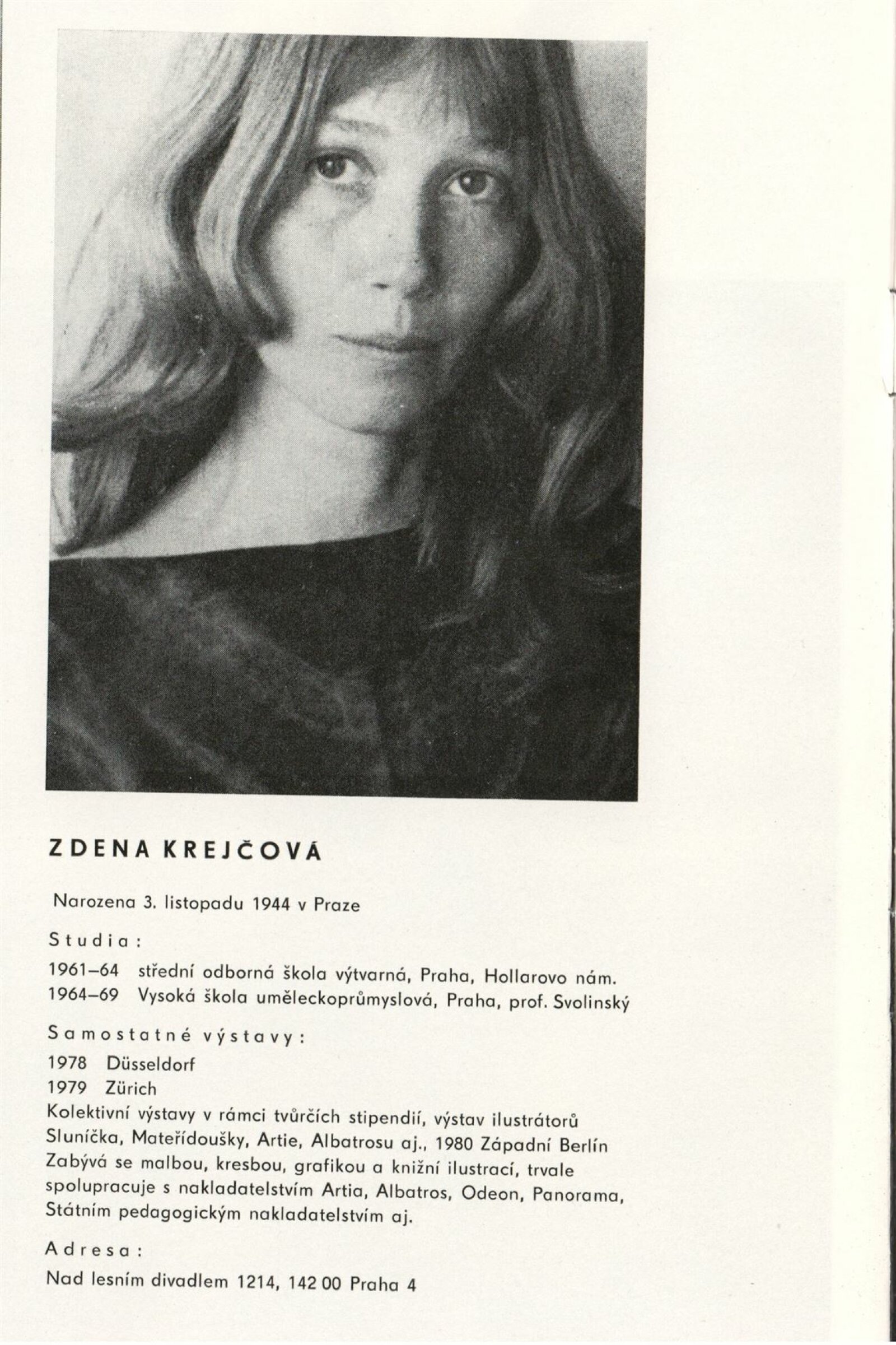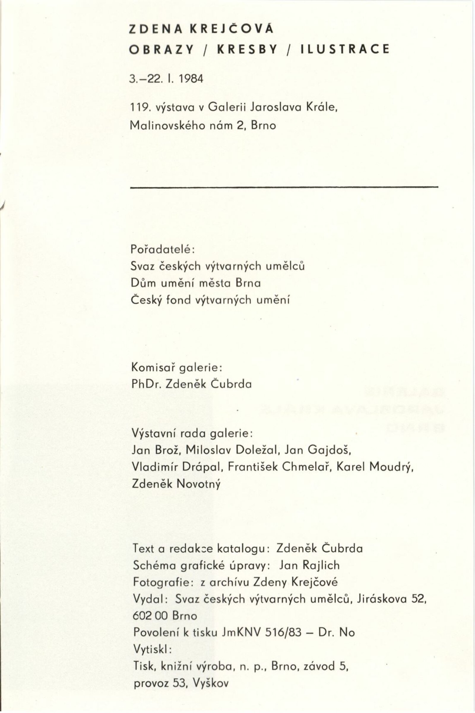 Zdena Krejčová. Obrazy, kresby, ilustrace: Dům umění, 119. výstava v Galerii Jaroslava Krále 3. – 29. 1. 1984 / Text: Zdeněk Čubrda. – Brno: SČVU, 1984. – 12 s., obr., portrét, životní data, neobsahuje seznam vystavených děl, DU 774. – MZK; MG